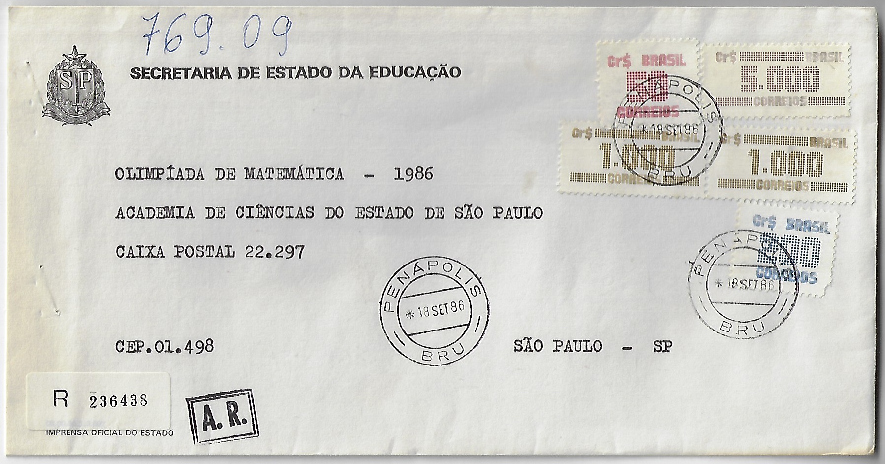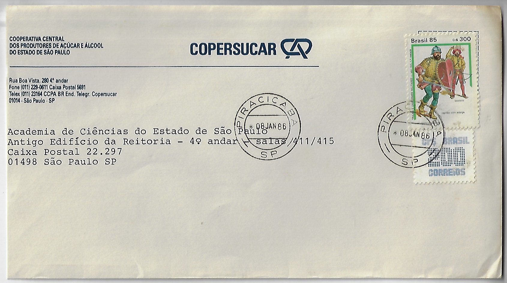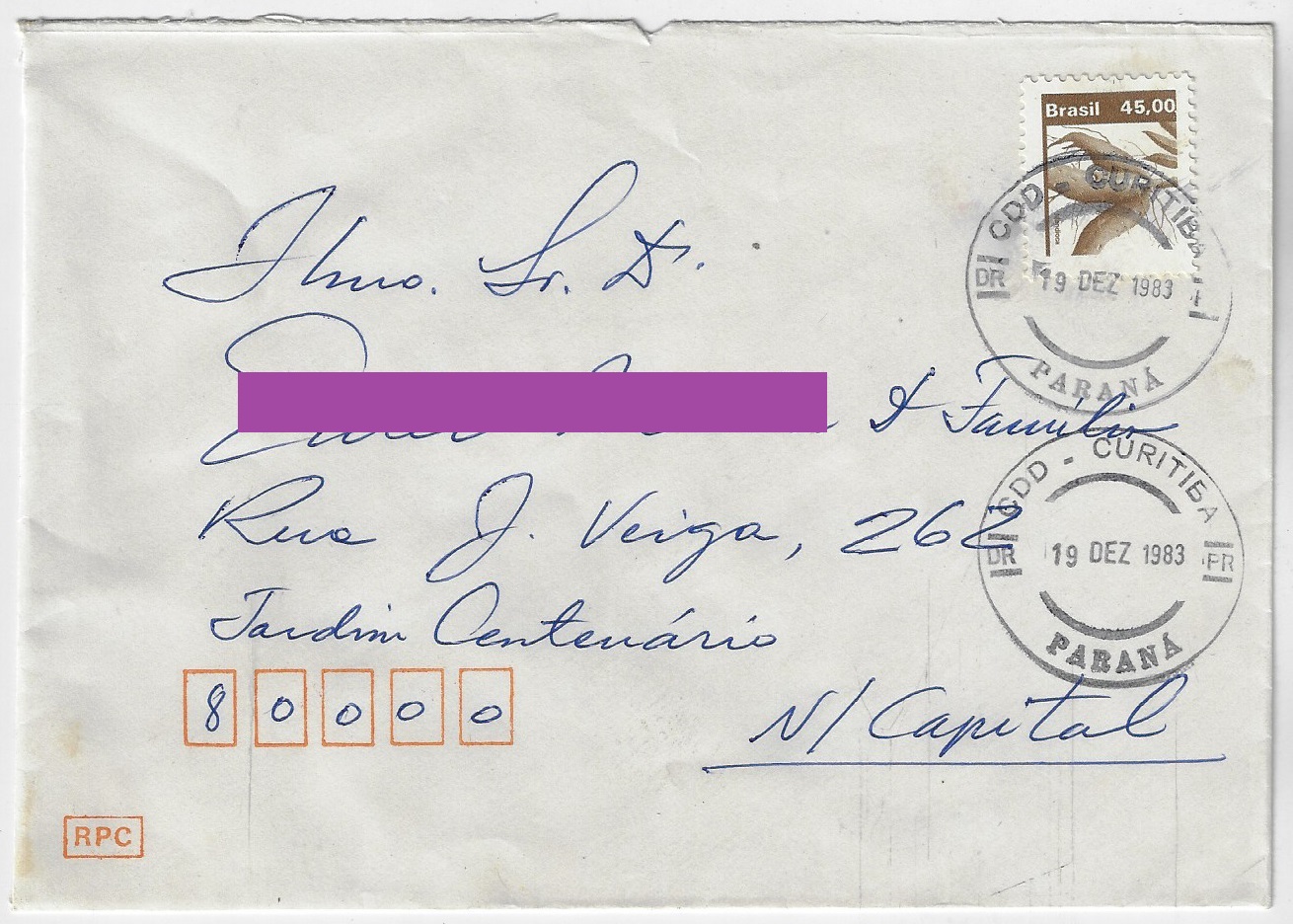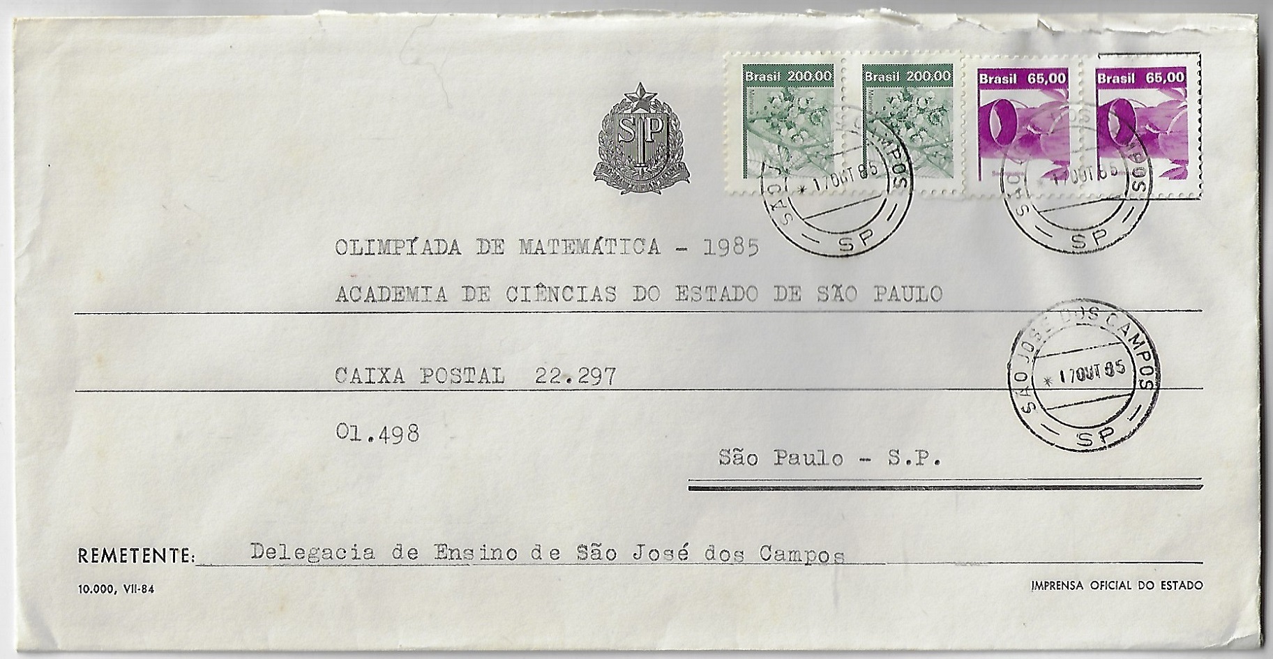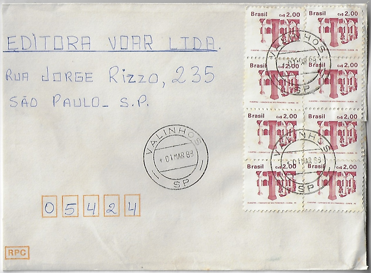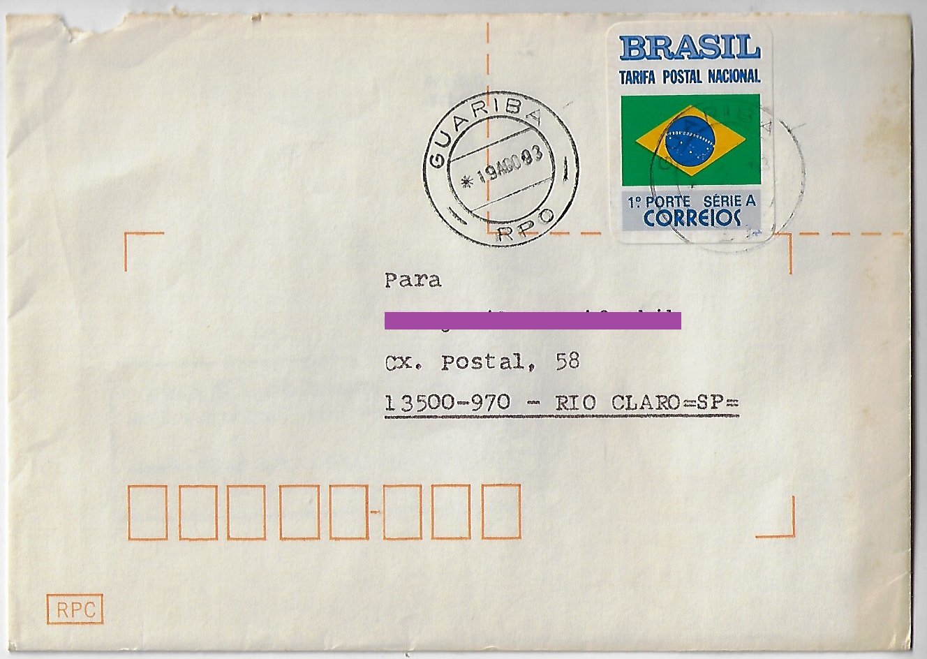 | 80884 | 2023, envelope prioritário registrado enviado de Biguaçu (21/11) para San Francisco / EUA, retornado ao remetente, marcas de triagem eletrônica na frente e no verso, 5 selos comemorativos 1ª Conferência Nacional da Juventure e 2 regulares Engraxate | 10,00 | Foto |