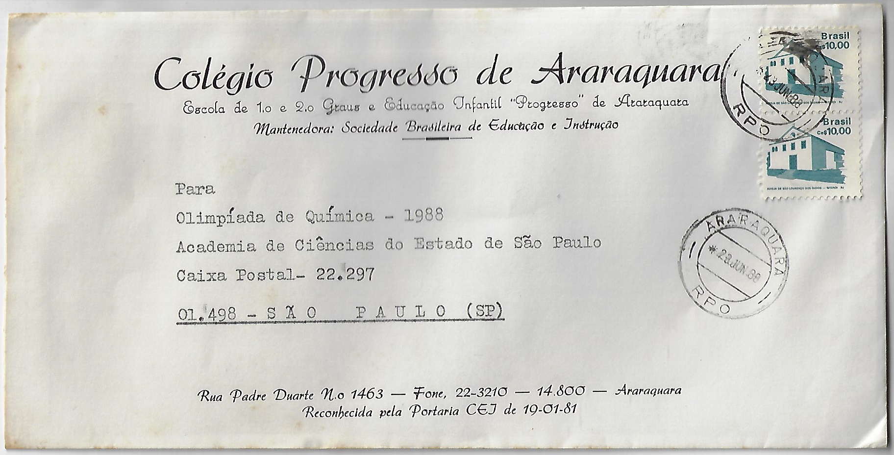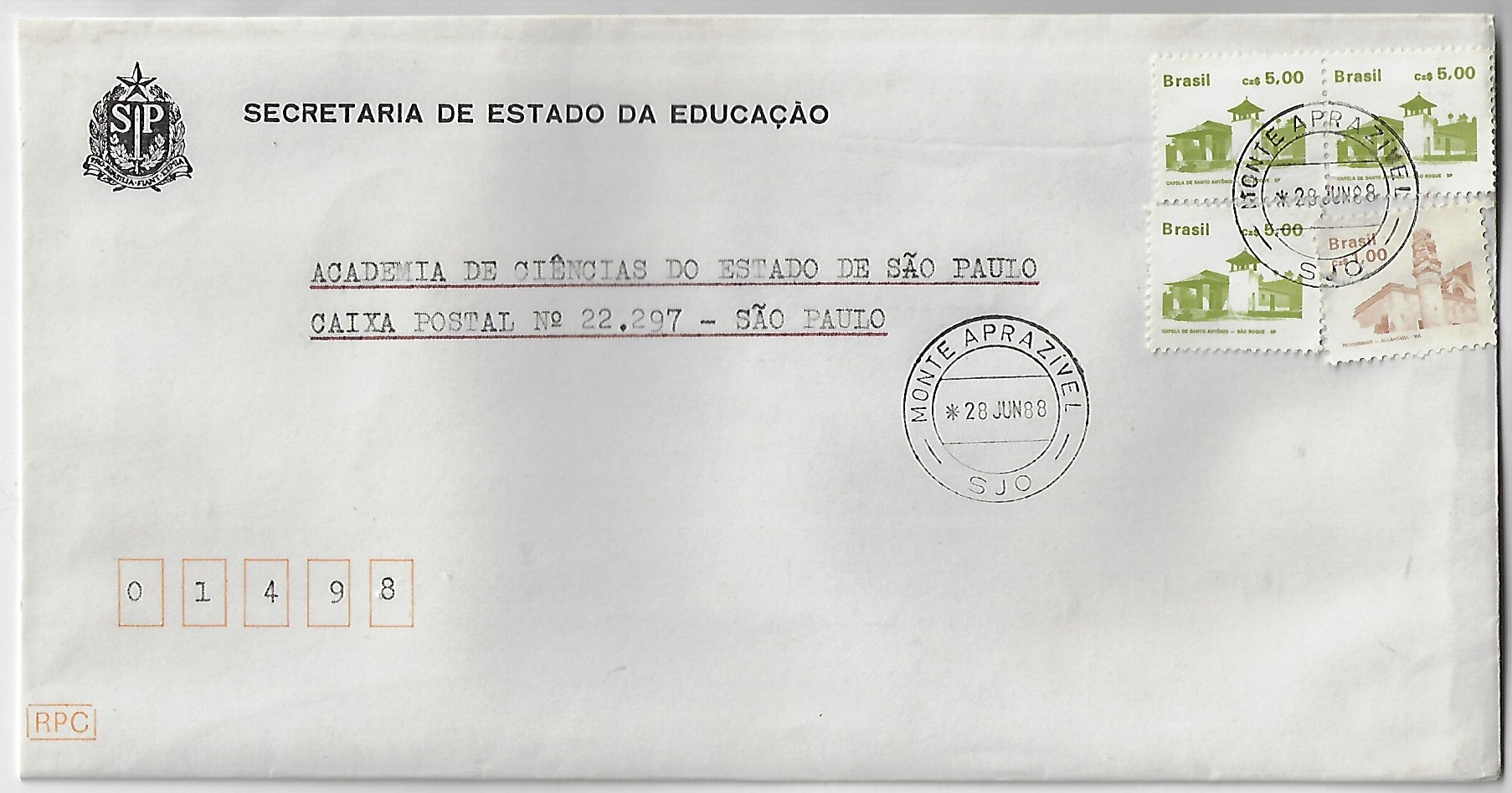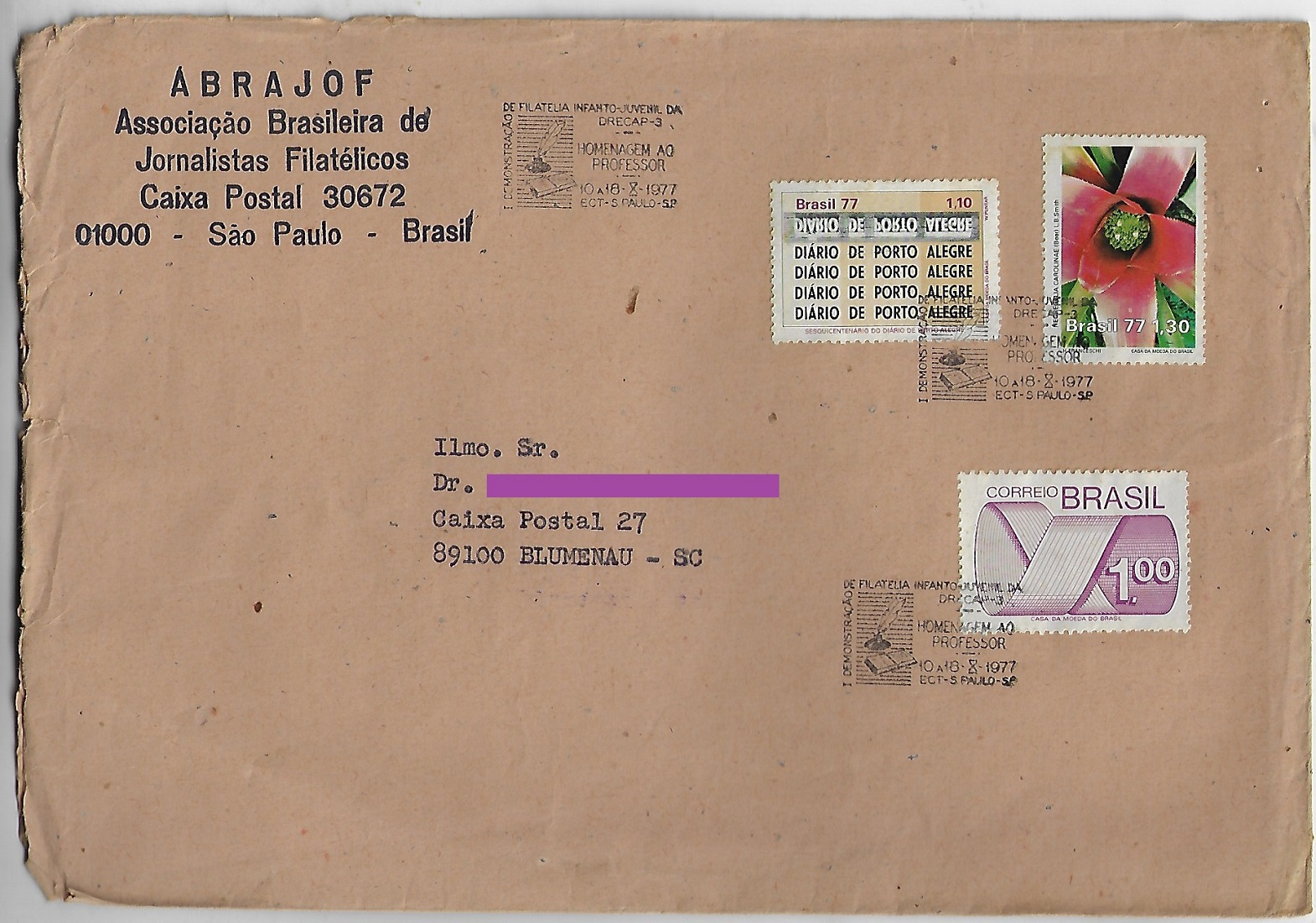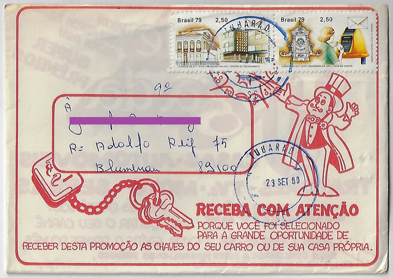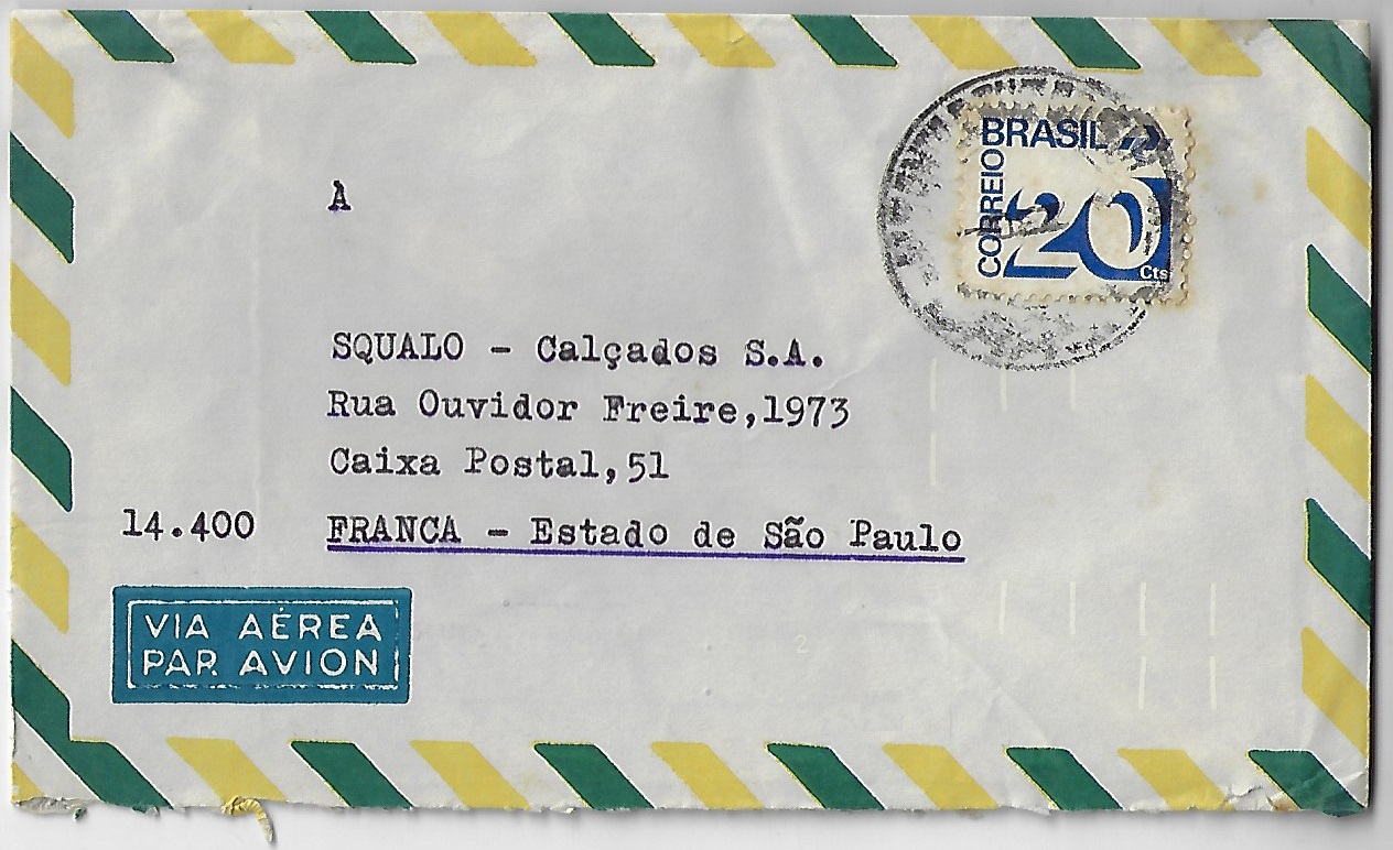 | 80884 | 2023, envelope prioritário registrado enviado de Biguaçu (21/11) para San Francisco / EUA, retornado ao remetente, marcas de triagem eletrônica na frente e no verso, 5 selos comemorativos 1ª Conferência Nacional da Juventure e 2 regulares Engraxate | 10,00 | Foto |