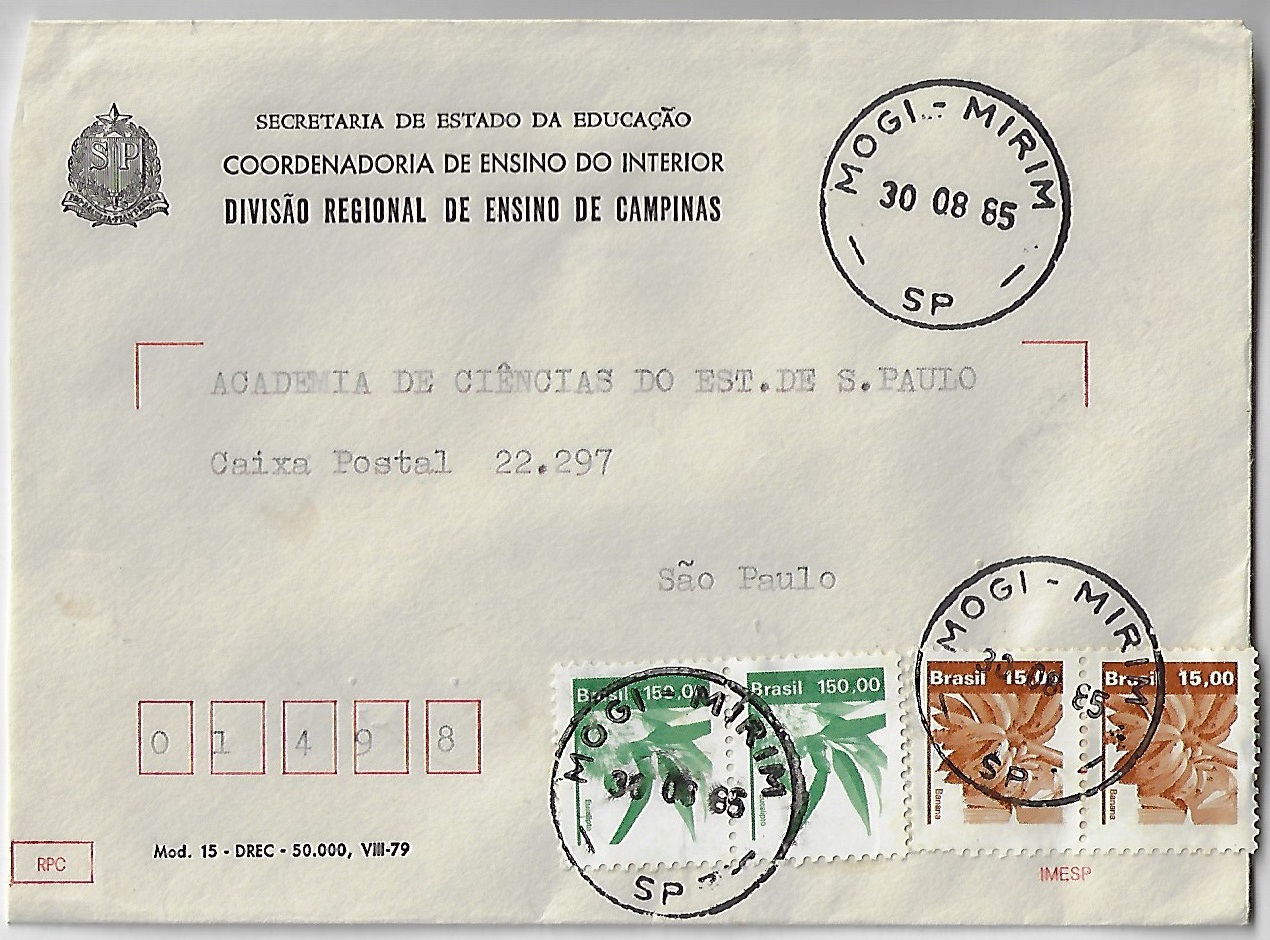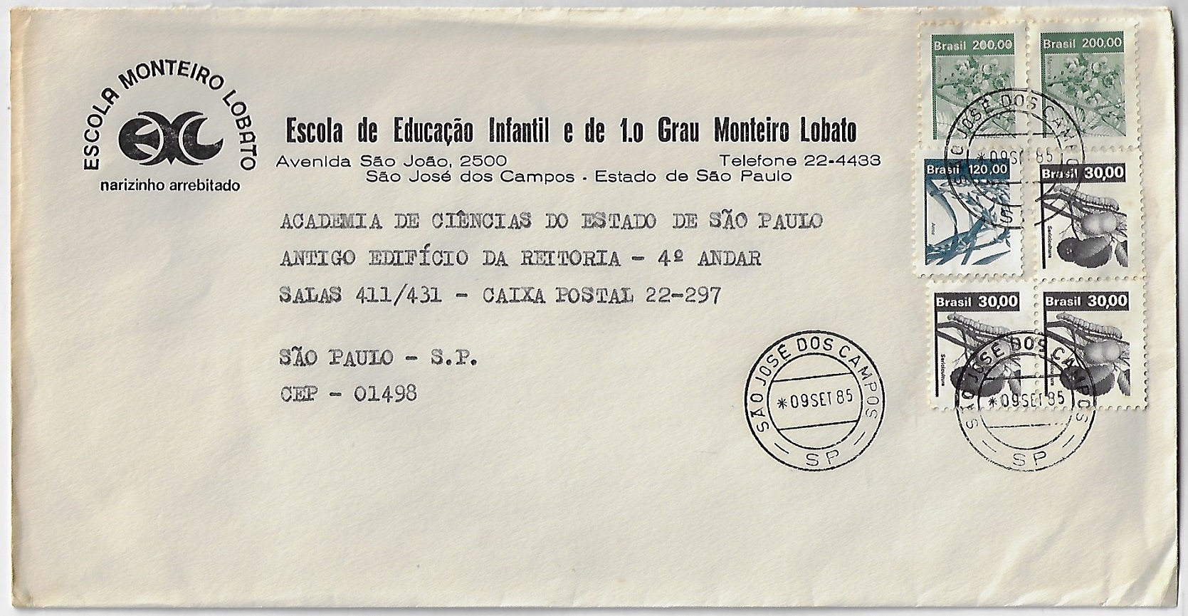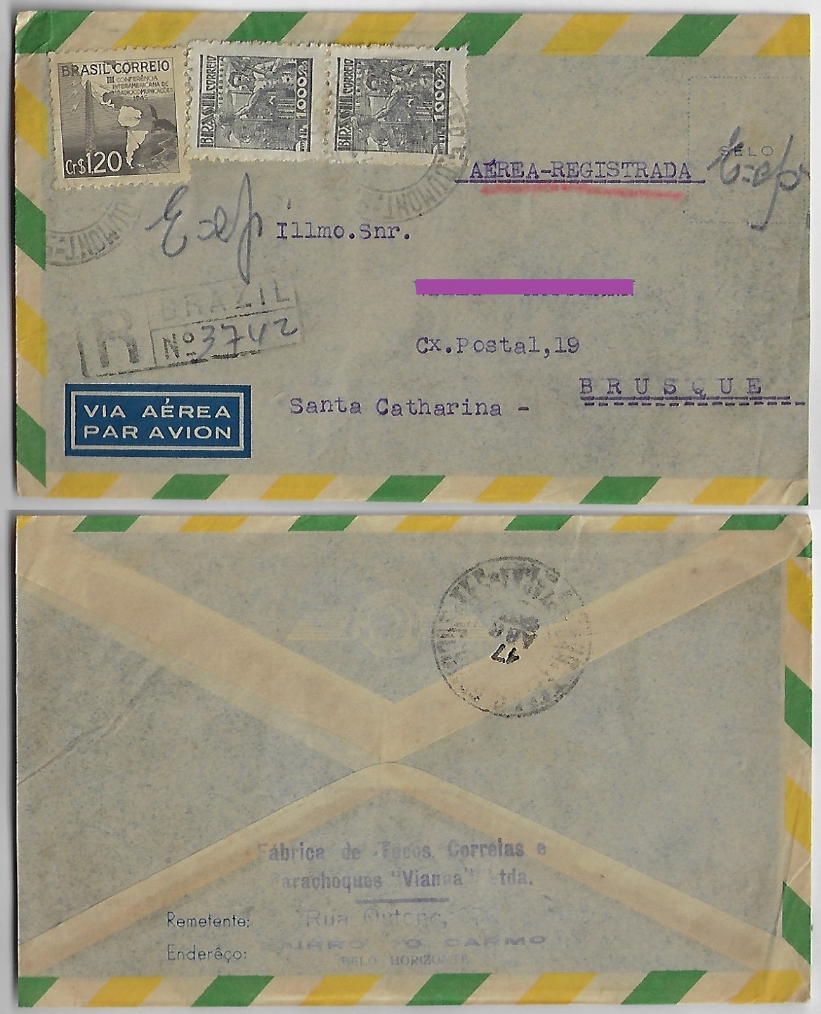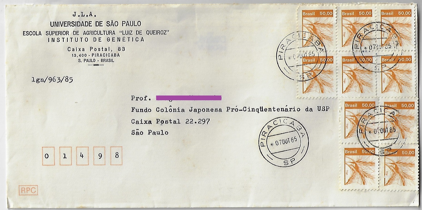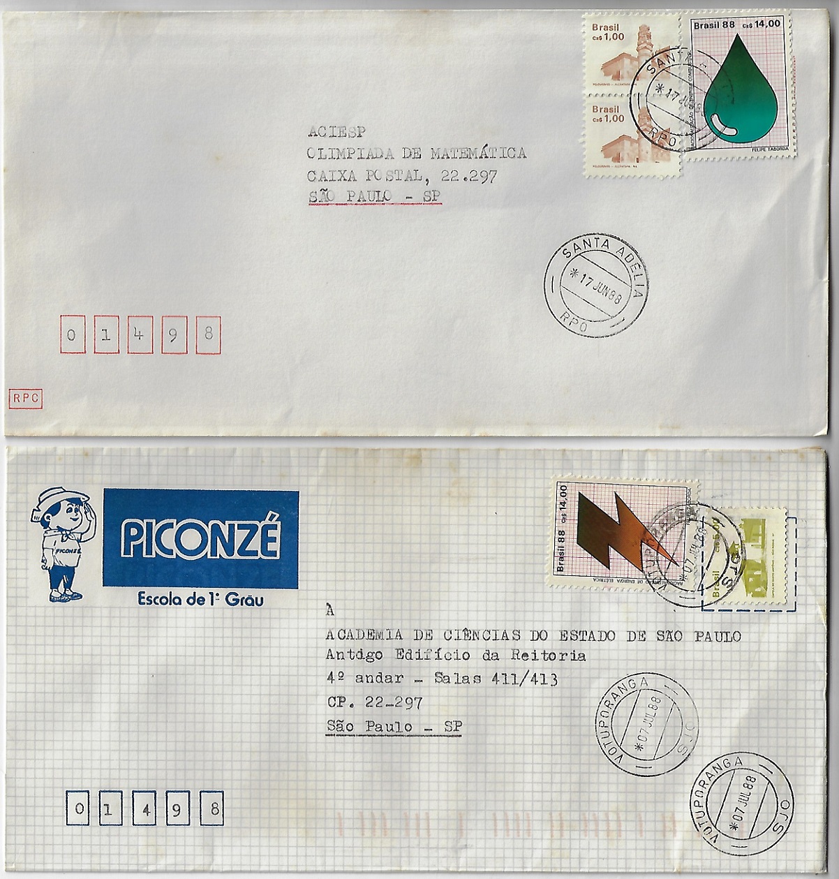 | 80884 | 2023, envelope prioritário registrado enviado de Biguaçu (21/11) para San Francisco / EUA, retornado ao remetente, marcas de triagem eletrônica na frente e no verso, 5 selos comemorativos 1ª Conferência Nacional da Juventure e 2 regulares Engraxate | 10,00 | Foto |