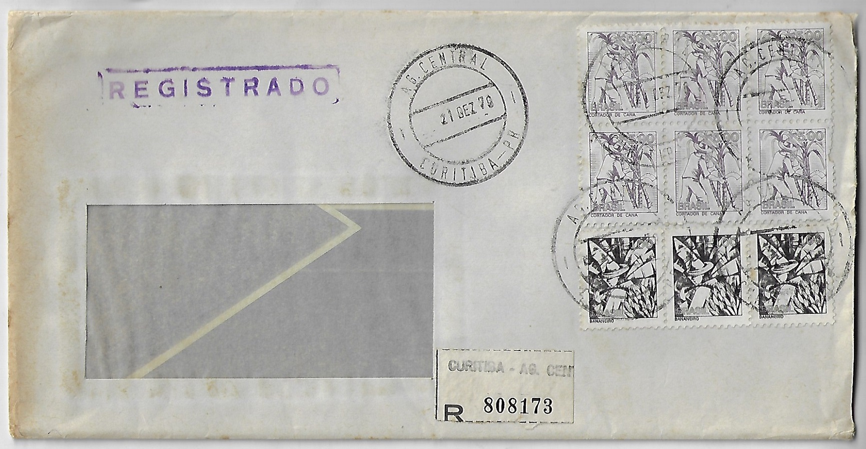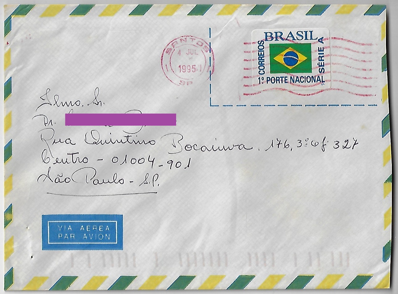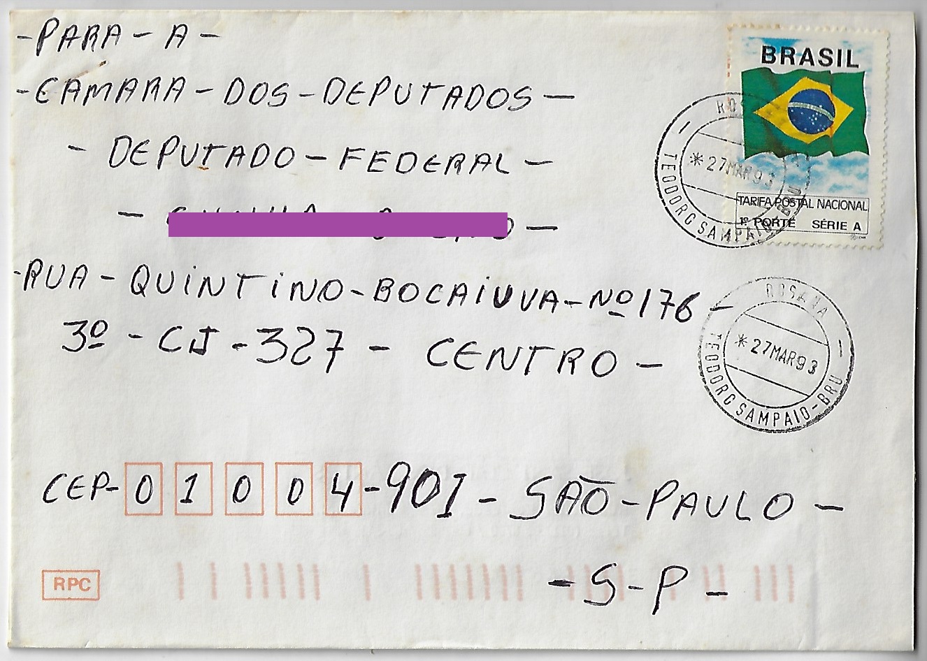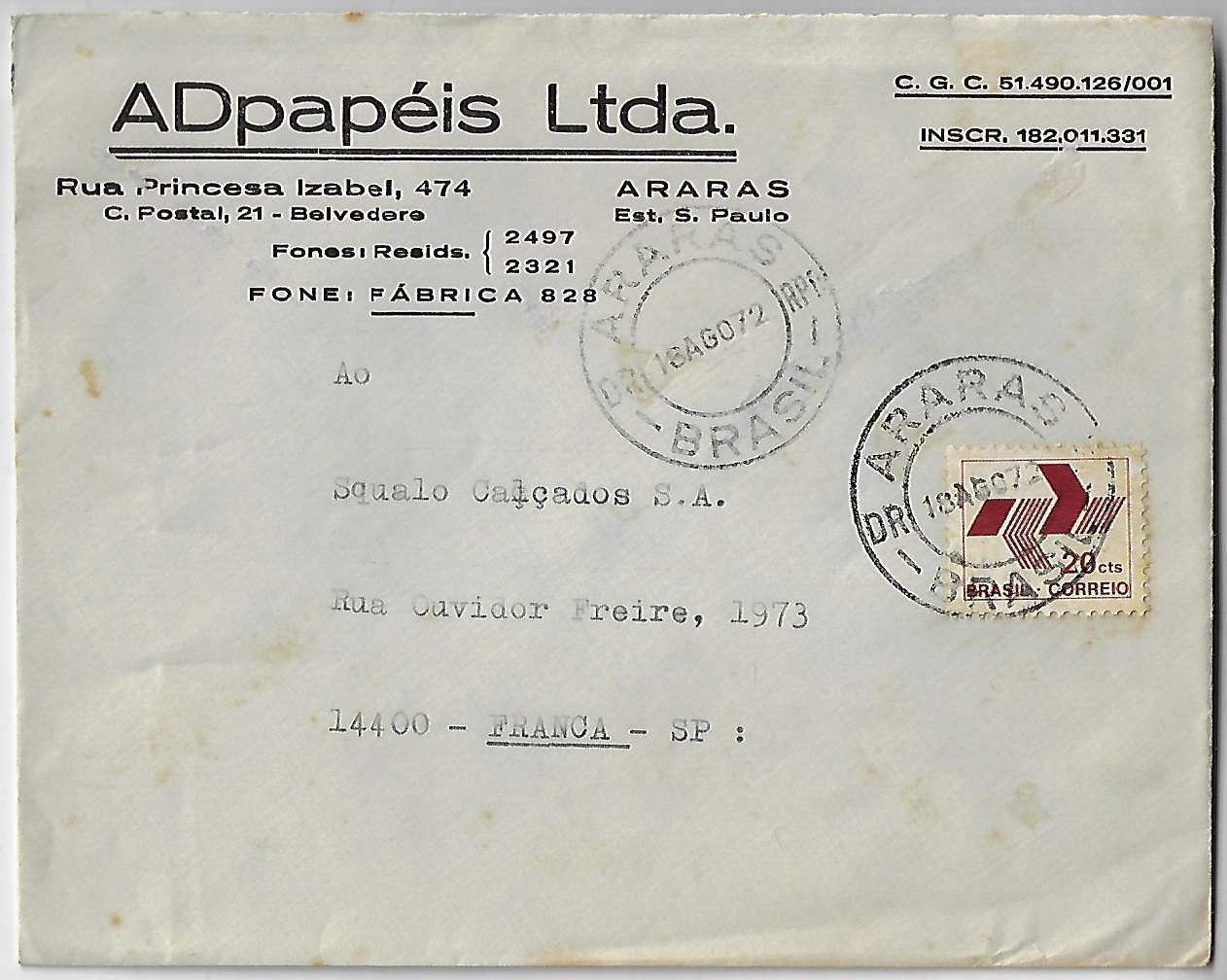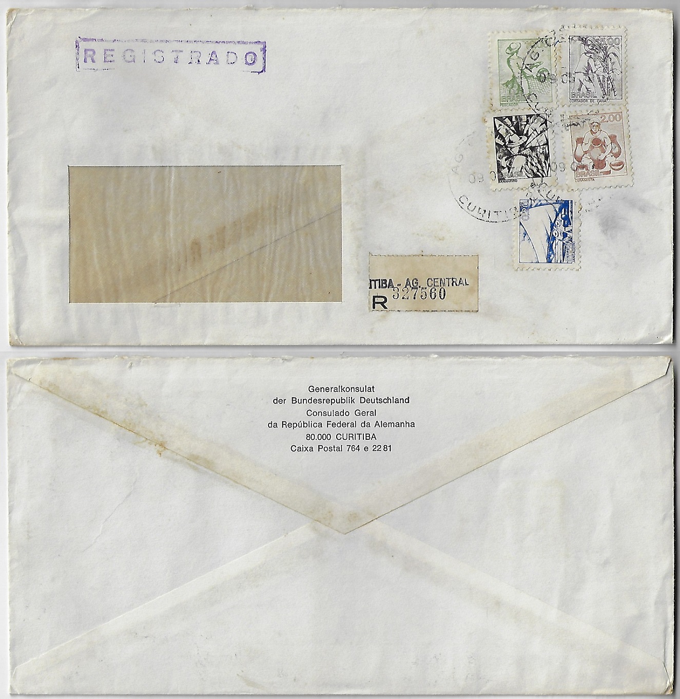 | 80884 | 2023, envelope prioritário registrado enviado de Biguaçu (21/11) para San Francisco / EUA, retornado ao remetente, marcas de triagem eletrônica na frente e no verso, 5 selos comemorativos 1ª Conferência Nacional da Juventure e 2 regulares Engraxate | 10,00 | Foto |