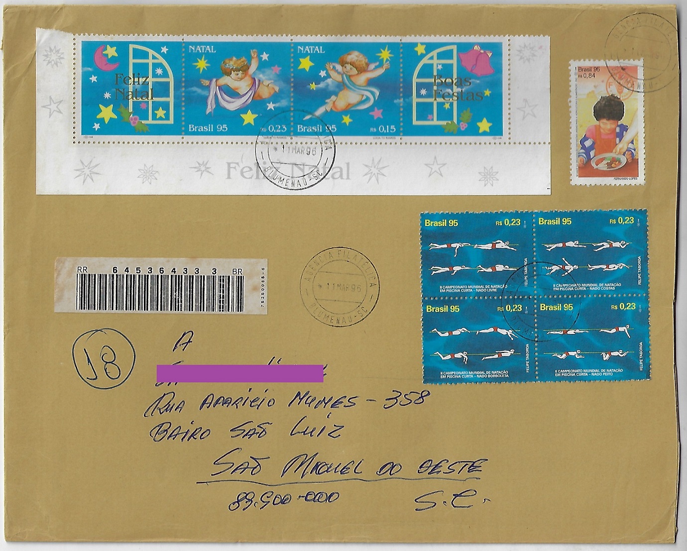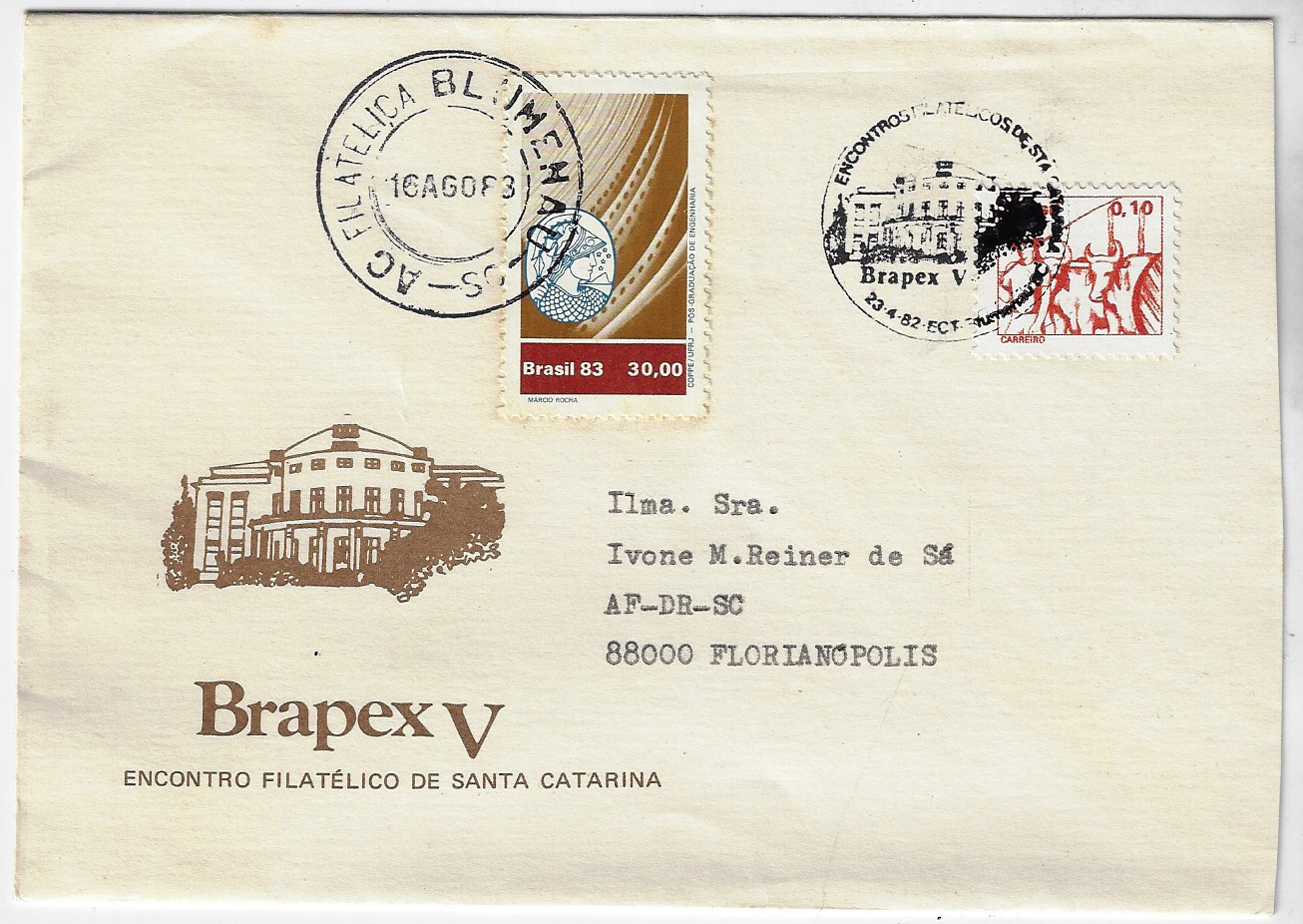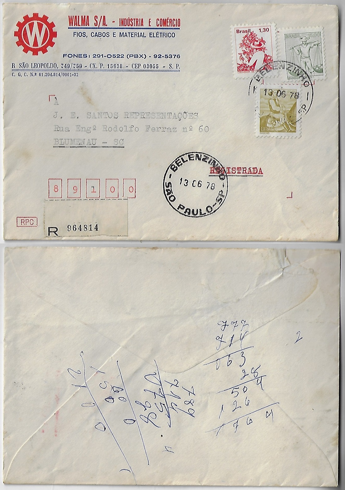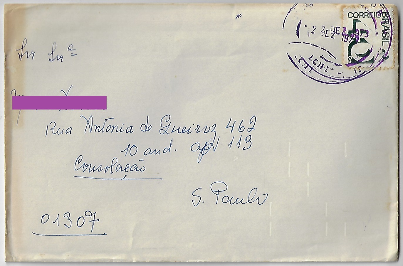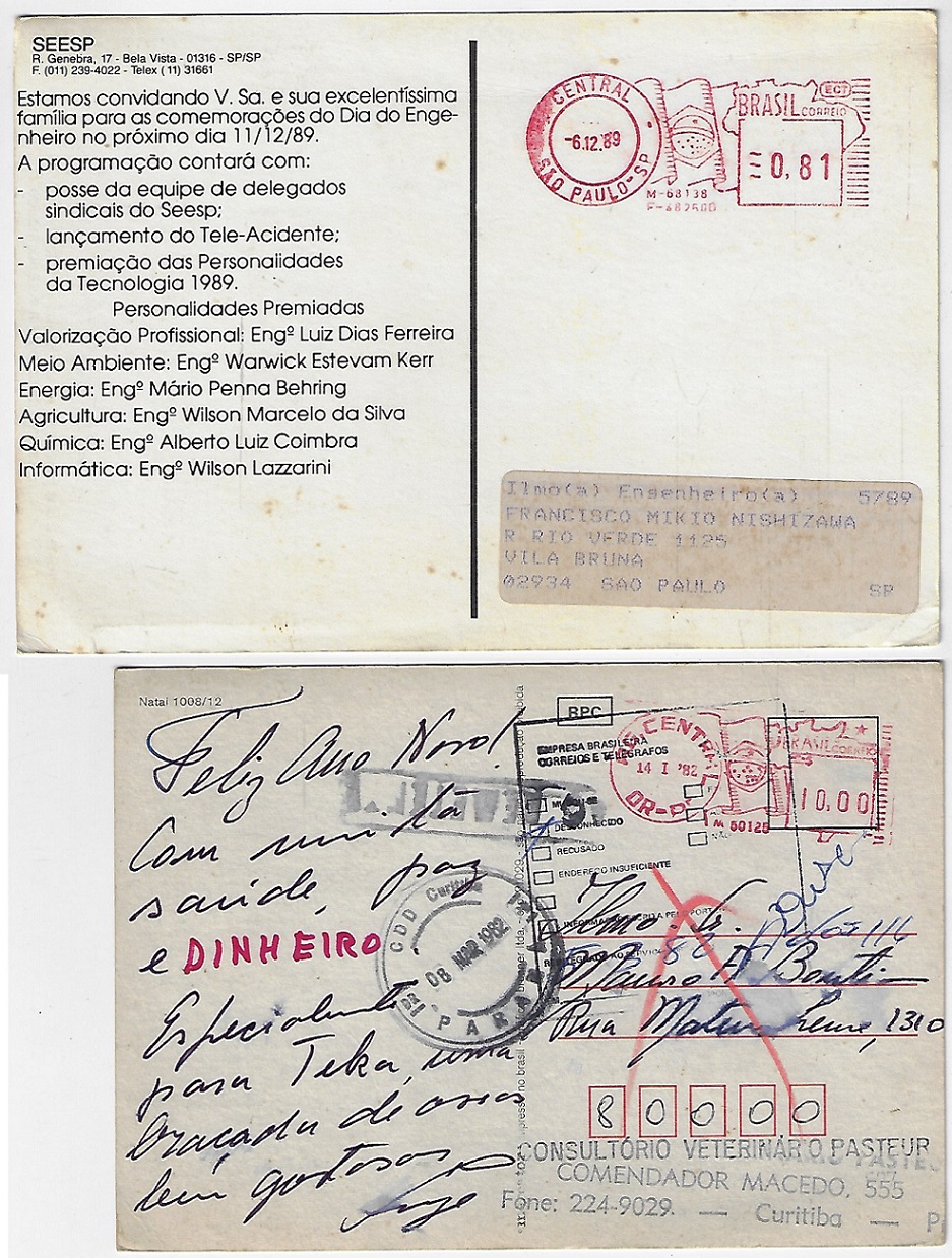 | 80884 | 2023, envelope prioritário registrado enviado de Biguaçu (21/11) para San Francisco / EUA, retornado ao remetente, marcas de triagem eletrônica na frente e no verso, 5 selos comemorativos 1ª Conferência Nacional da Juventure e 2 regulares Engraxate | 10,00 | Foto |