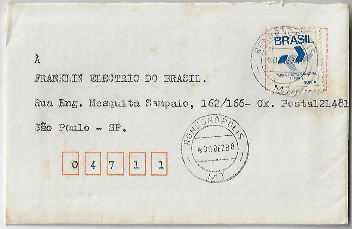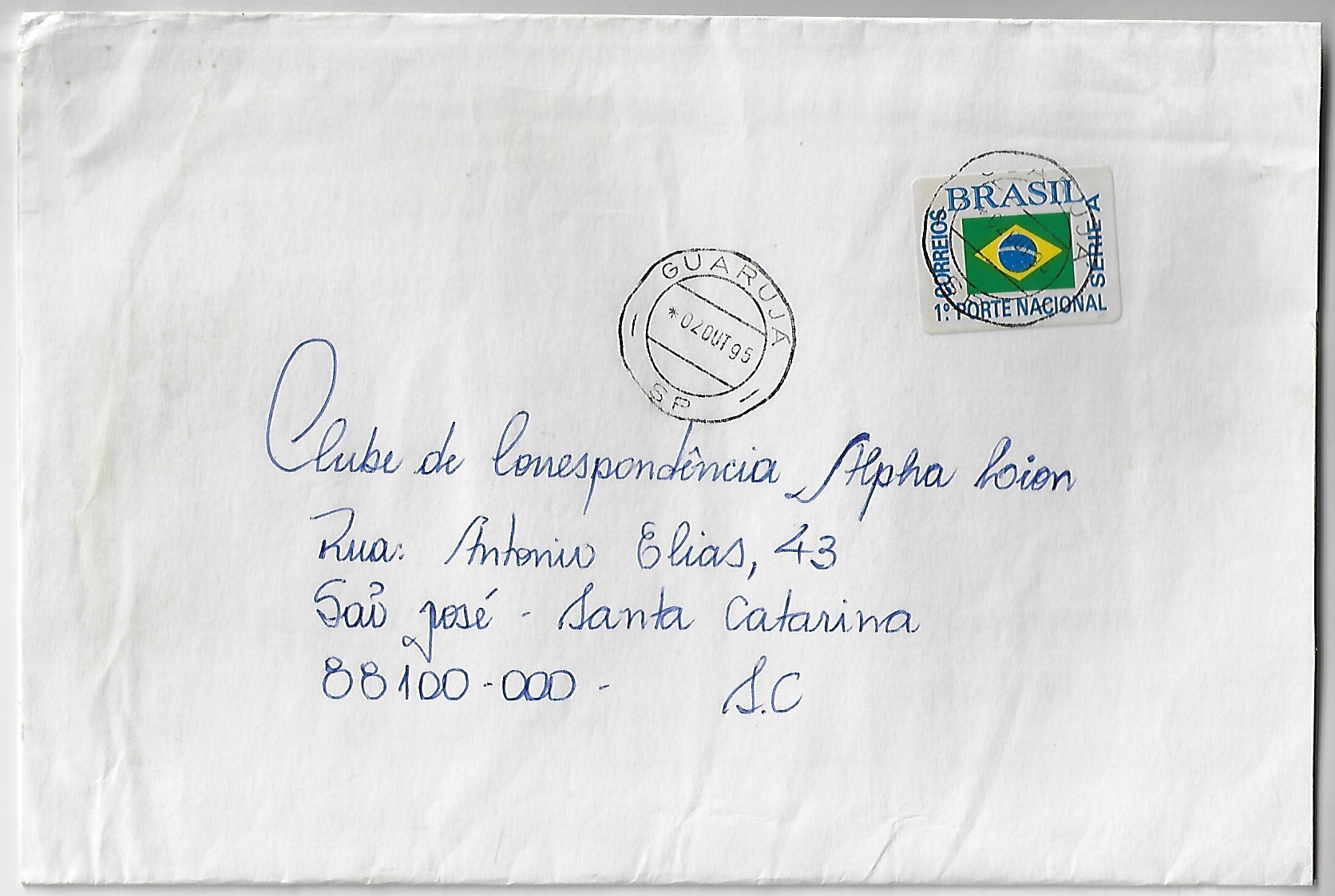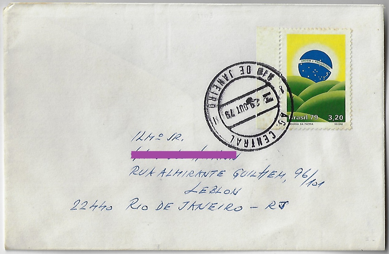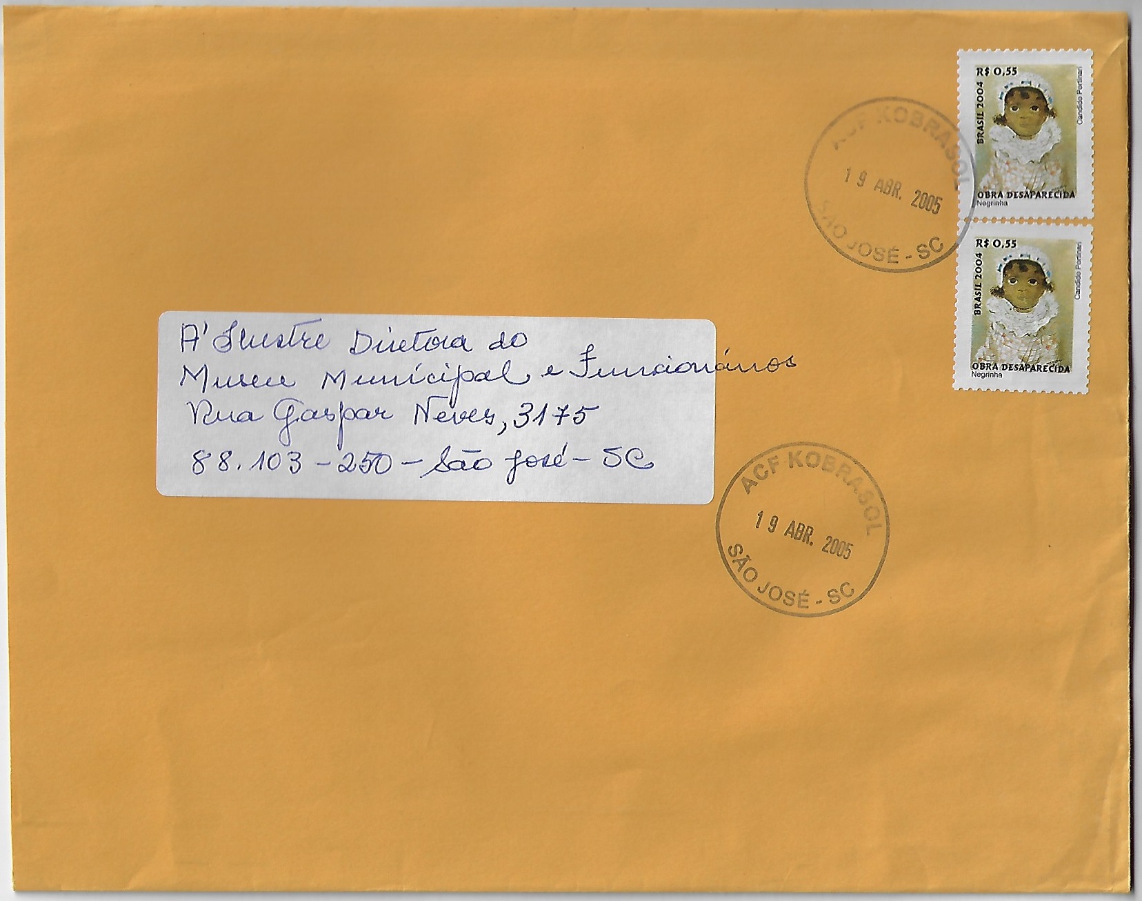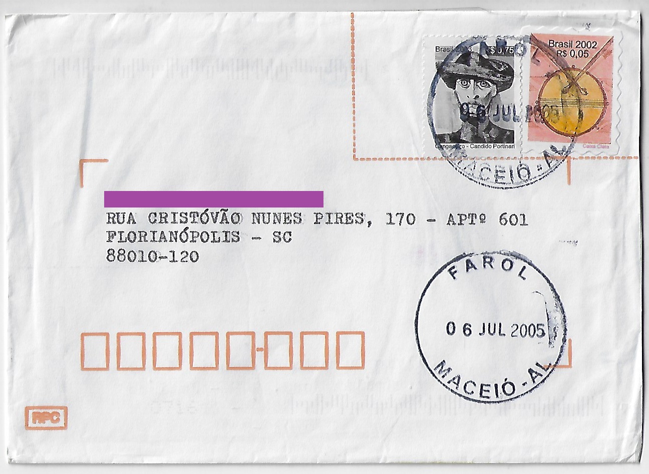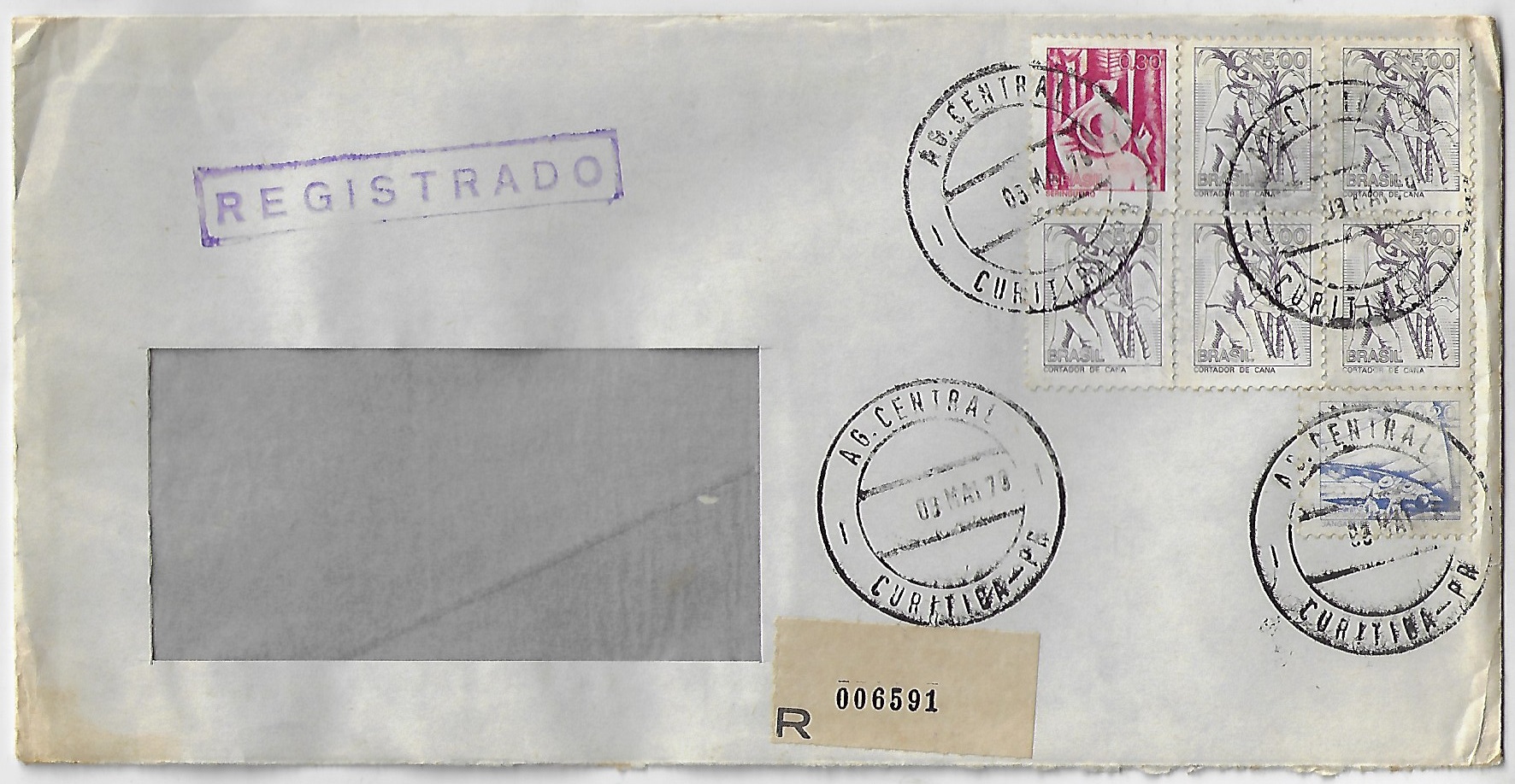 | 80884 | 2023, envelope prioritário registrado enviado de Biguaçu (21/11) para San Francisco / EUA, retornado ao remetente, marcas de triagem eletrônica na frente e no verso, 5 selos comemorativos 1ª Conferência Nacional da Juventure e 2 regulares Engraxate | 10,00 | Foto |