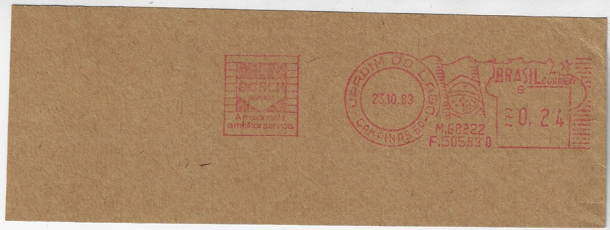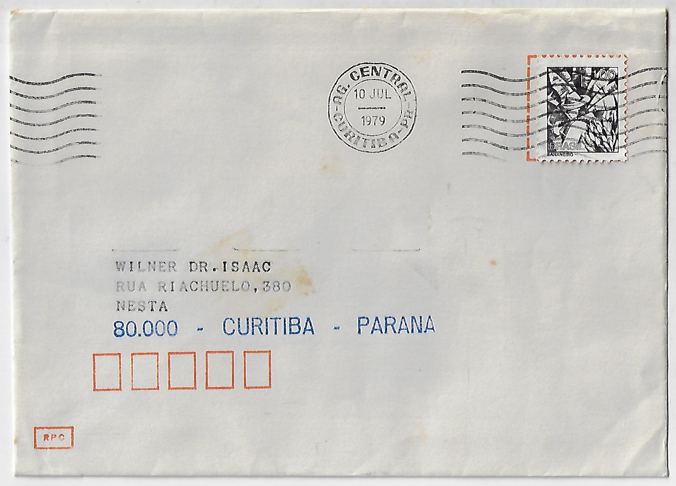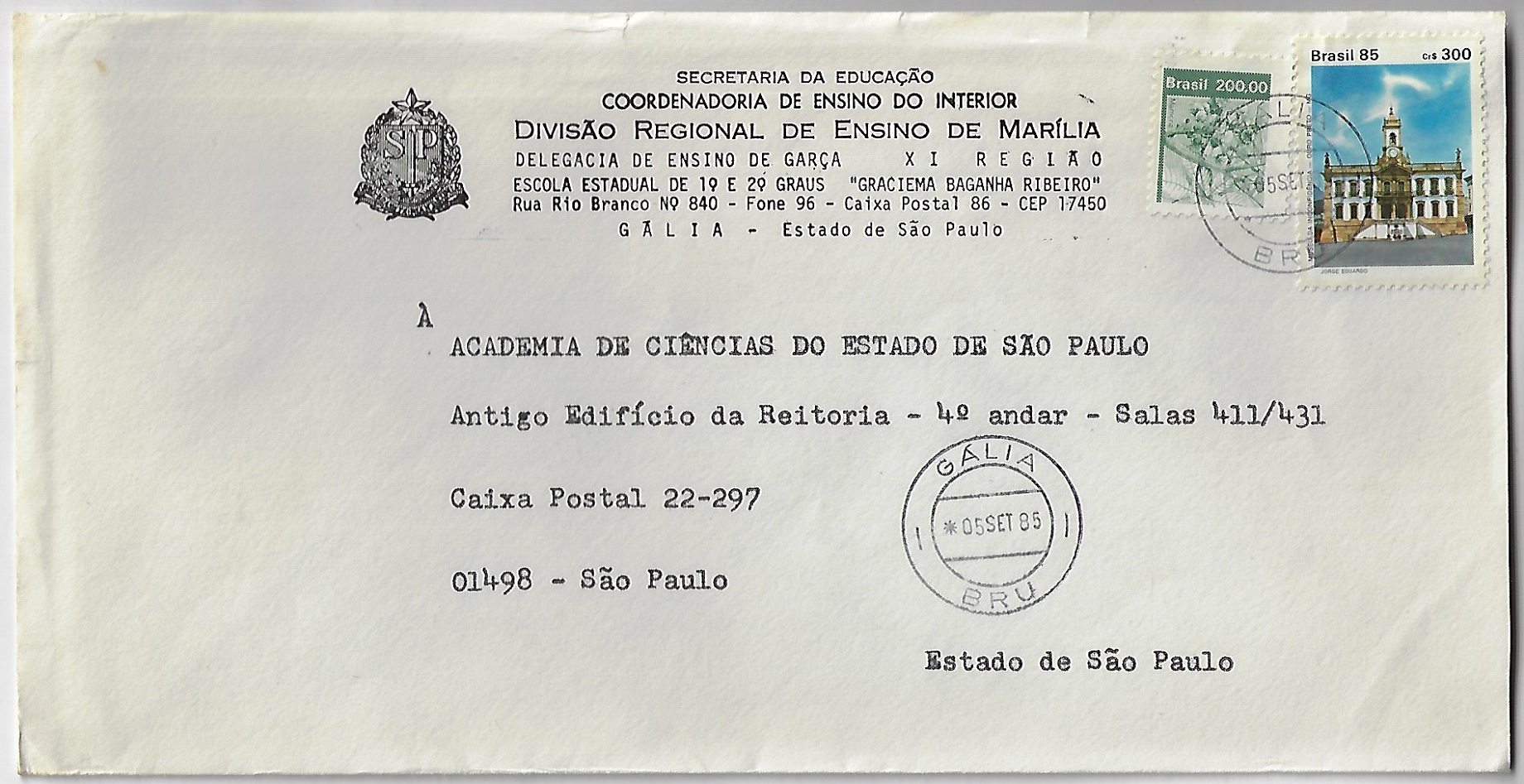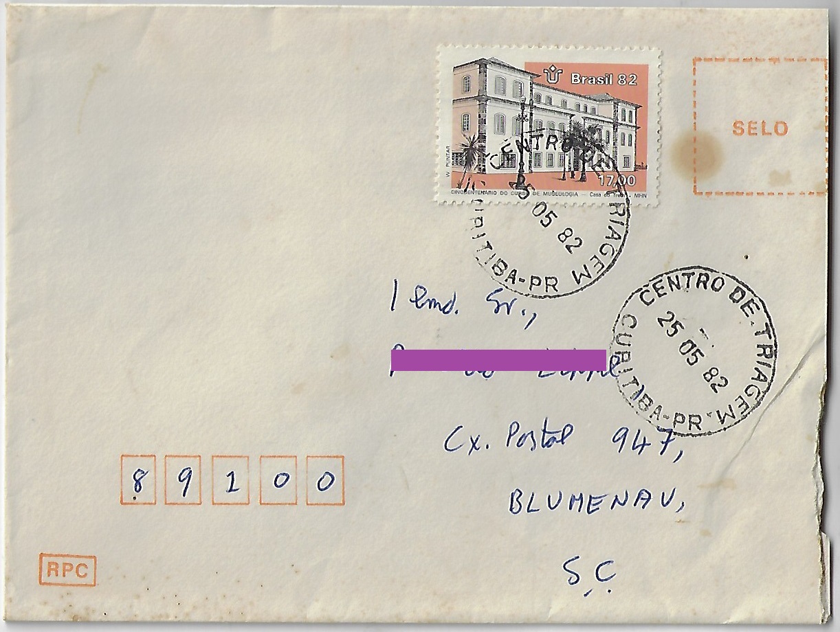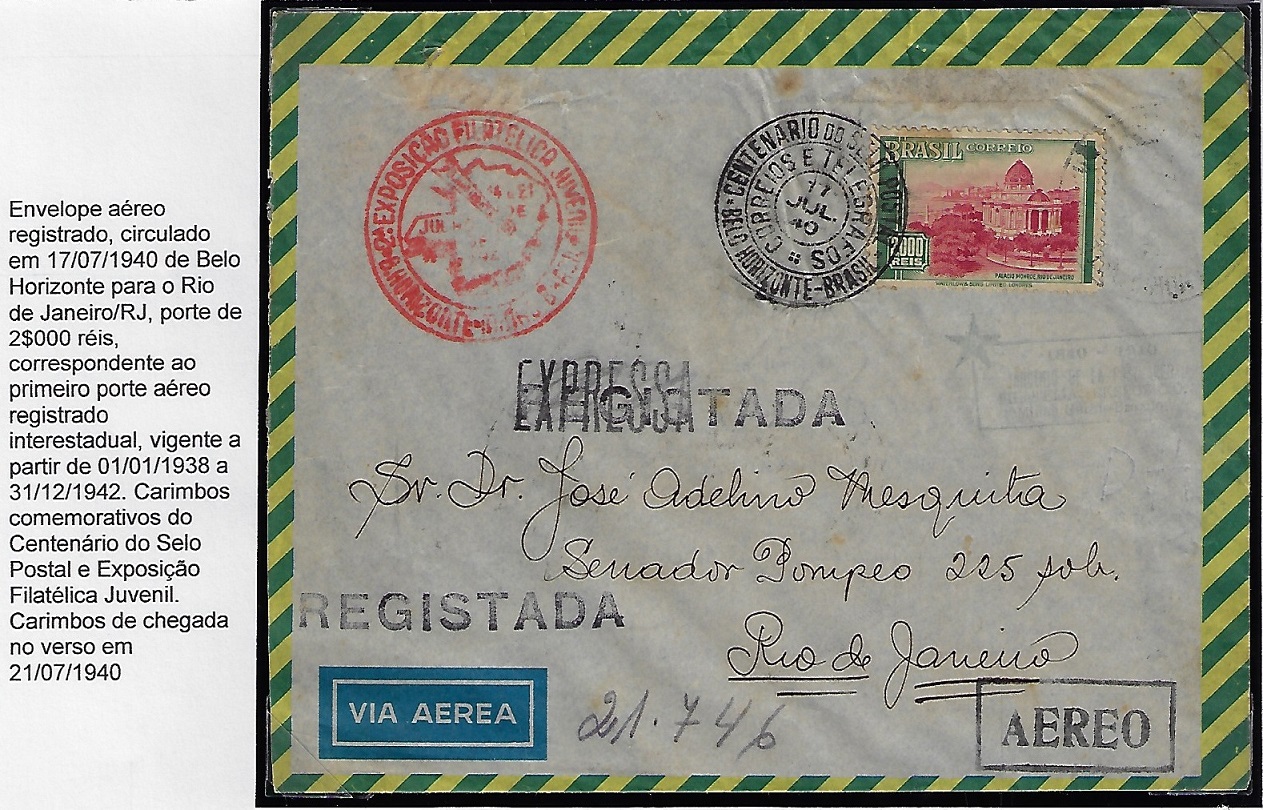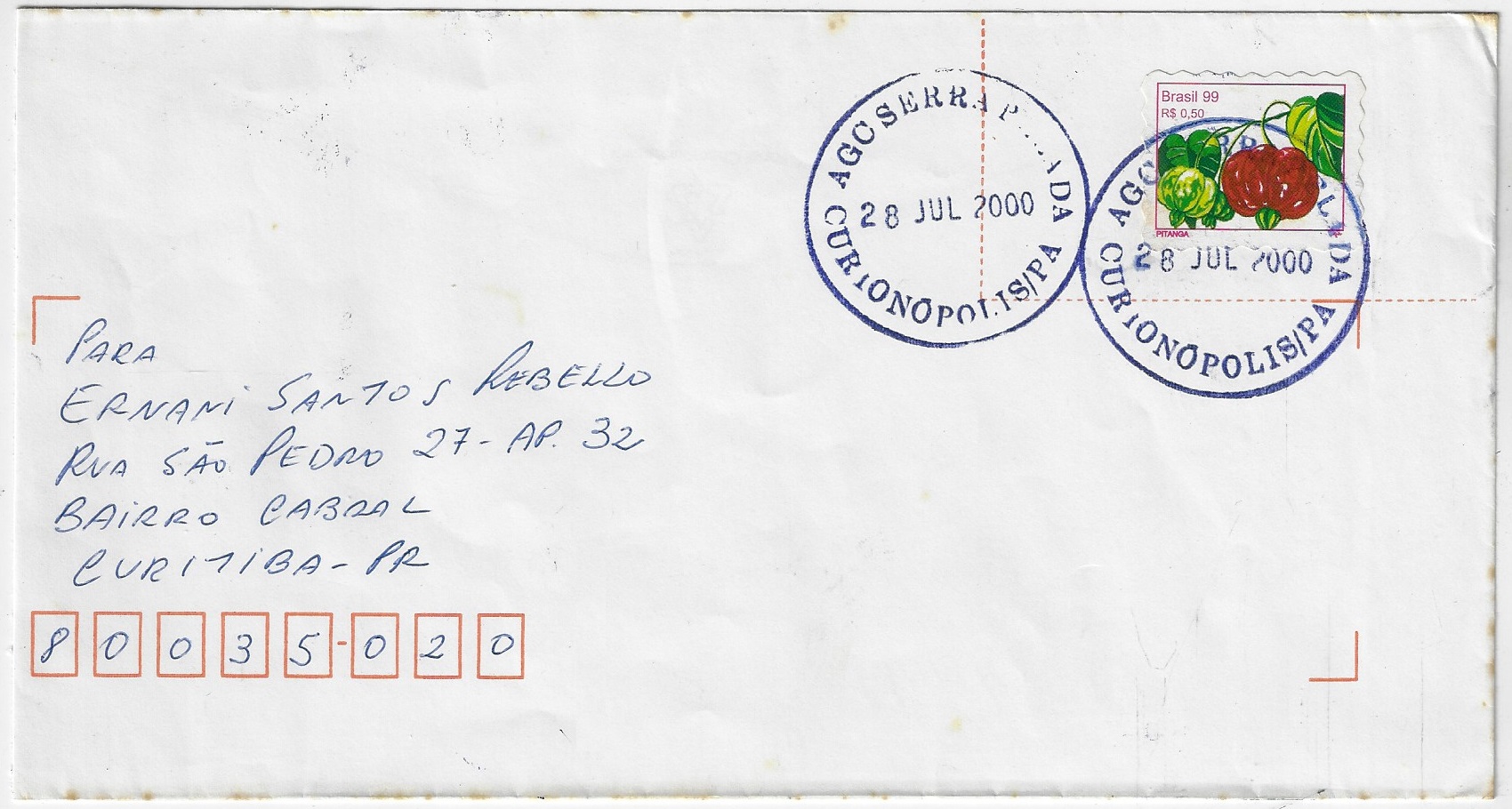 | 80884 | 2023, envelope prioritário registrado enviado de Biguaçu (21/11) para San Francisco / EUA, retornado ao remetente, marcas de triagem eletrônica na frente e no verso, 5 selos comemorativos 1ª Conferência Nacional da Juventure e 2 regulares Engraxate | 10,00 | Foto |