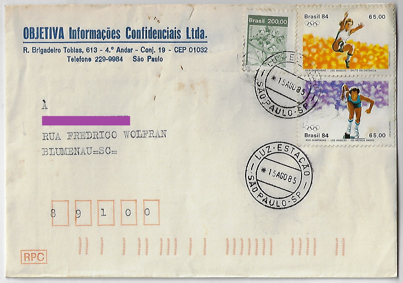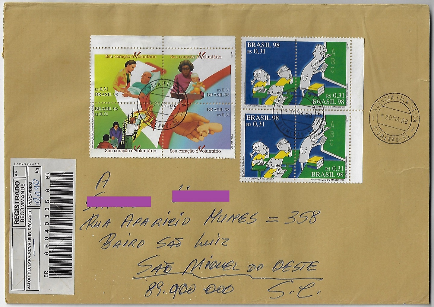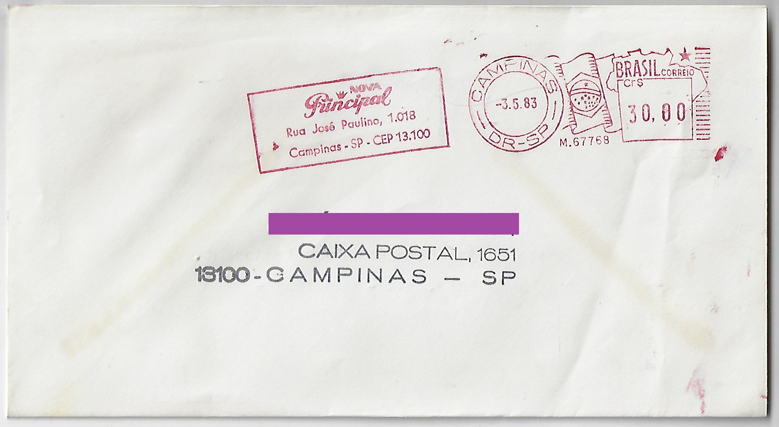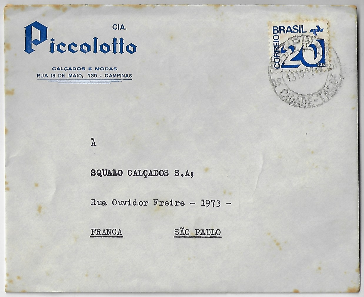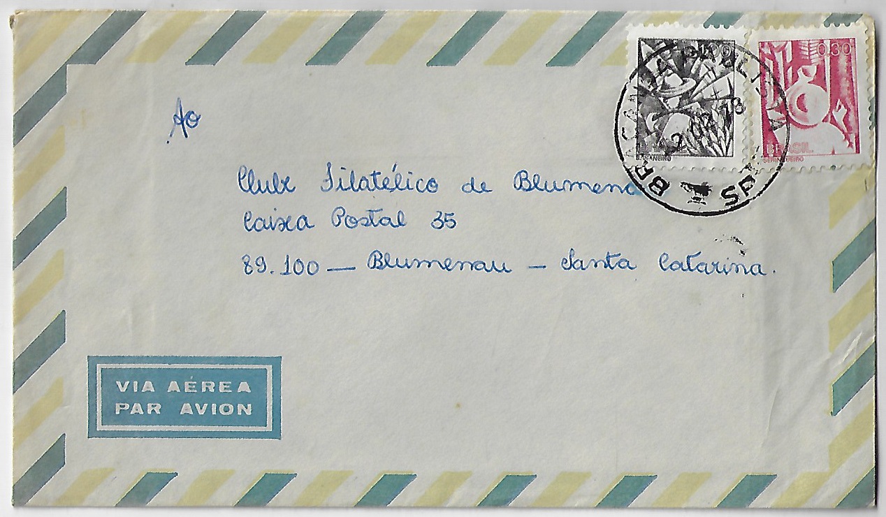 | 80884 | 2023, envelope prioritário registrado enviado de Biguaçu (21/11) para San Francisco / EUA, retornado ao remetente, marcas de triagem eletrônica na frente e no verso, 5 selos comemorativos 1ª Conferência Nacional da Juventure e 2 regulares Engraxate | 10,00 | Foto |