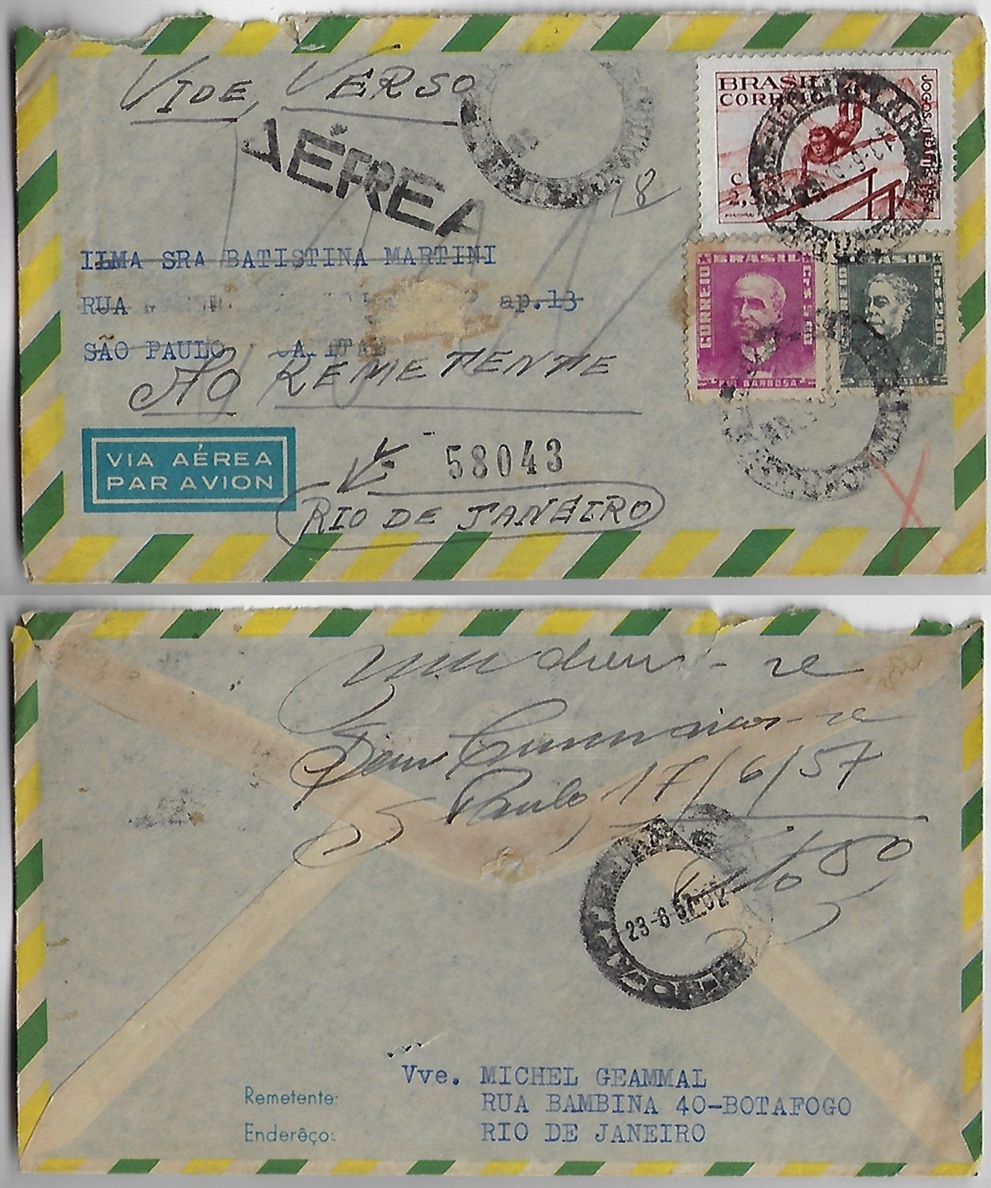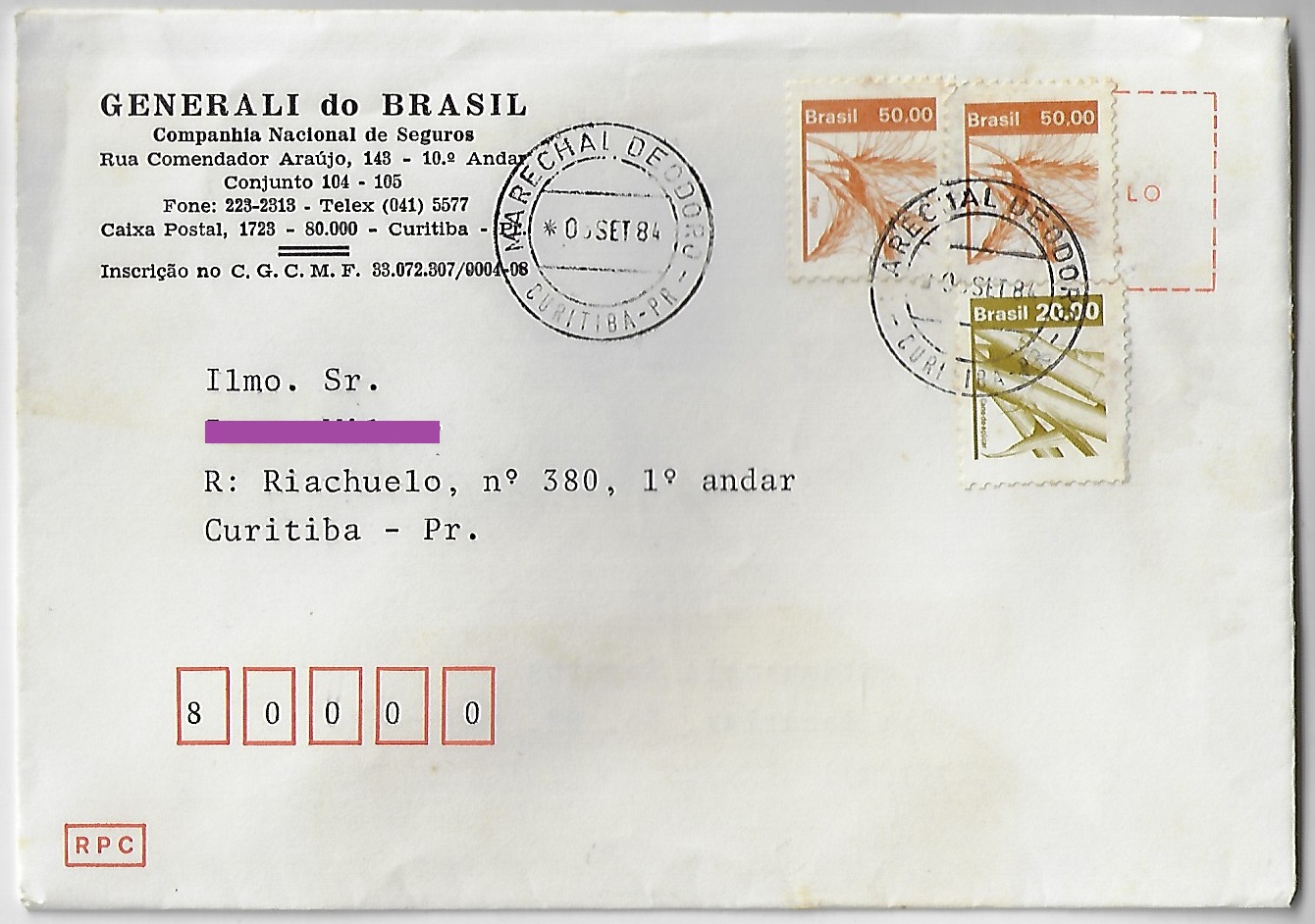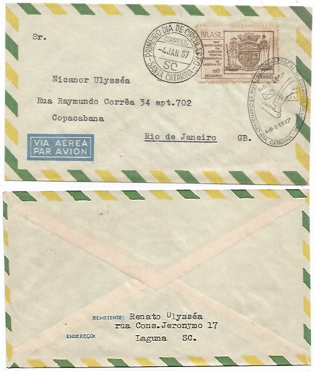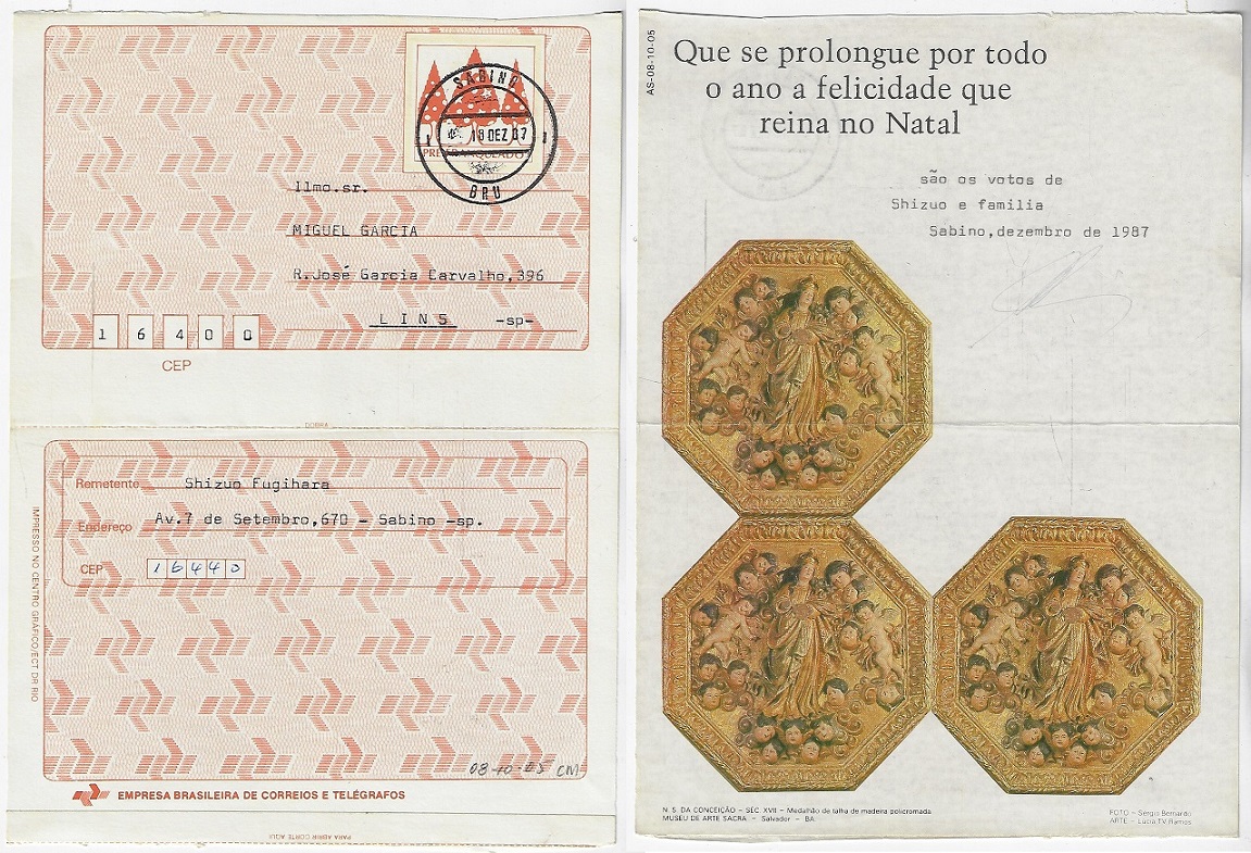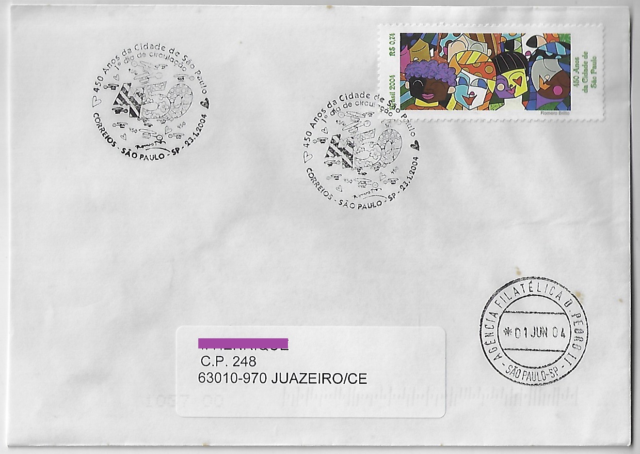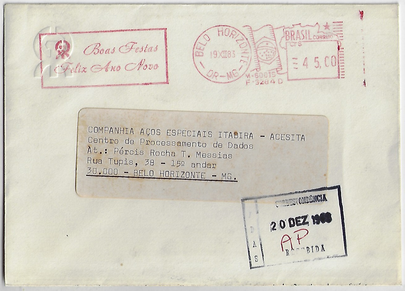| 80884 | 2023, envelope prioritário registrado enviado de Biguaçu (21/11) para San Francisco / EUA, retornado ao remetente, marcas de triagem eletrônica na frente e no verso, 5 selos comemorativos 1ª Conferência Nacional da Juventure e 2 regulares Engraxate | 10,00 | Foto |