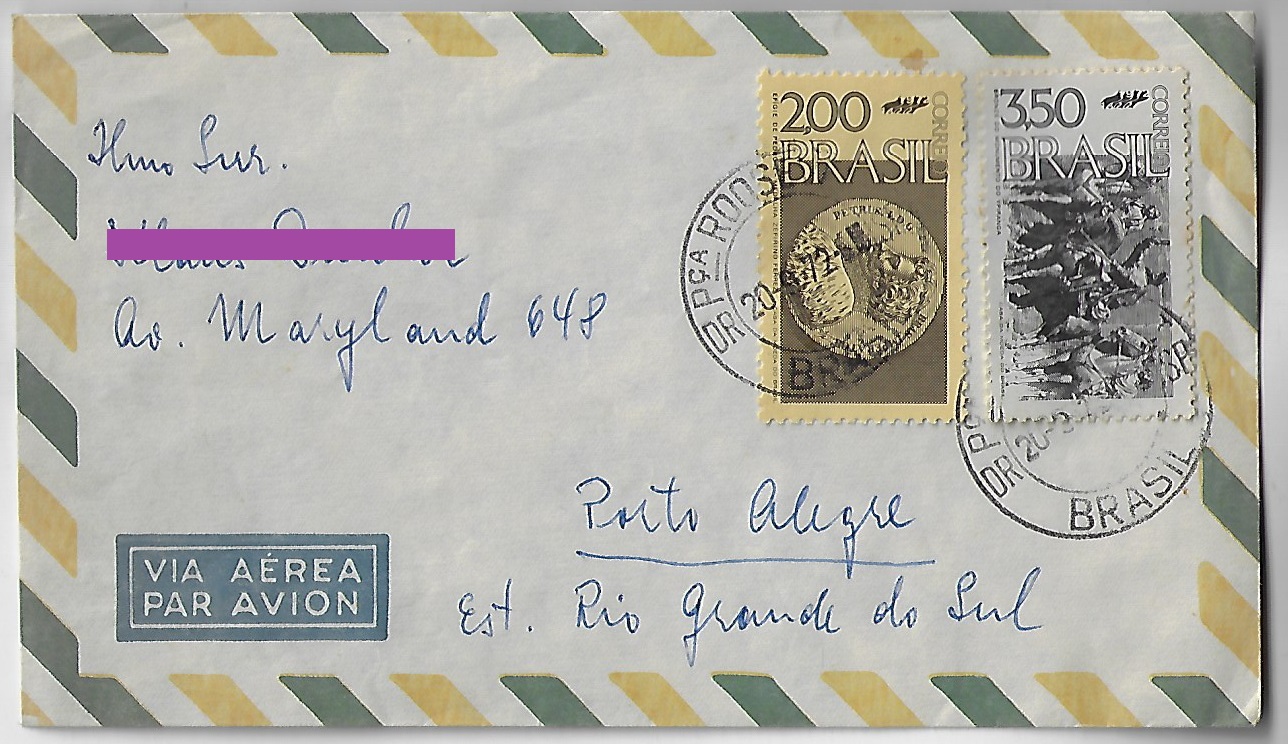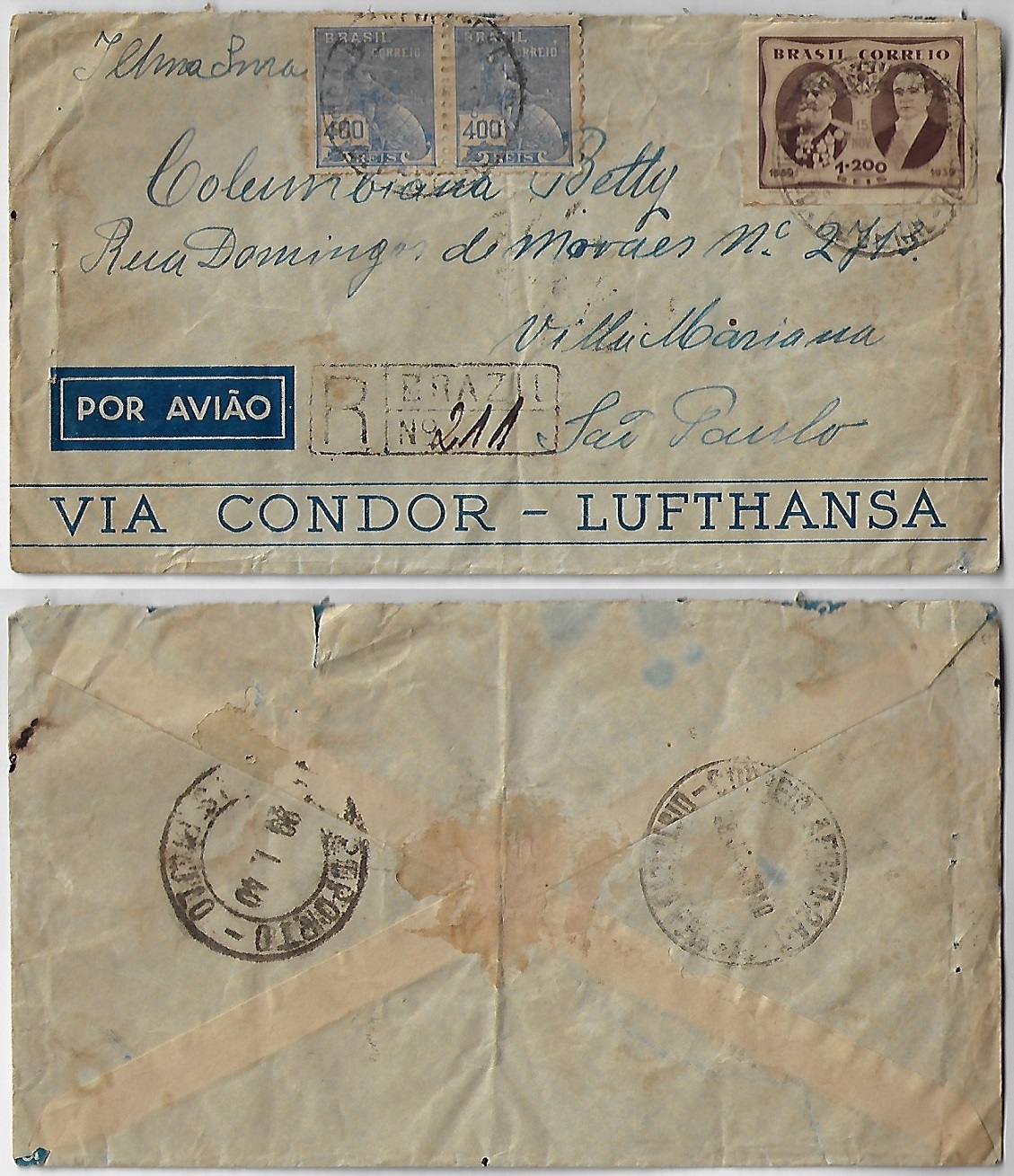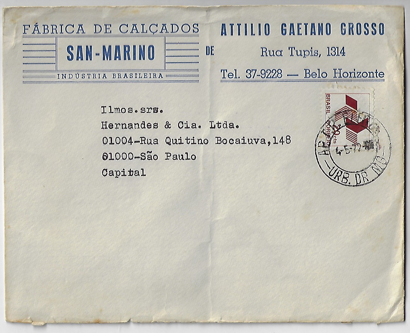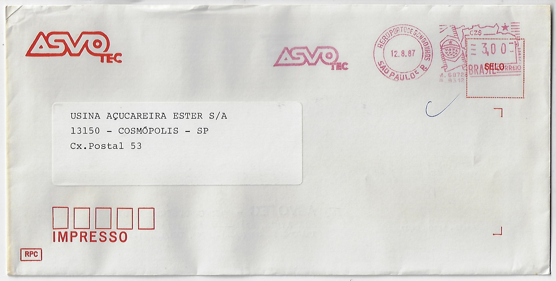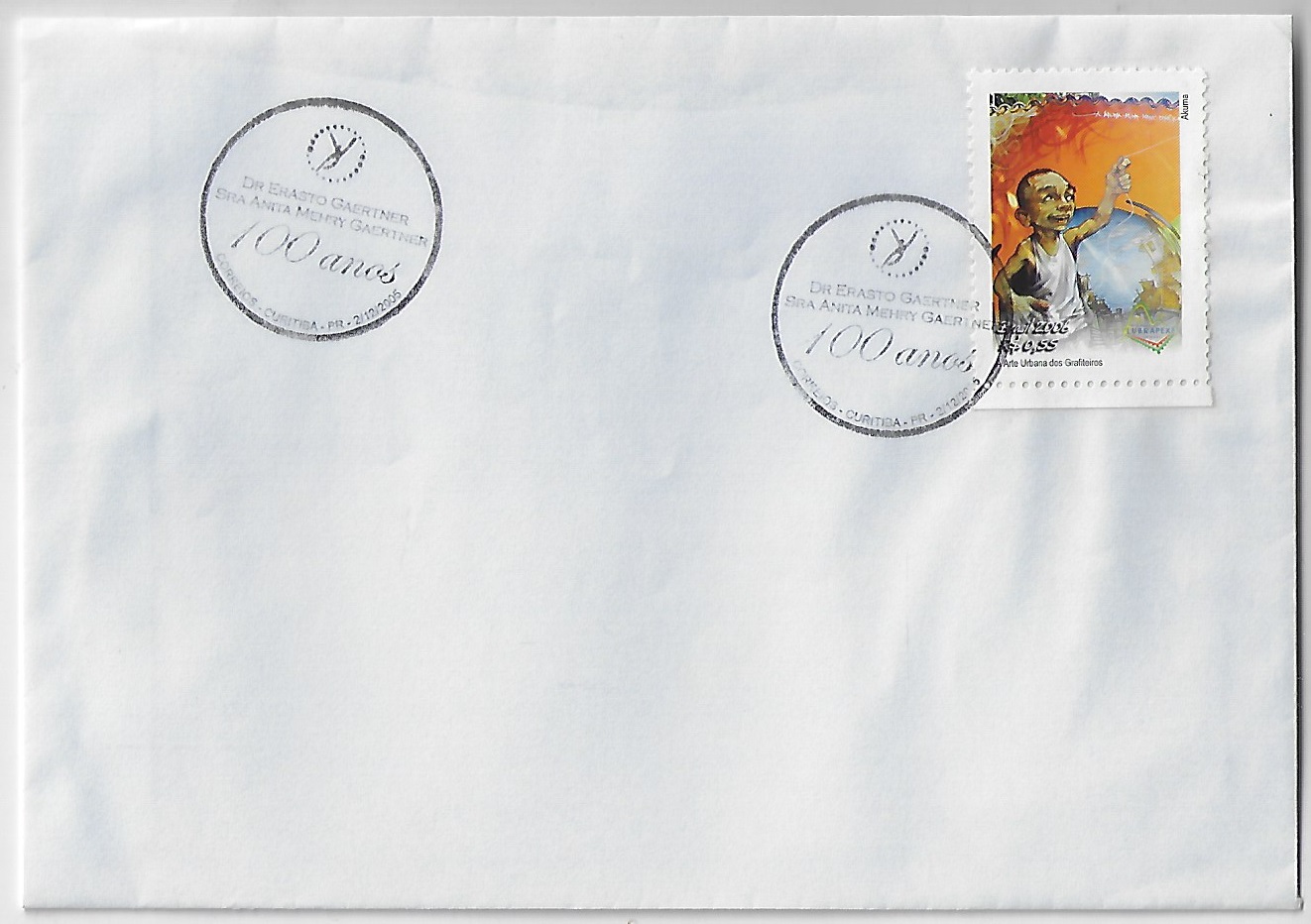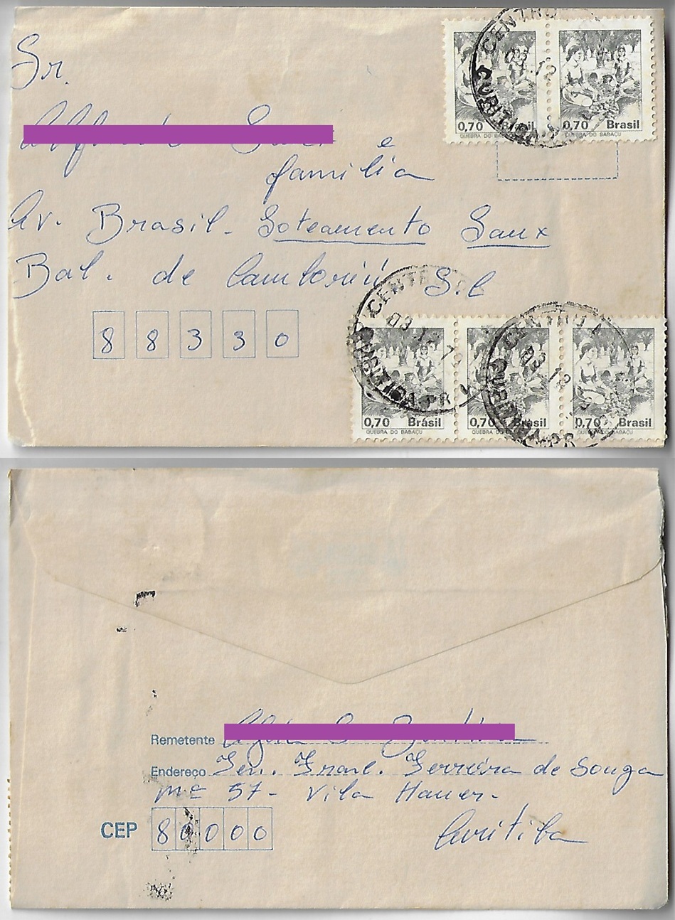 | 80884 | 2023, envelope prioritário registrado enviado de Biguaçu (21/11) para San Francisco / EUA, retornado ao remetente, marcas de triagem eletrônica na frente e no verso, 5 selos comemorativos 1ª Conferência Nacional da Juventure e 2 regulares Engraxate | 10,00 | Foto |