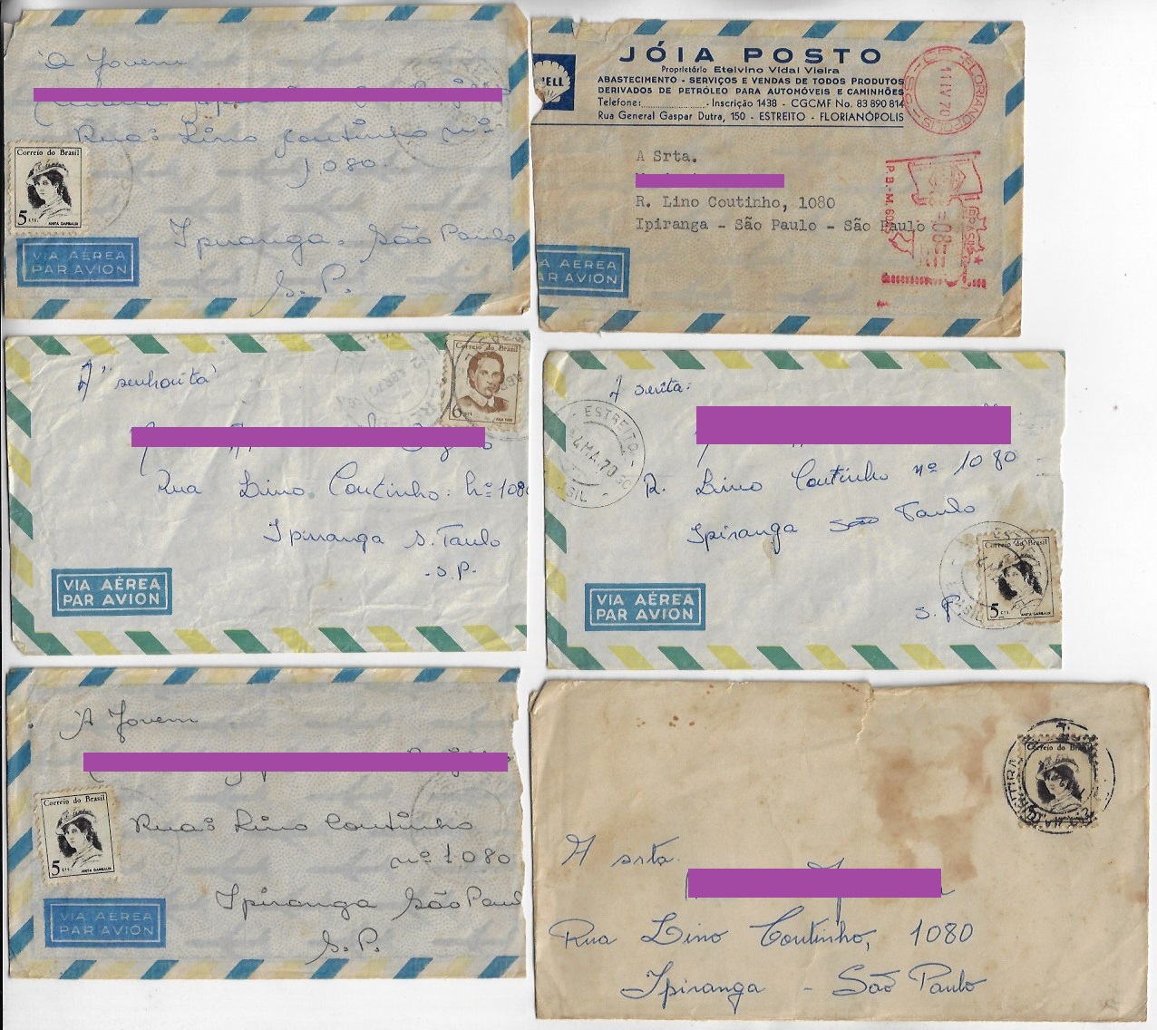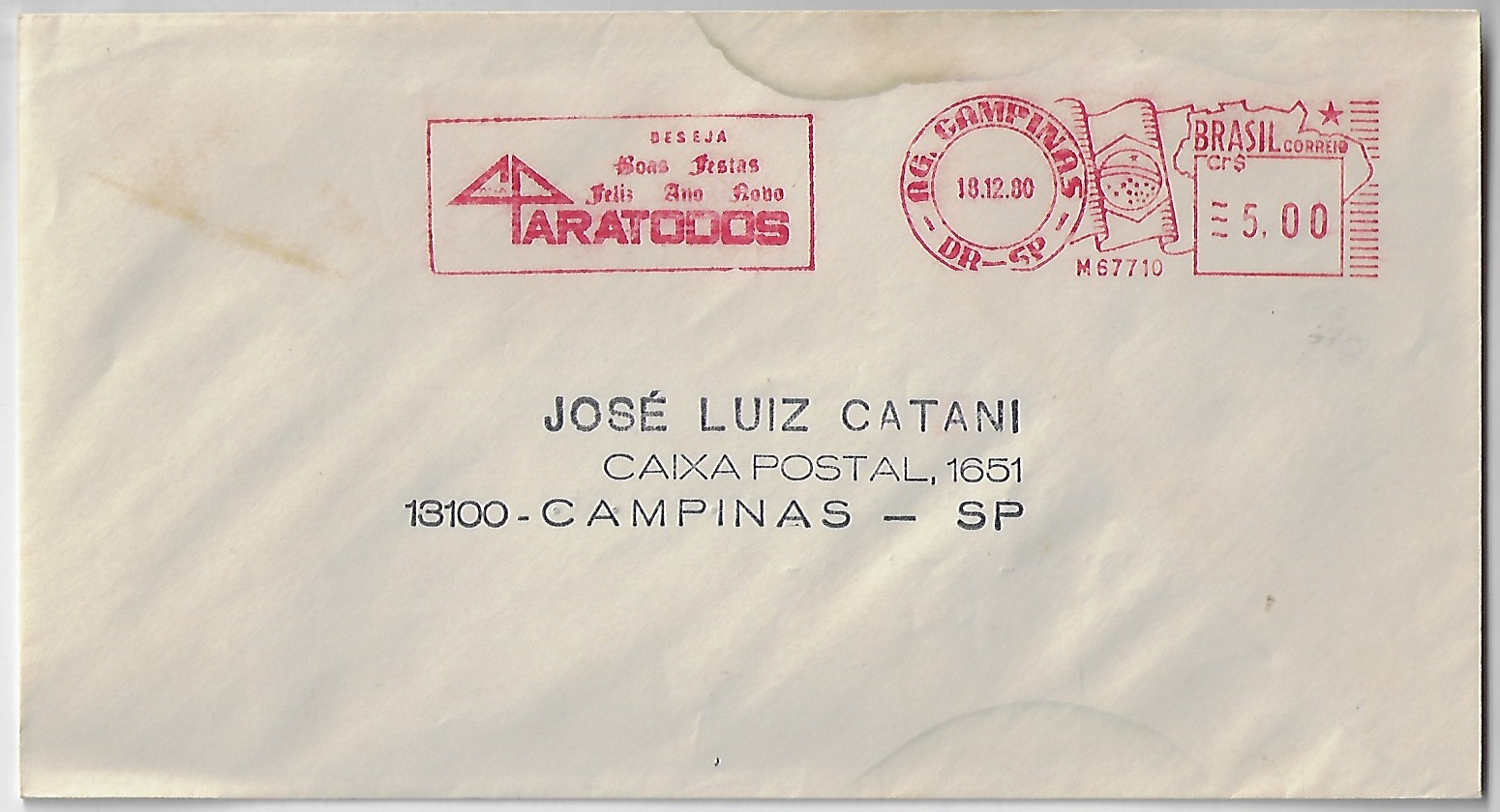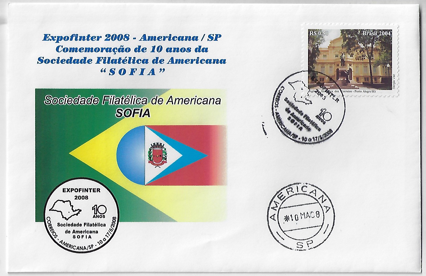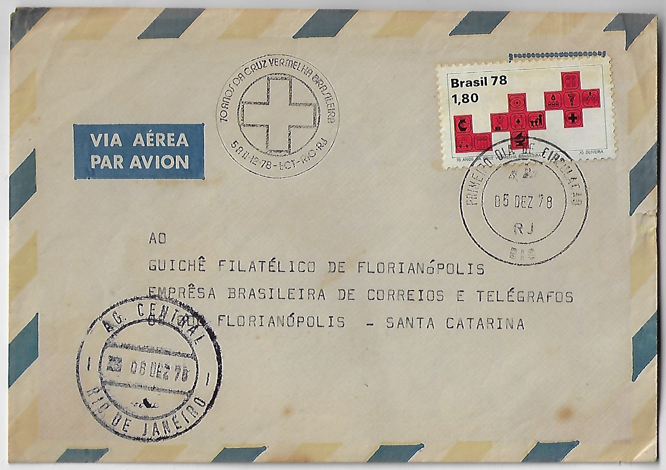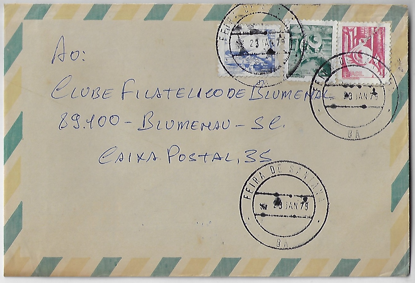 | 80884 | 2023, envelope prioritário registrado enviado de Biguaçu (21/11) para San Francisco / EUA, retornado ao remetente, marcas de triagem eletrônica na frente e no verso, 5 selos comemorativos 1ª Conferência Nacional da Juventure e 2 regulares Engraxate | 10,00 | Foto |