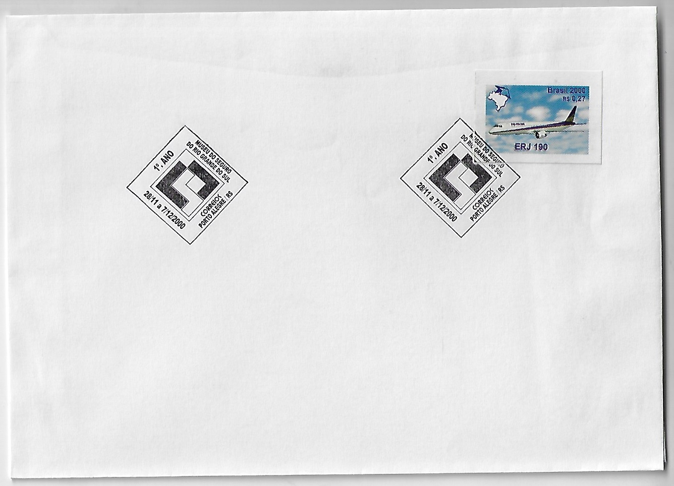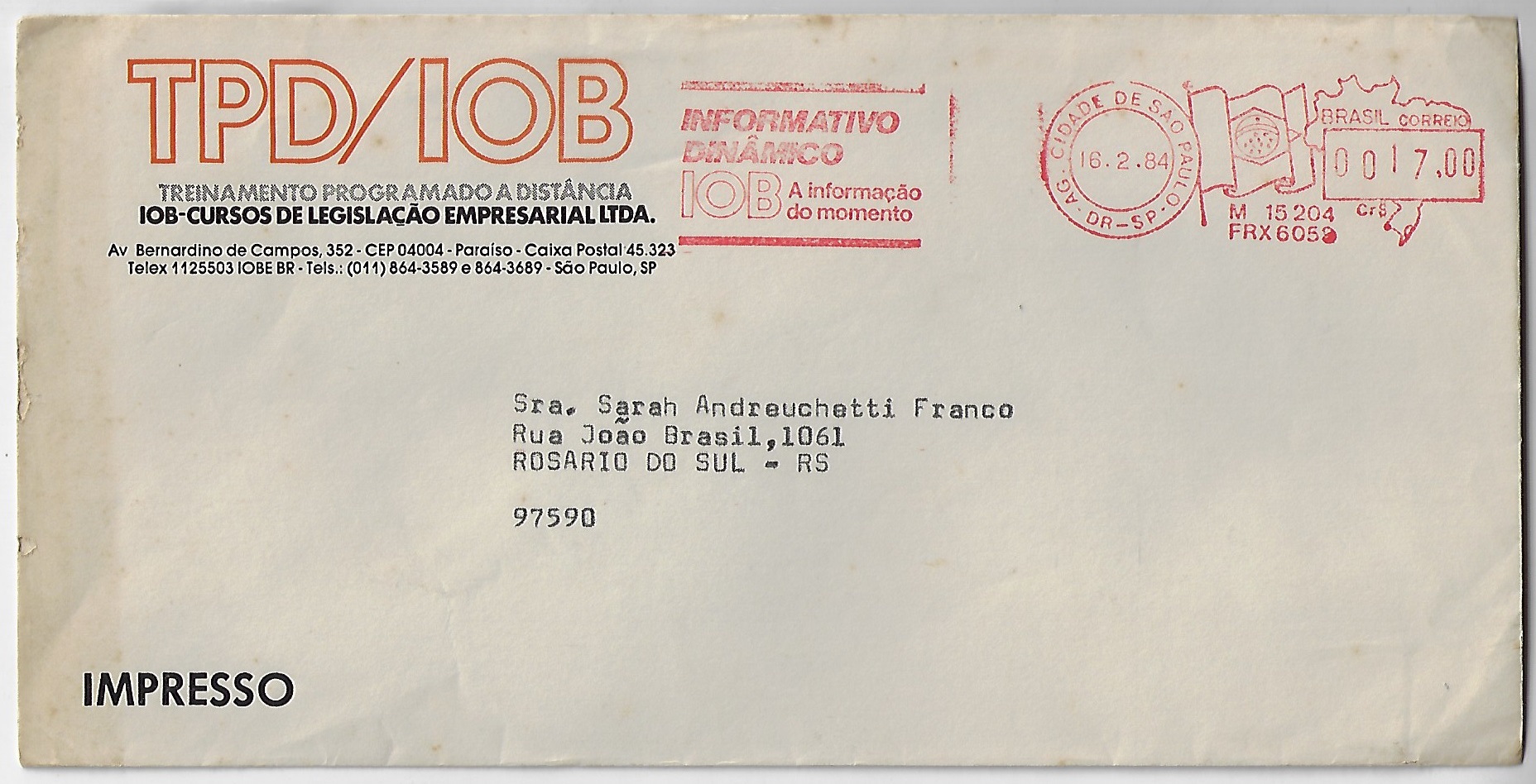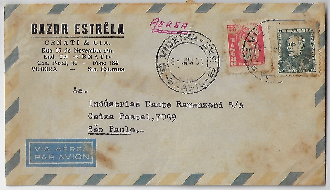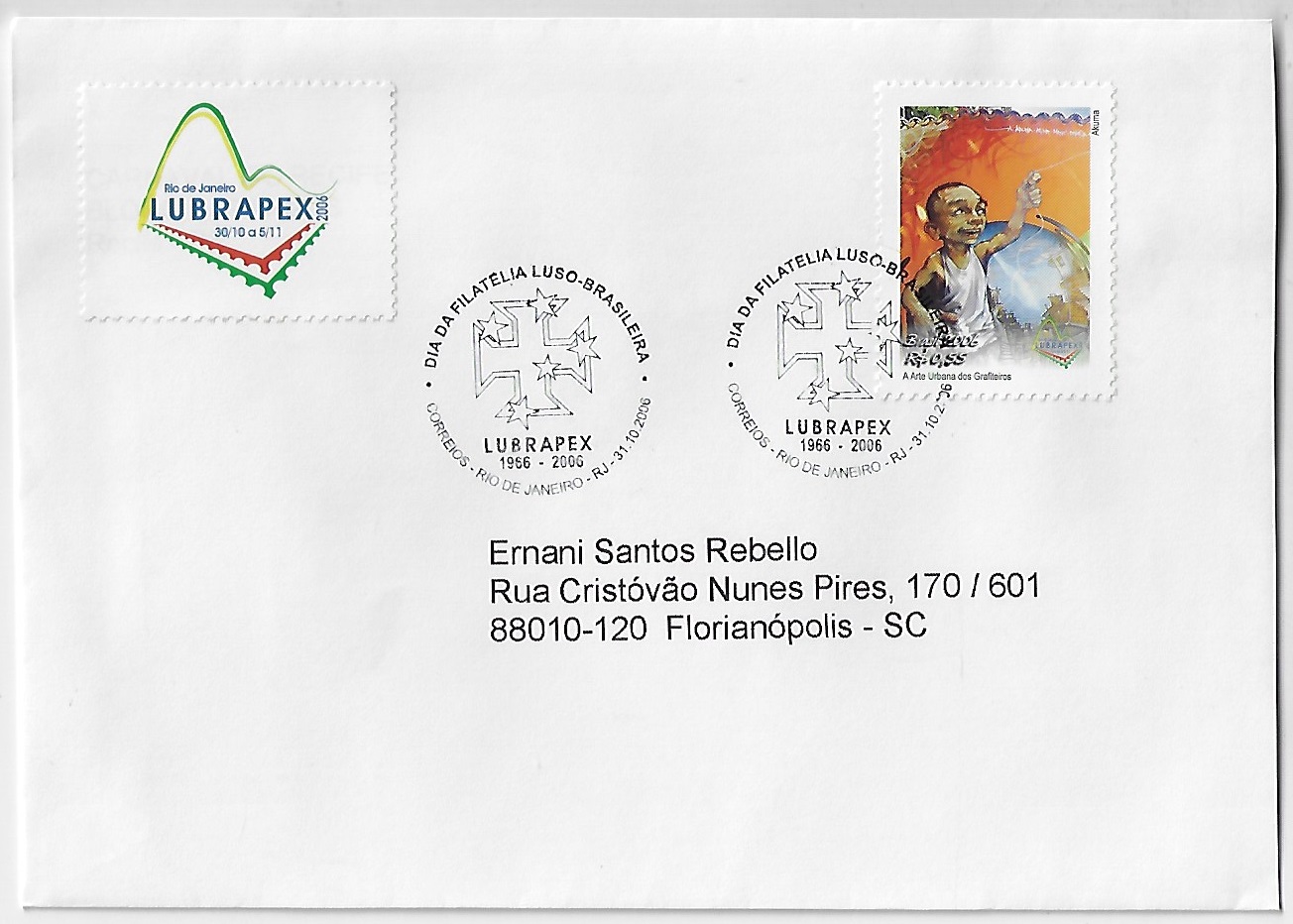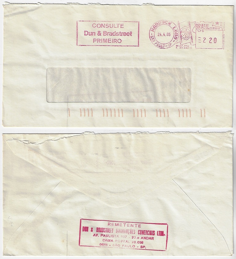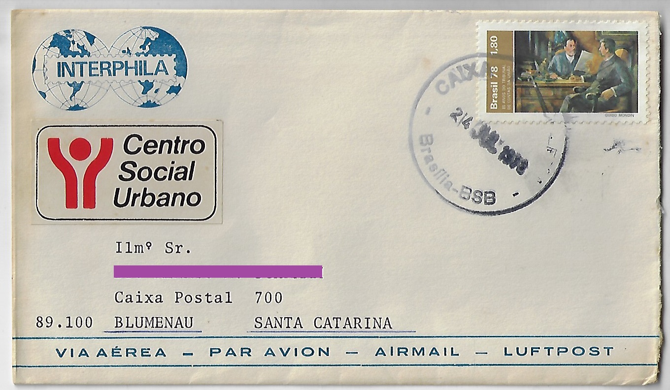 | 80884 | 2023, envelope prioritário registrado enviado de Biguaçu (21/11) para San Francisco / EUA, retornado ao remetente, marcas de triagem eletrônica na frente e no verso, 5 selos comemorativos 1ª Conferência Nacional da Juventure e 2 regulares Engraxate | 10,00 | Foto |