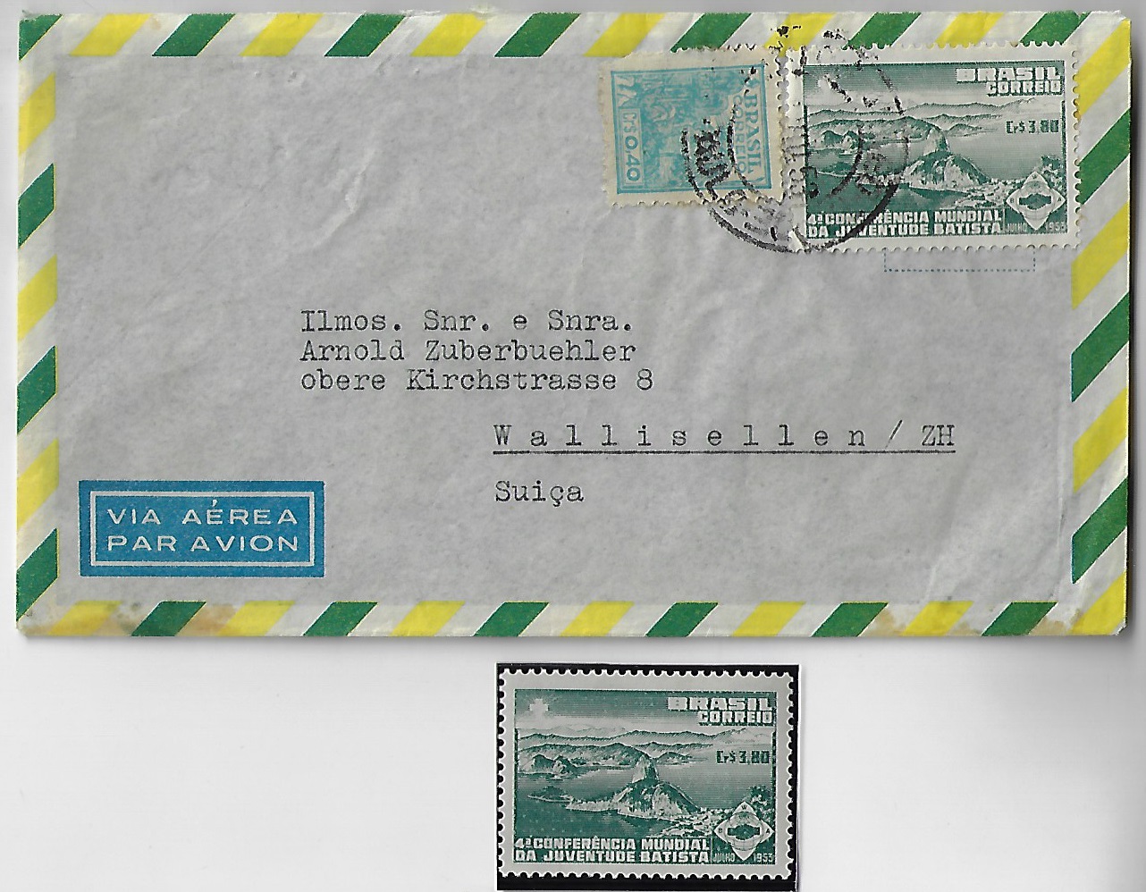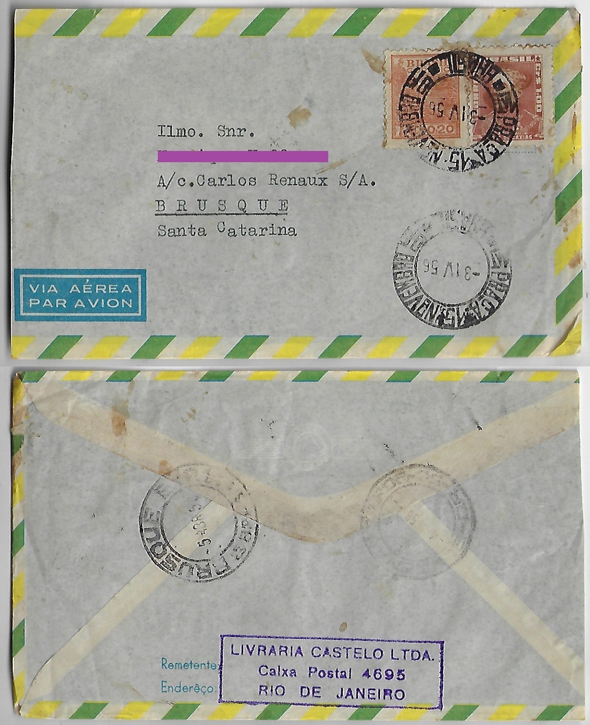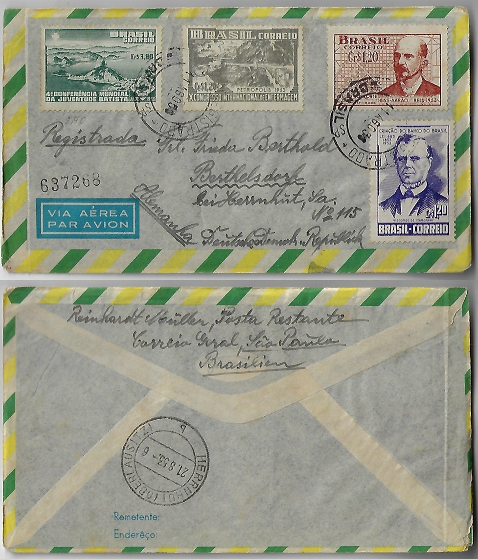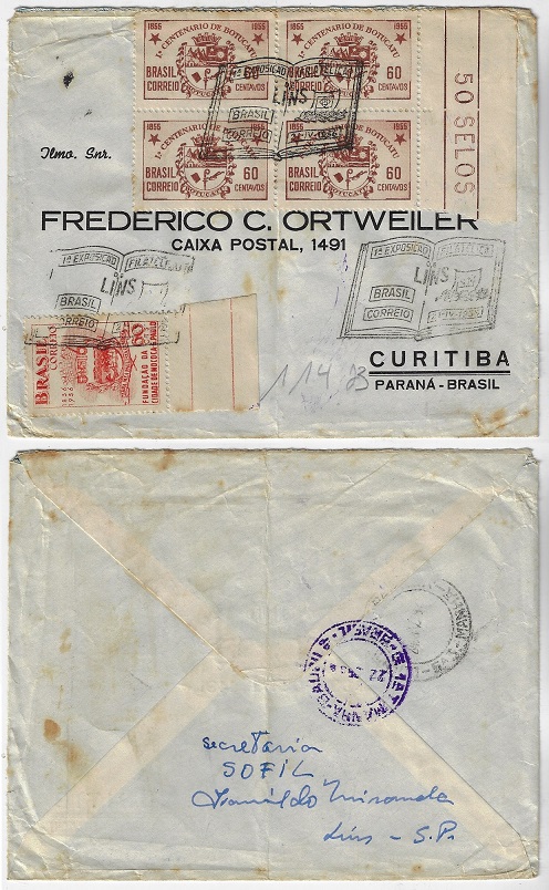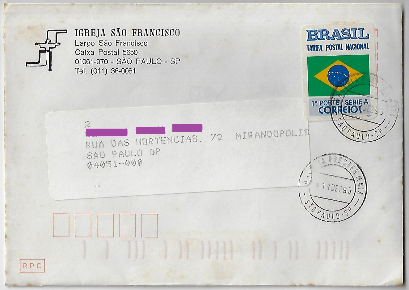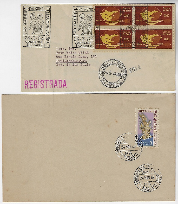 | 80884 | 2023, envelope prioritário registrado enviado de Biguaçu (21/11) para San Francisco / EUA, retornado ao remetente, marcas de triagem eletrônica na frente e no verso, 5 selos comemorativos 1ª Conferência Nacional da Juventure e 2 regulares Engraxate | 10,00 | Foto |