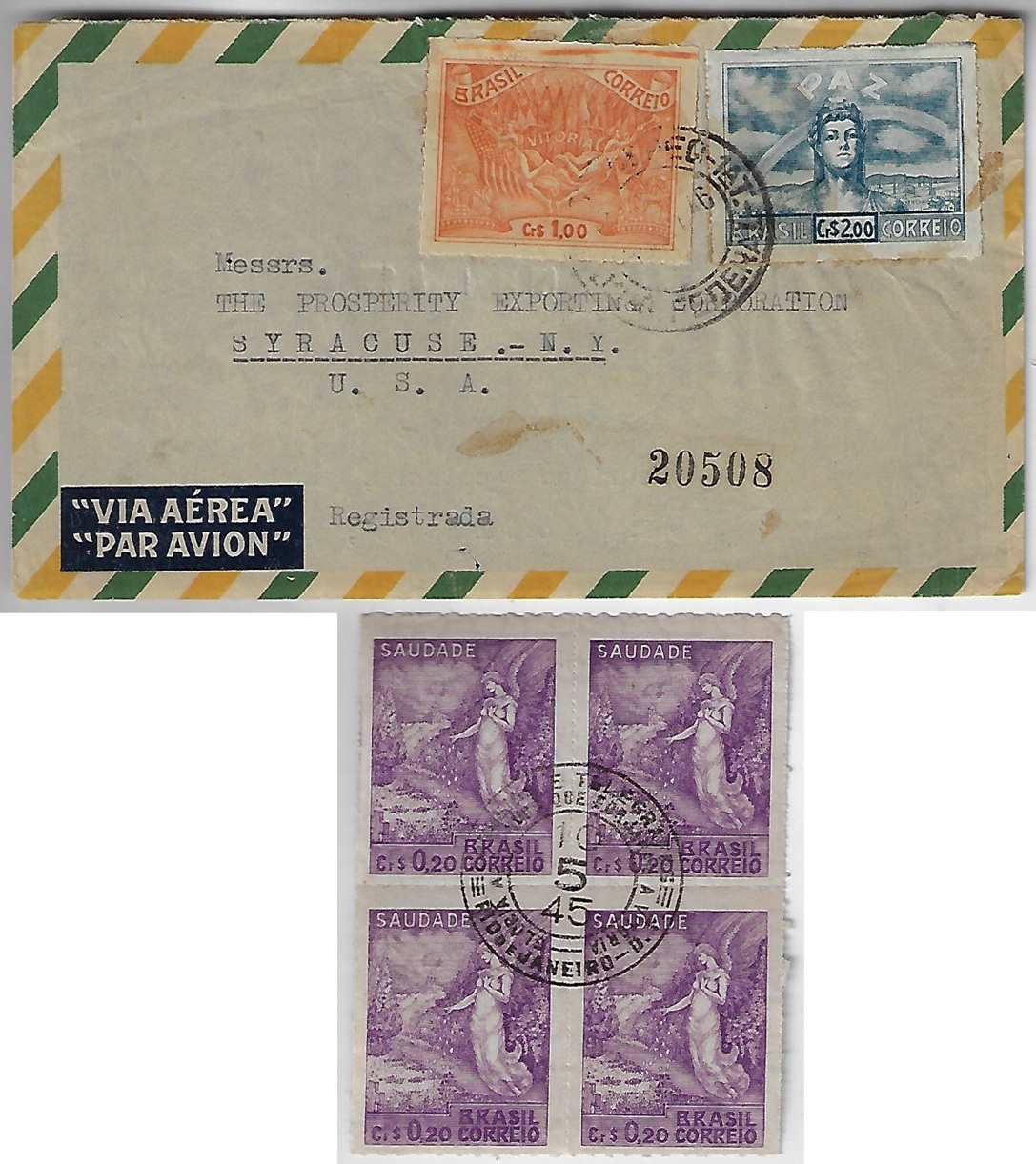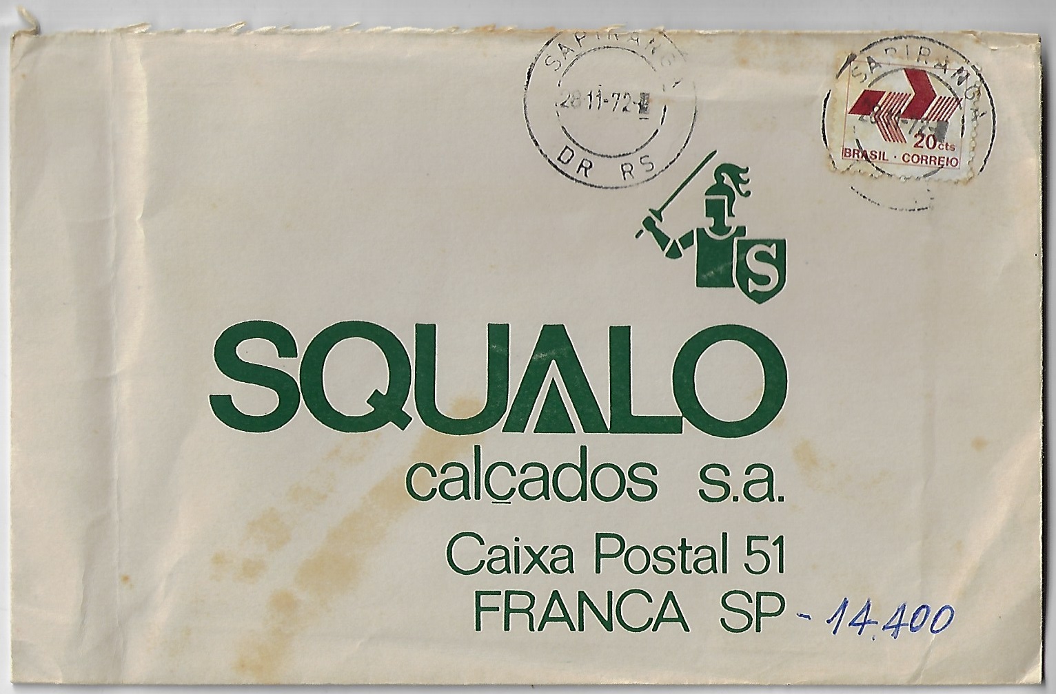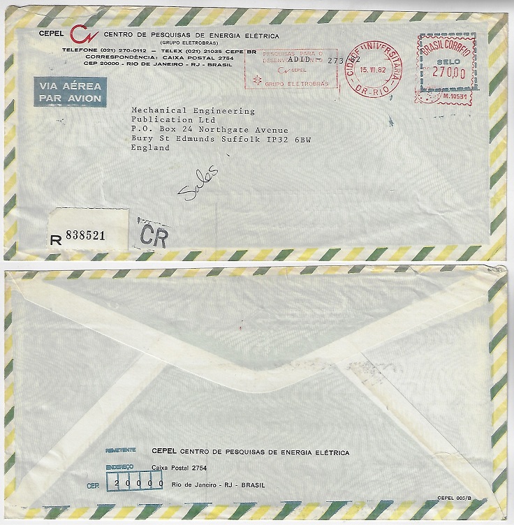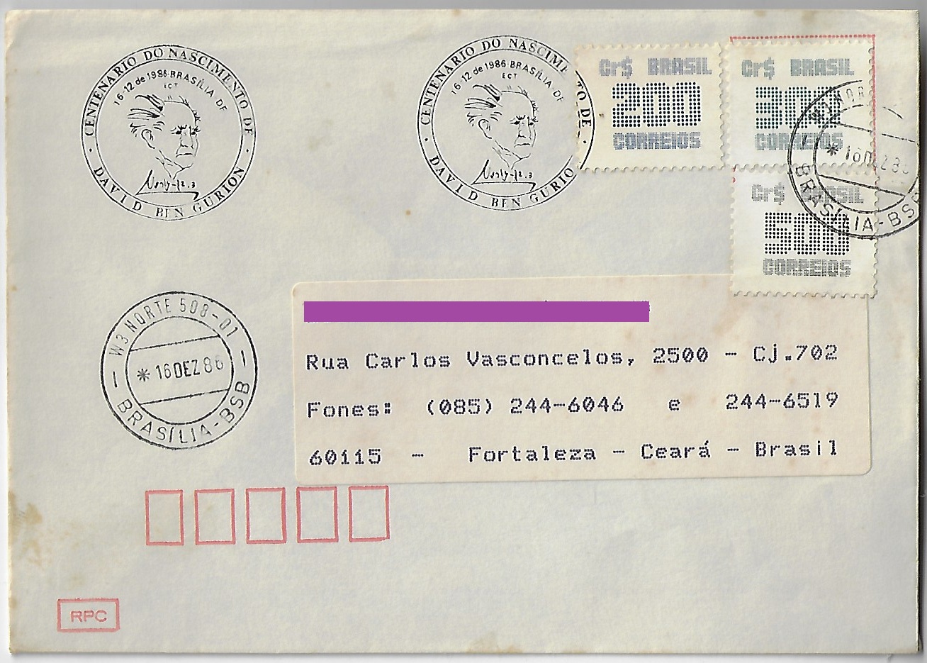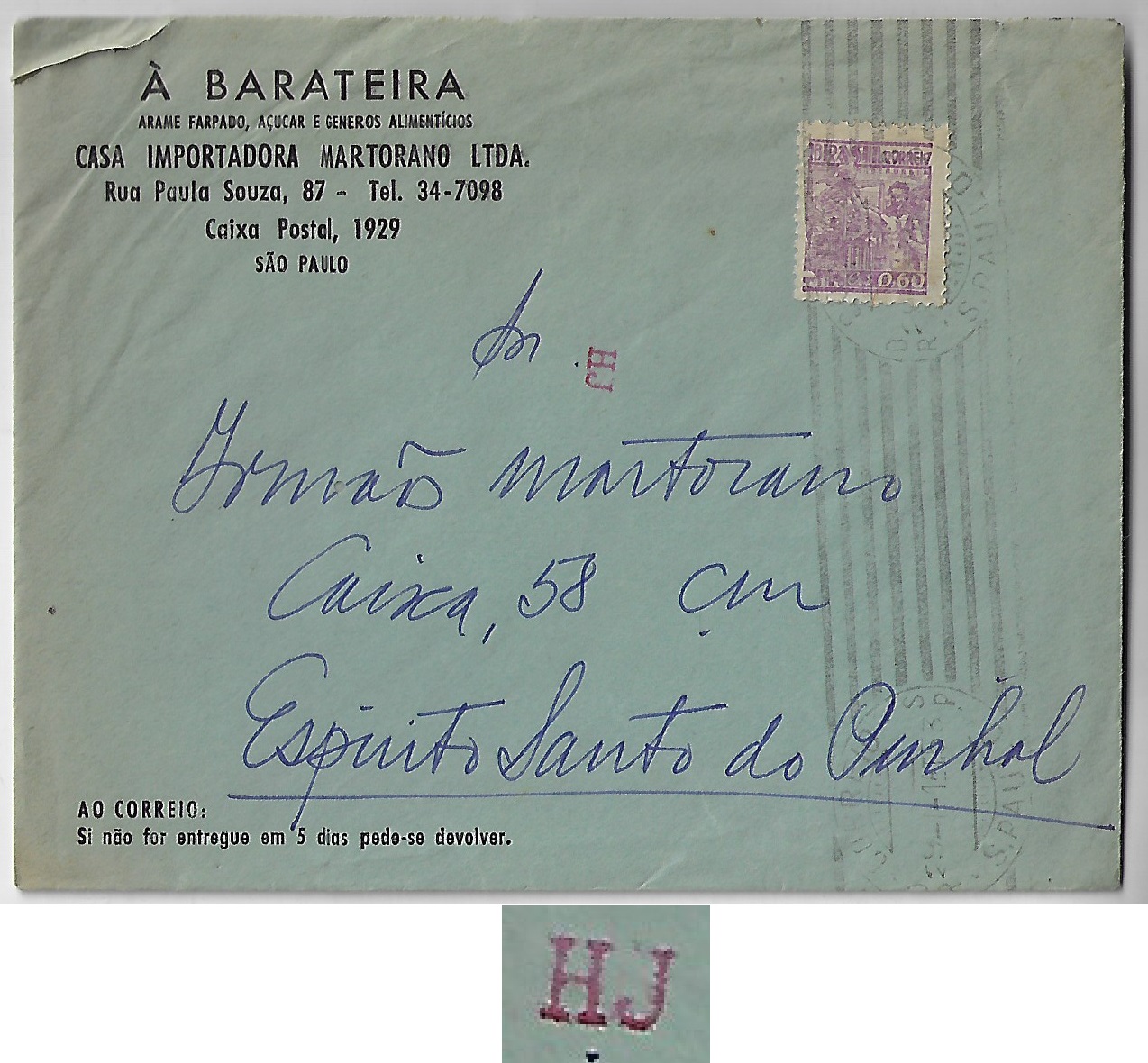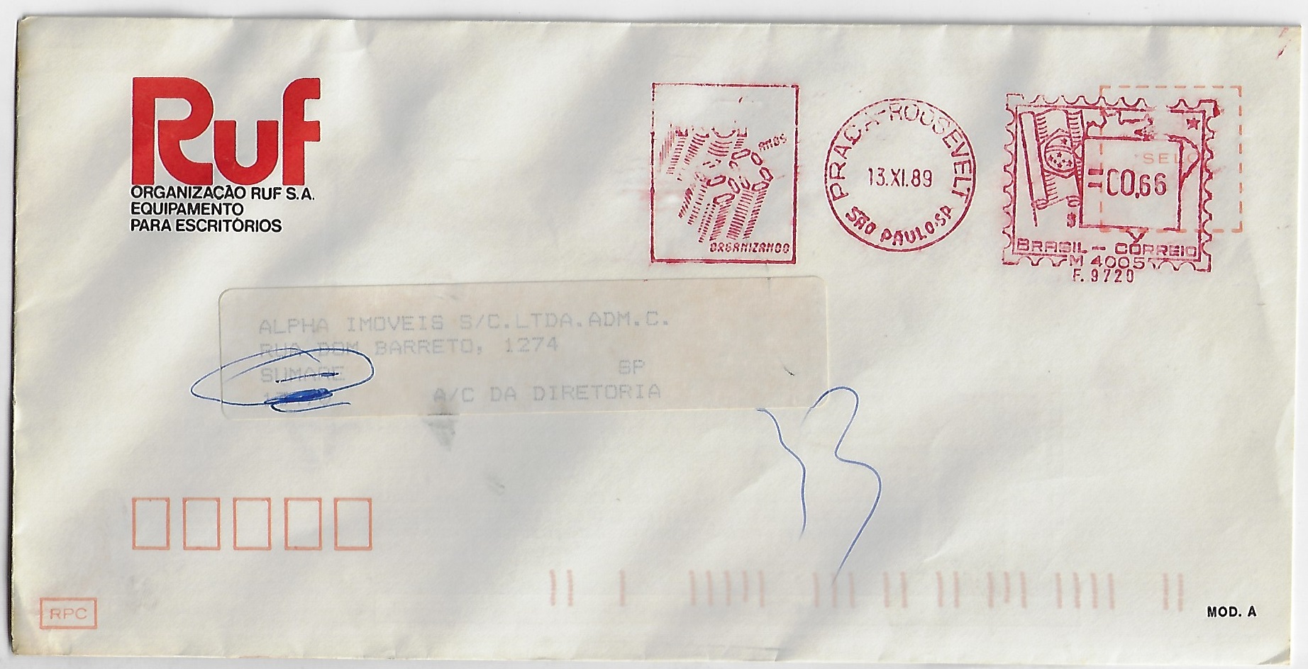 | 80884 | 2023, envelope prioritário registrado enviado de Biguaçu (21/11) para San Francisco / EUA, retornado ao remetente, marcas de triagem eletrônica na frente e no verso, 5 selos comemorativos 1ª Conferência Nacional da Juventure e 2 regulares Engraxate | 10,00 | Foto |