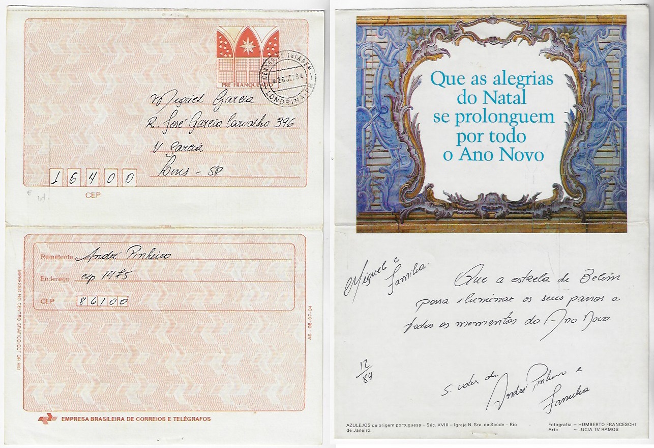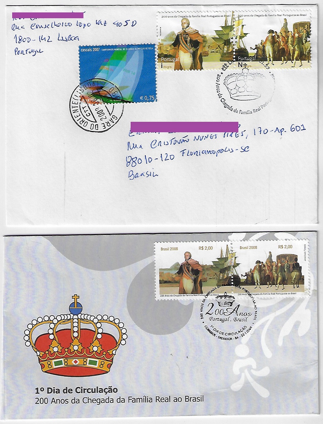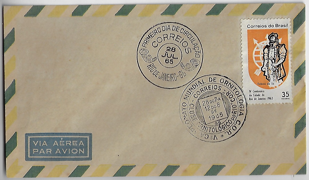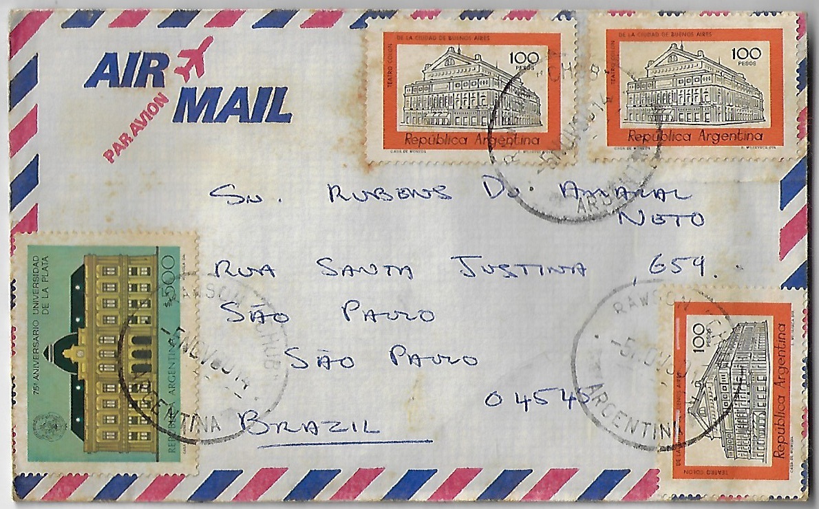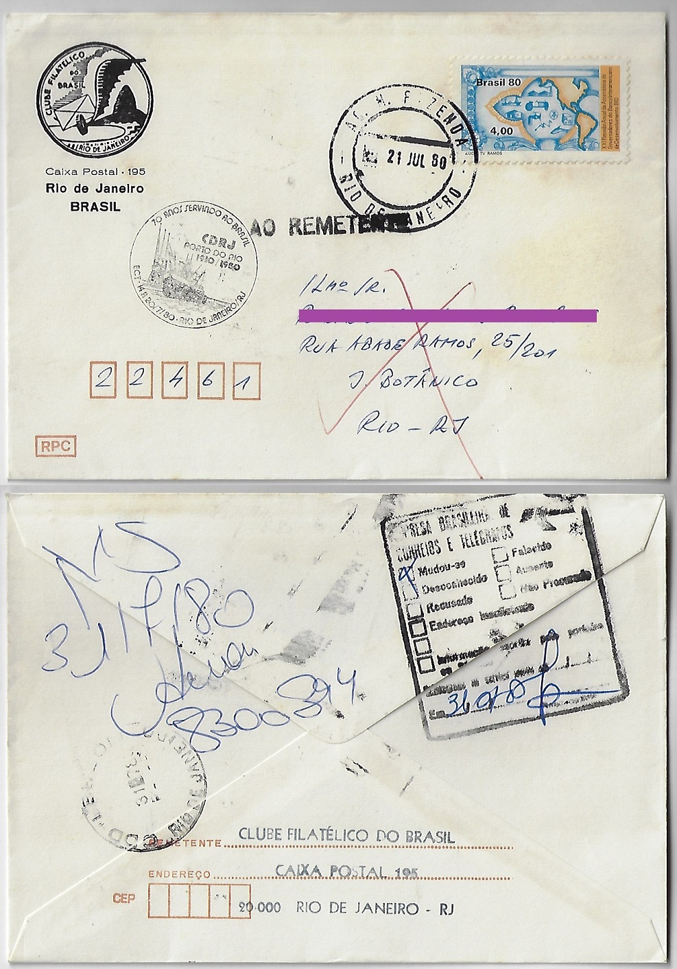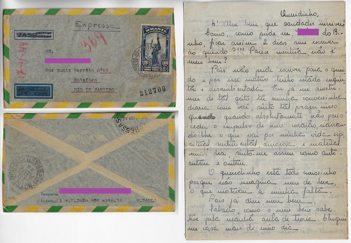 | 80884 | 2023, envelope prioritário registrado enviado de Biguaçu (21/11) para San Francisco / EUA, retornado ao remetente, marcas de triagem eletrônica na frente e no verso, 5 selos comemorativos 1ª Conferência Nacional da Juventure e 2 regulares Engraxate | 10,00 | Foto |