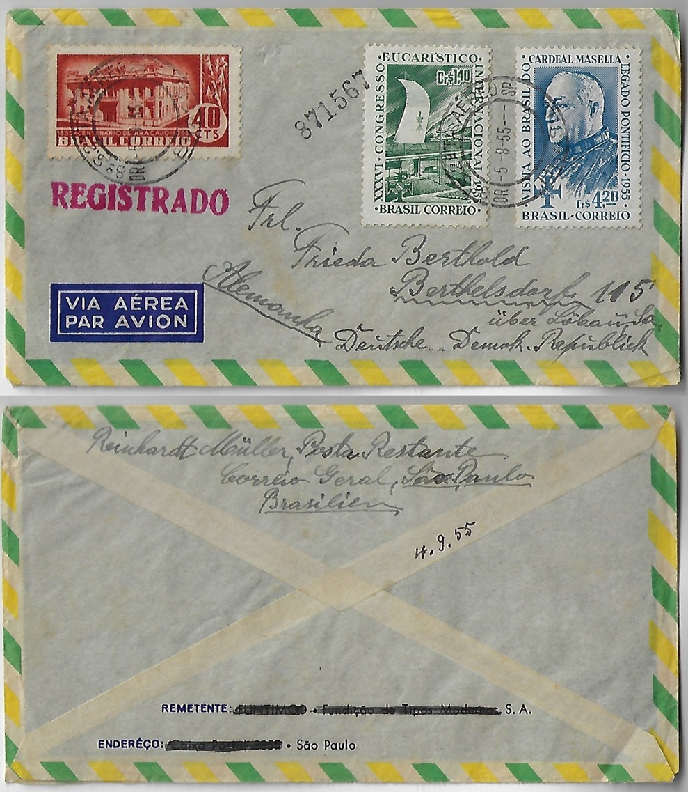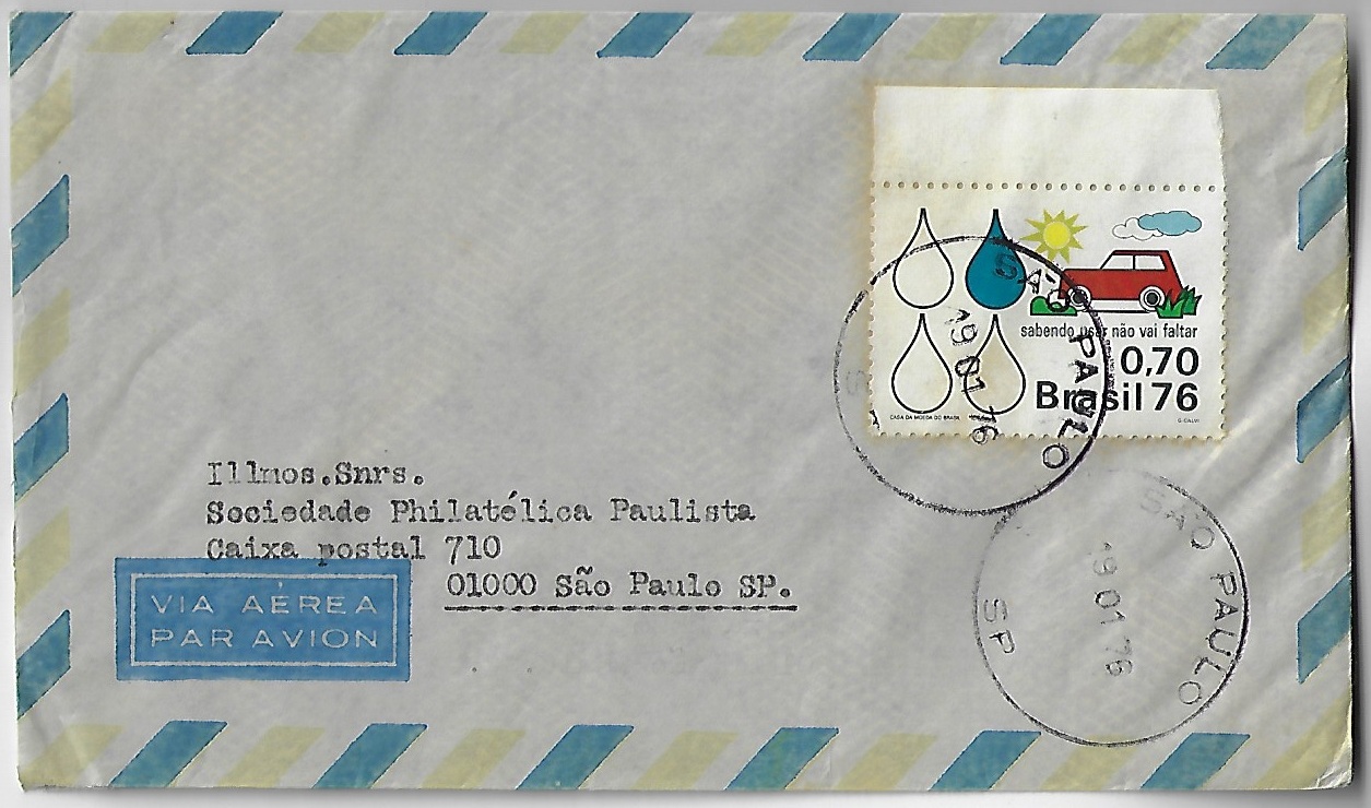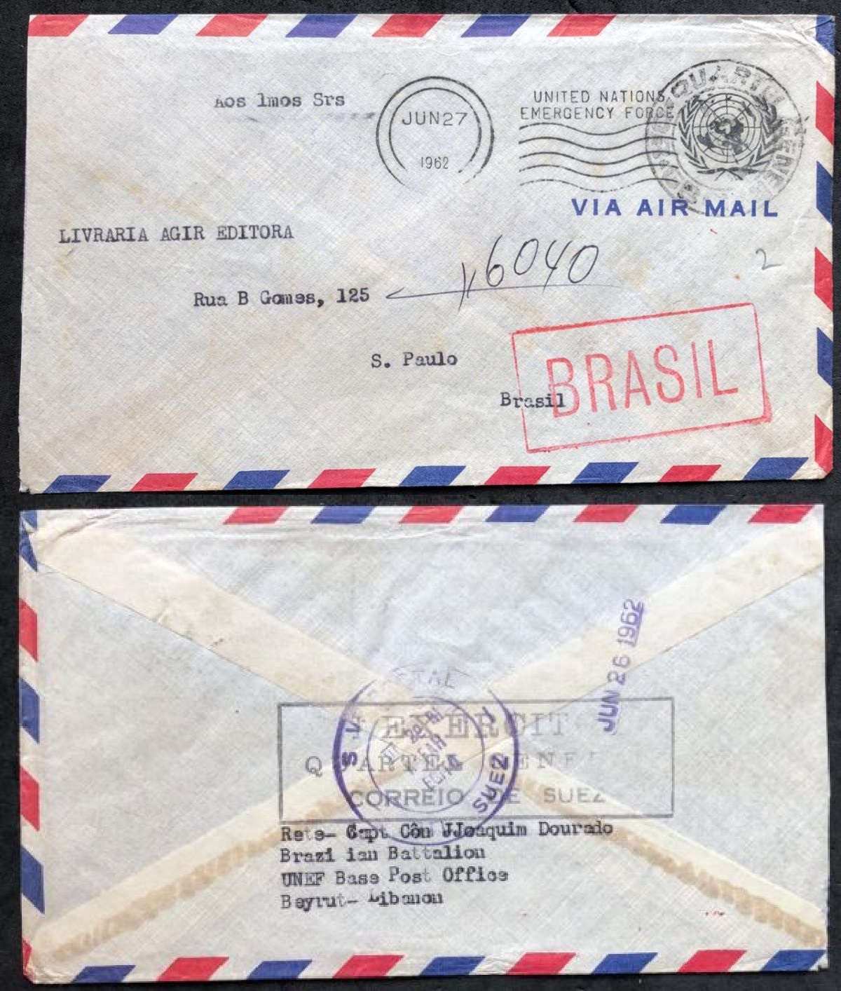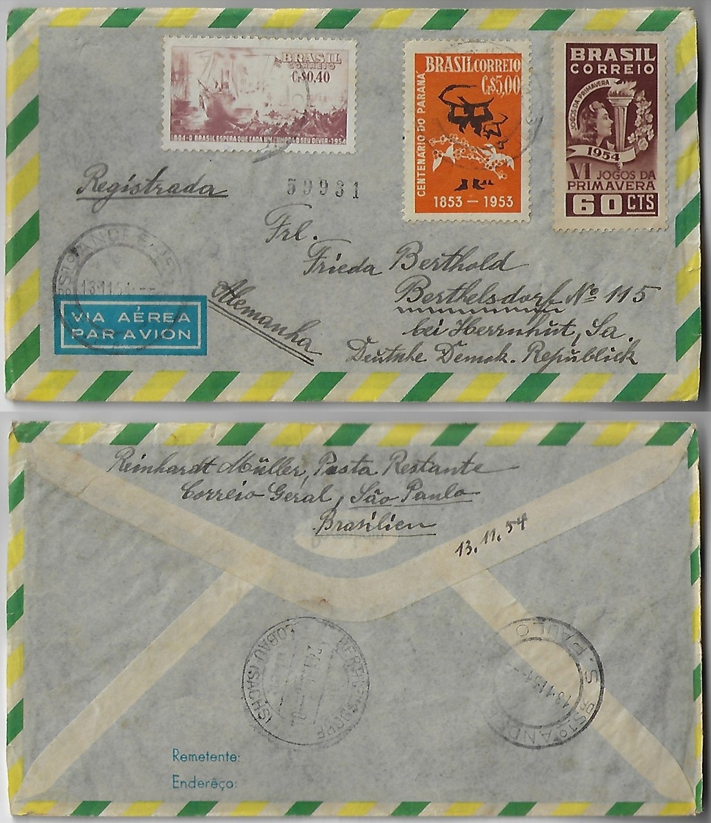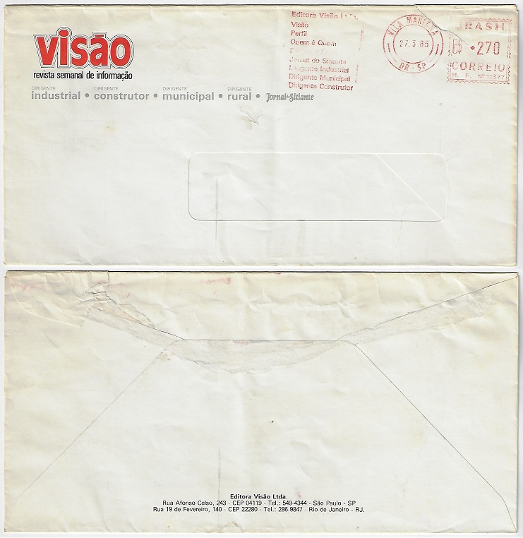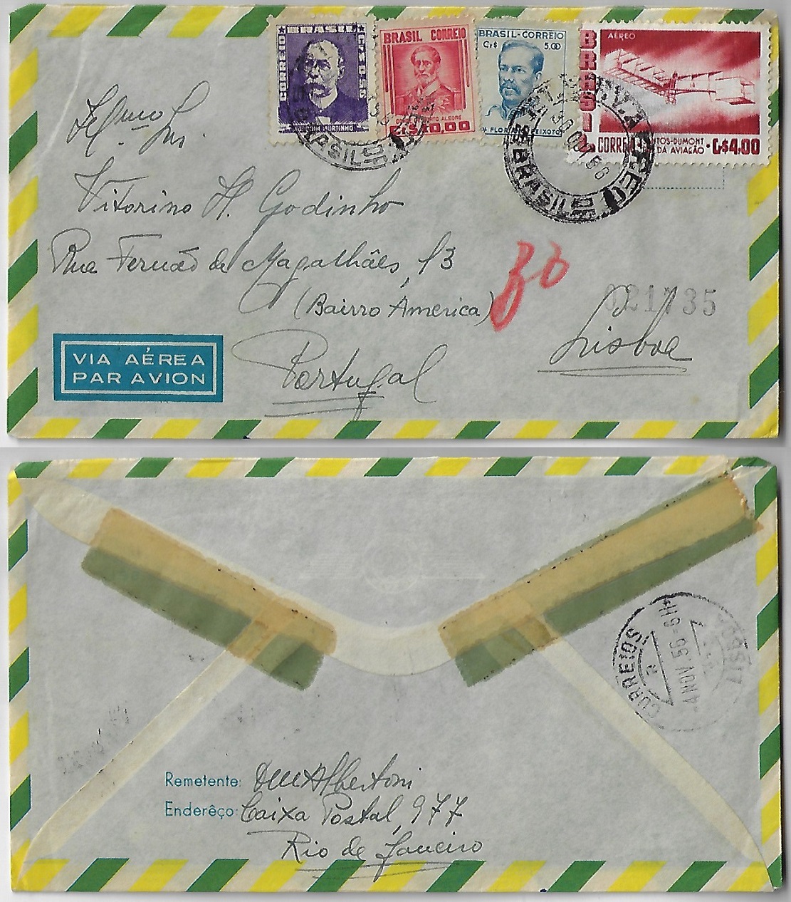 | 80884 | 2023, envelope prioritário registrado enviado de Biguaçu (21/11) para San Francisco / EUA, retornado ao remetente, marcas de triagem eletrônica na frente e no verso, 5 selos comemorativos 1ª Conferência Nacional da Juventure e 2 regulares Engraxate | 10,00 | Foto |