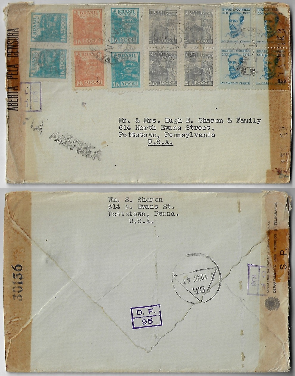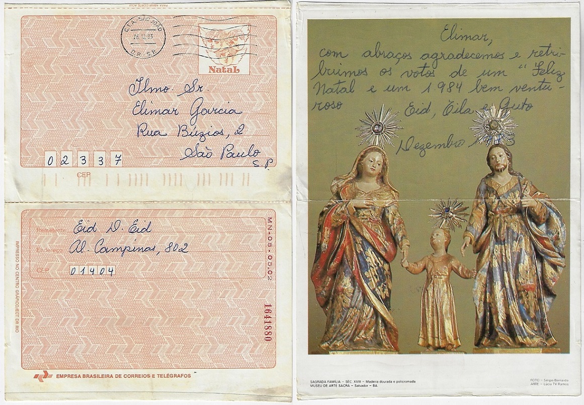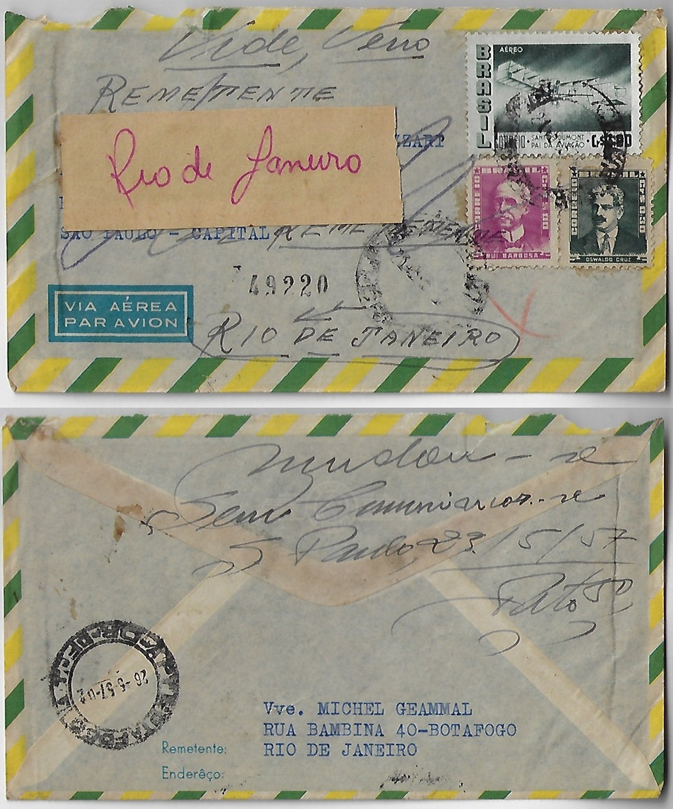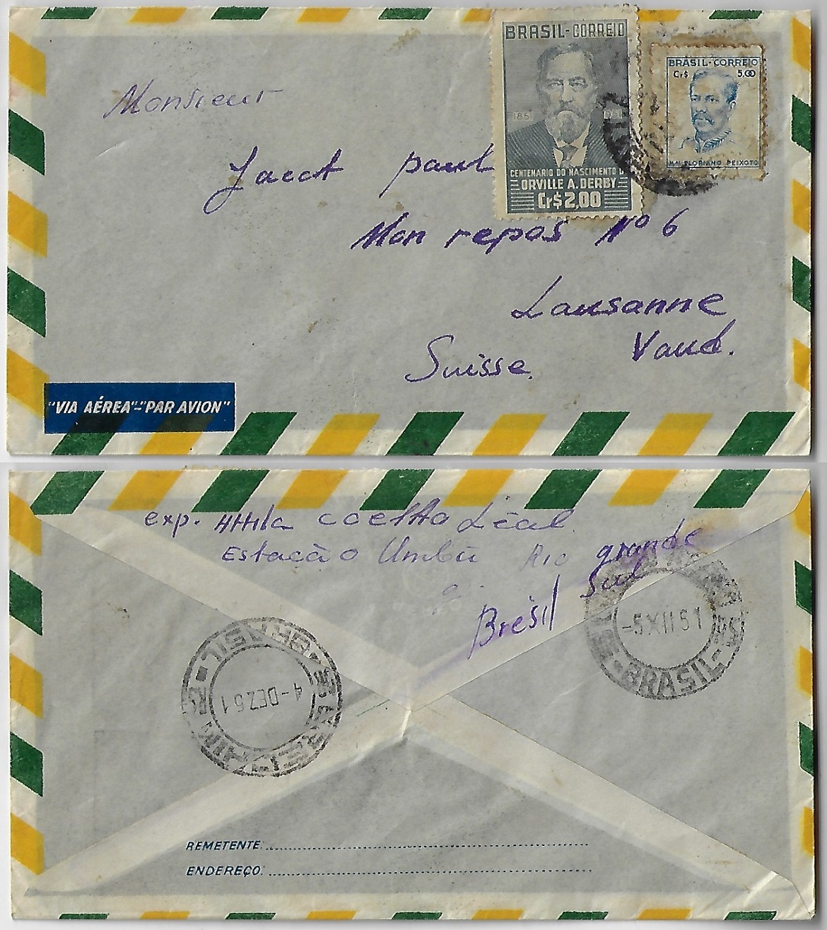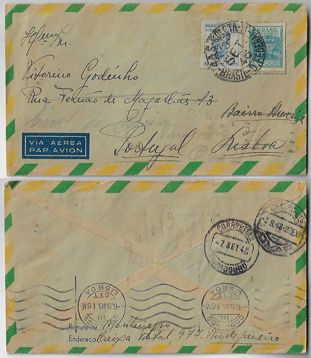 | 80884 | 2023, envelope prioritário registrado enviado de Biguaçu (21/11) para San Francisco / EUA, retornado ao remetente, marcas de triagem eletrônica na frente e no verso, 5 selos comemorativos 1ª Conferência Nacional da Juventure e 2 regulares Engraxate | 10,00 | Foto |