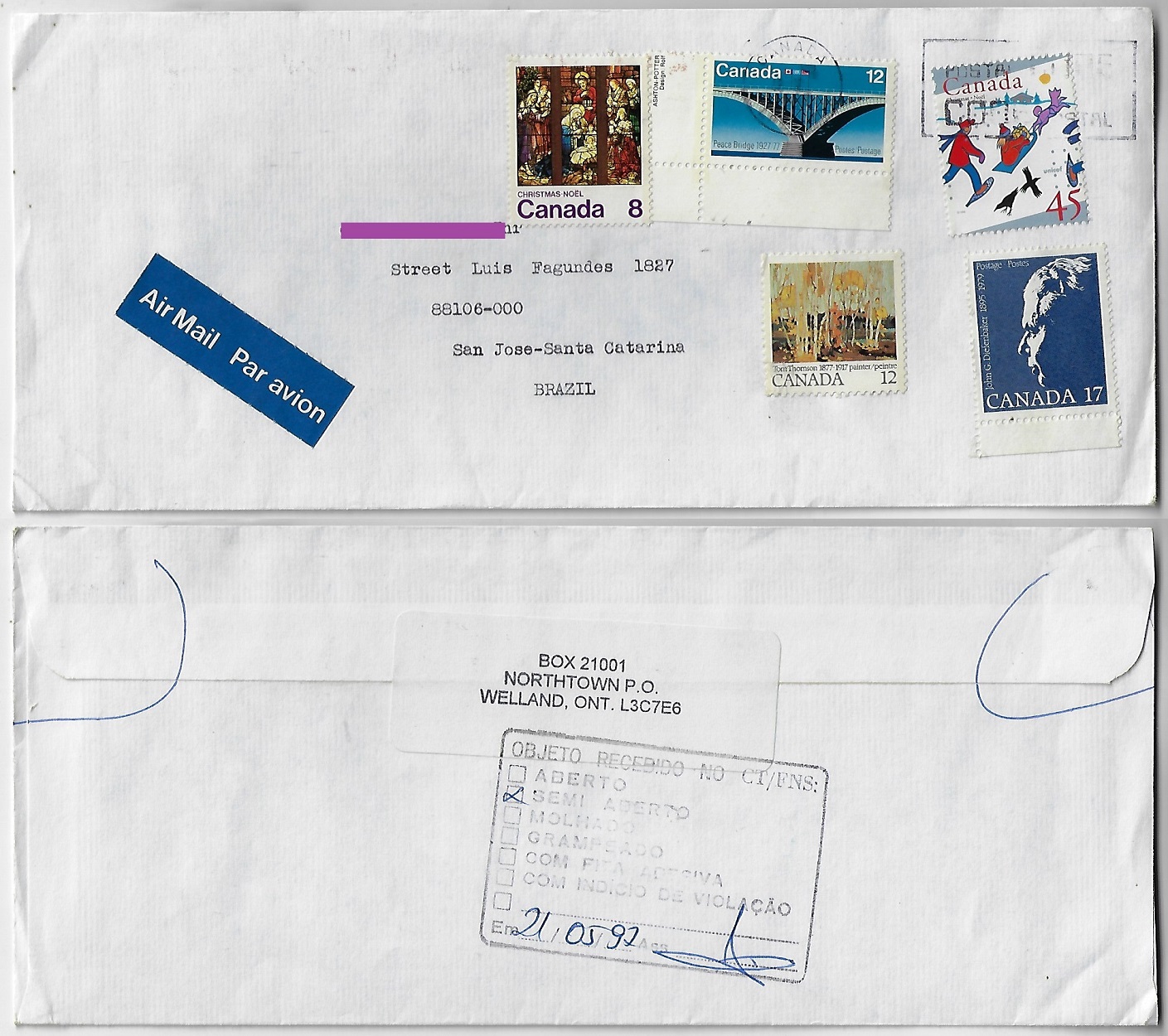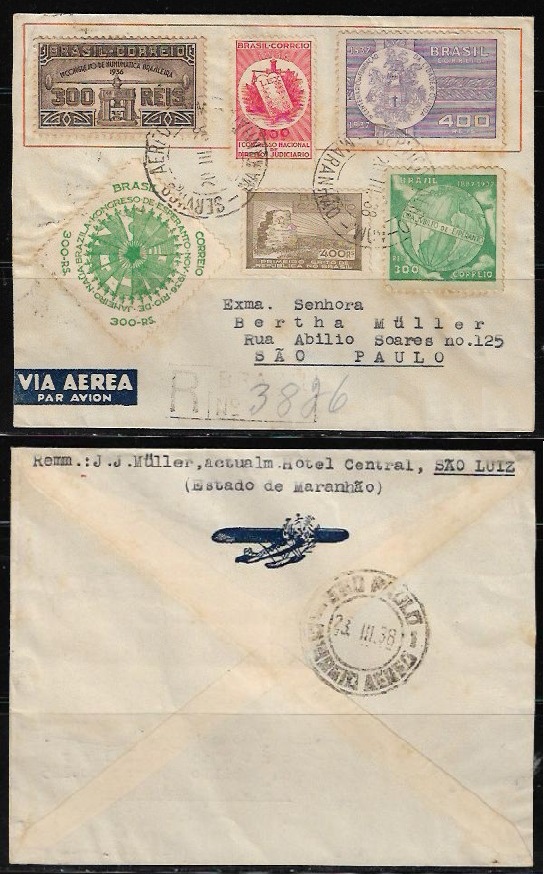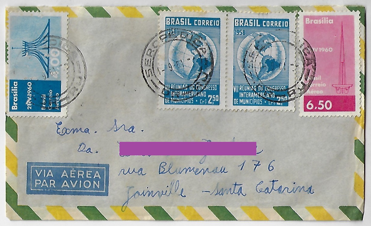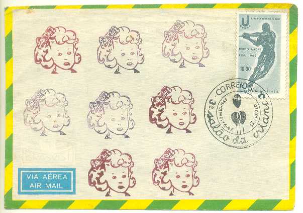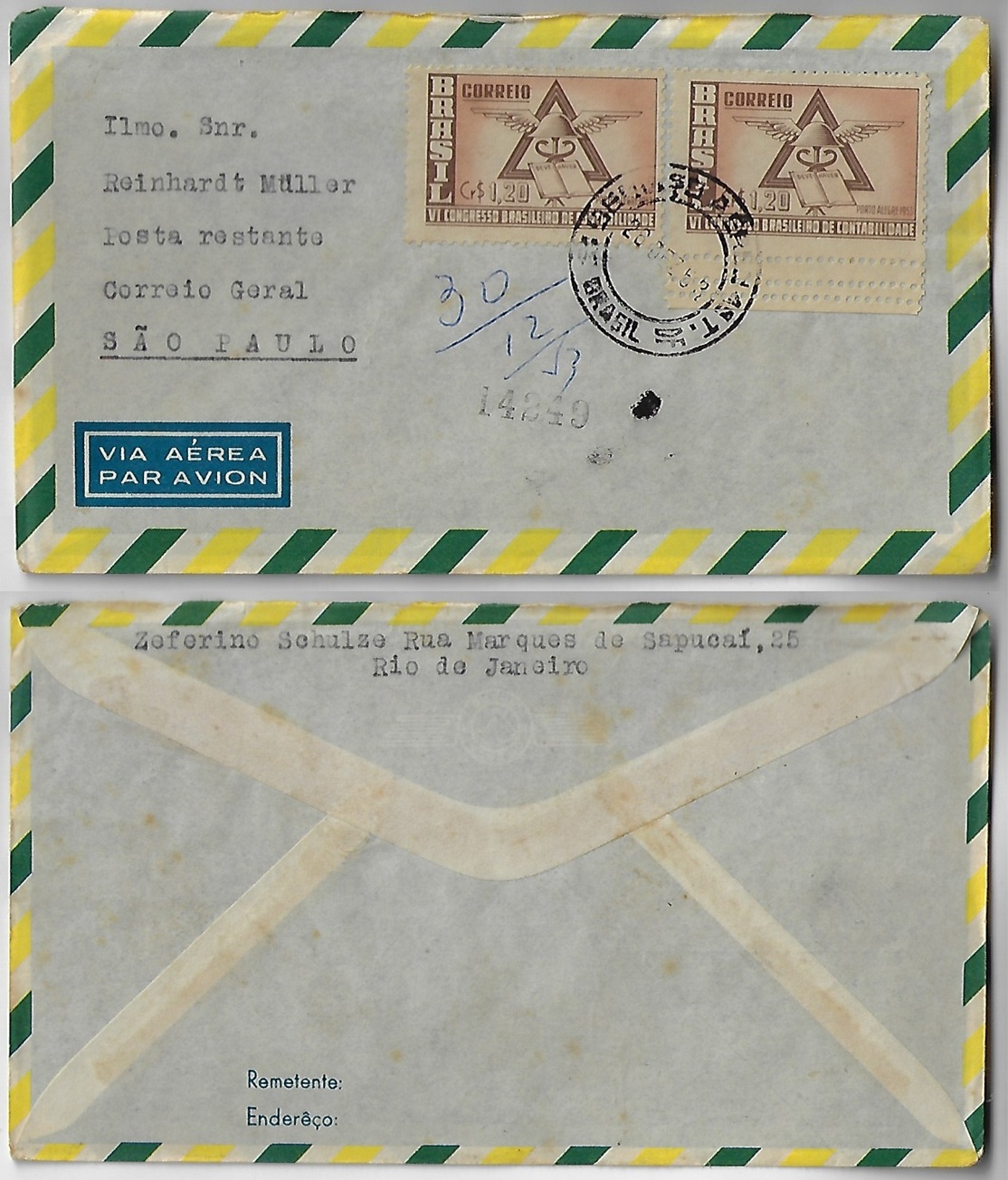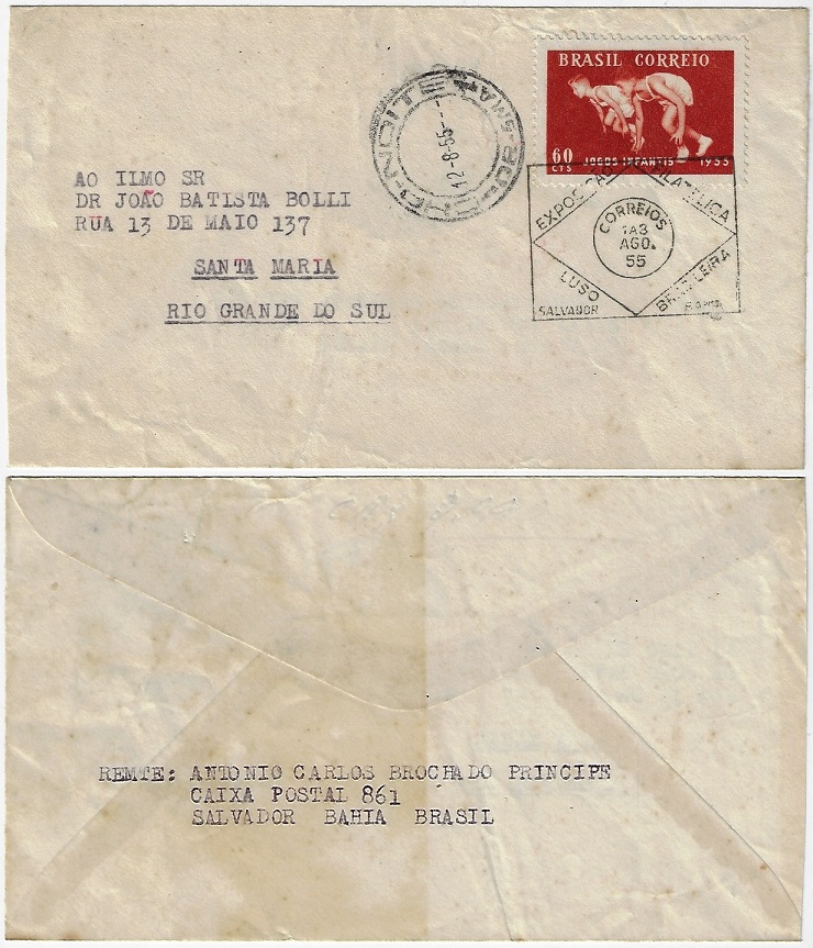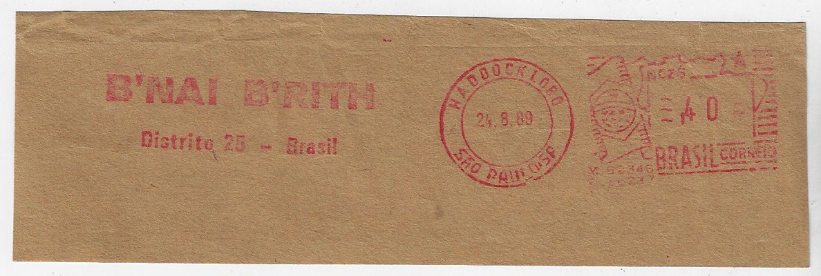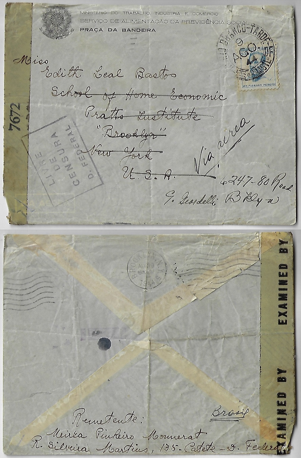 | 80884 | 2023, envelope prioritário registrado enviado de Biguaçu (21/11) para San Francisco / EUA, retornado ao remetente, marcas de triagem eletrônica na frente e no verso, 5 selos comemorativos 1ª Conferência Nacional da Juventure e 2 regulares Engraxate | 10,00 | Foto |