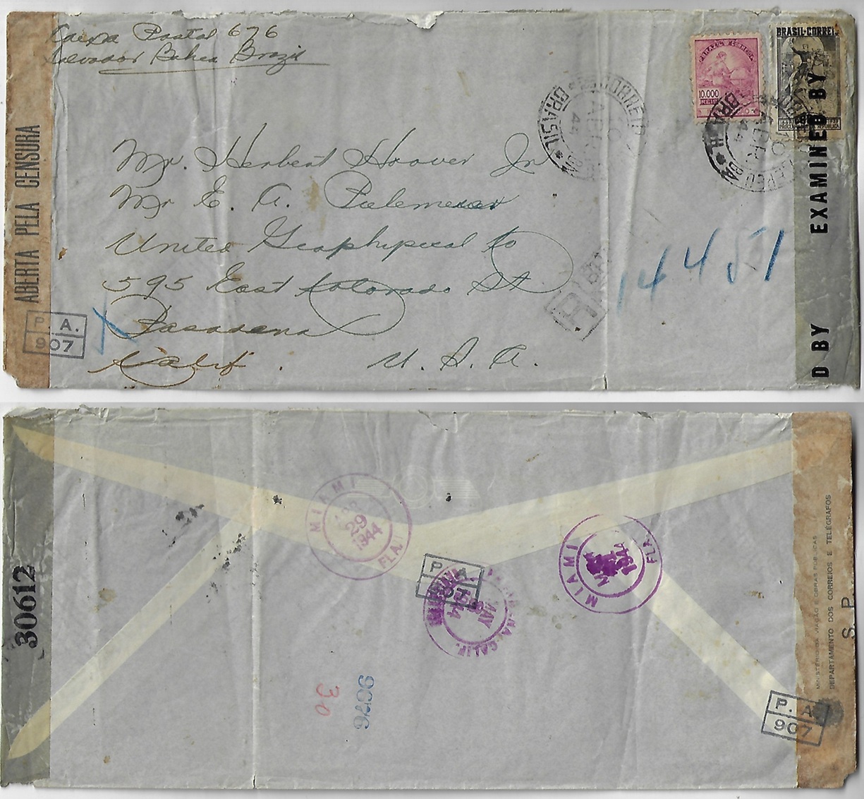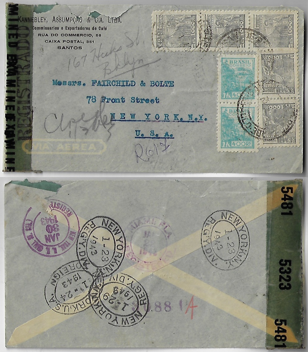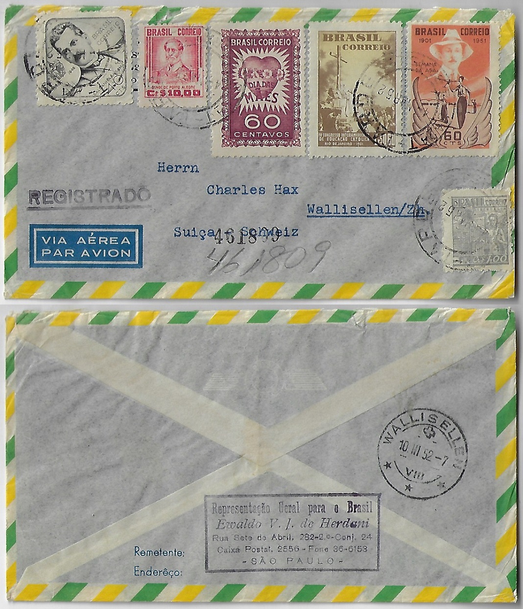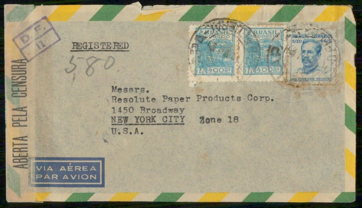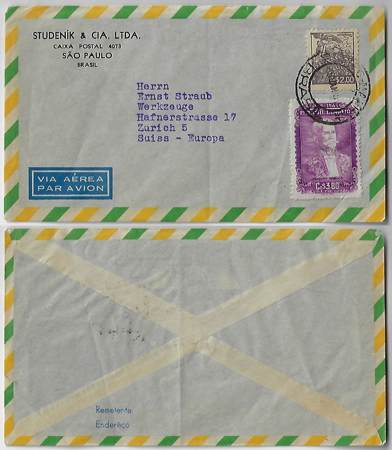 | 80884 | 2023, envelope prioritário registrado enviado de Biguaçu (21/11) para San Francisco / EUA, retornado ao remetente, marcas de triagem eletrônica na frente e no verso, 5 selos comemorativos 1ª Conferência Nacional da Juventure e 2 regulares Engraxate | 10,00 | Foto |
