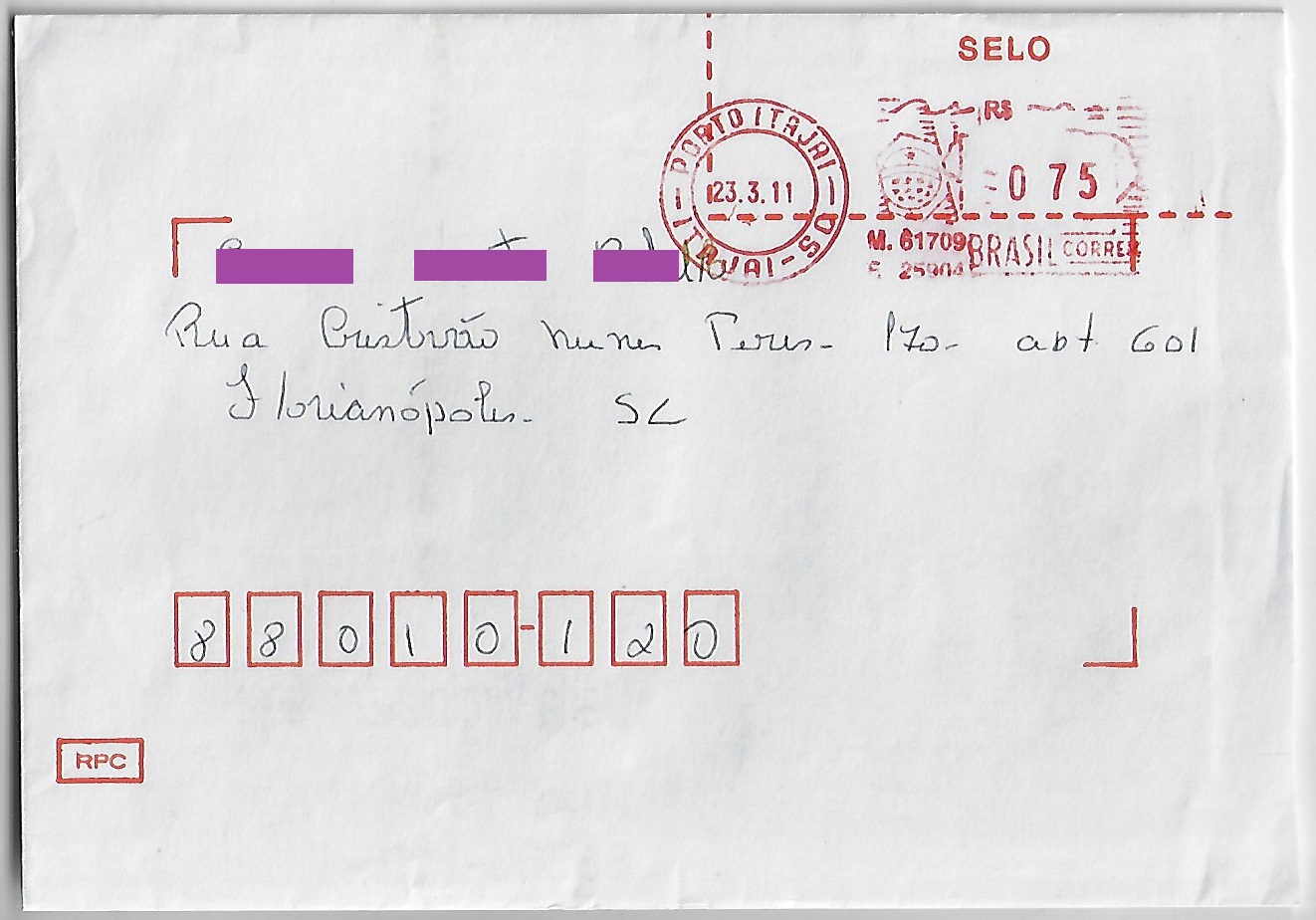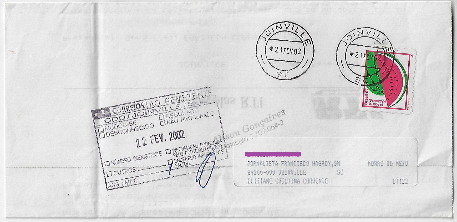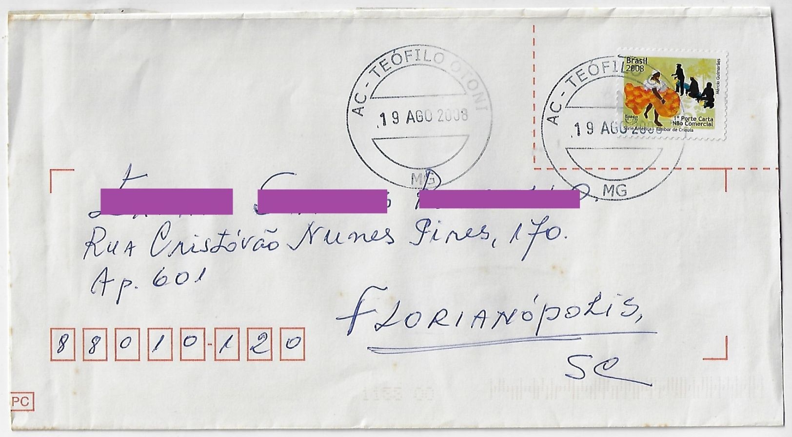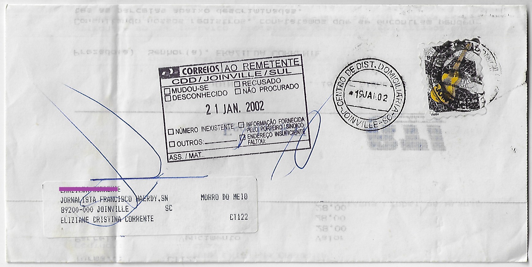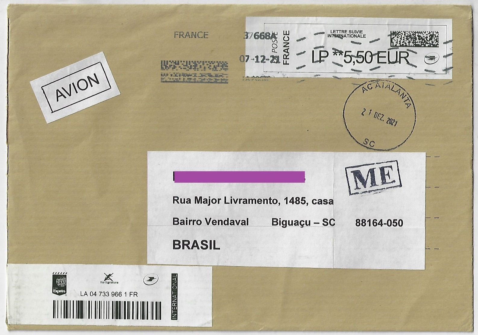 | 80019 | 2021, envelope registrado de Chinon / França (07/12) para Biguaçu, carimbo "ME" = "Mal Encaminhado" para Atalanta (21/12), porteado com autômato | 10,00 | Foto |