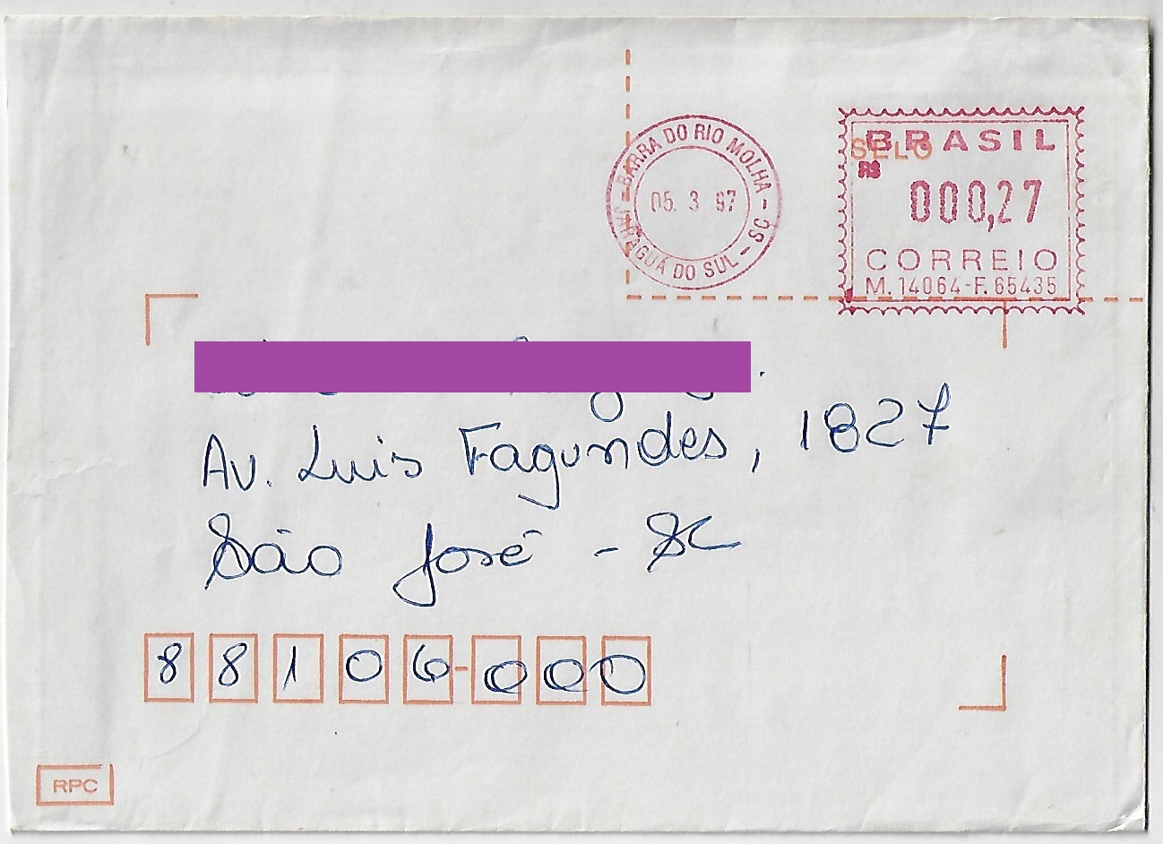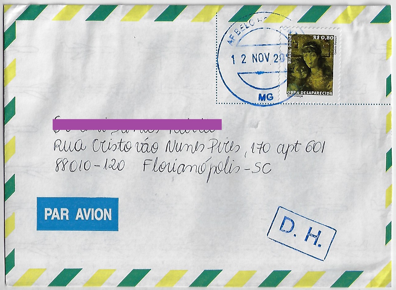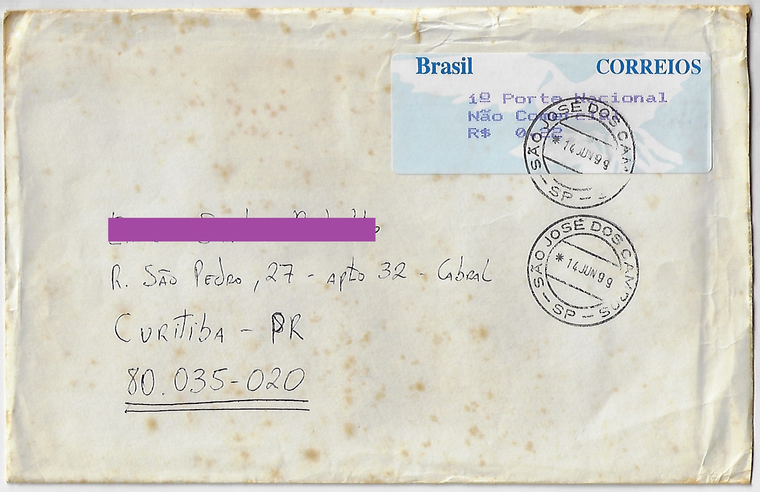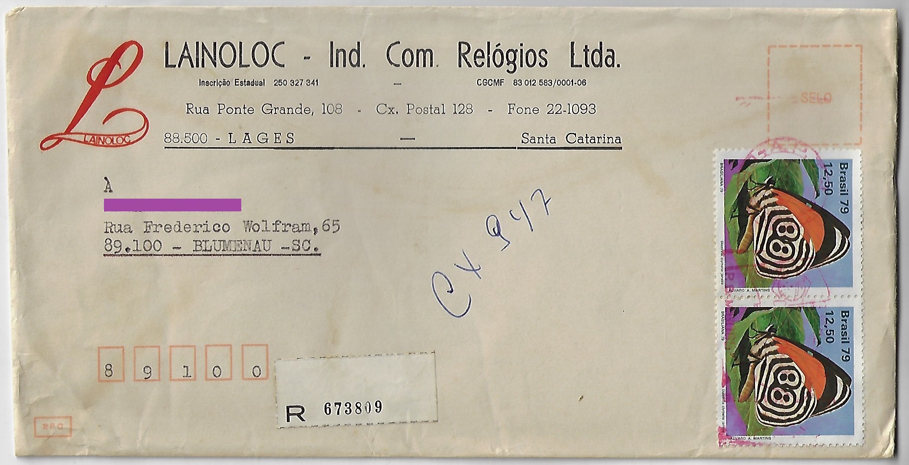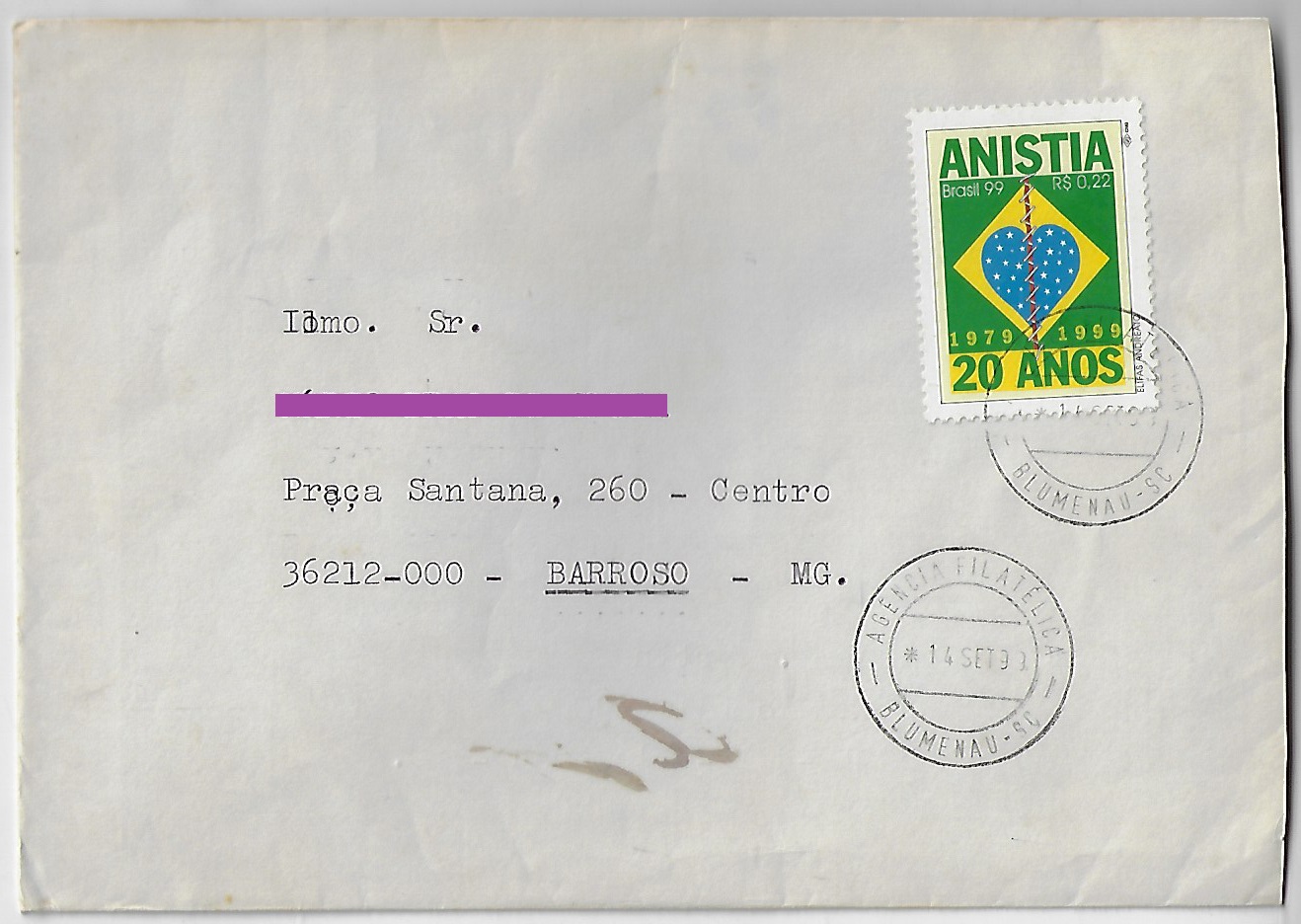 | 80019 | 2021, envelope registrado de Chinon / França (07/12) para Biguaçu, carimbo "ME" = "Mal Encaminhado" para Atalanta (21/12), porteado com autômato | 10,00 | Foto |