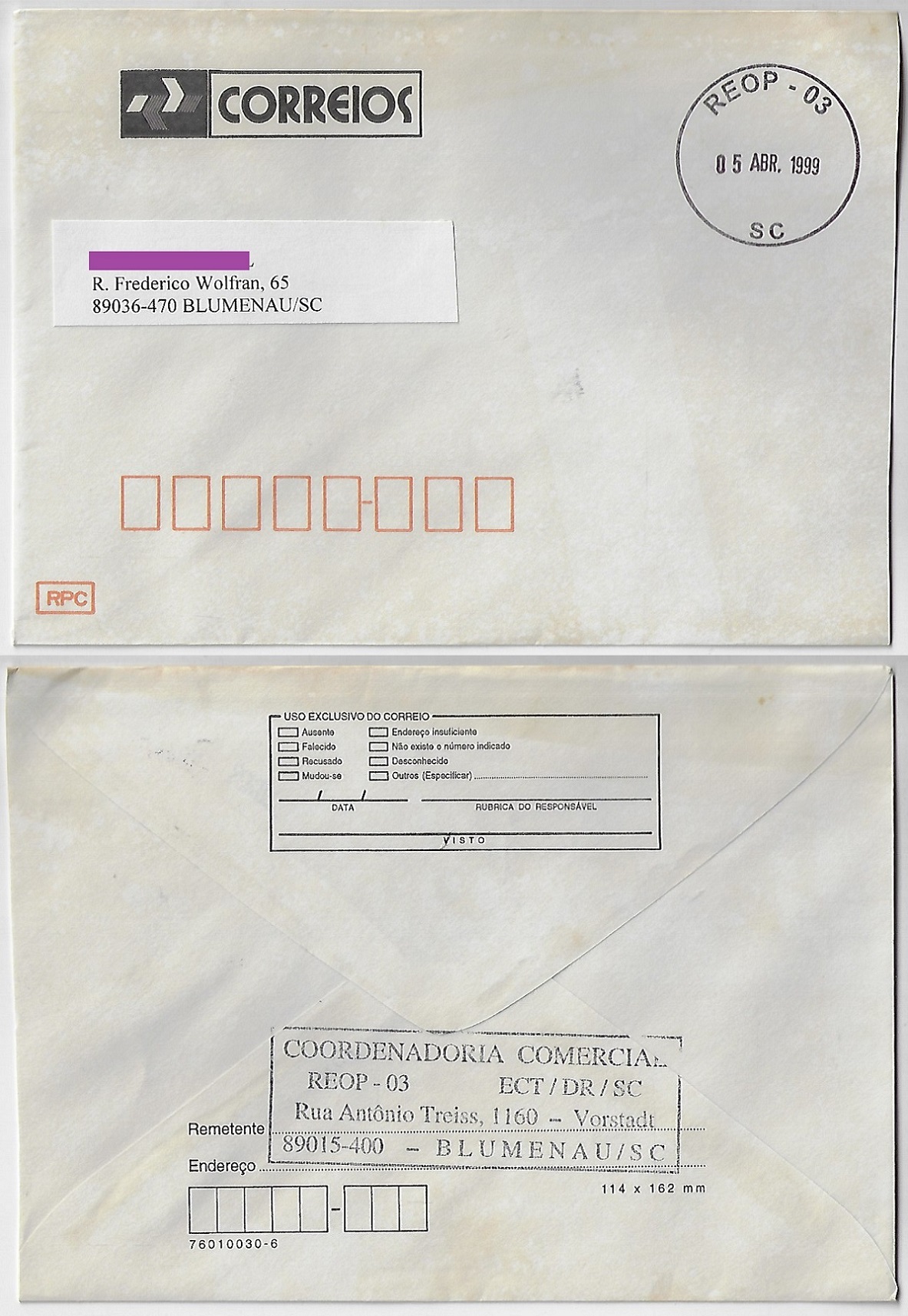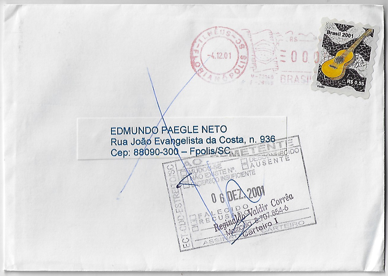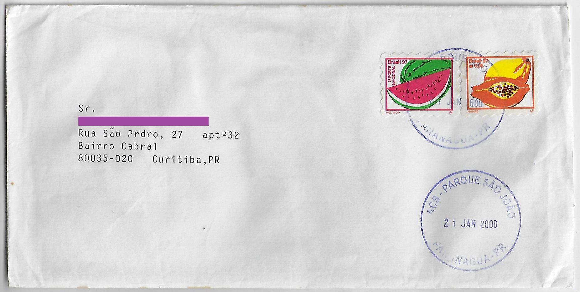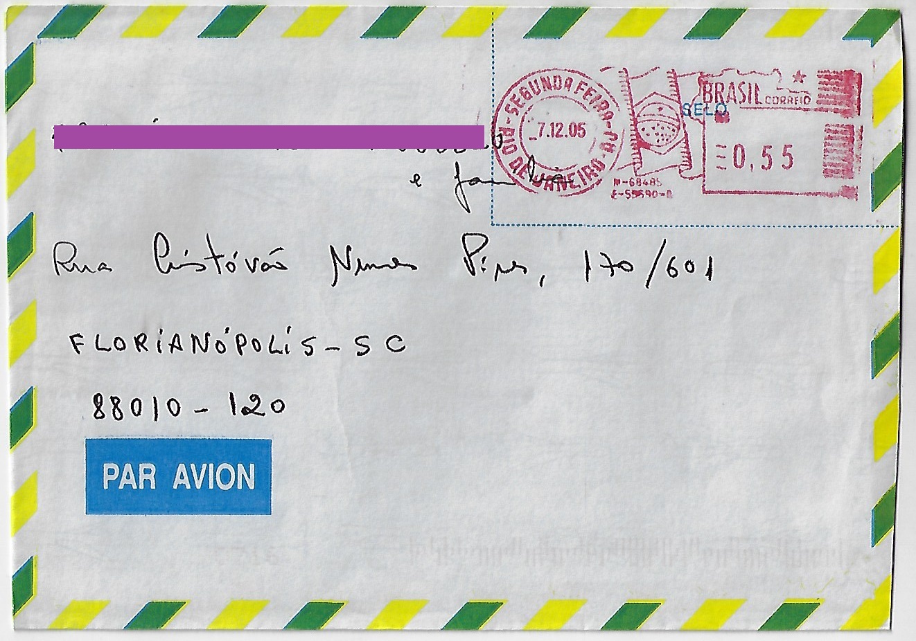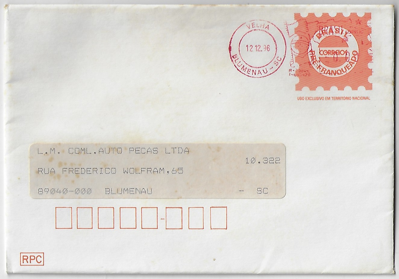 | 80019 | 2021, envelope registrado de Chinon / França (07/12) para Biguaçu, carimbo "ME" = "Mal Encaminhado" para Atalanta (21/12), porteado com autômato | 10,00 | Foto |