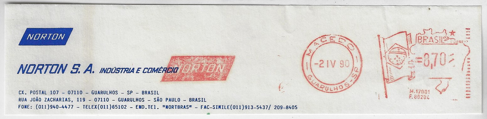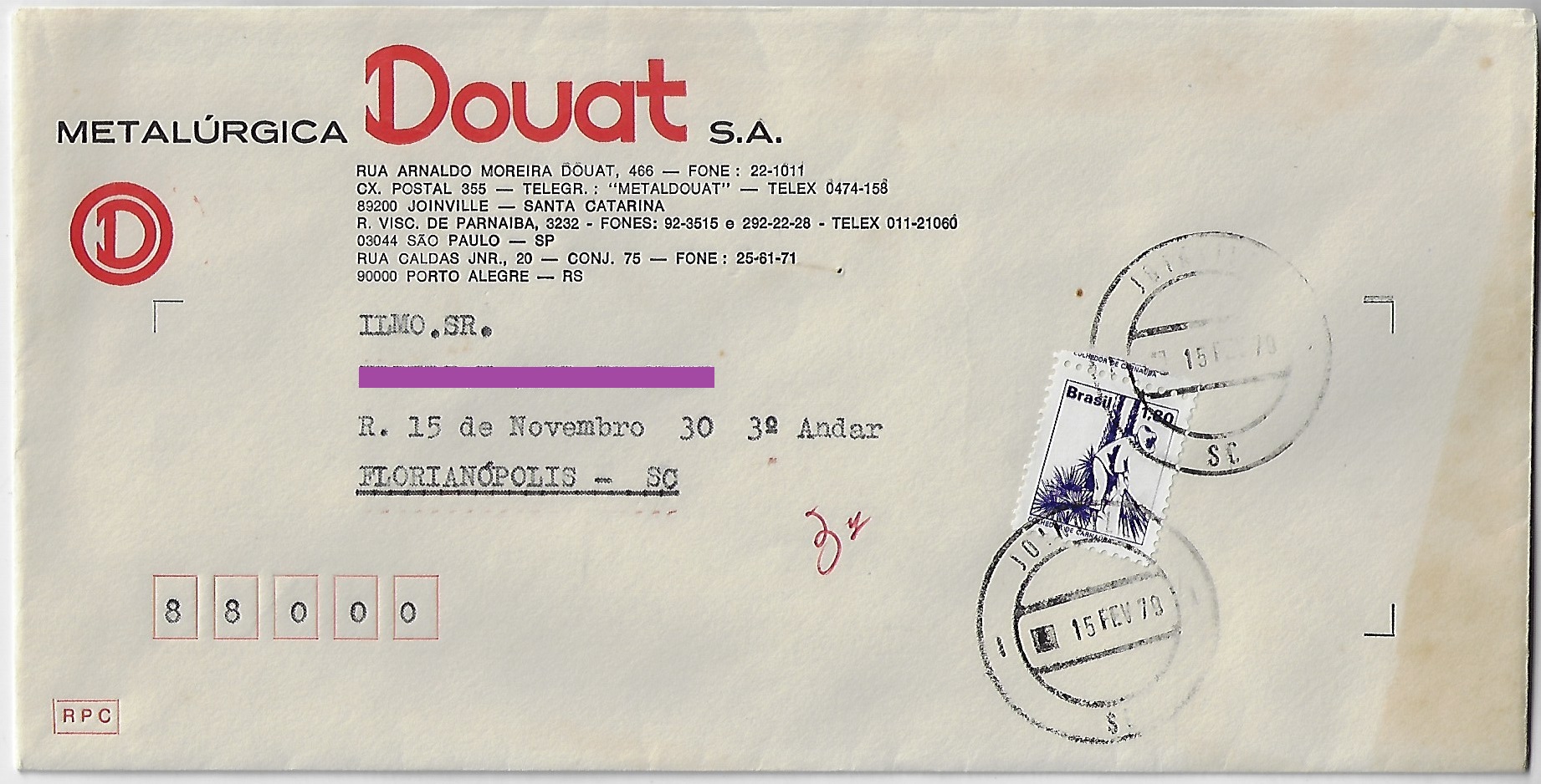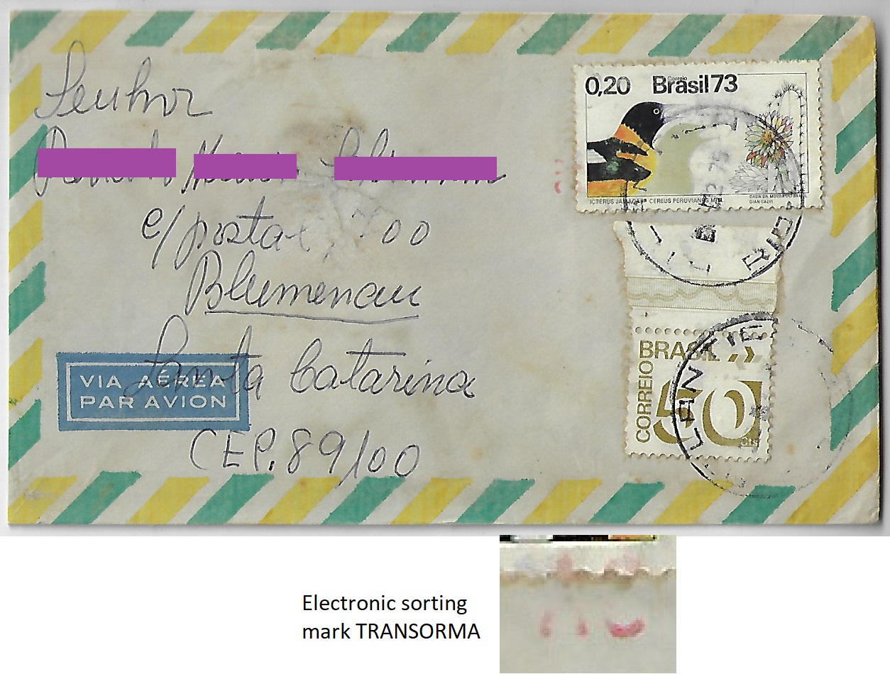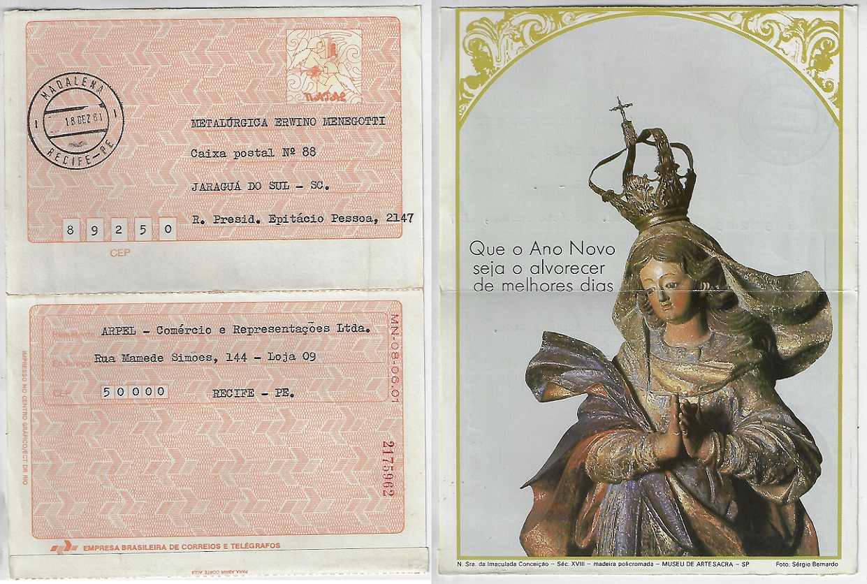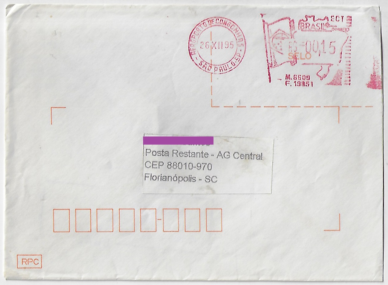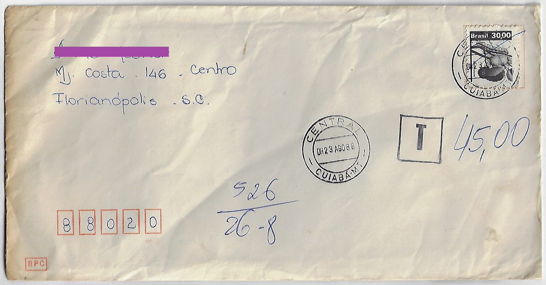| 80019 | 2021, envelope registrado de Chinon / França (07/12) para Biguaçu, carimbo "ME" = "Mal Encaminhado" para Atalanta (21/12), porteado com autômato | 10,00 | Foto |