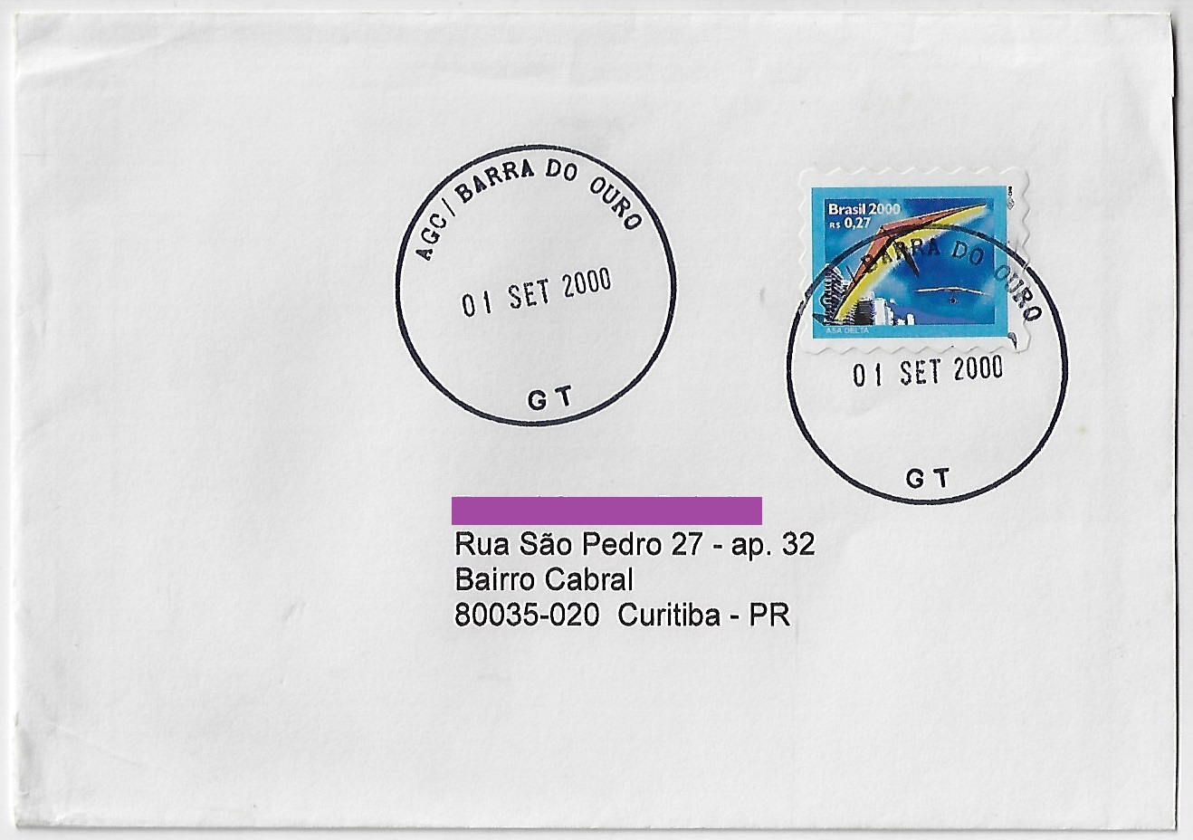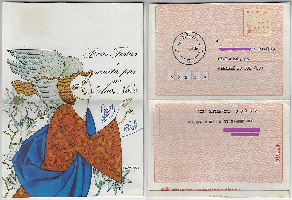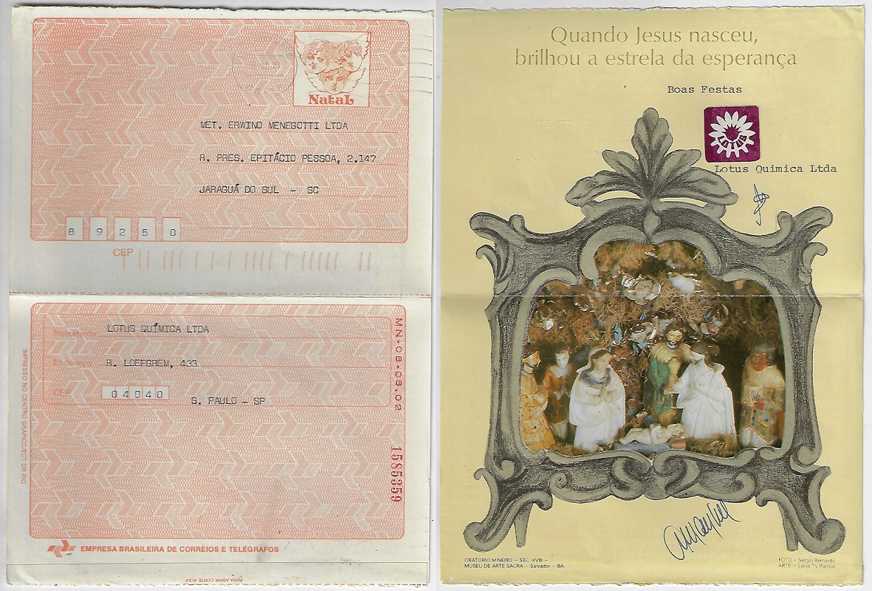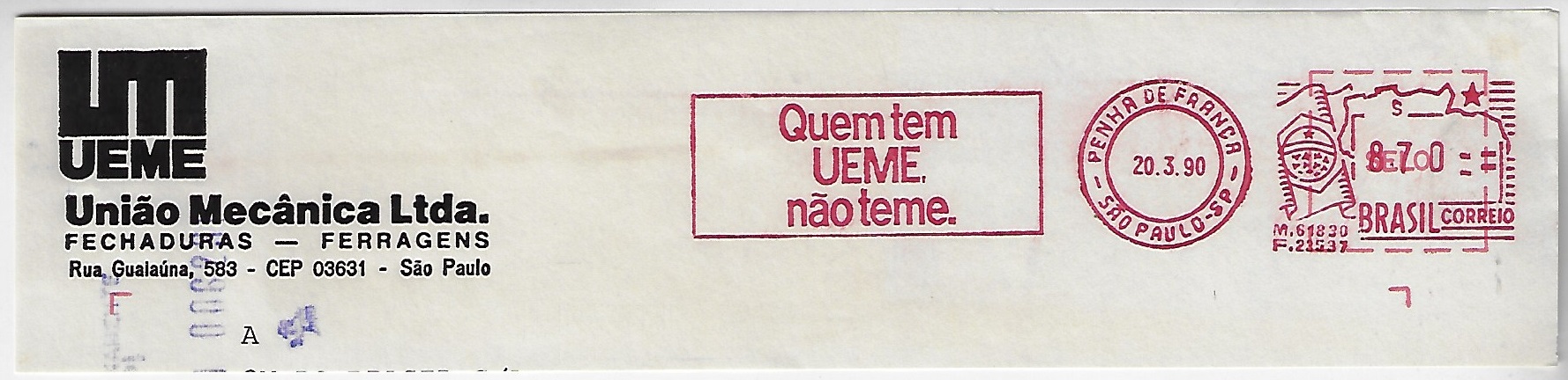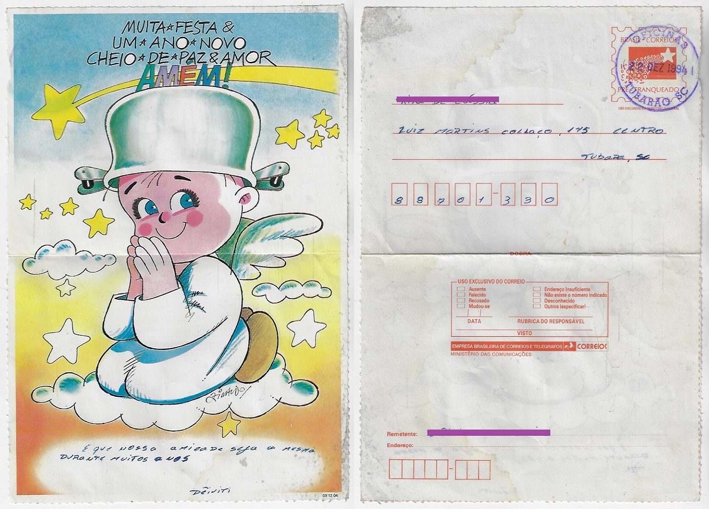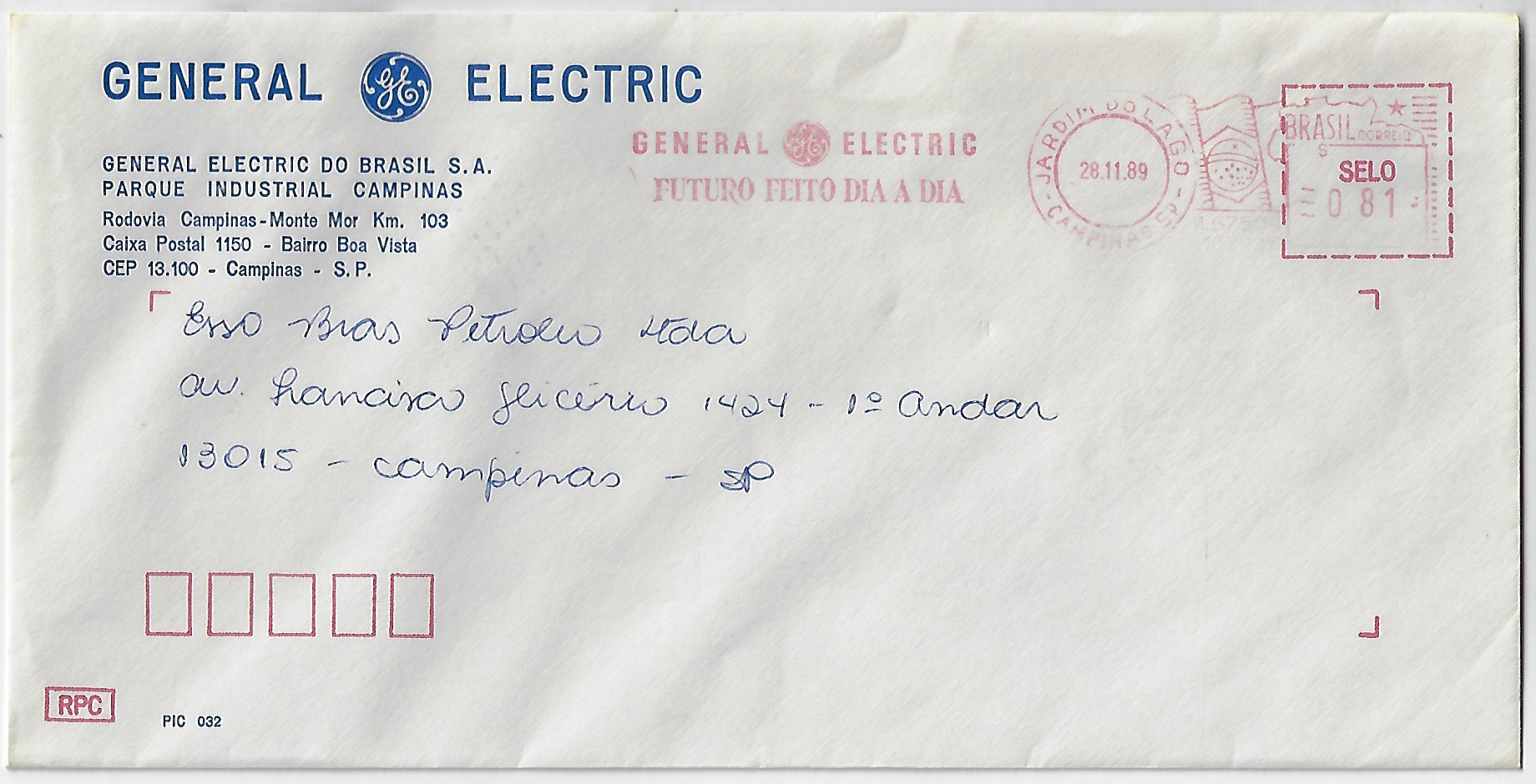 | 80019 | 2021, envelope registrado de Chinon / França (07/12) para Biguaçu, carimbo "ME" = "Mal Encaminhado" para Atalanta (21/12), porteado com autômato | 10,00 | Foto |