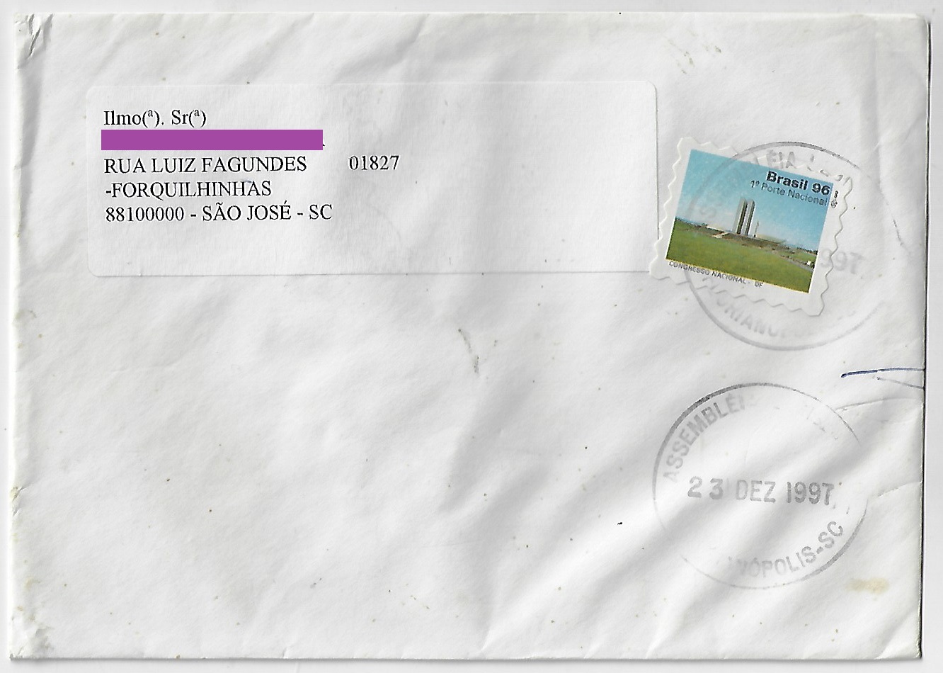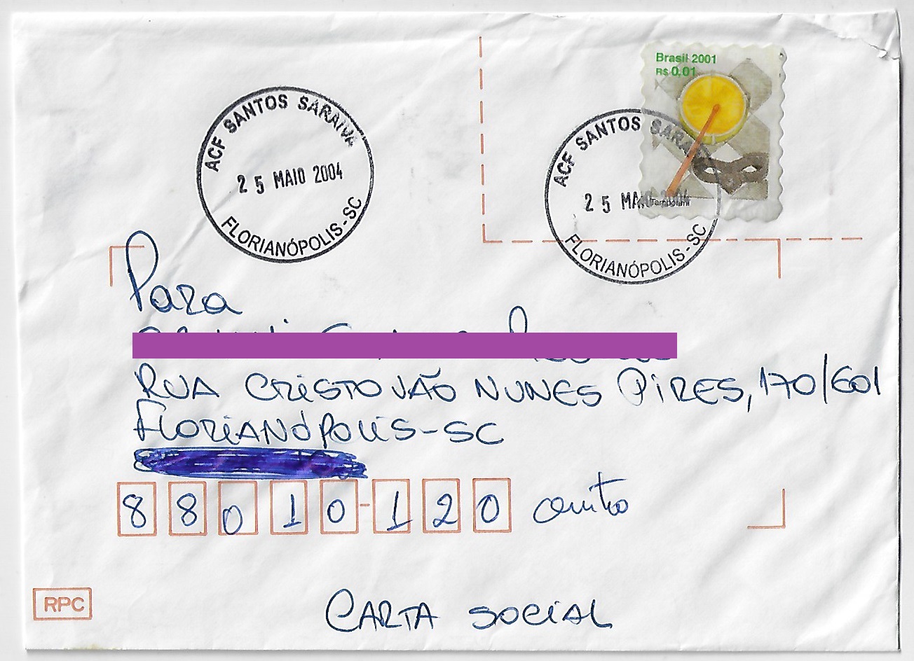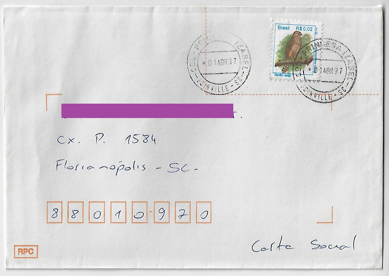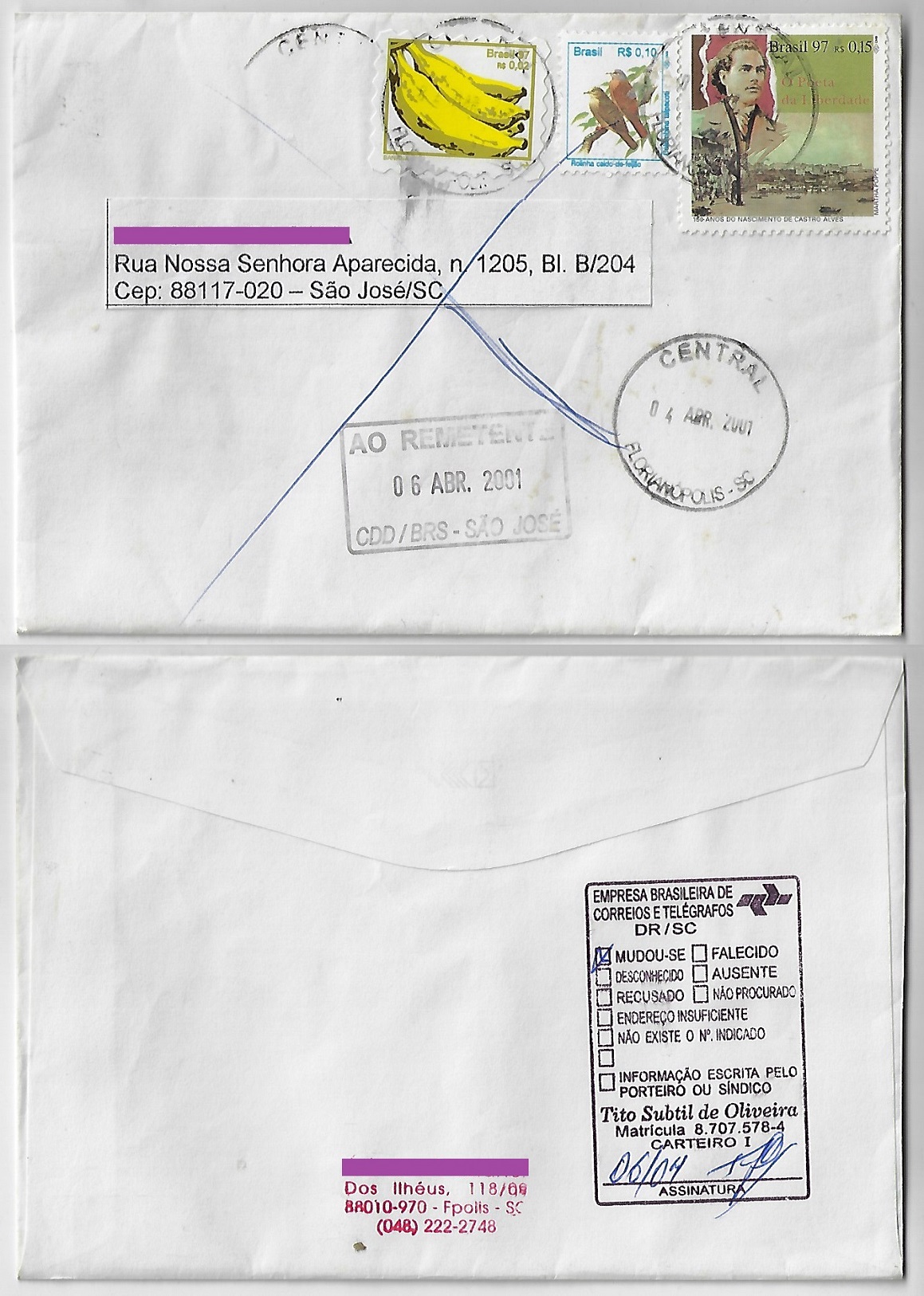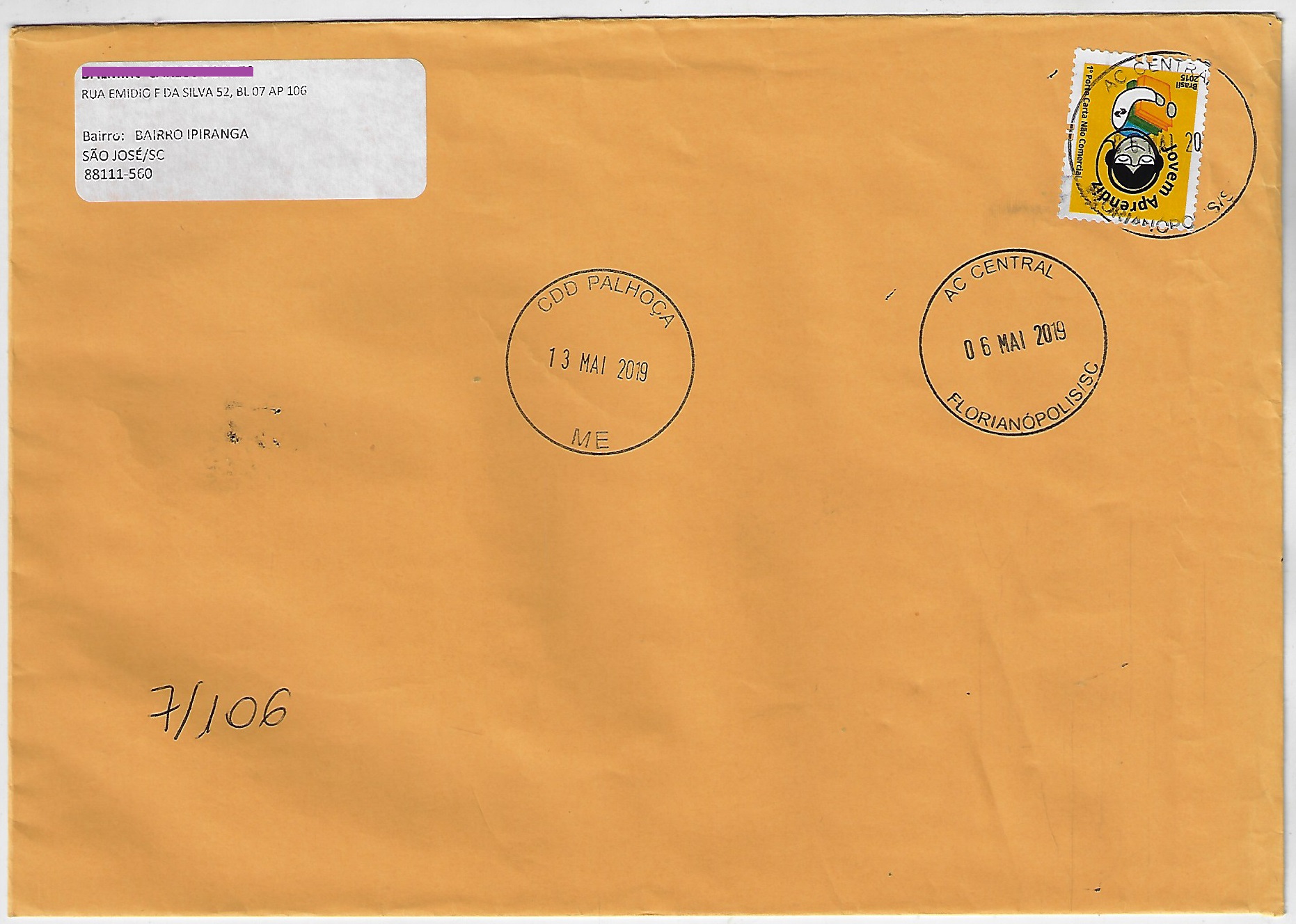 | 84572 | 2019, carimbo de serviço ME - Mal Encaminhado sobre envelope enviado de Florianópolis para São José, mal encaminhado a Palhoça | 10,00 | Foto |