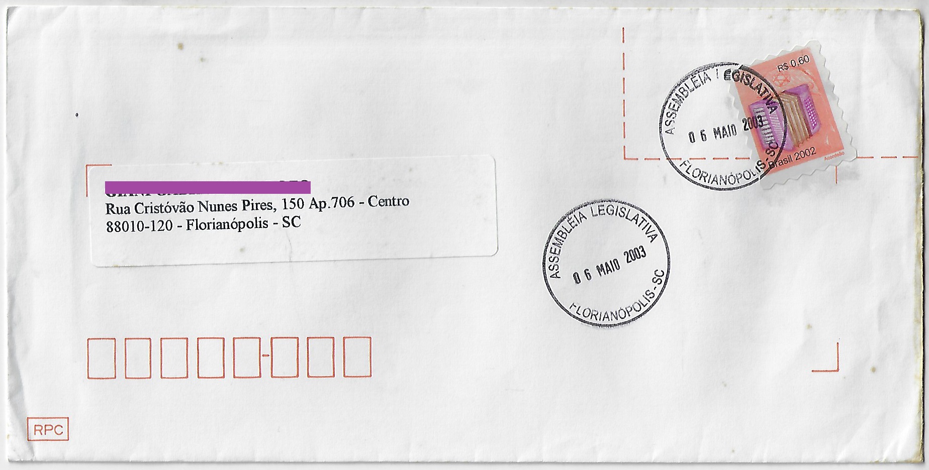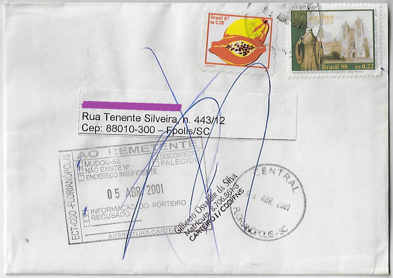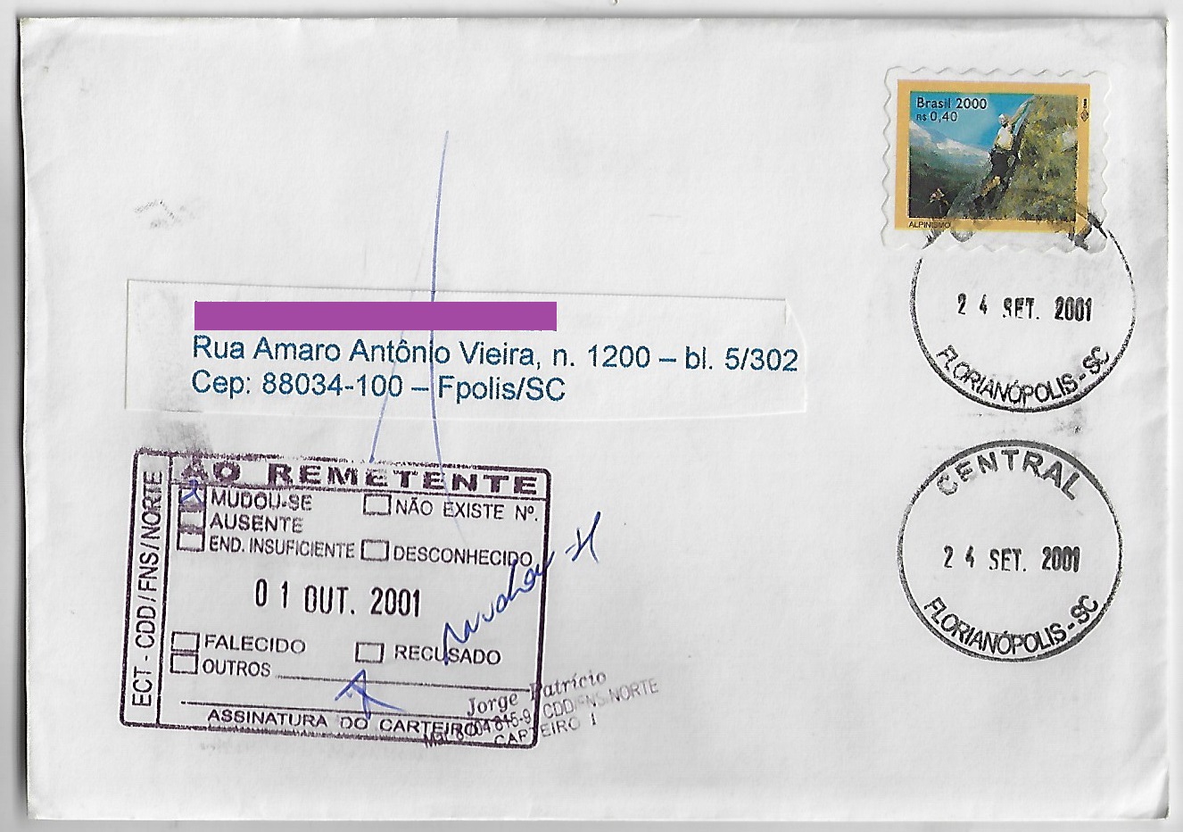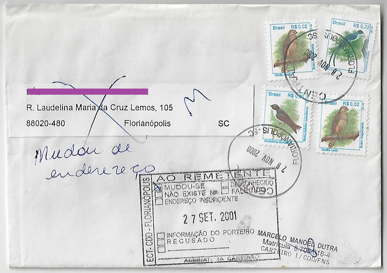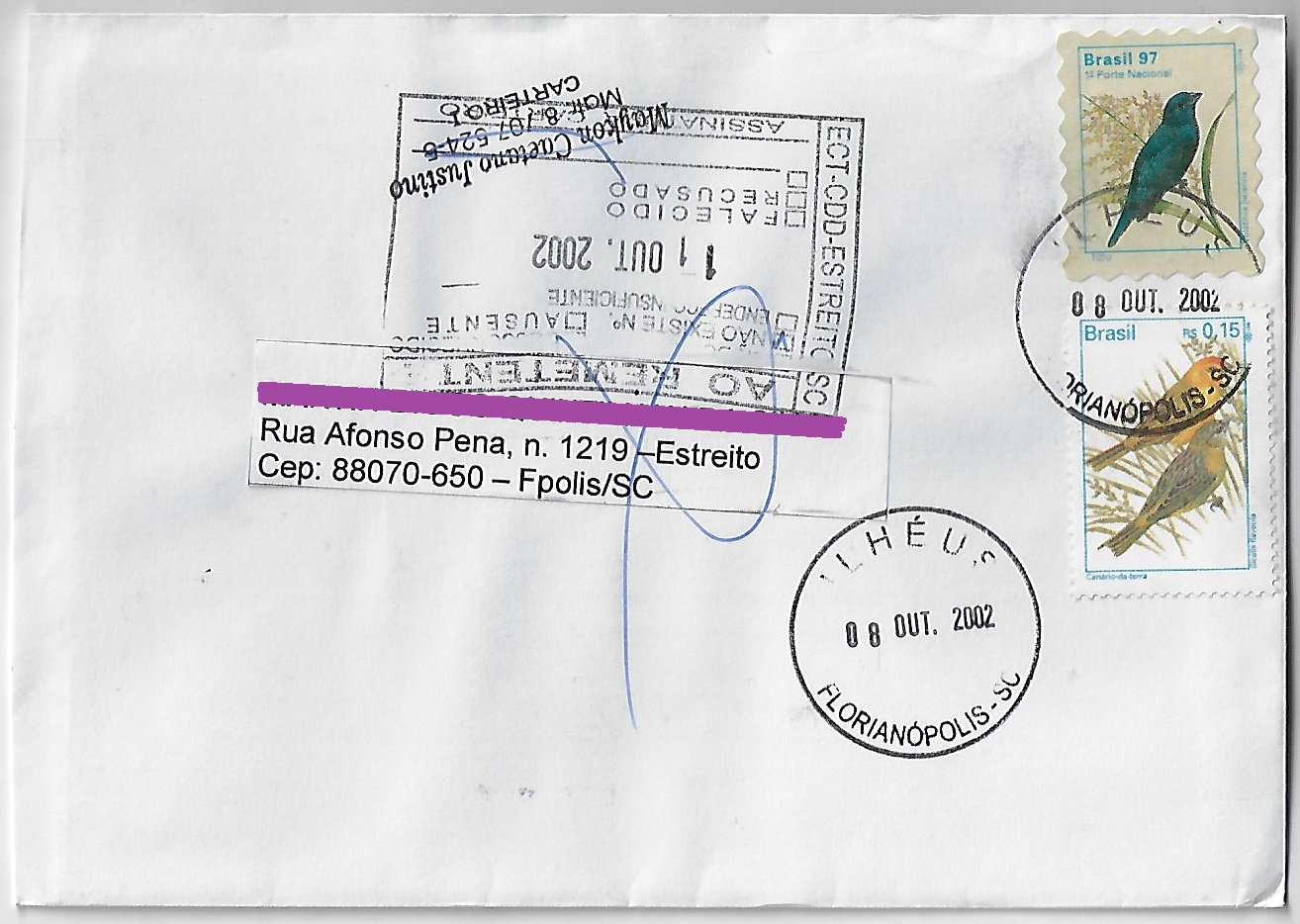 | 84572 | 2019, carimbo de serviço ME - Mal Encaminhado sobre envelope enviado de Florianópolis para São José, mal encaminhado a Palhoça | 10,00 | Foto |