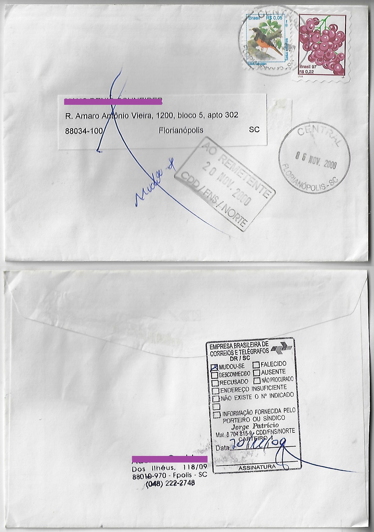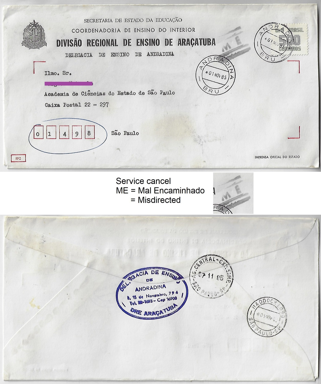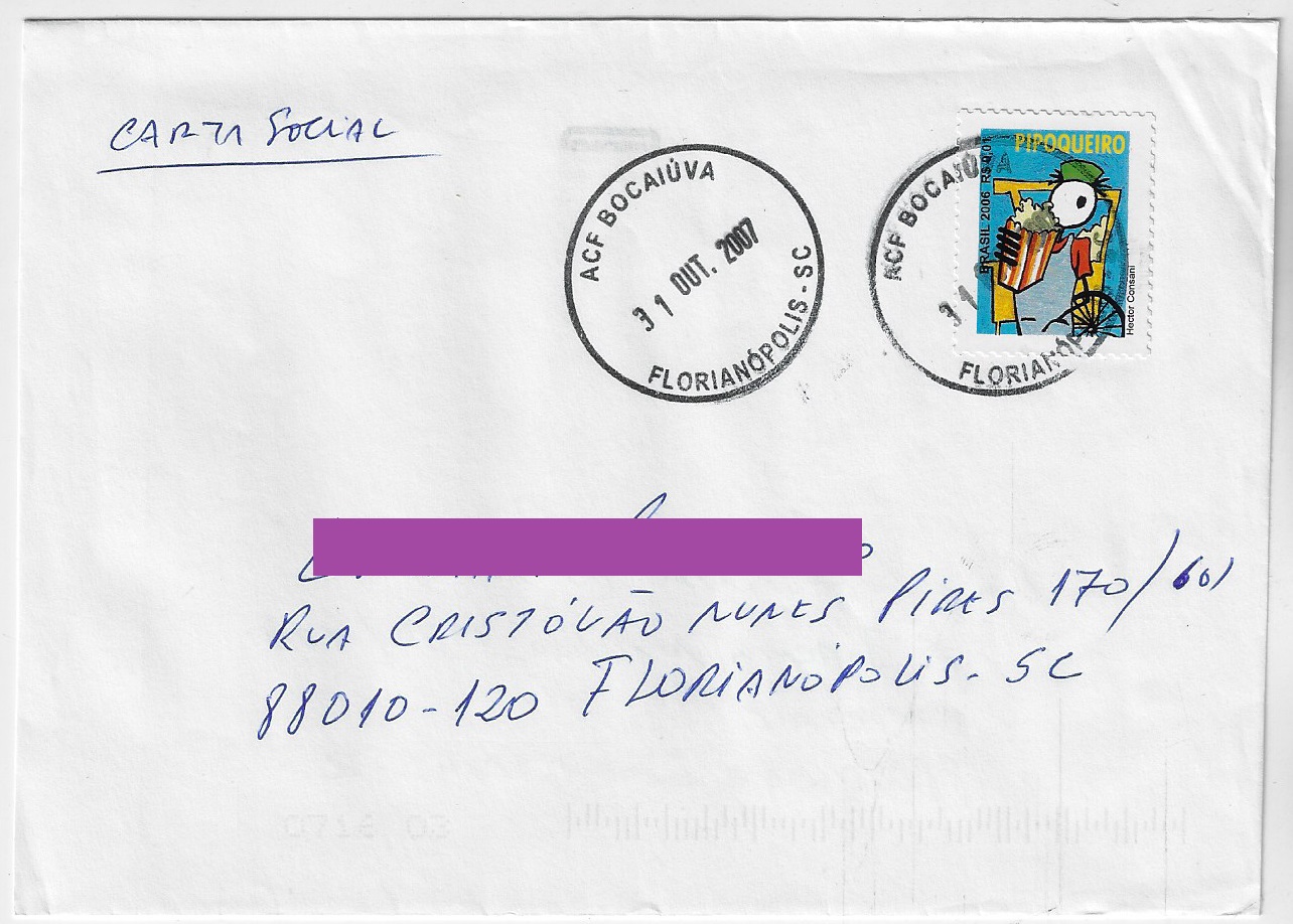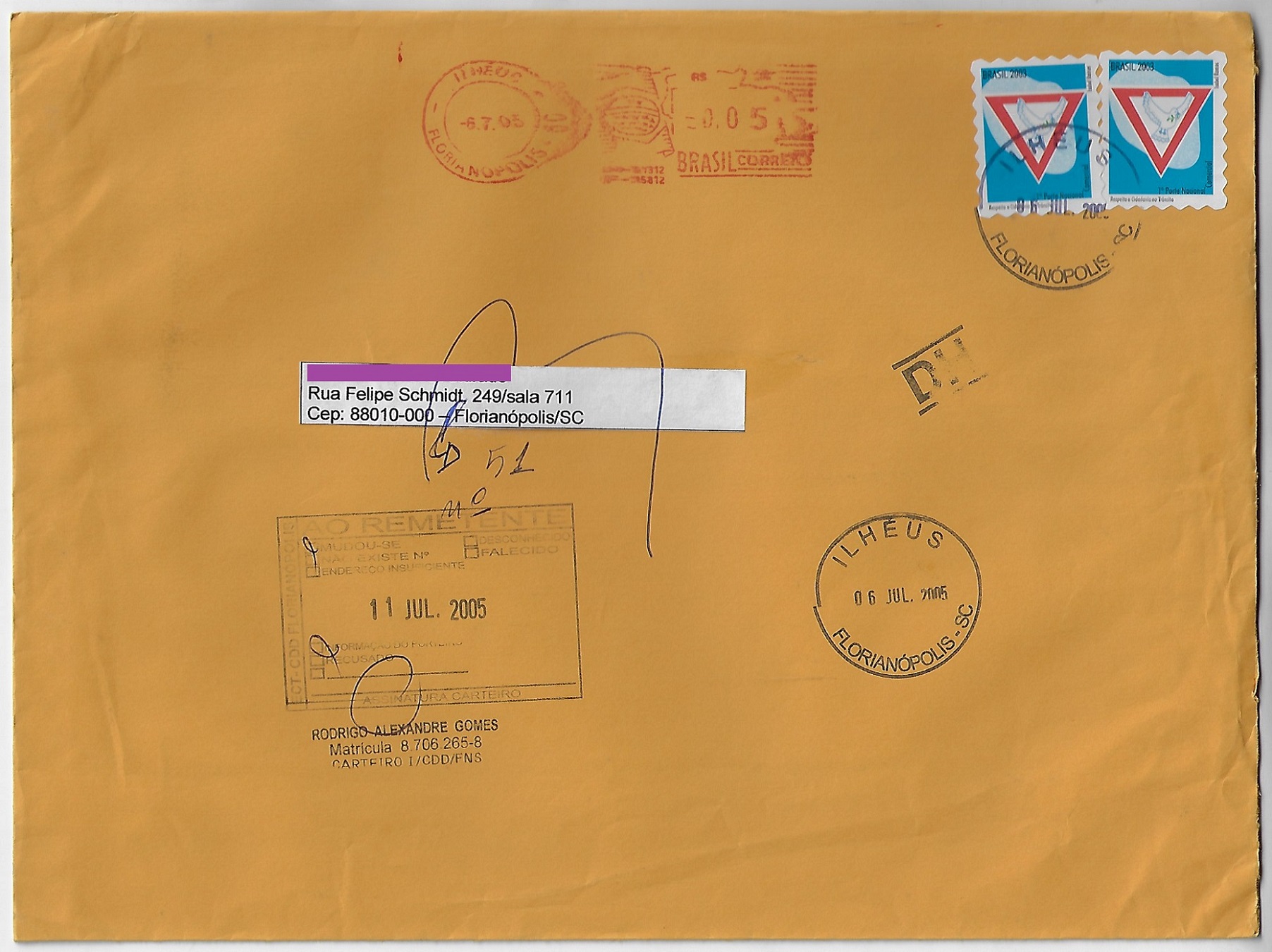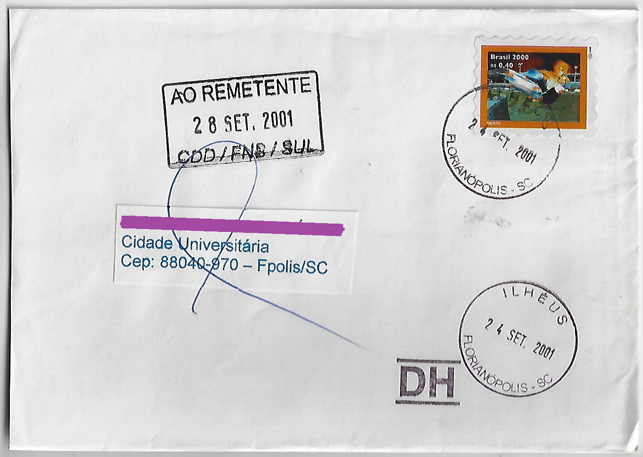 | 84572 | 2019, carimbo de serviço ME - Mal Encaminhado sobre envelope enviado de Florianópolis para São José, mal encaminhado a Palhoça | 10,00 | Foto |