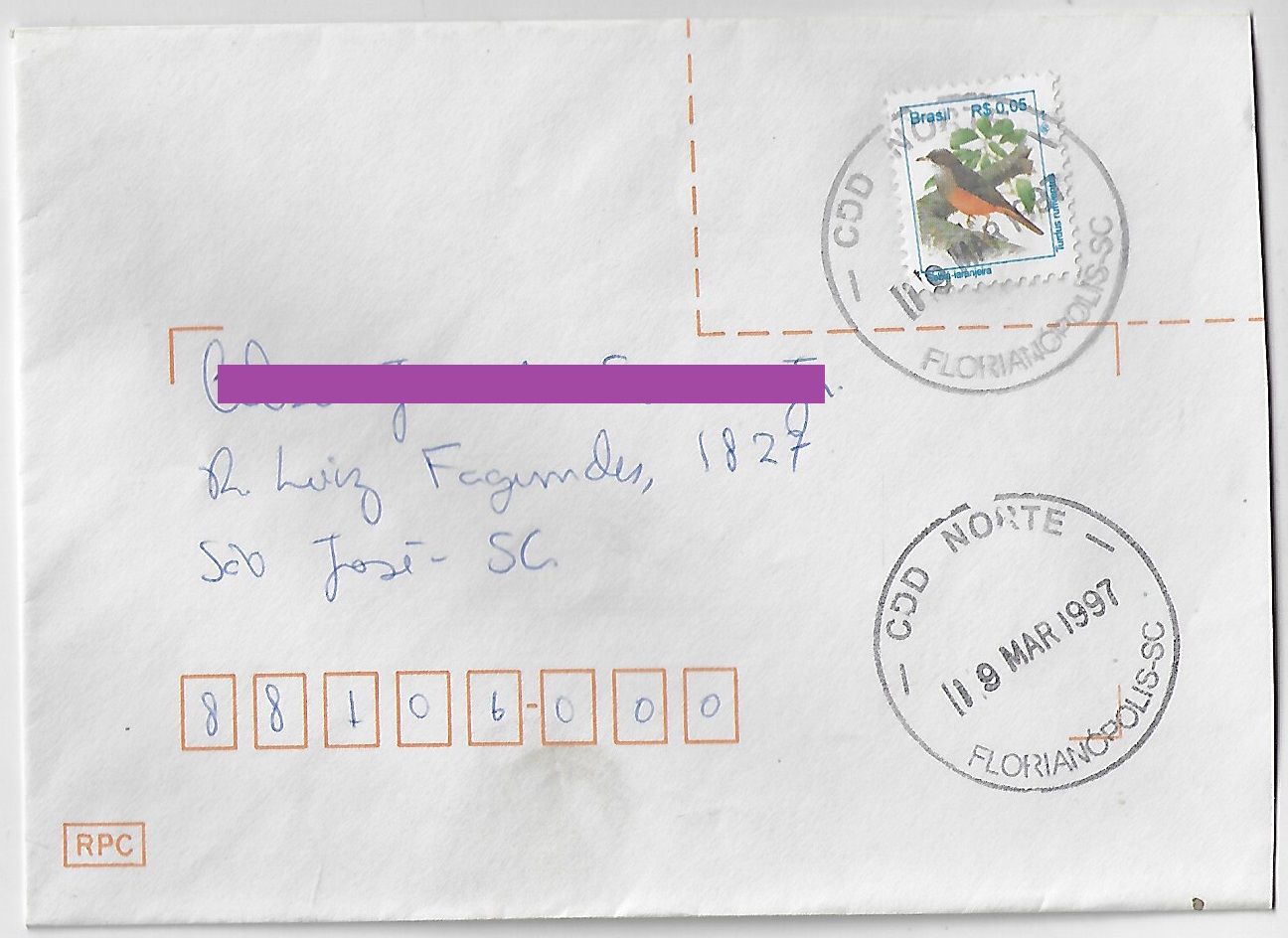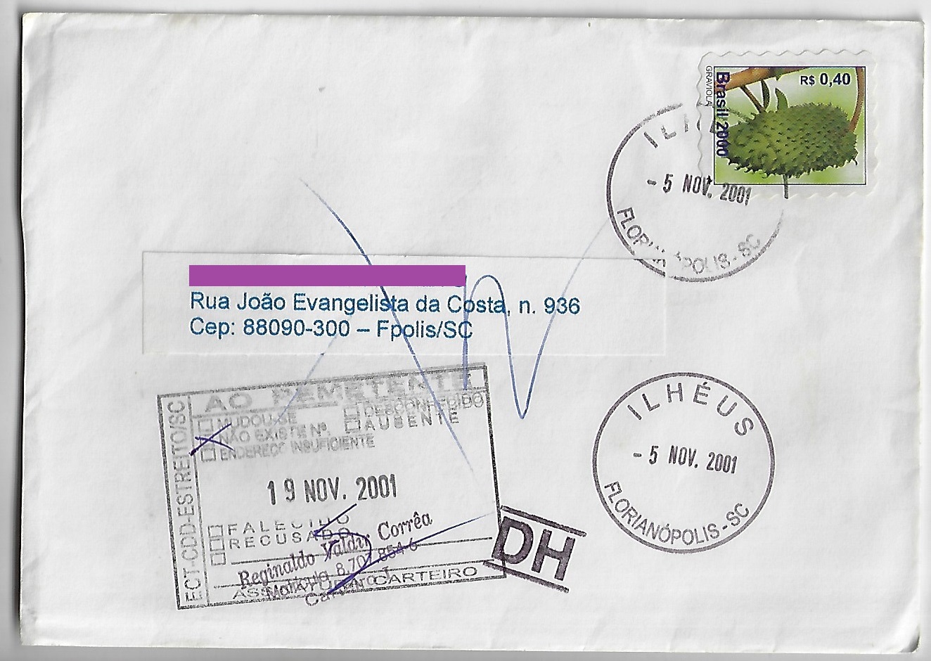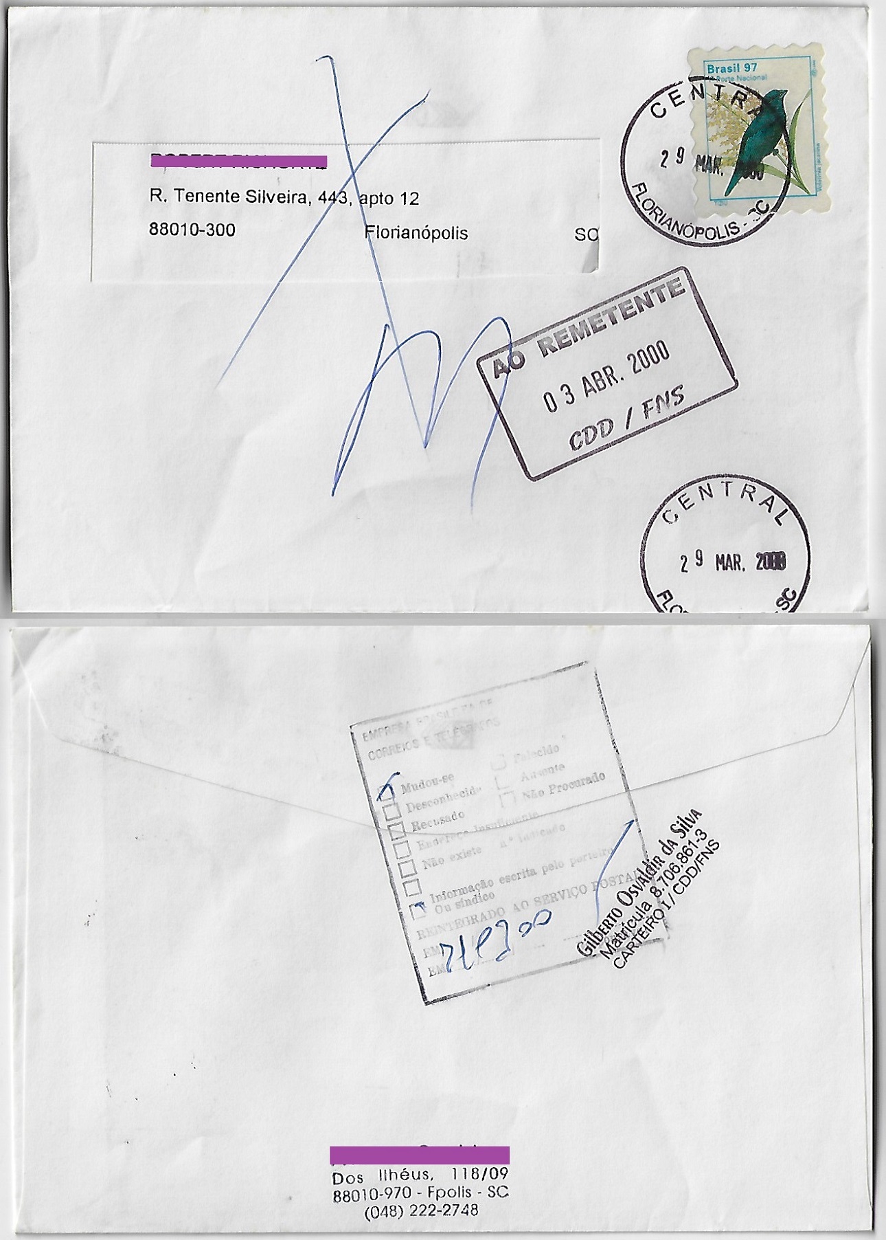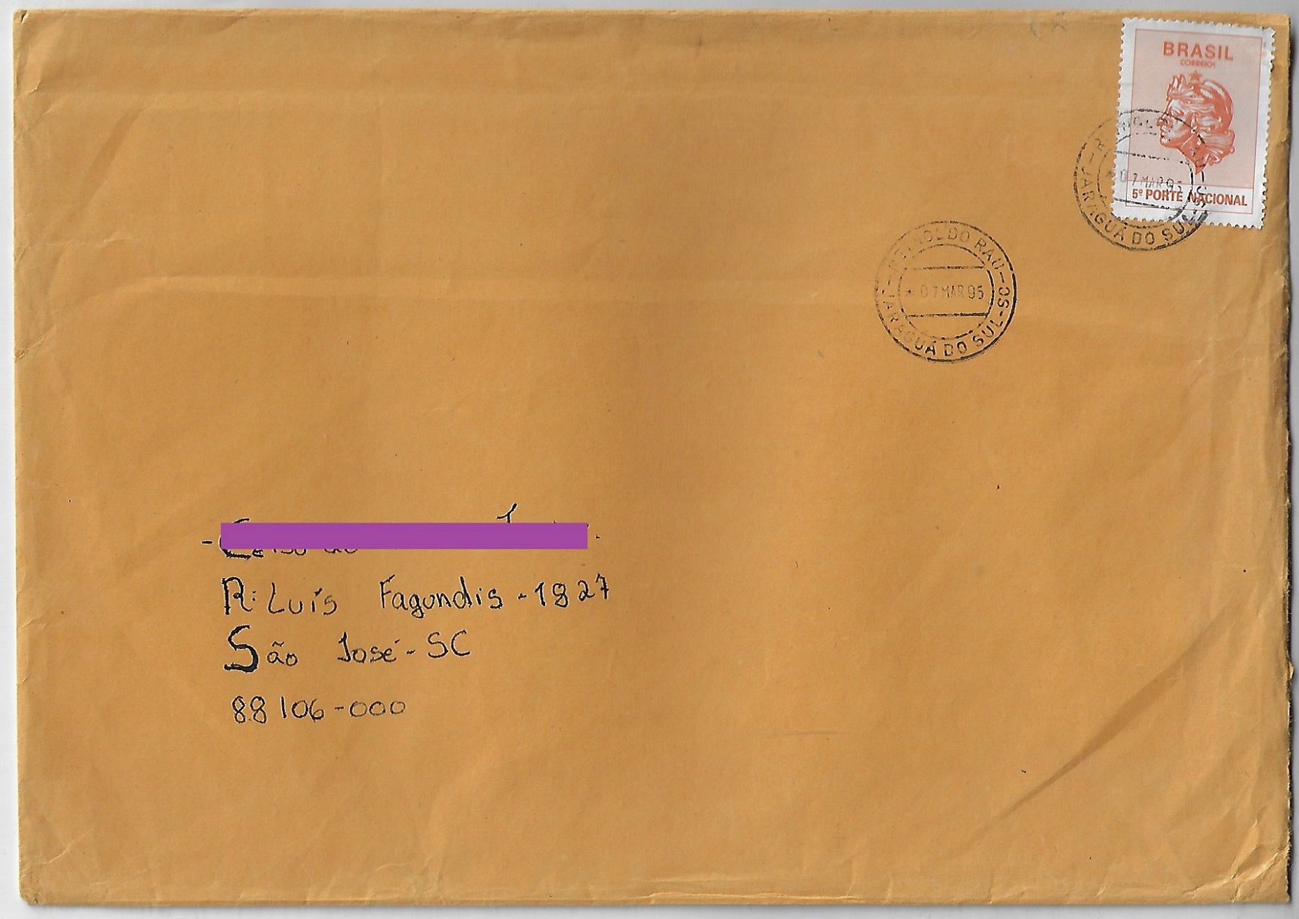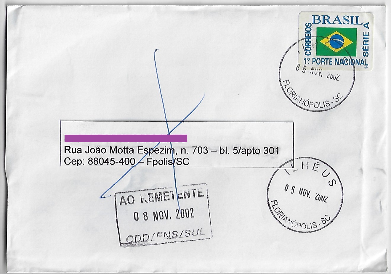 | 84572 | 2019, carimbo de serviço ME - Mal Encaminhado sobre envelope enviado de Florianópolis para São José, mal encaminhado a Palhoça | 10,00 | Foto |