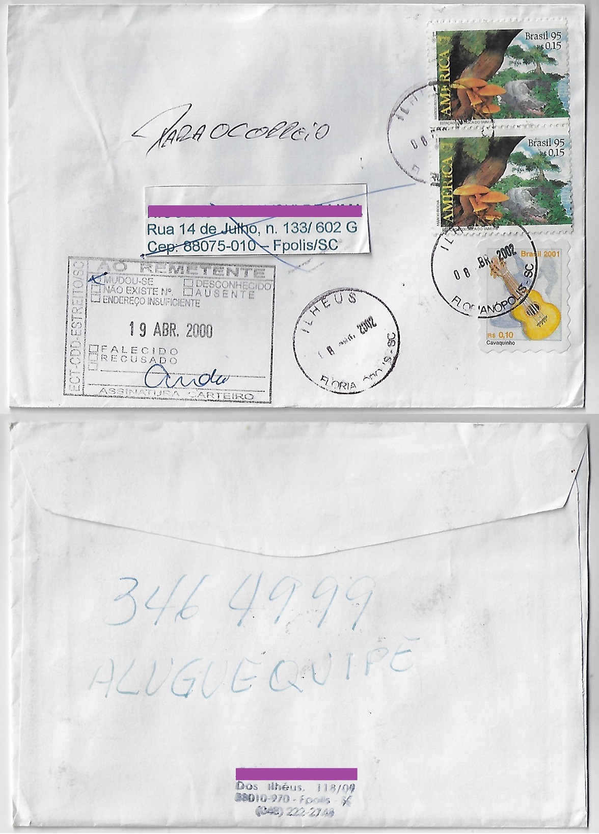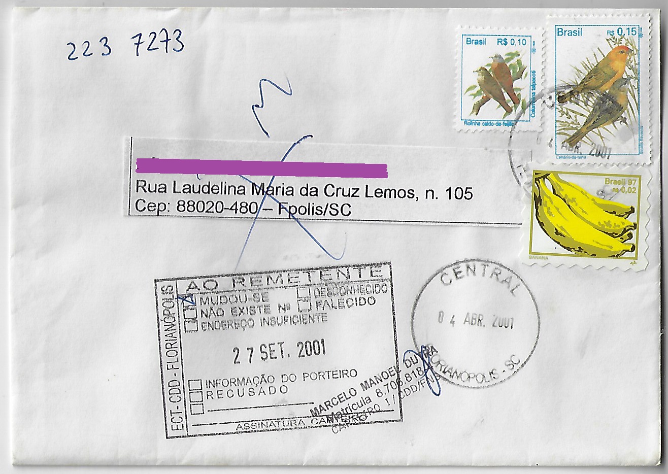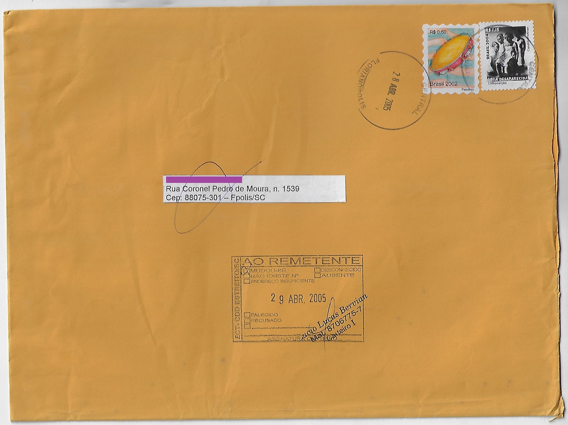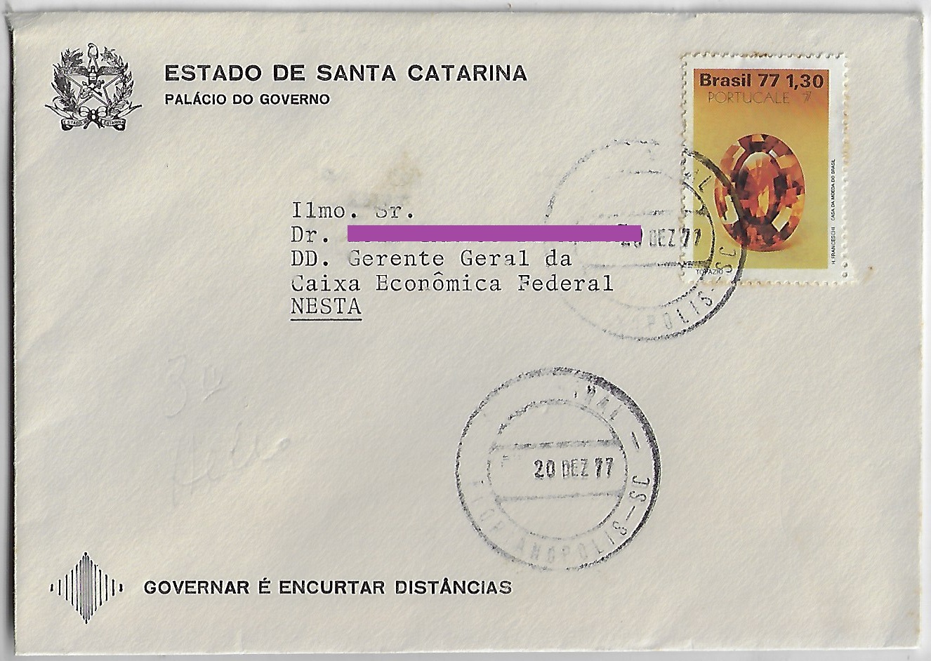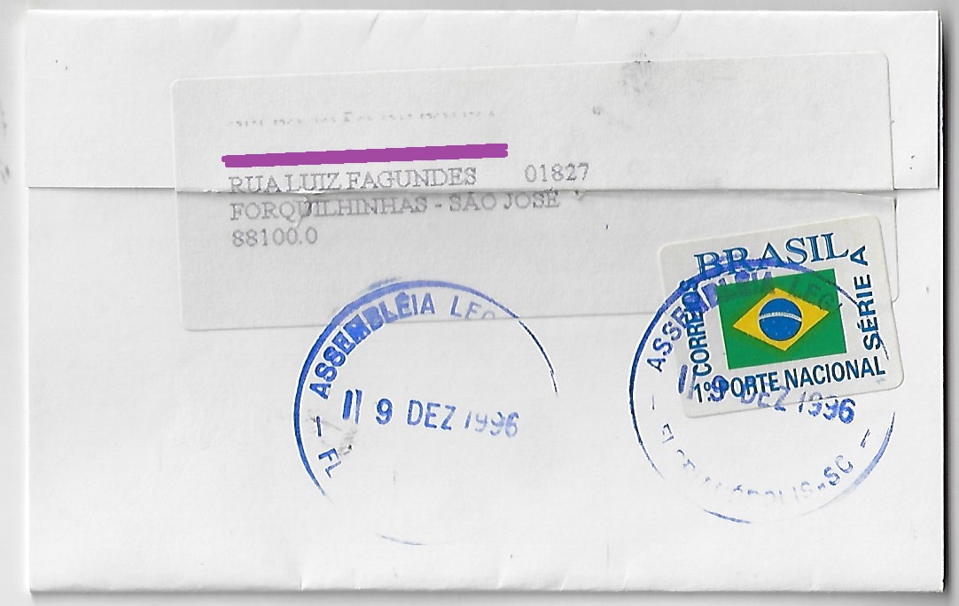| 84572 | 2019, carimbo de serviço ME - Mal Encaminhado sobre envelope enviado de Florianópolis para São José, mal encaminhado a Palhoça | 10,00 | Foto |