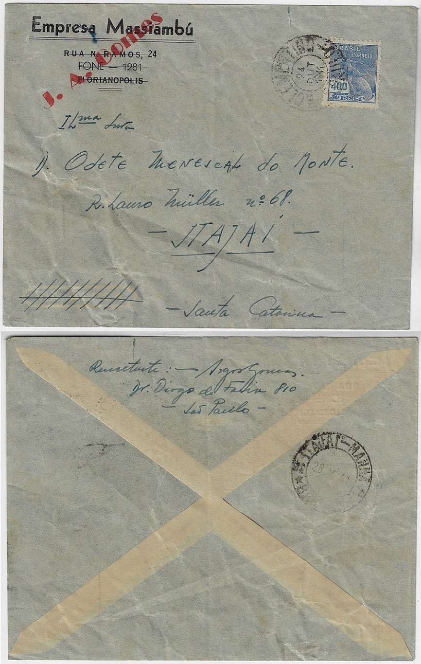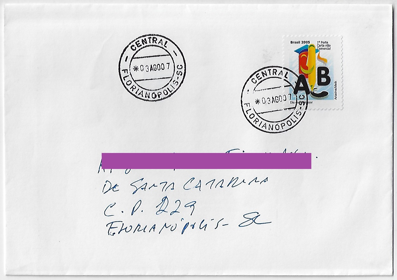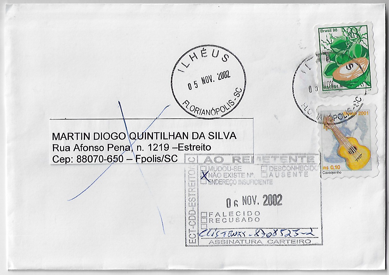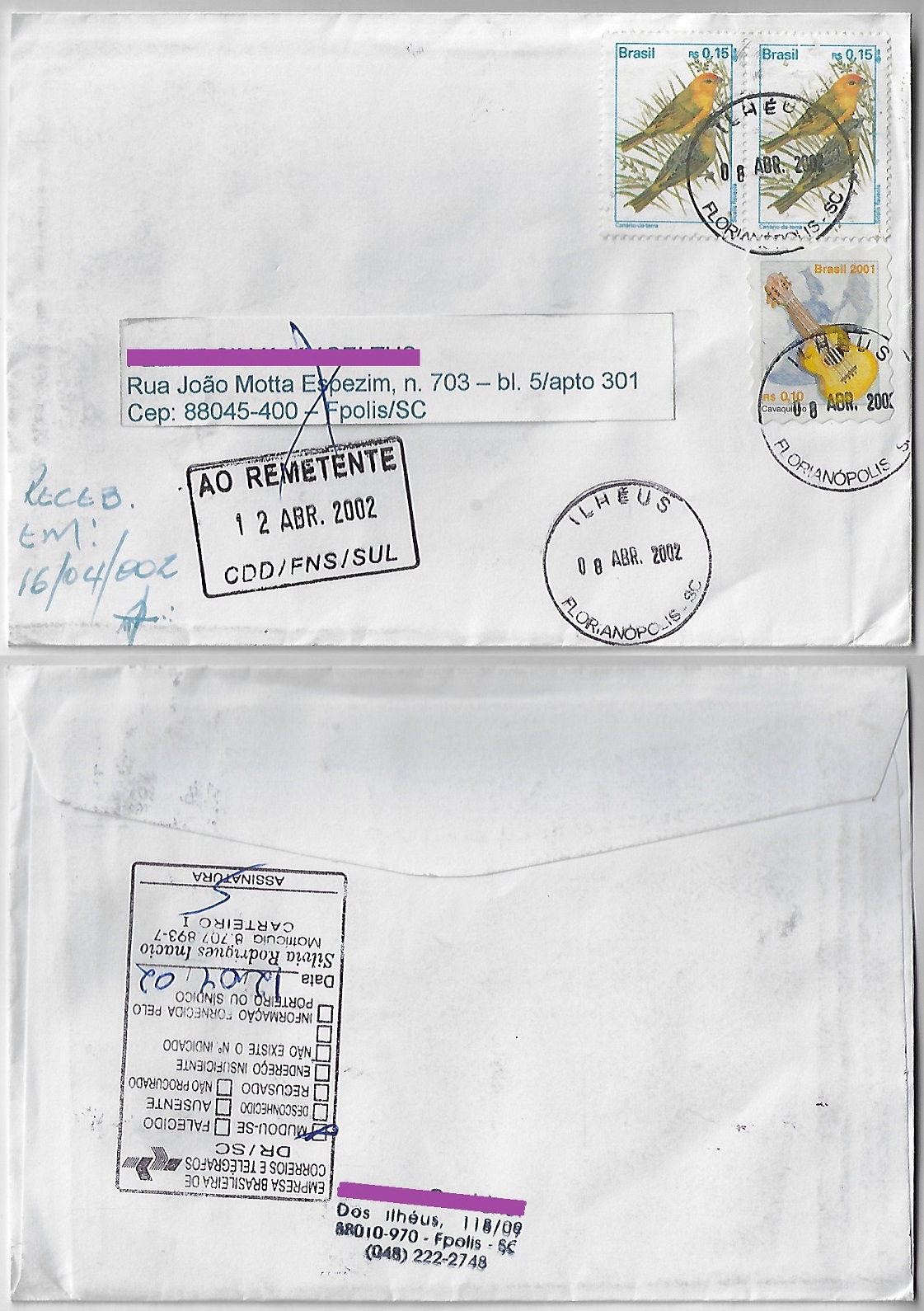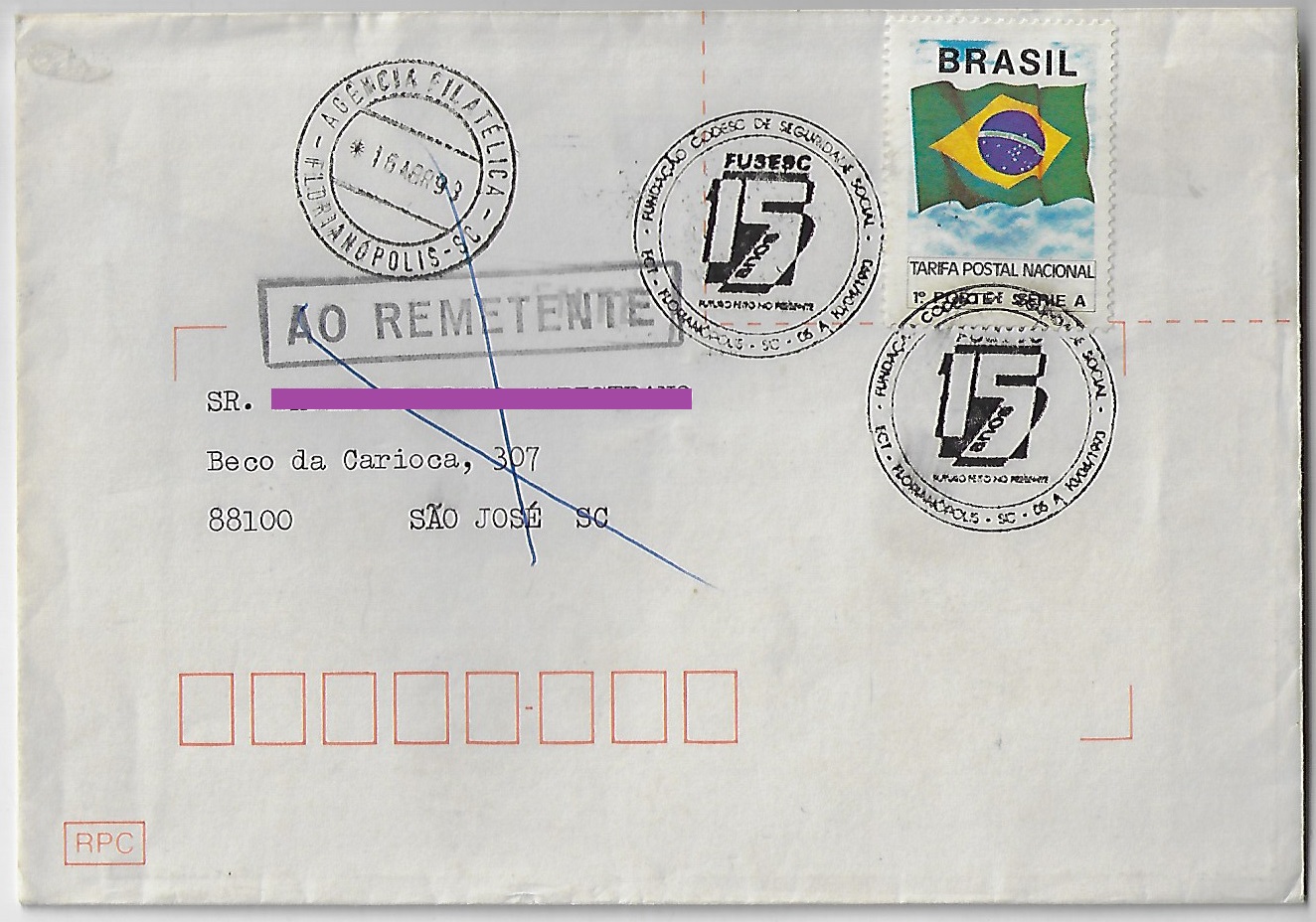 | 84572 | 2019, carimbo de serviço ME - Mal Encaminhado sobre envelope enviado de Florianópolis para São José, mal encaminhado a Palhoça | 10,00 | Foto |