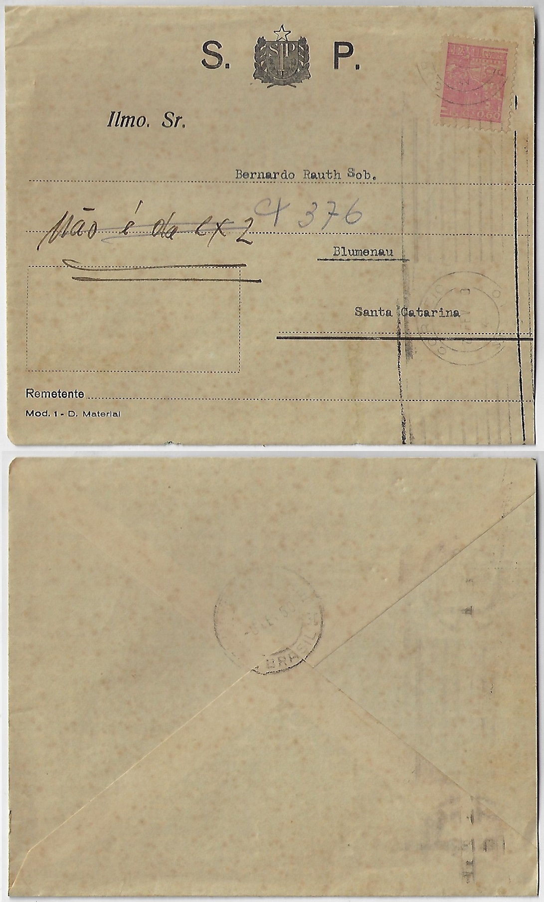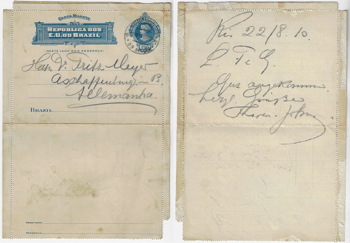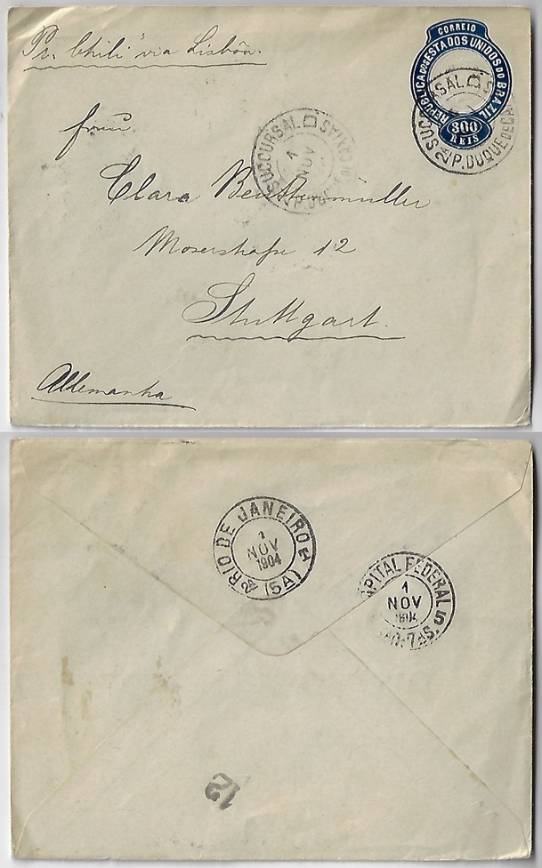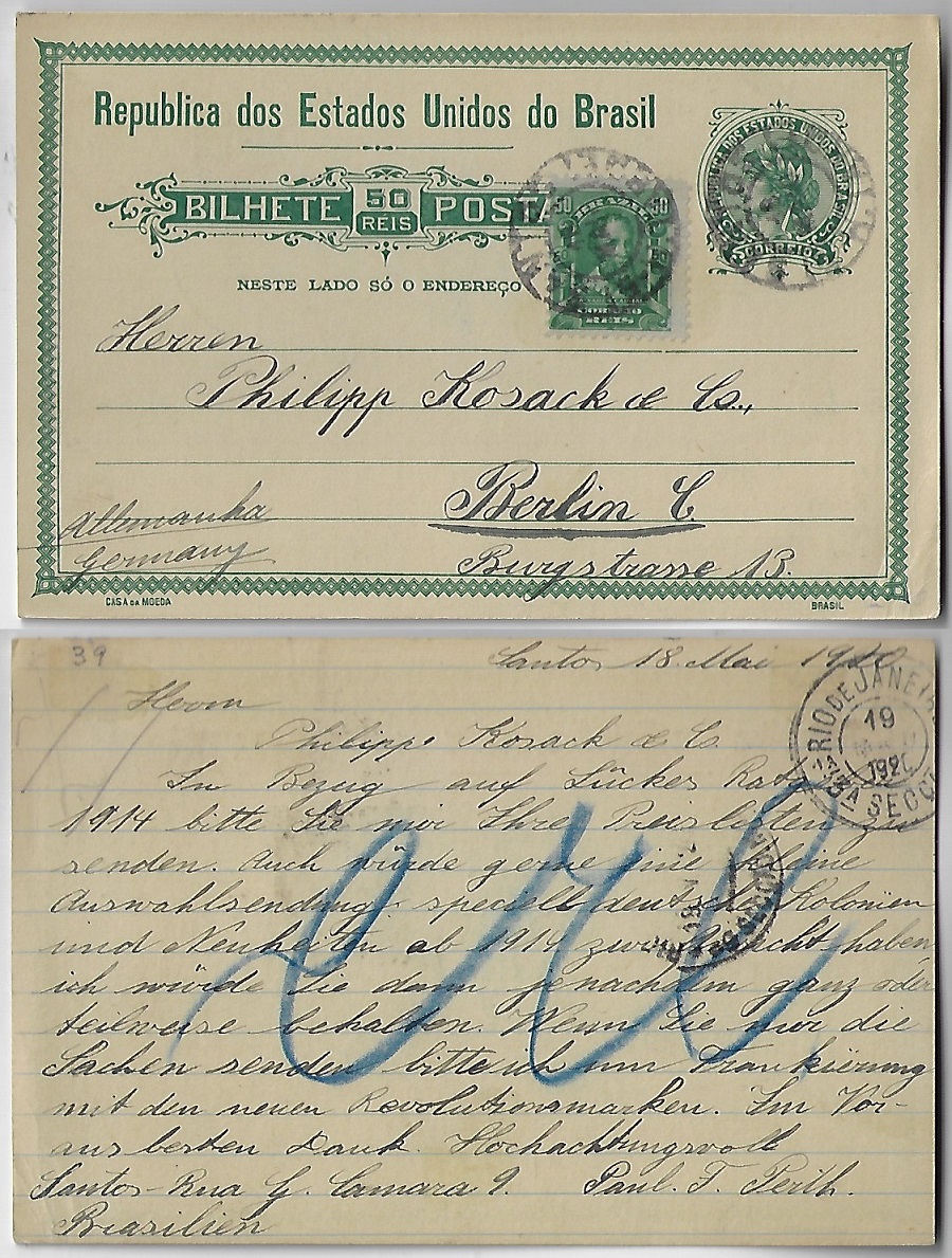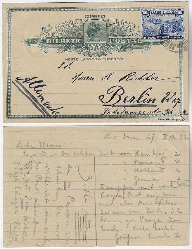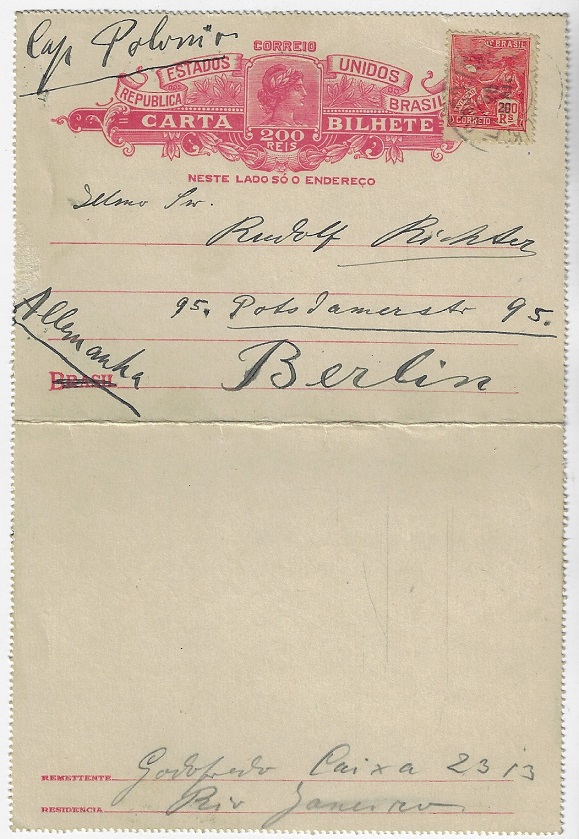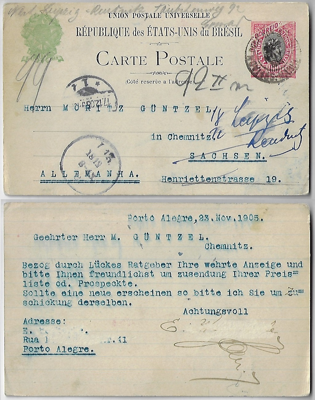 | 77255 | 1900s, inteiro postal CT-19 enviado de Blumenau para Berlin, reendereçado para Groß-Lichterfelde, o destinatário é o parlamentar Hermann Müller-Sagan, 3 selos adicionas para porte internacional caíram | 10,00 | Foto |