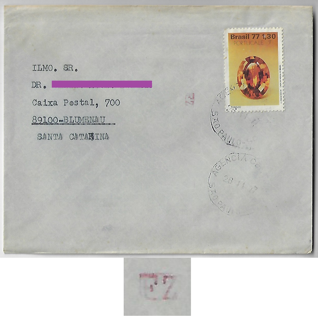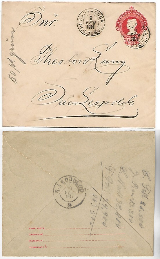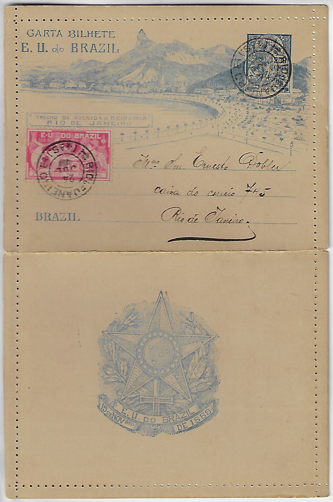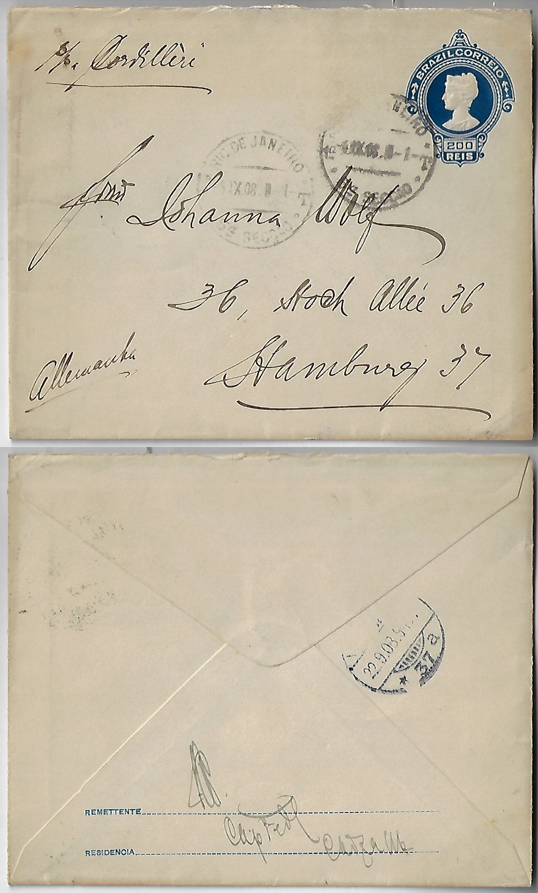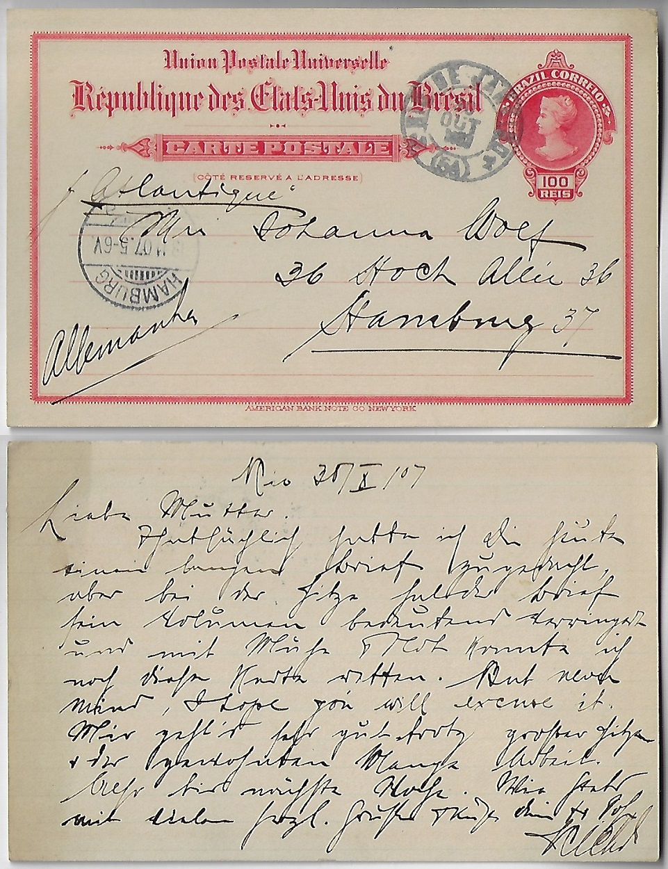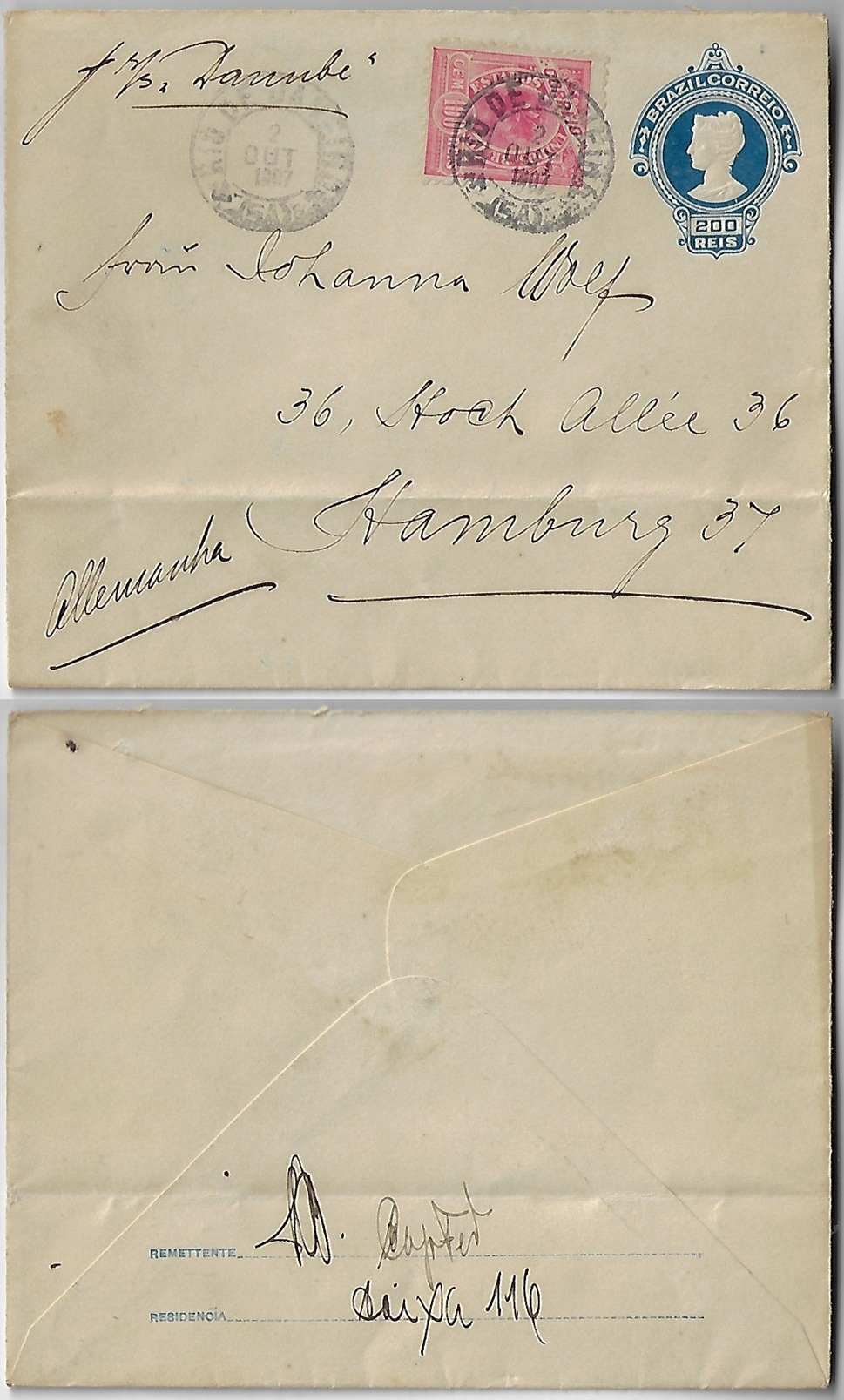 | 77255 | 1900s, inteiro postal CT-19 enviado de Blumenau para Berlin, reendereçado para Groß-Lichterfelde, o destinatário é o parlamentar Hermann Müller-Sagan, 3 selos adicionas para porte internacional caíram | 10,00 | Foto |