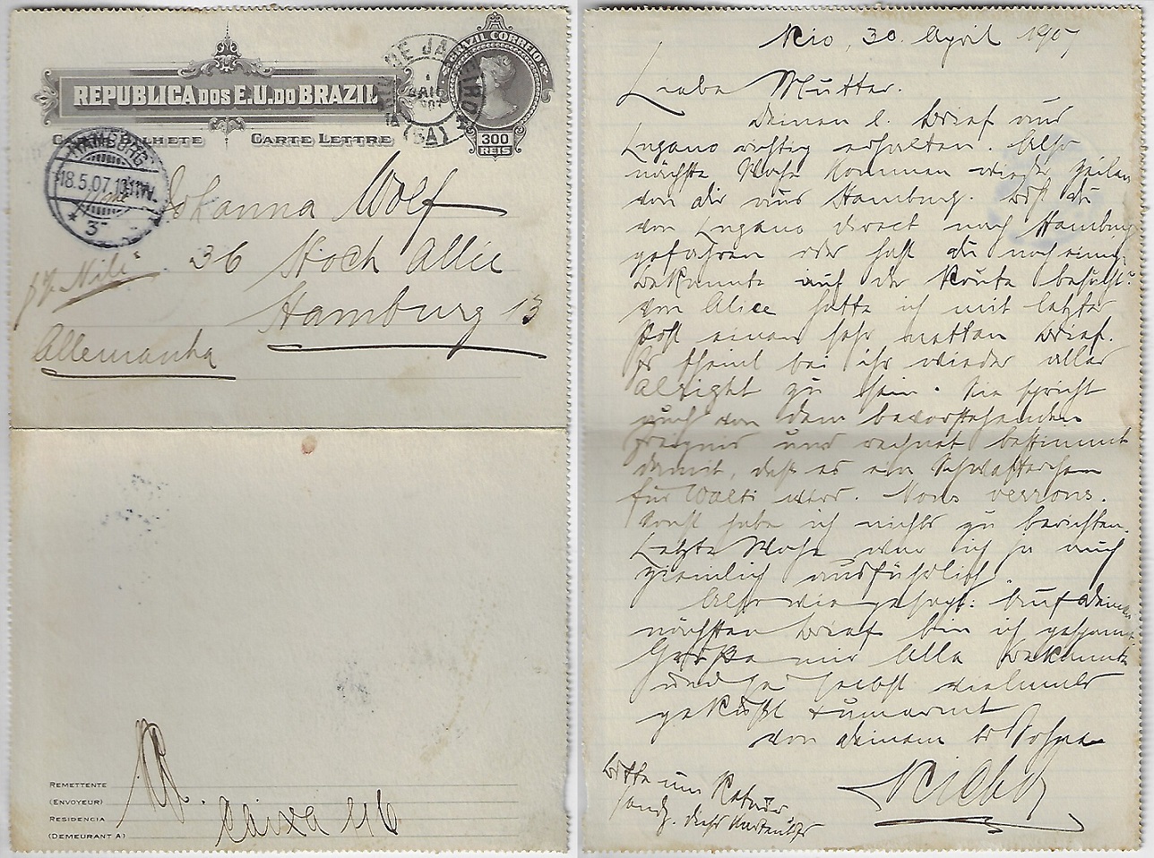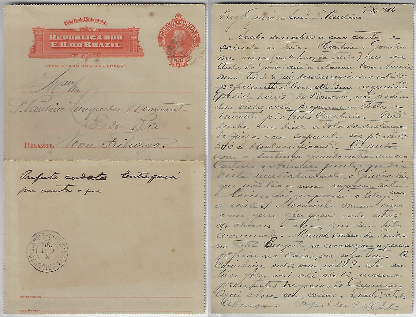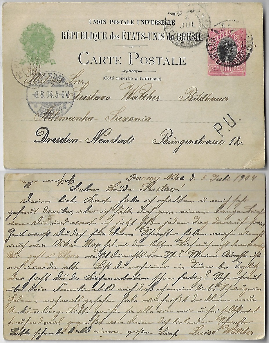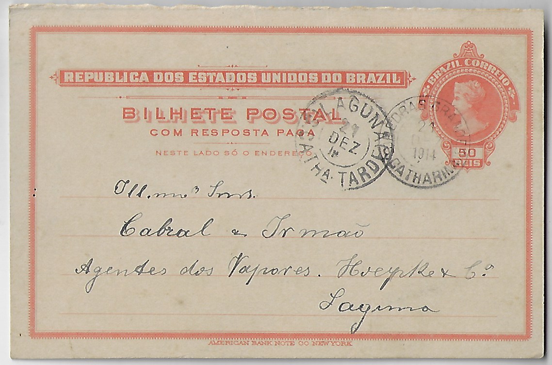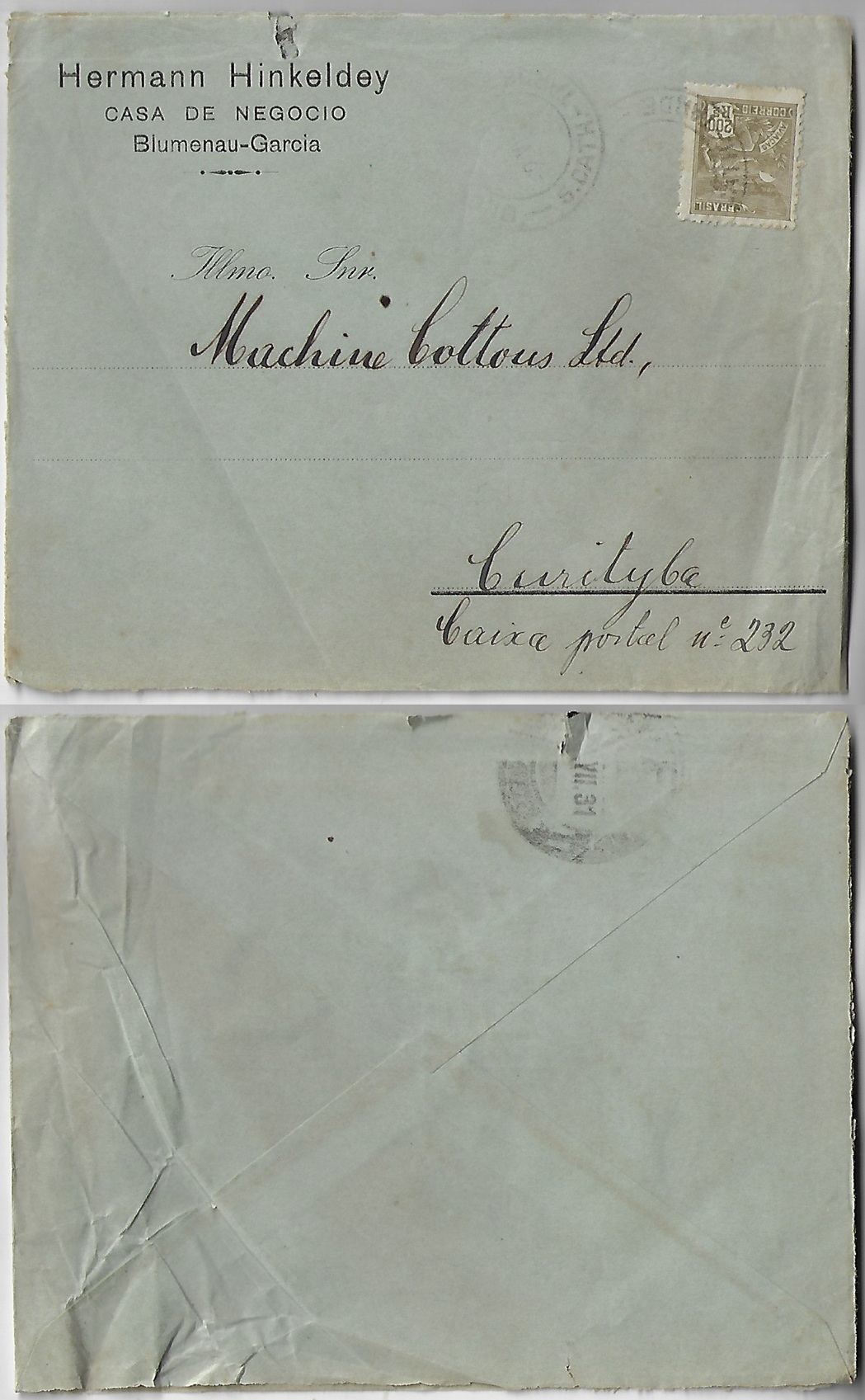 | 77255 | 1900s, inteiro postal CT-19 enviado de Blumenau para Berlin, reendereçado para Groß-Lichterfelde, o destinatário é o parlamentar Hermann Müller-Sagan, 3 selos adicionas para porte internacional caíram | 10,00 | Foto |