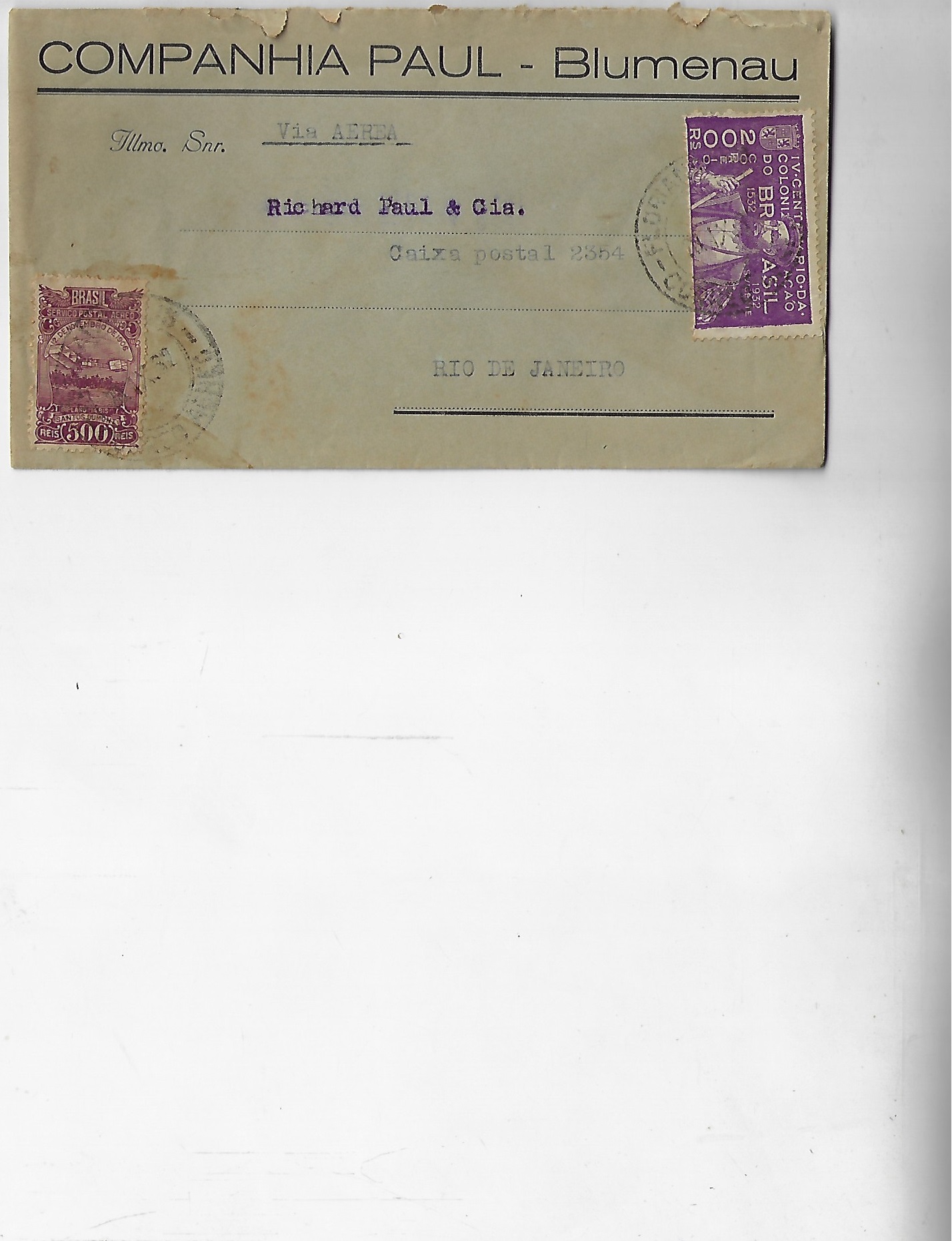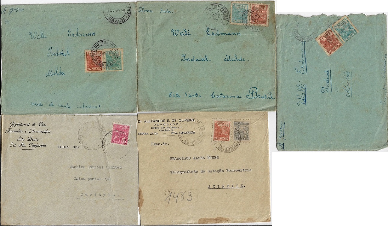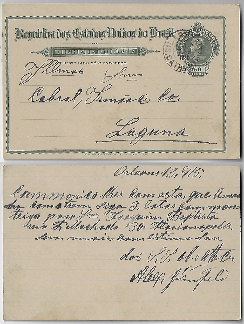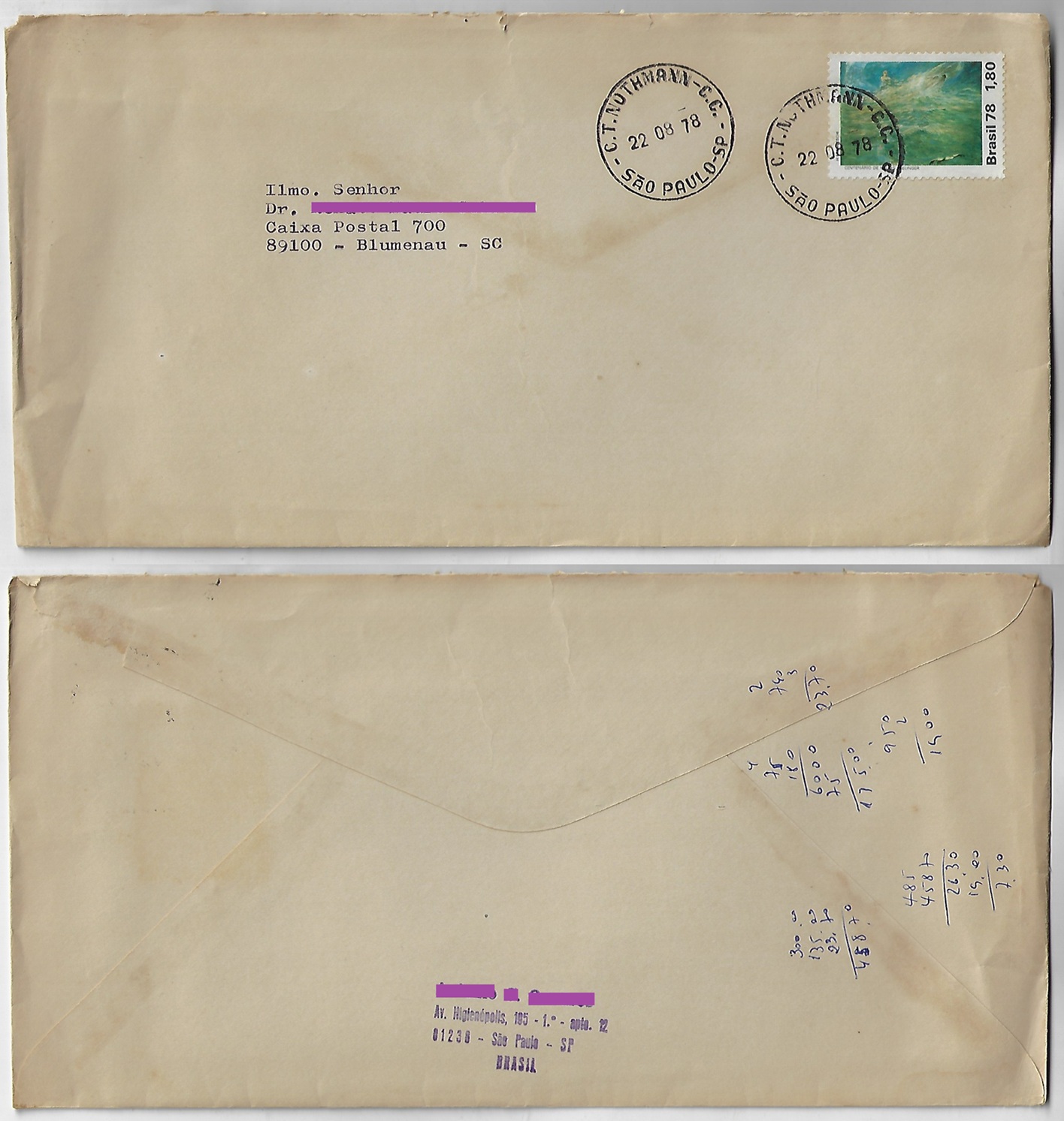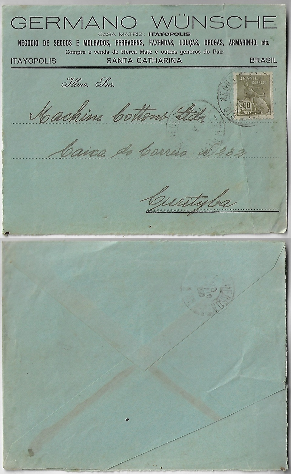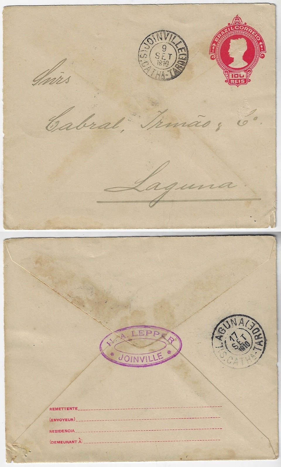 | 77255 | 1900s, inteiro postal CT-19 enviado de Blumenau para Berlin, reendereçado para Groß-Lichterfelde, o destinatário é o parlamentar Hermann Müller-Sagan, 3 selos adicionas para porte internacional caíram | 10,00 | Foto |