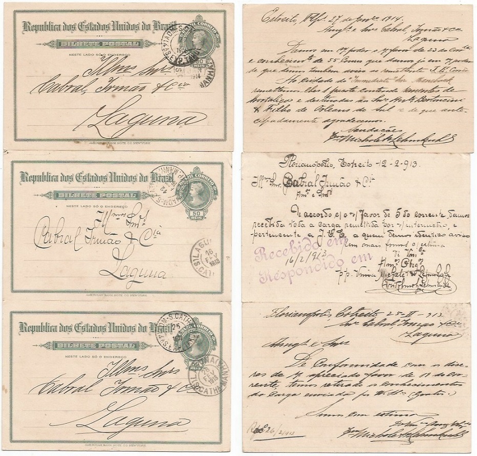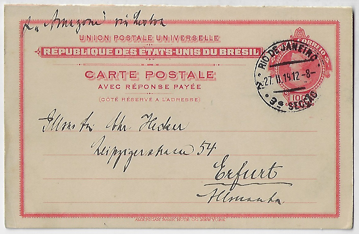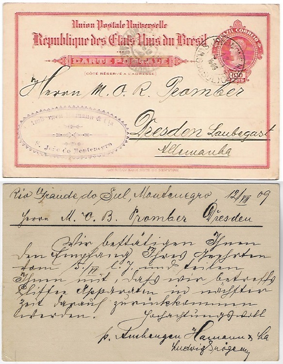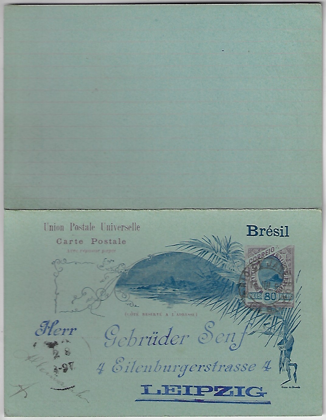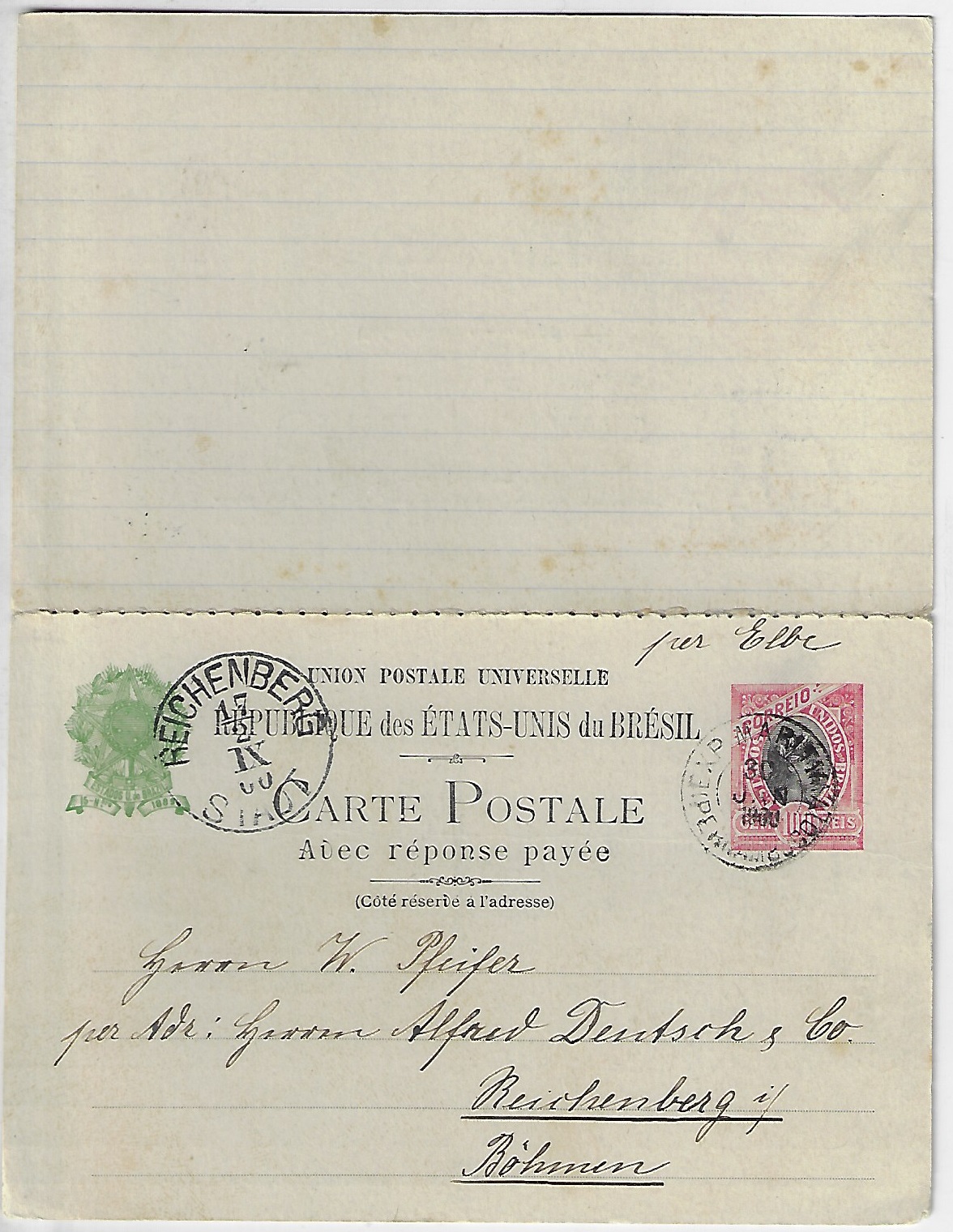 | 46143 | 1900, inteiro postal BP-60 com resposta do Recife (30/1) para Reichenberg (atual Liberec) na República Checa (17/2), pelo vapor Elbe da Hamburg-Amerikanische Packetfarhrt Aktien-Gesellschaft | 170,00 | Foto |