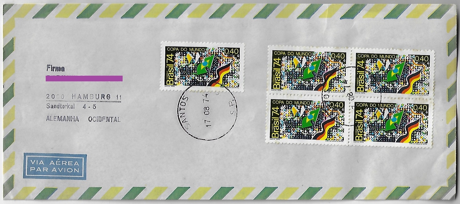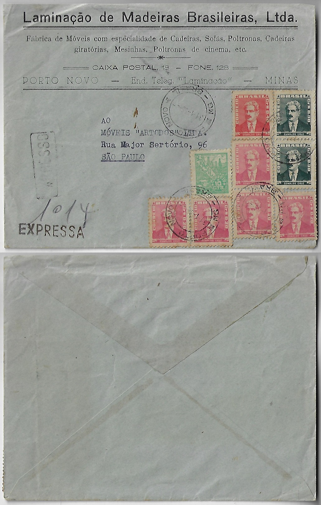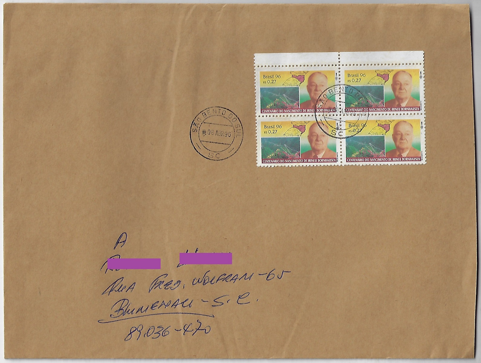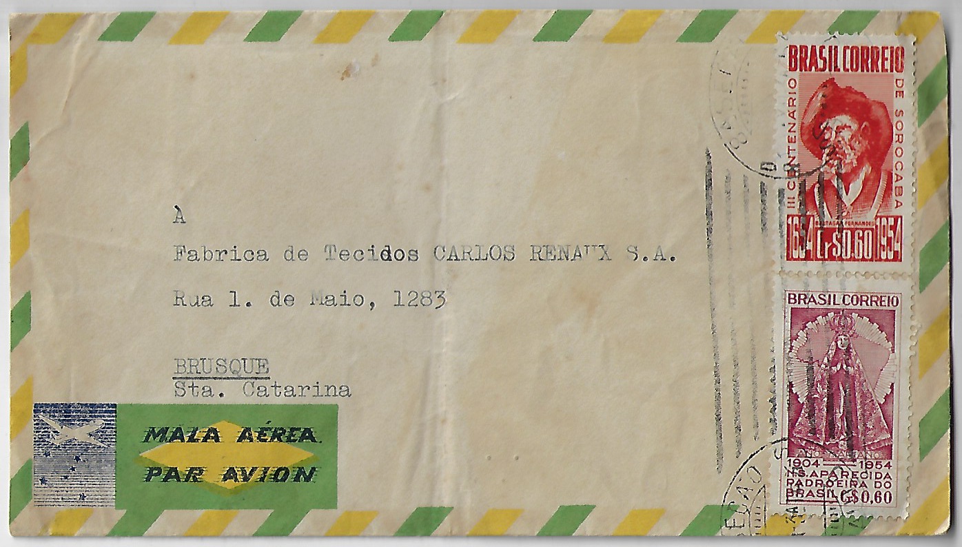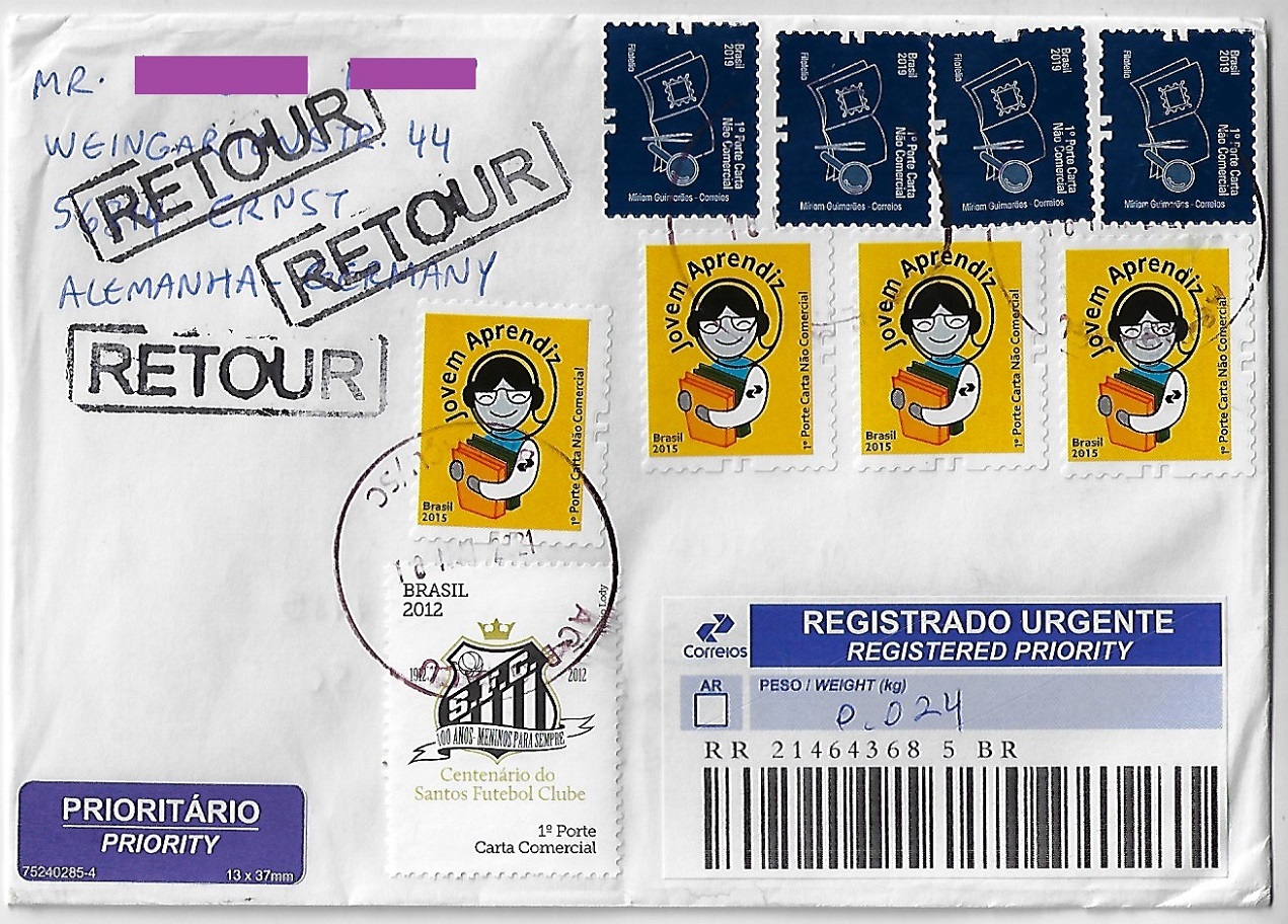 | 50699 | 2021, envelope prioritário registrado de Biguaçu (18/5) para Ernst / Alemanha, retornado ao remetente, porteado com 9 selos sendo um comemorativo ao Centenário do Santos Futebol Clube | 10,00 | Foto |