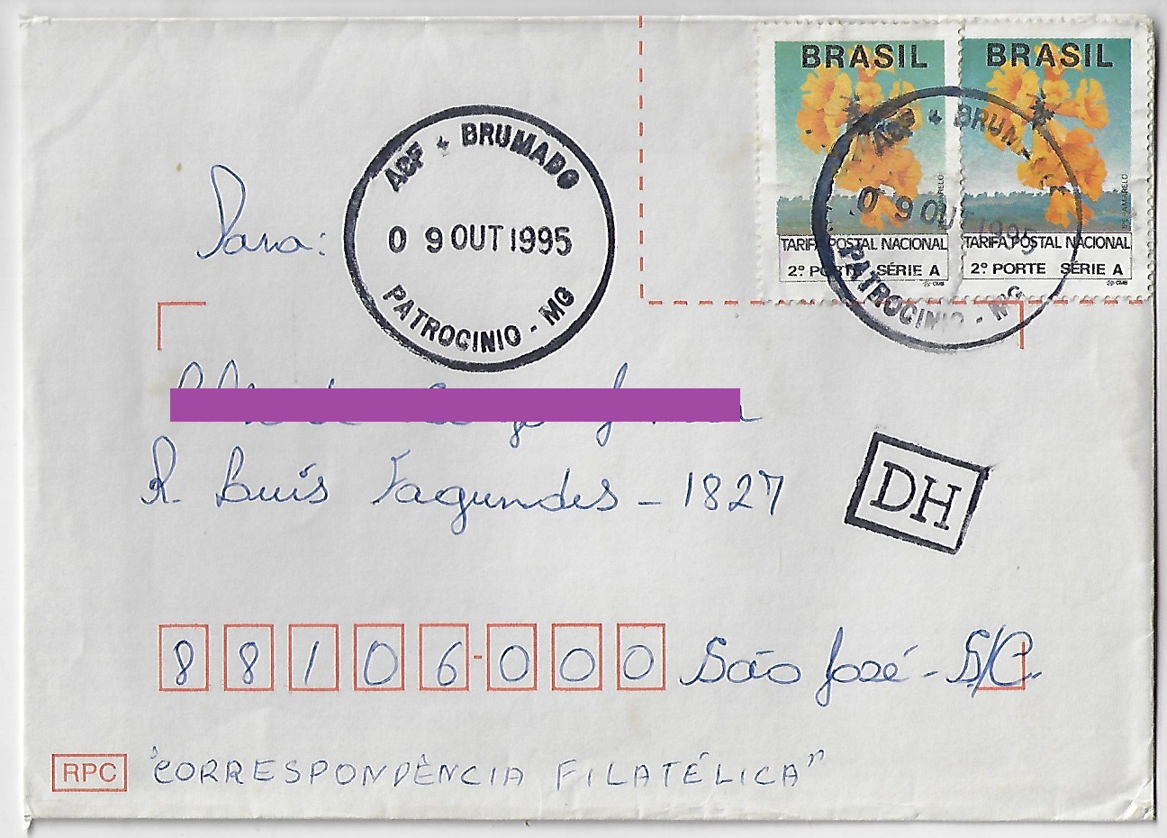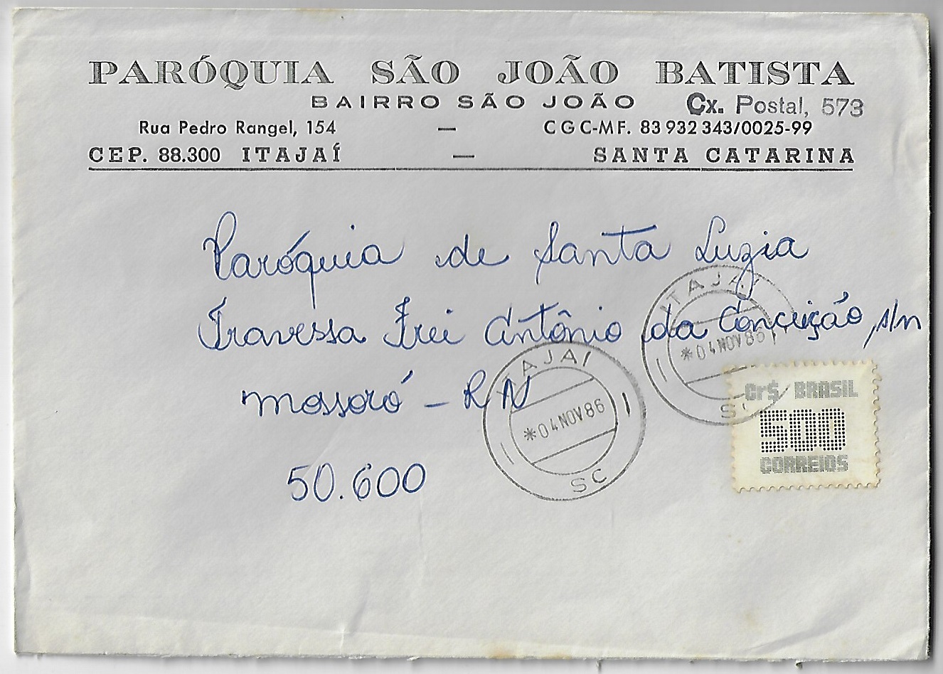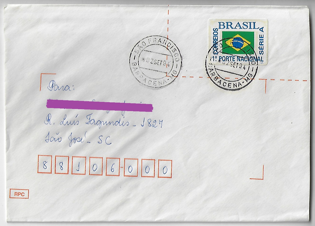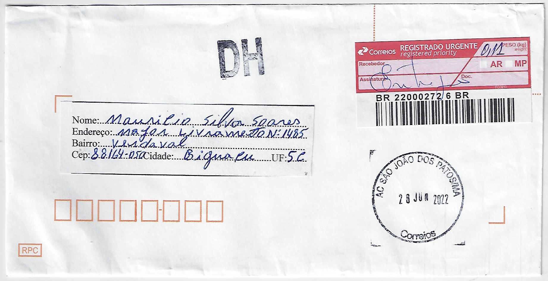 | 84258 | 2022, envelope registrado de São João dos Patos / MA (topônimo Lagoa de São João Batista + Lagoa dos Patos, devido as aves) para Biguaçu /SC, etiqueta vermelha de registro, carimbo DH = "Depois da Hora" | 10,00 | Foto |