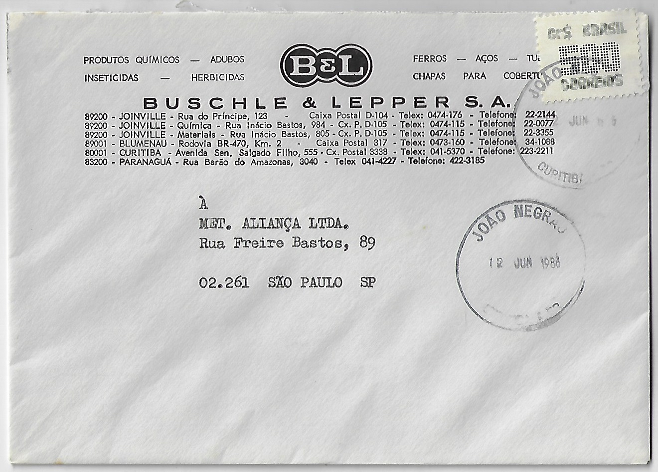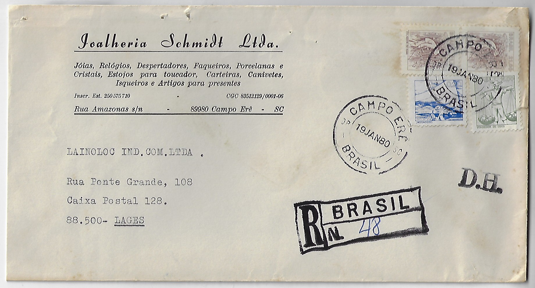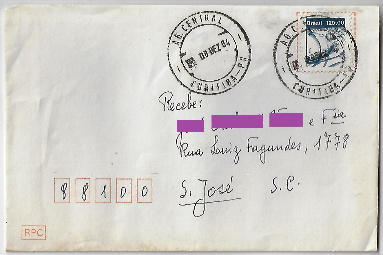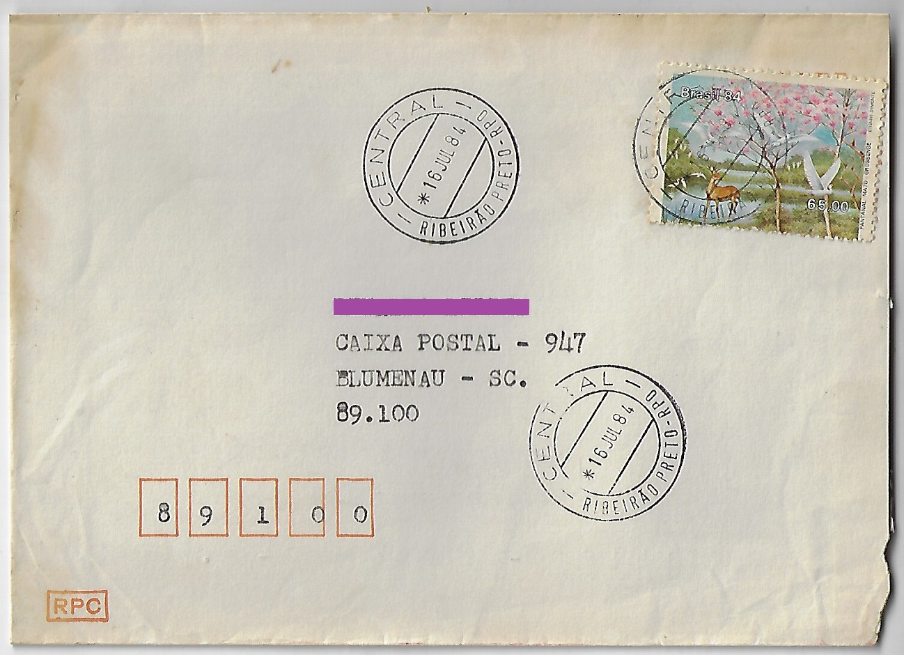 | 84258 | 2022, envelope registrado de São João dos Patos / MA (topônimo Lagoa de São João Batista + Lagoa dos Patos, devido as aves) para Biguaçu /SC, etiqueta vermelha de registro, carimbo DH = "Depois da Hora" | 10,00 | Foto |