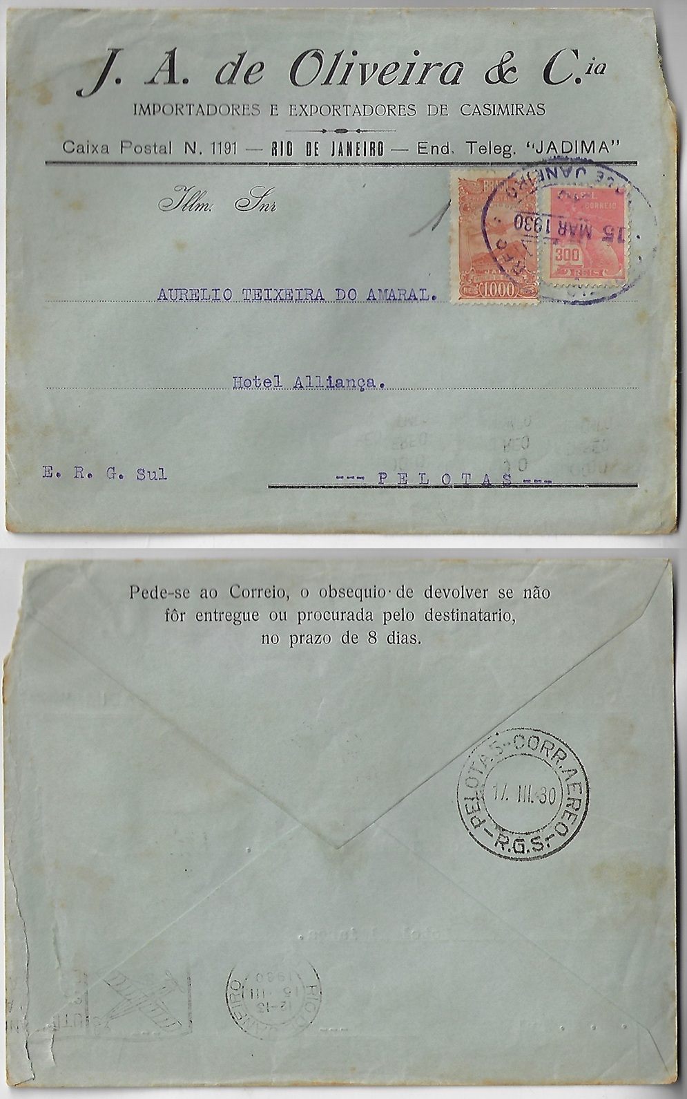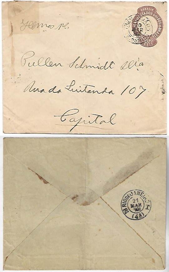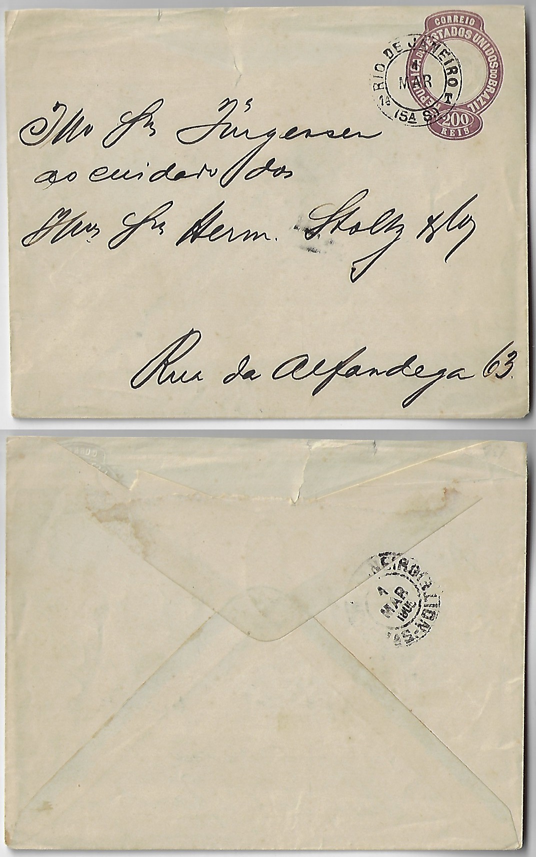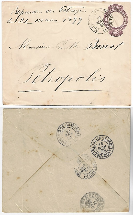 | 69601 | 1899, Inteiro postal EN-45 enviado de Alto de Teresópolis / RJ (13/3), por Rio de Janeiro (13/3), para Petrópolis / RJ (14/3), oval aberta 1 mm, "Correio" com aproximadamente 10 mm, segundo "O" de "200" caído para esquerda (catálogo 24 UF) | 33,00 | Foto |