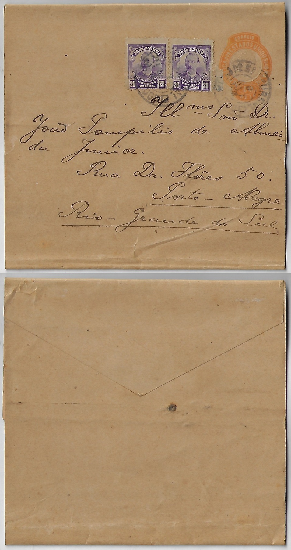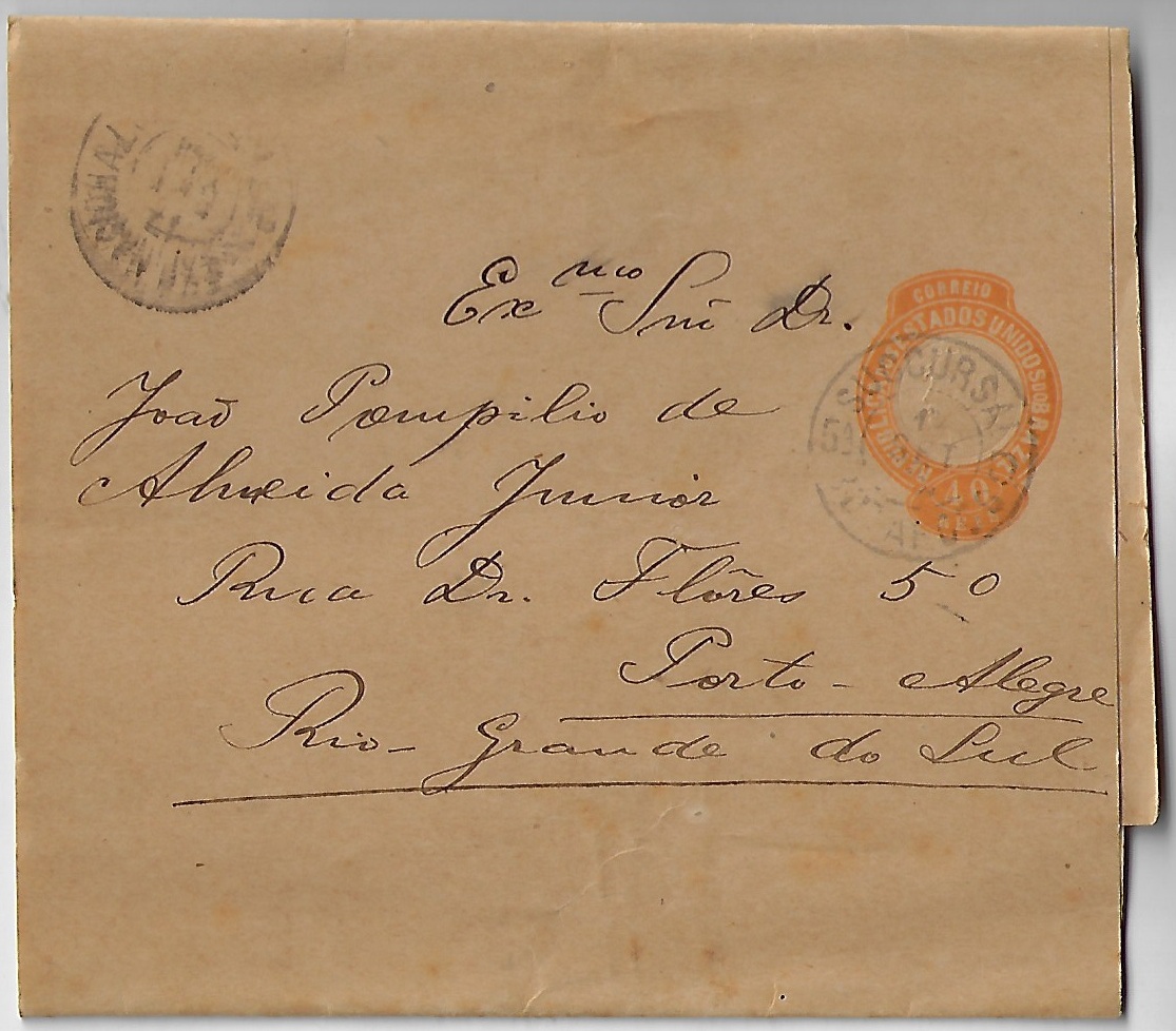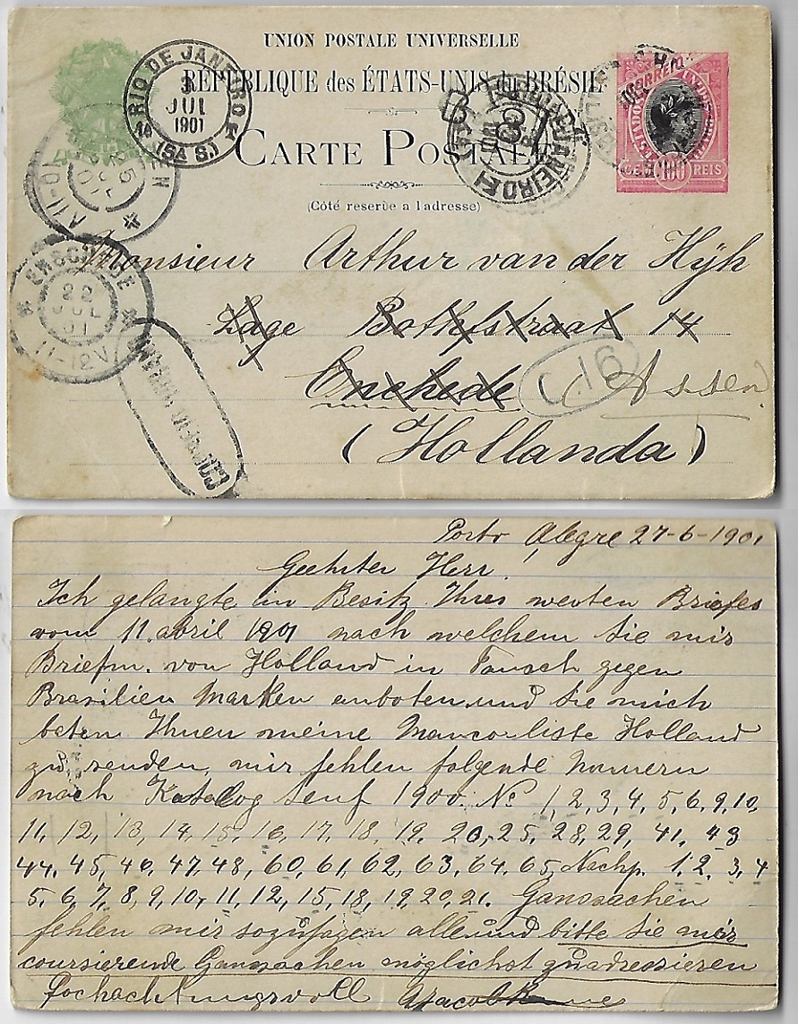 | 74667 | 1901, inteiro postal BP-57 enviado de Porto Alegre (27/6), via Rio de Janeiro (3/7), para Enschede / Holanda (22/7) e reendereçado para Assen (25/7 carimbo com cercadura oval "Correio Urbano" | 20,00 | Foto |