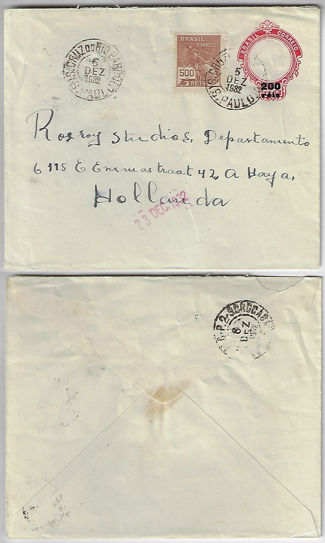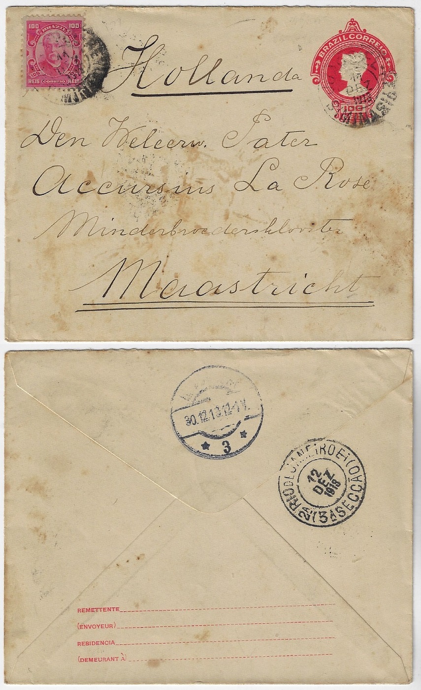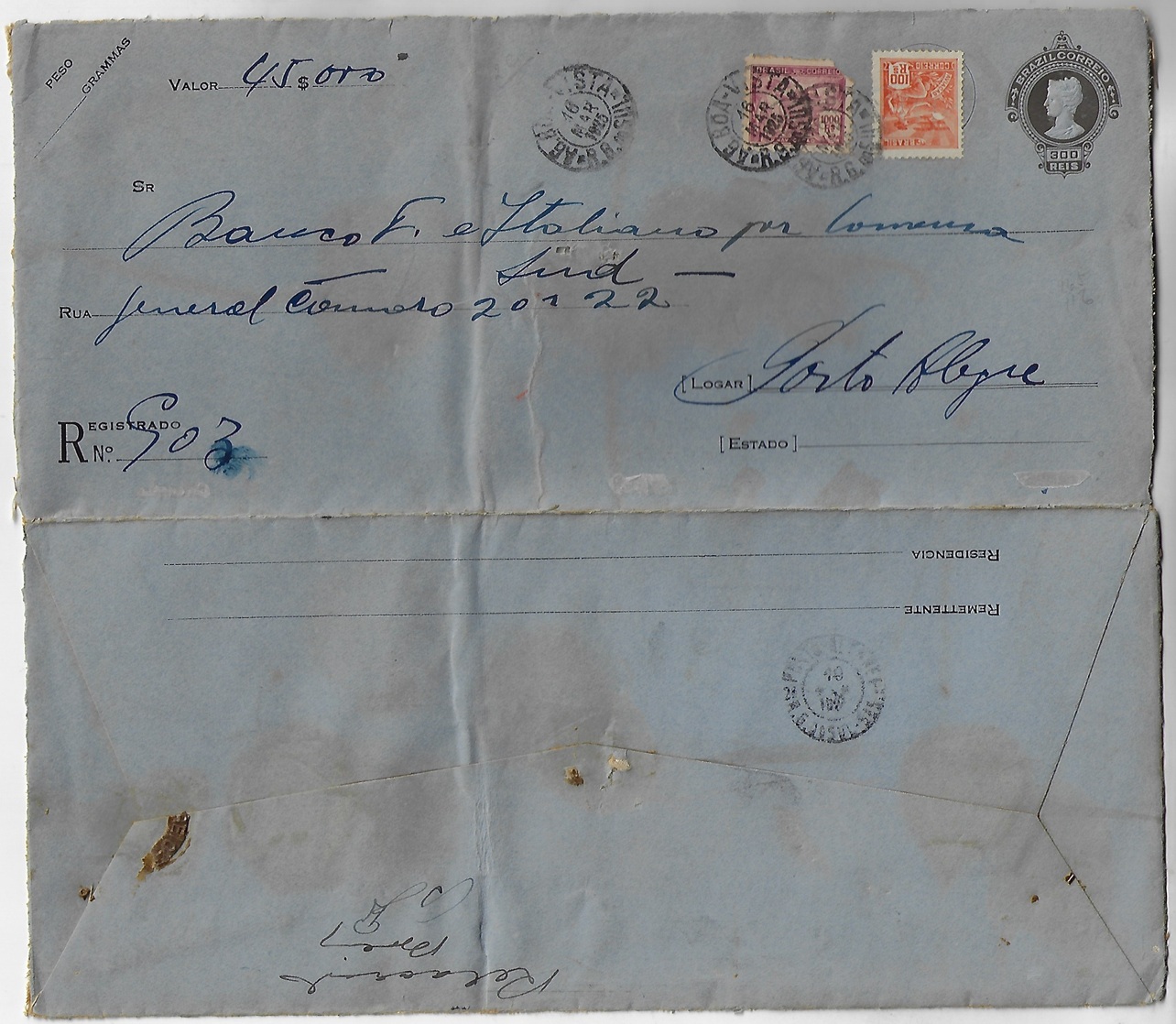 | 74667 | 1901, inteiro postal BP-57 enviado de Porto Alegre (27/6), via Rio de Janeiro (3/7), para Enschede / Holanda (22/7) e reendereçado para Assen (25/7 carimbo com cercadura oval "Correio Urbano" | 20,00 | Foto |