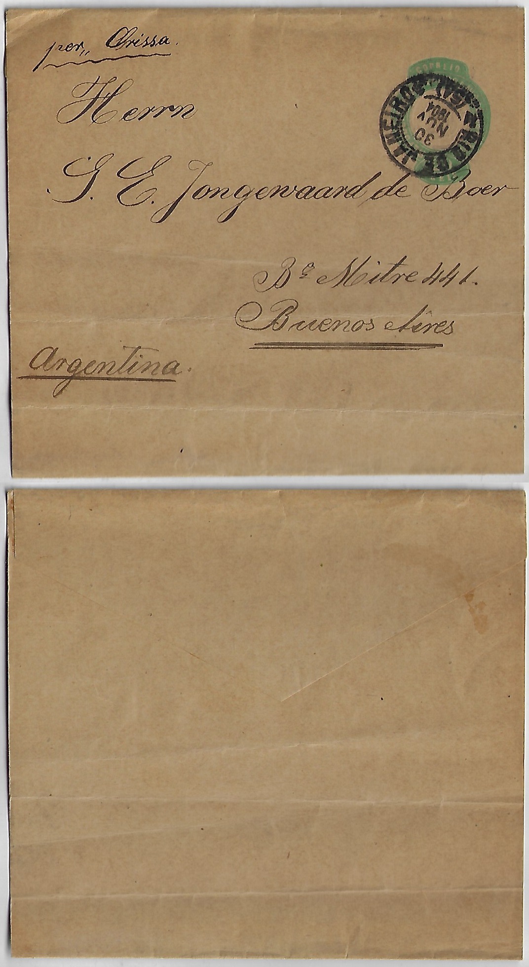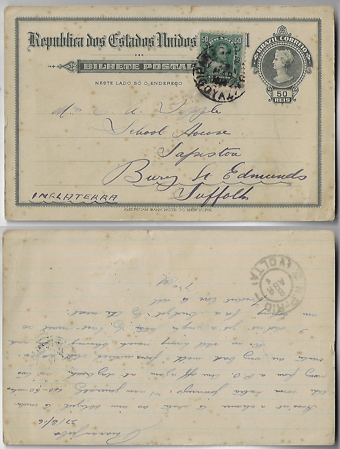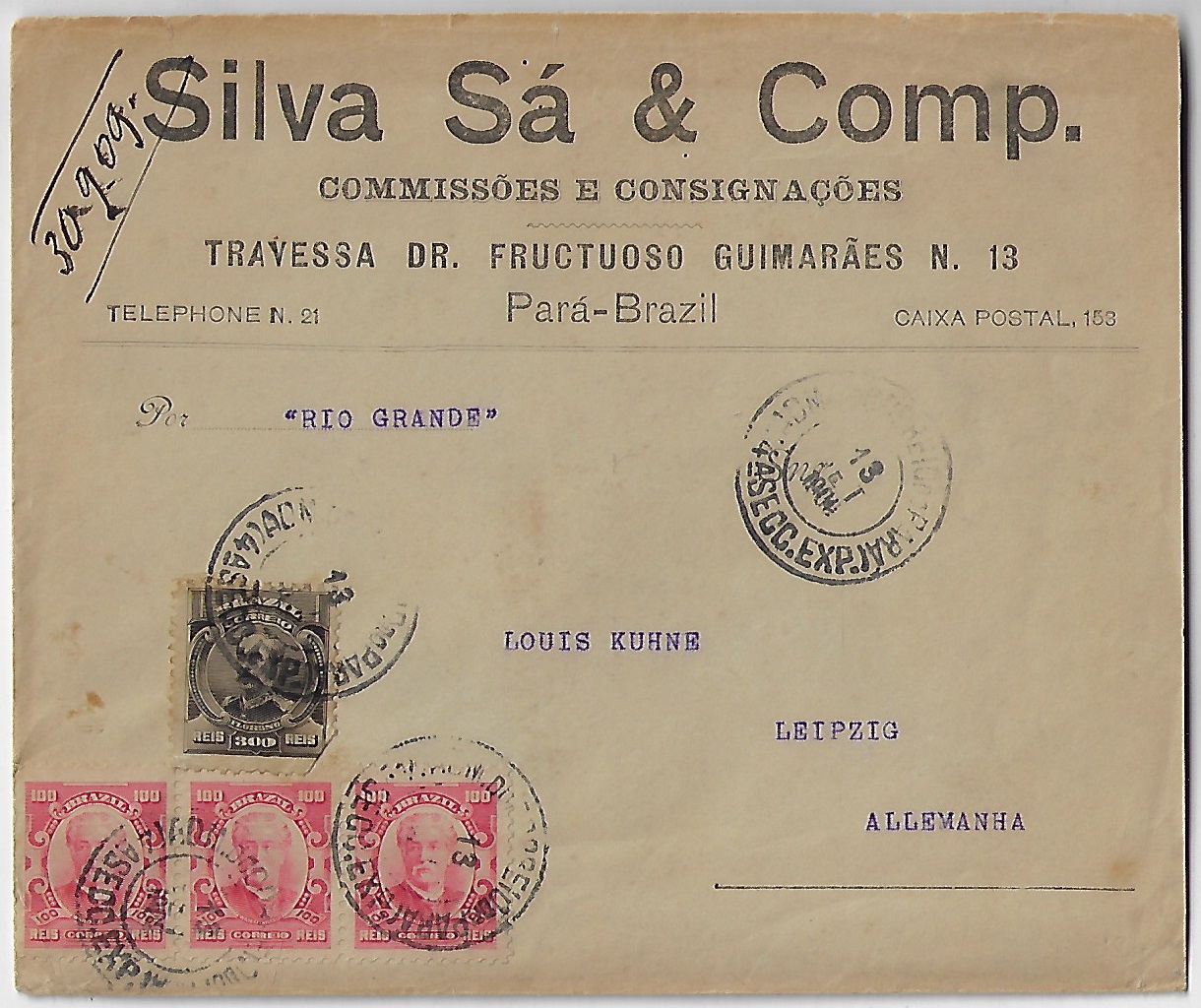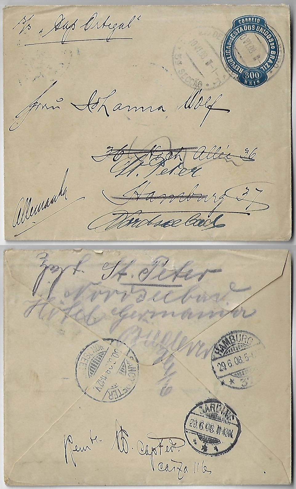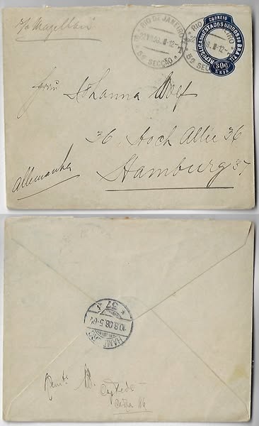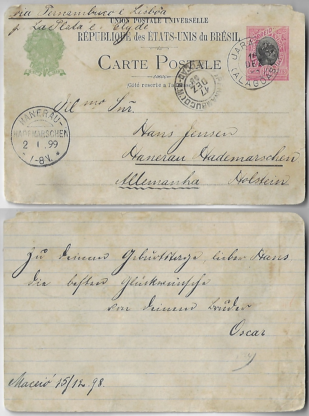 | 78155 | 1898, inteiro postal BP-57 enviado de Jaraguá (16/12), via Recife (17/12), via Lisboa, para Hanerau / Alemanha (2/1/1999), seguiu pelos navios La Plata e Clyde, ambos da Royal Mail Steam Packet Company. Terá havido um transbordo de malote? | 75,00 | Foto |