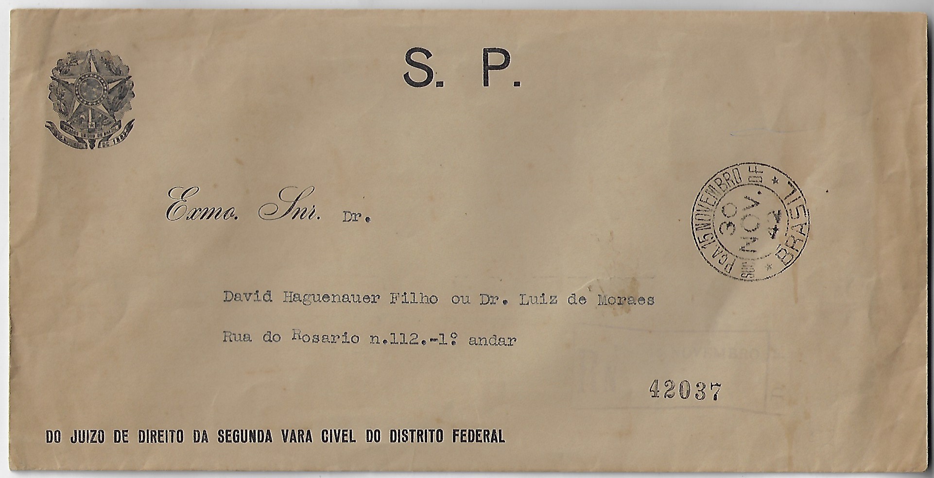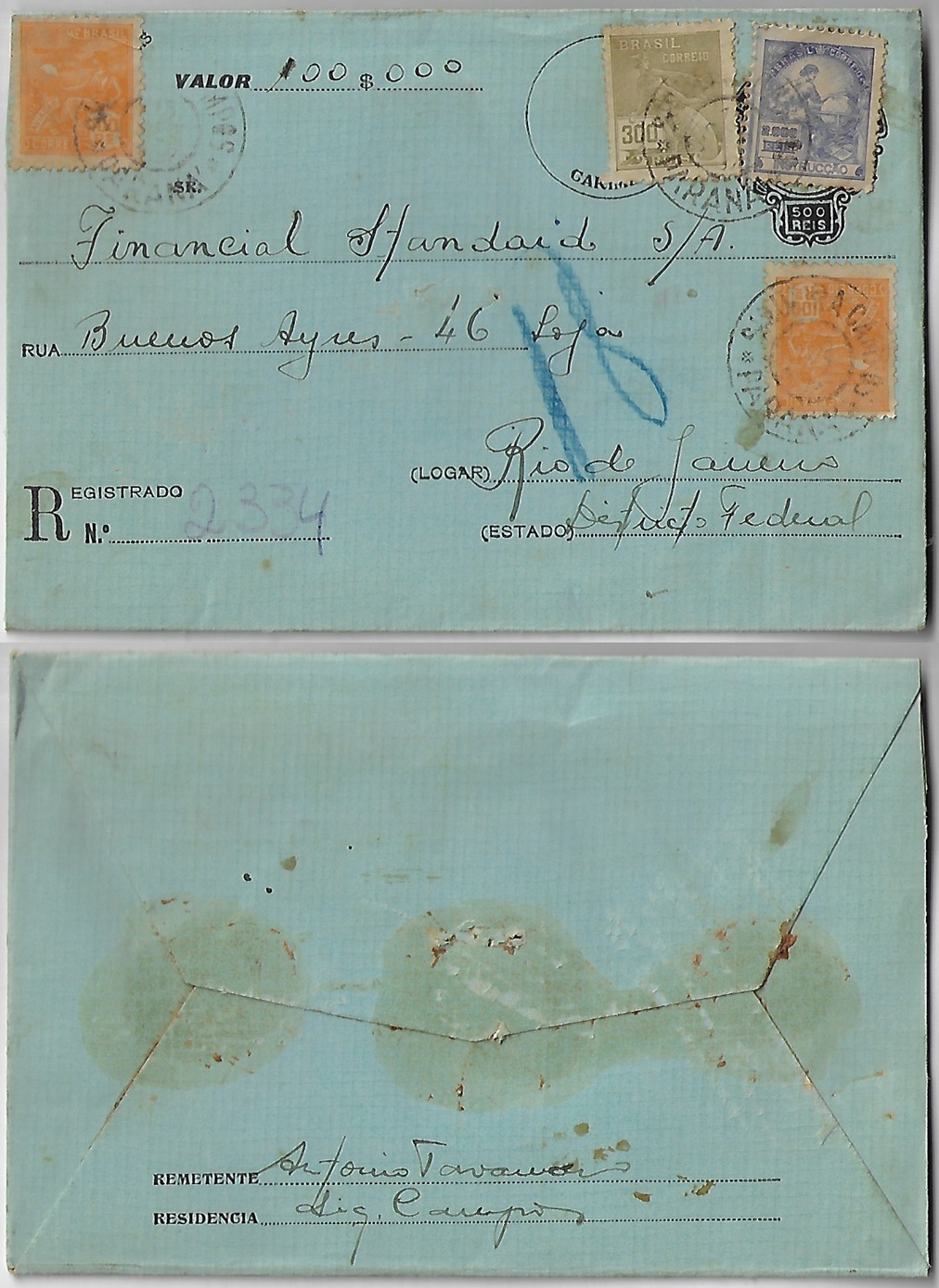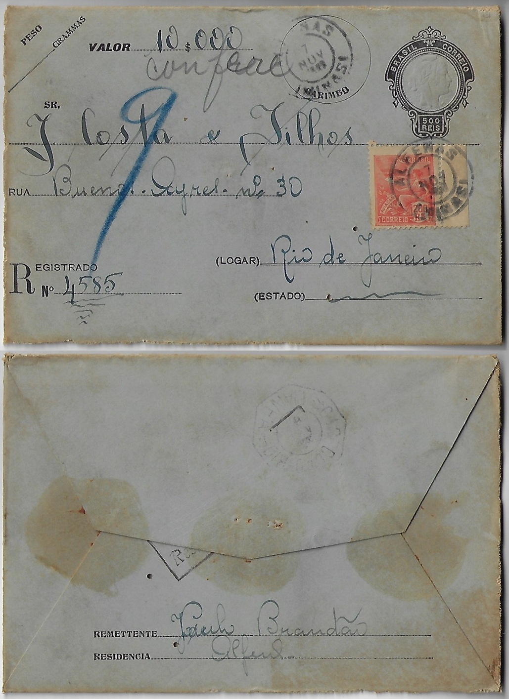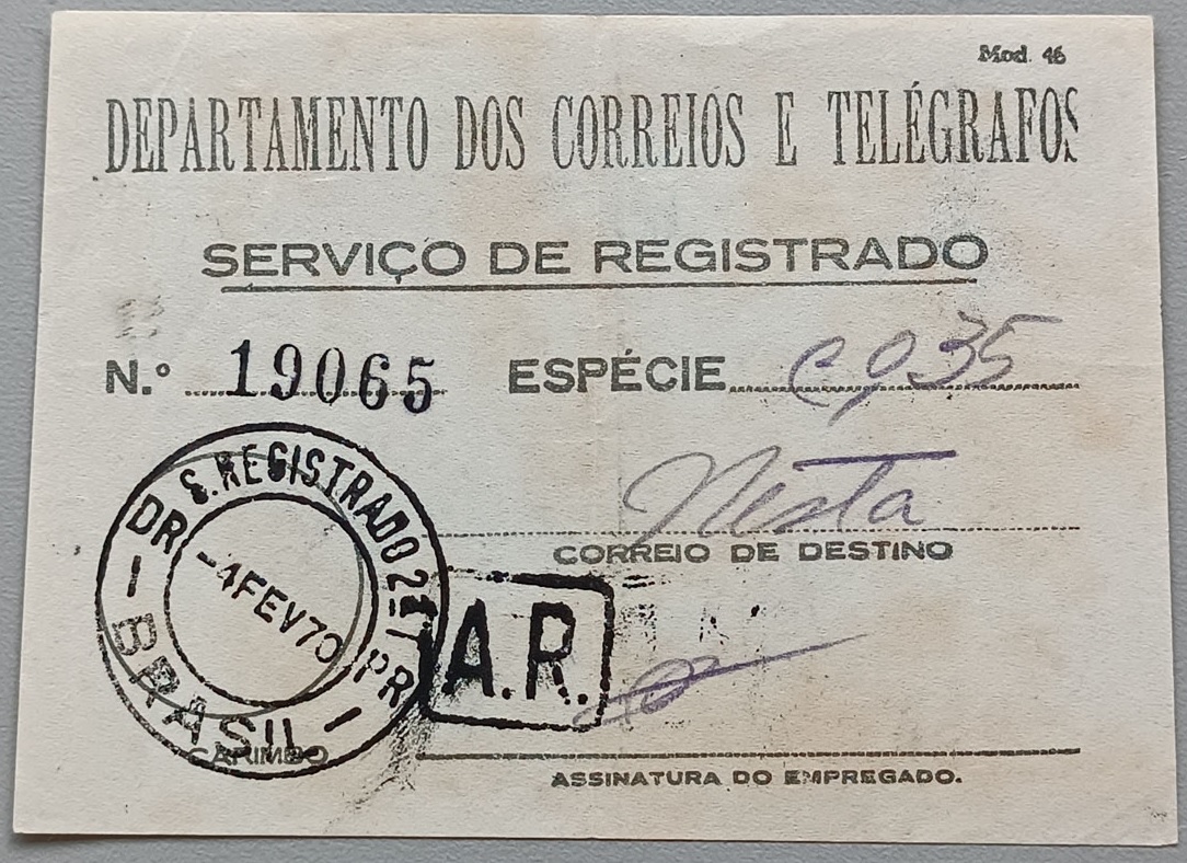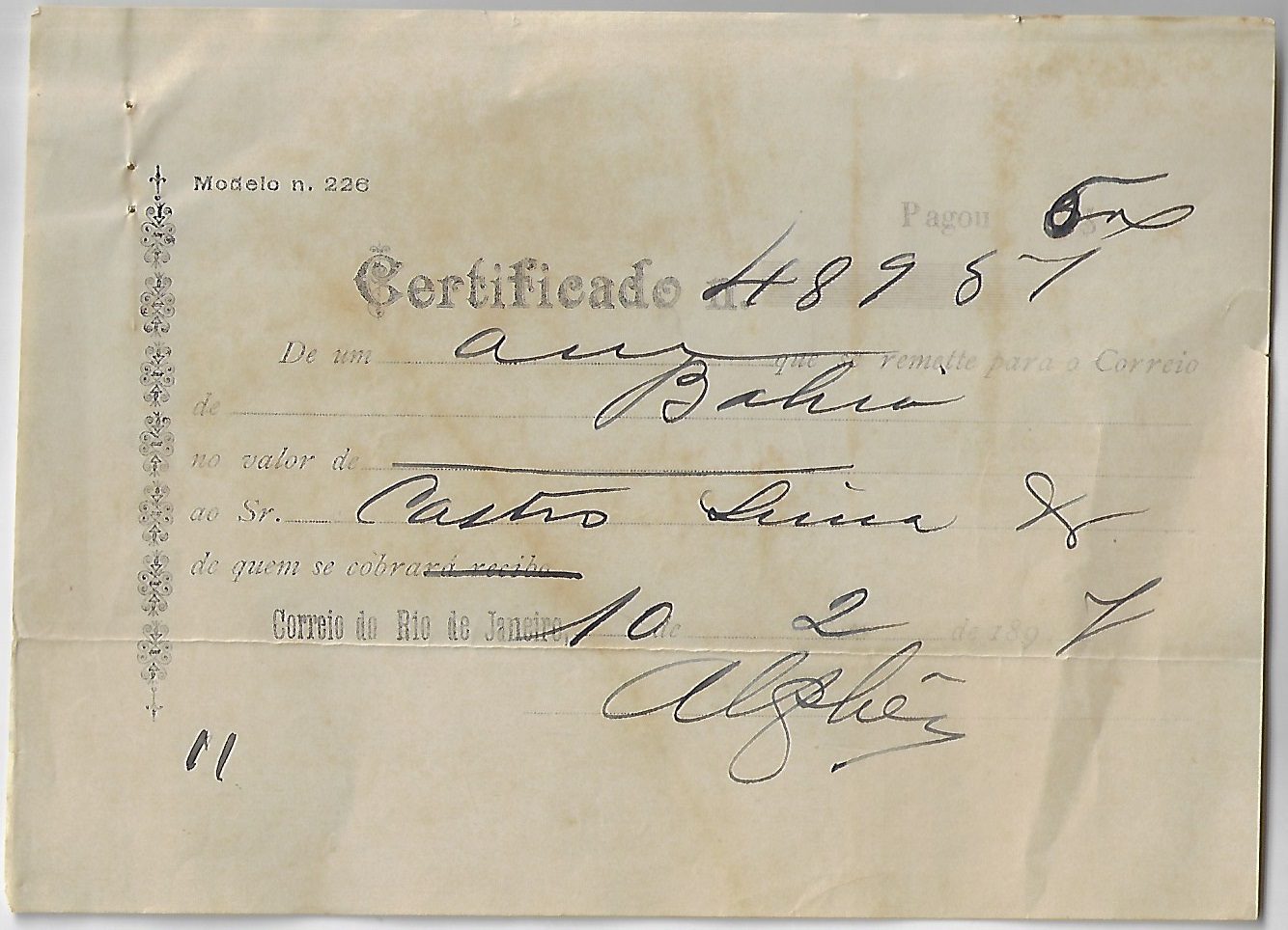 | 43744 | 1897, certificado do envio registrado pelos Correios de Auto de Processo do Rio de Janeiro (10/2) para Bahia, modelo nº 226 | 20,00 | Foto |