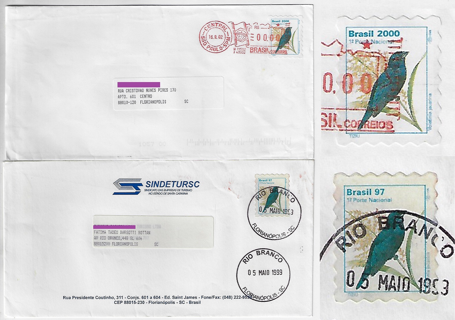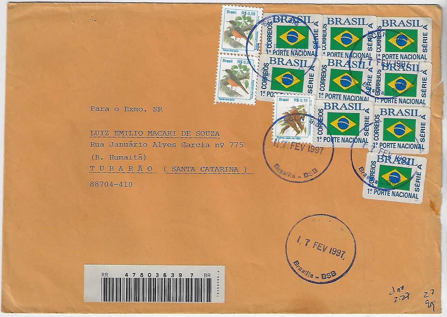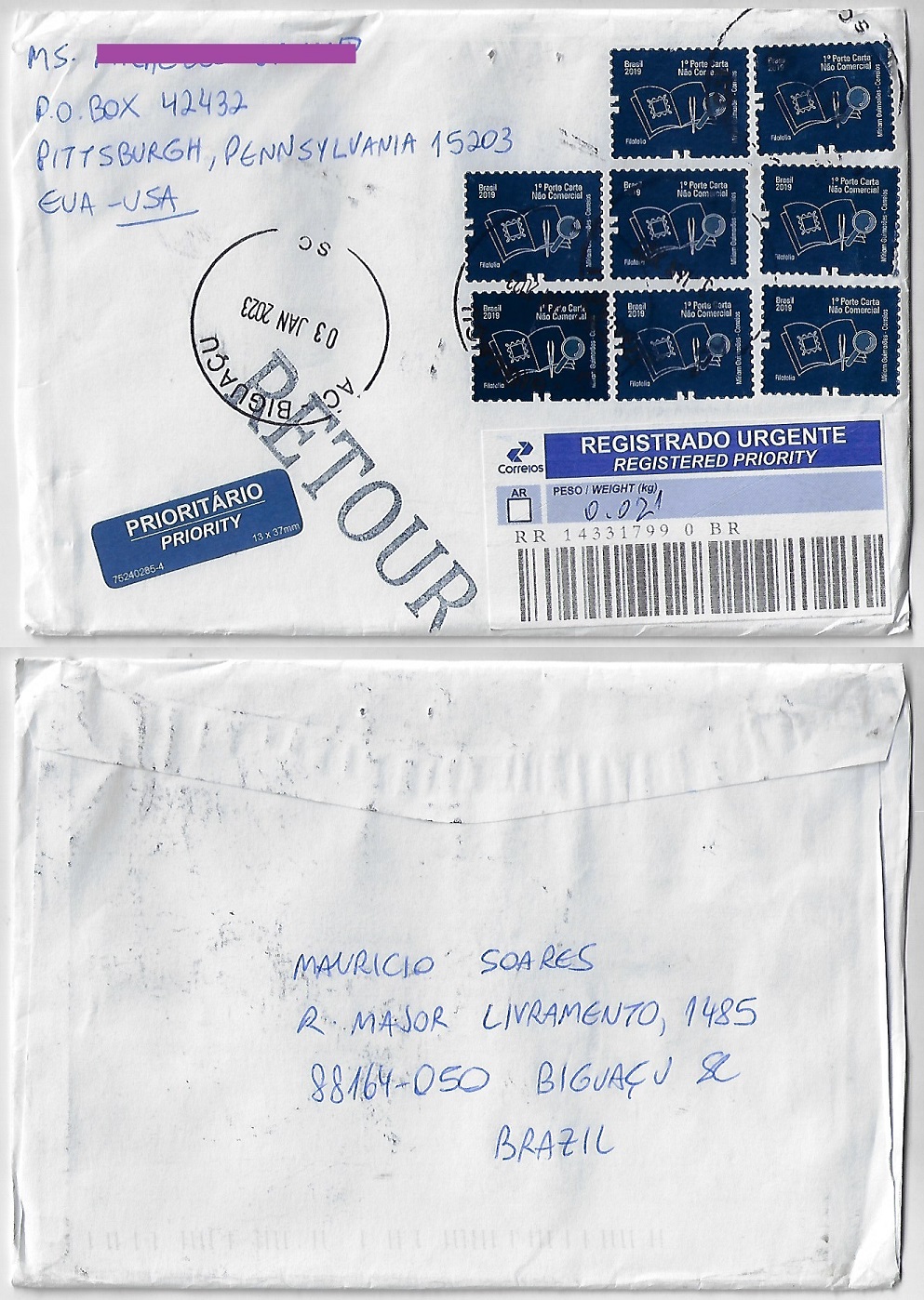 | 80589 | 2023, envelope prioritário registrado enviado de Biguaçu(3/1) para Pittsburgh / EUA, retornado ao remetente, porteado com 7 selos regulares Filatelia 1º Porte Nacional, marcas de triagem eletrônica no verso | 10,00 | Foto |