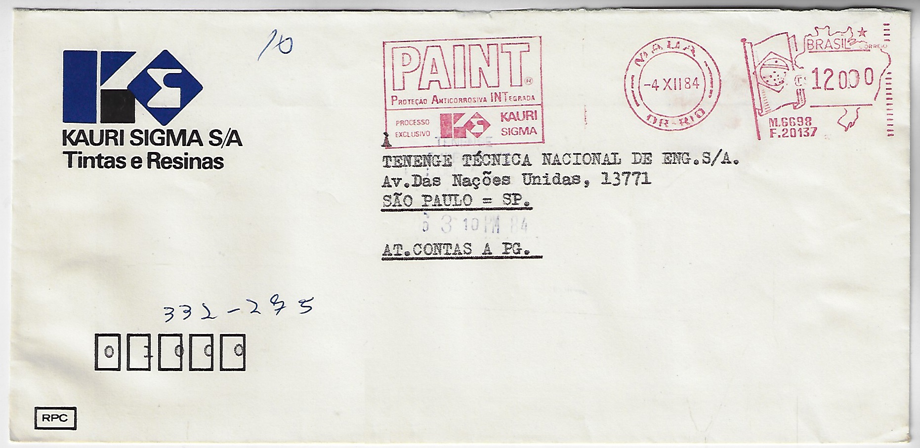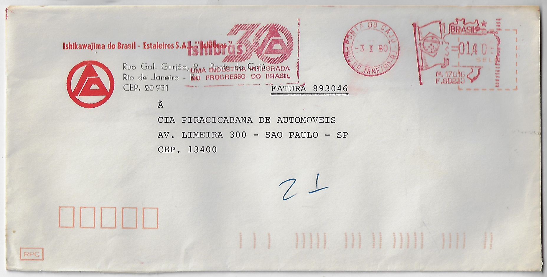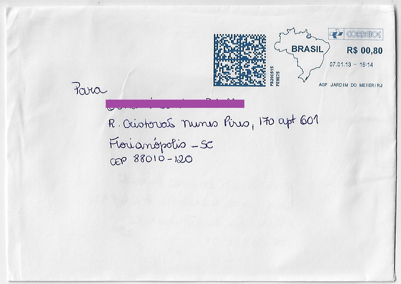 | 44452 | 2013, envelope do Rio de Janeiro para Florianópolis com porte complementado por franquia mecânica Mapa do Brasil, tipo H2.1. Pitney Bowes DM300/DM400 digital | 10,00 | Foto |