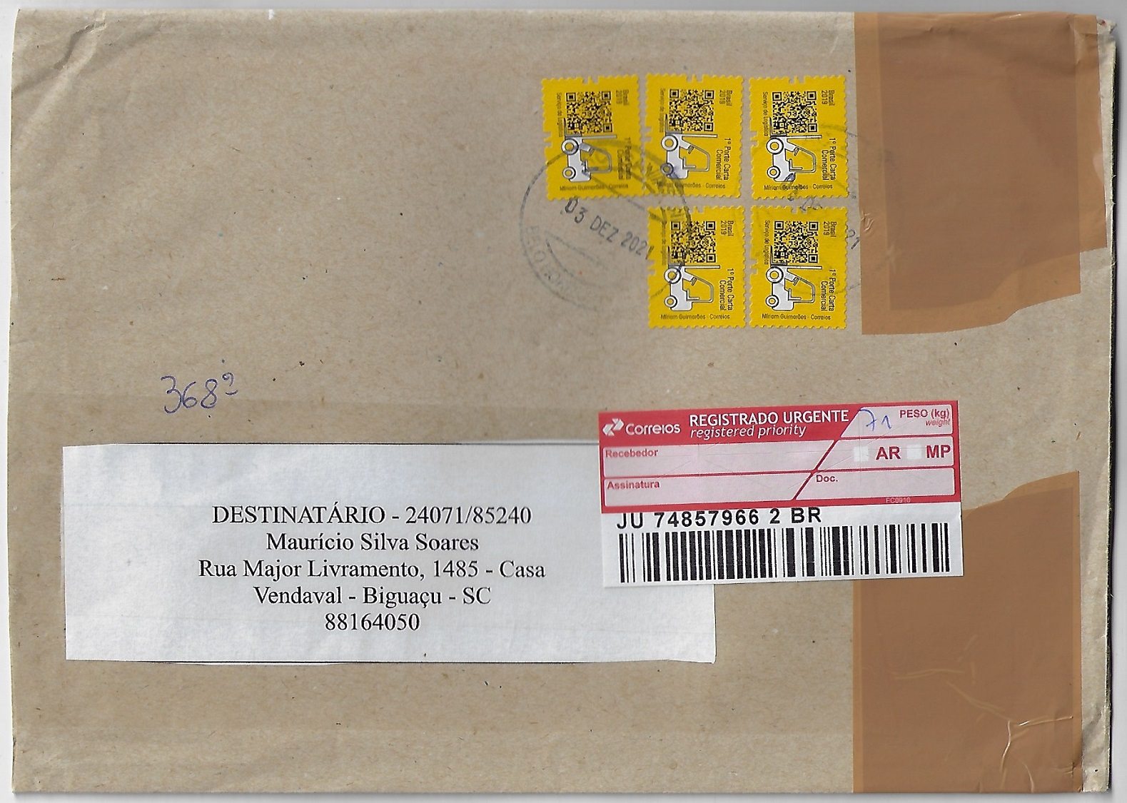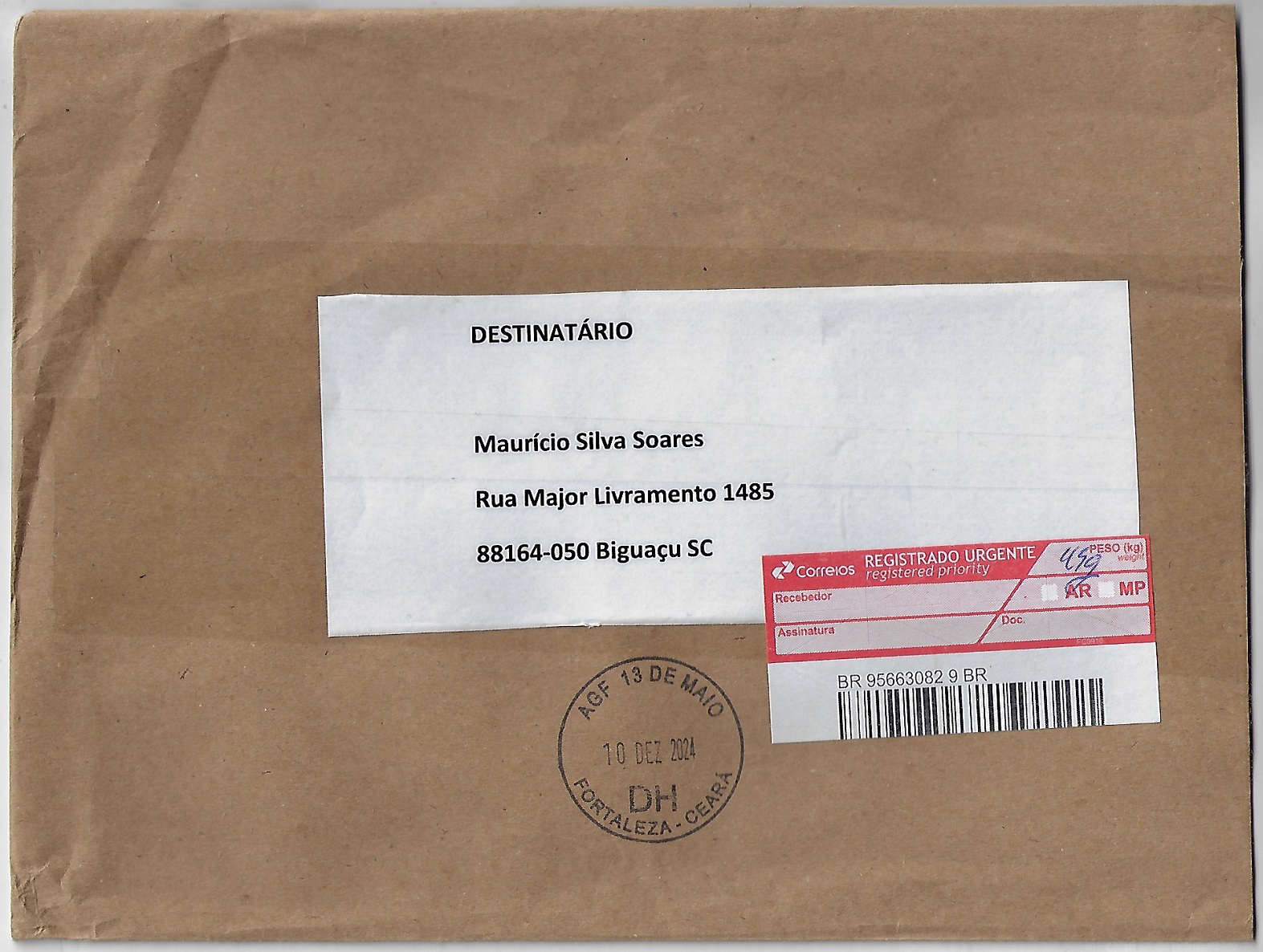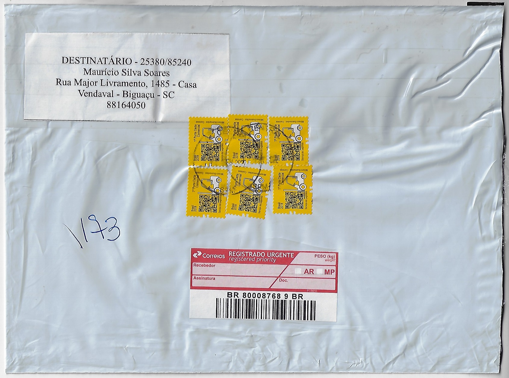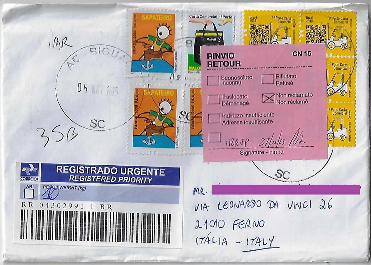 | 77398 | 2025, envelope prioritário registrado enviado de Biguaçu (5/11) para Ferno / Itália, porteado com 10 selos, etiqueta de Retornado ao Remetente | 10,00 | Foto |