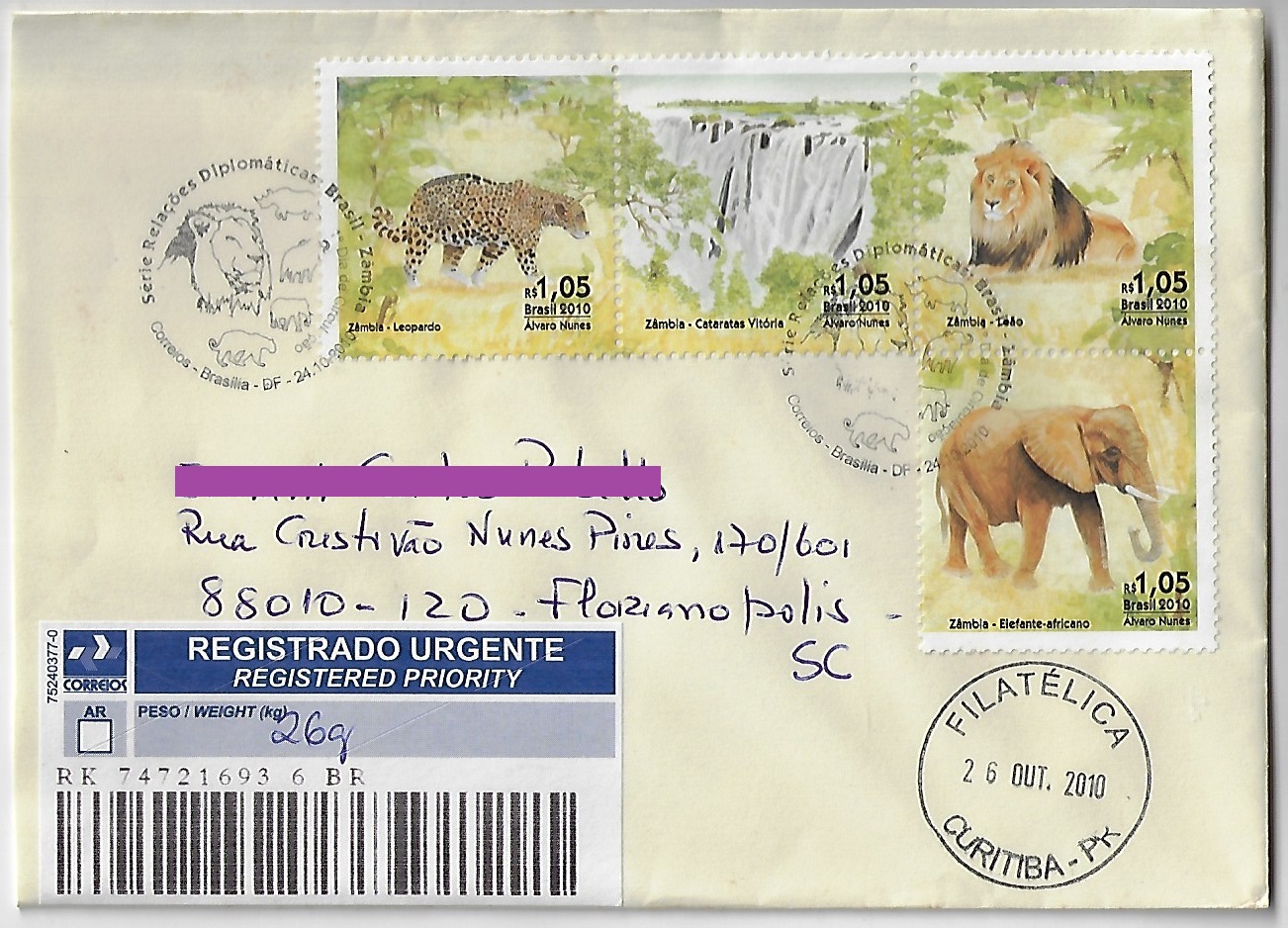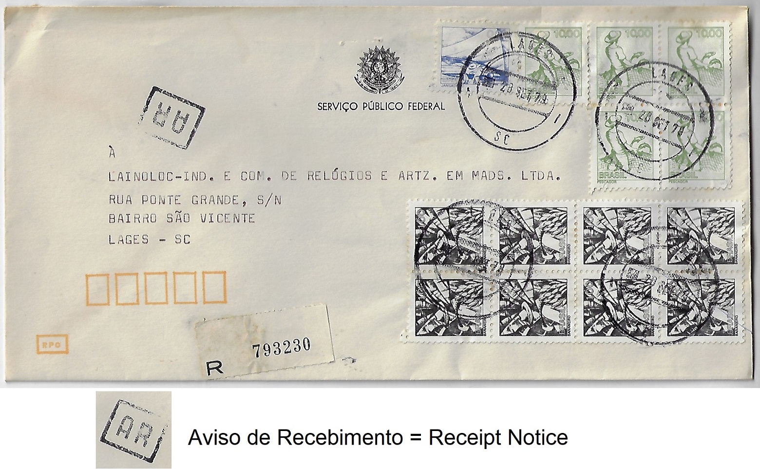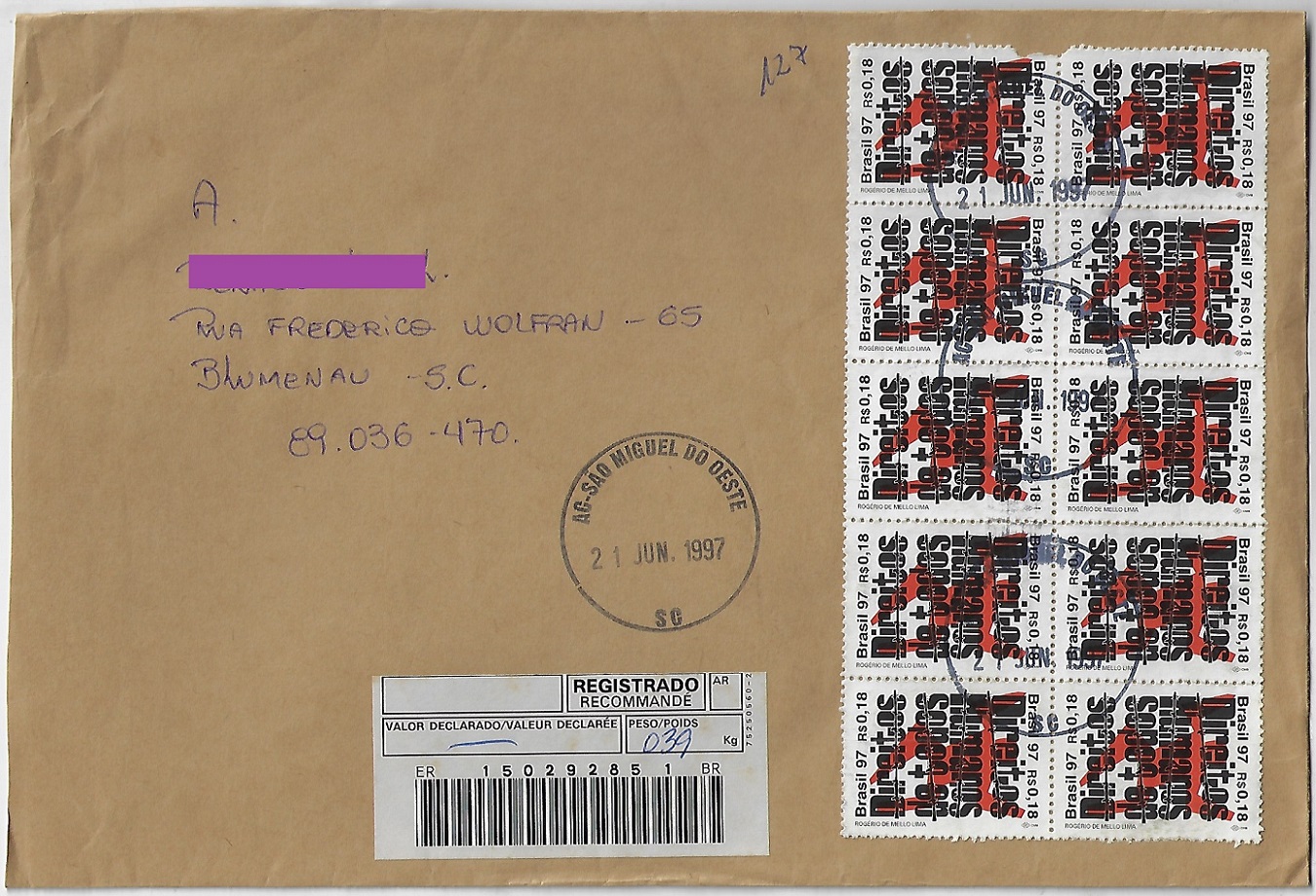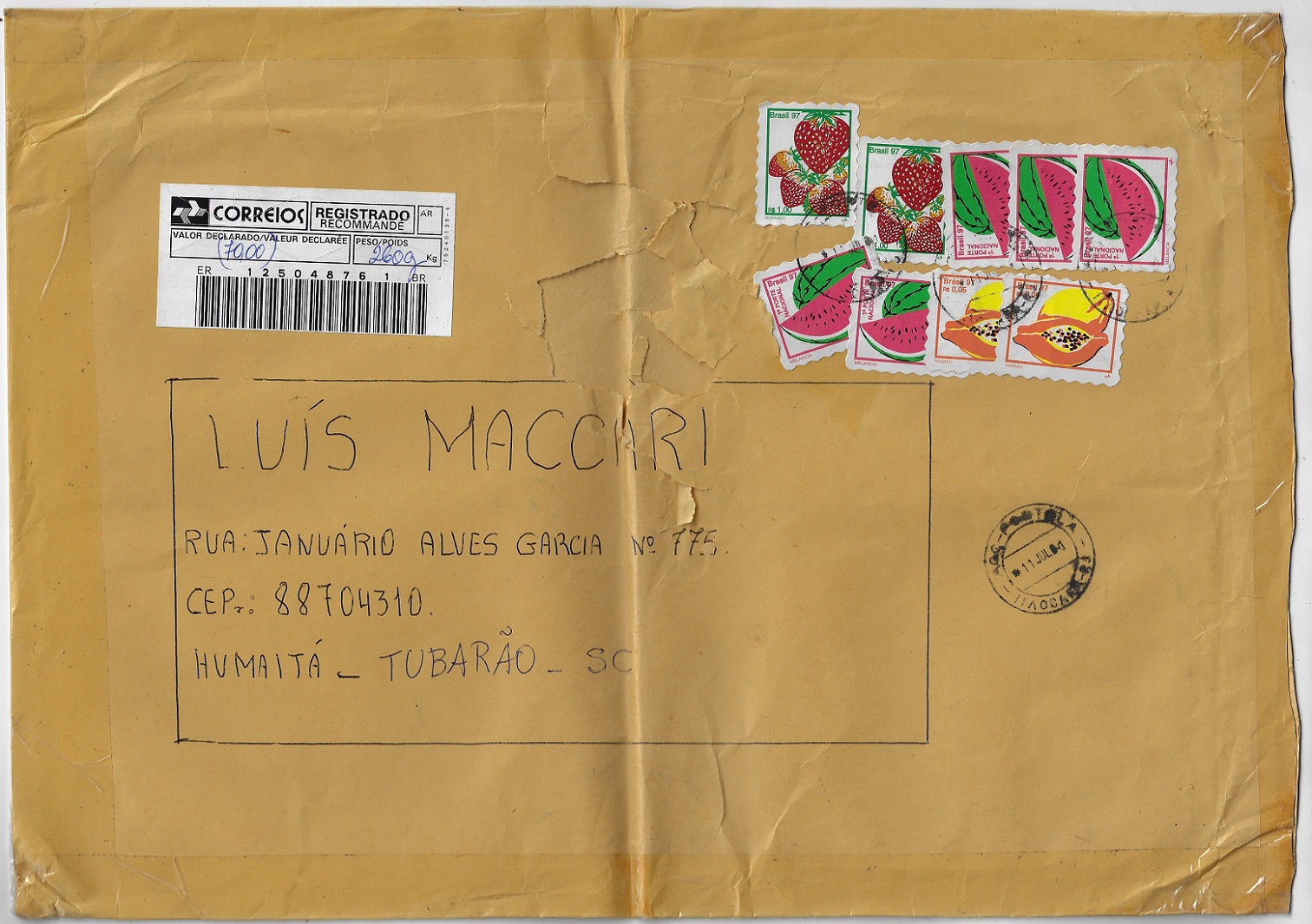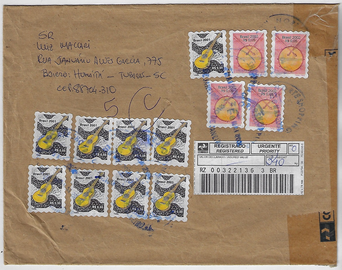 | 77398 | 2025, envelope prioritário registrado enviado de Biguaçu (5/11) para Ferno / Itália, porteado com 10 selos, etiqueta de Retornado ao Remetente | 10,00 | Foto |