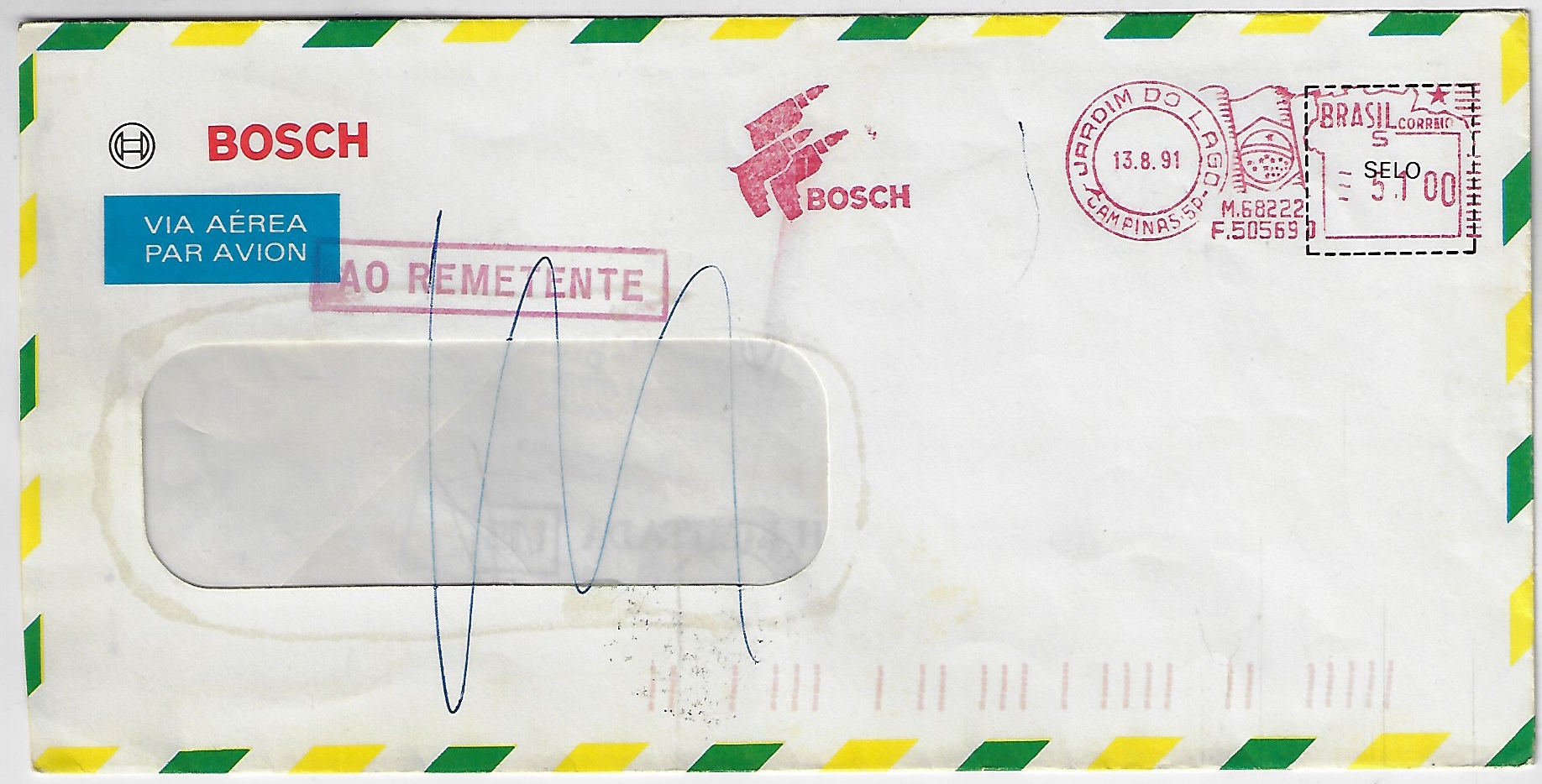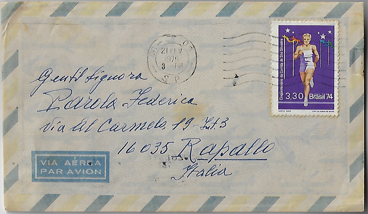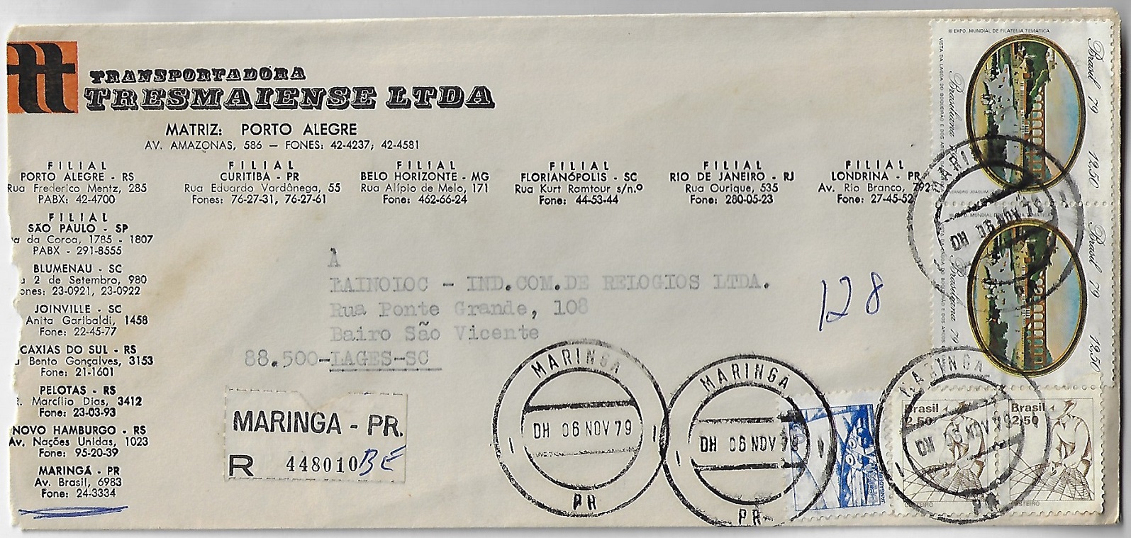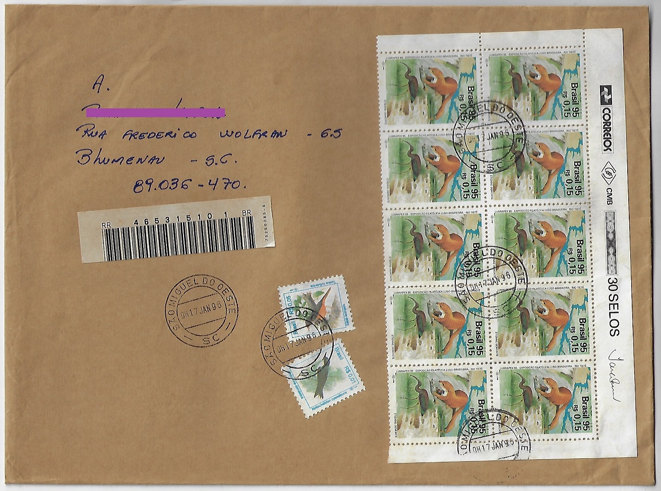 | 77398 | 2025, envelope prioritário registrado enviado de Biguaçu (5/11) para Ferno / Itália, porteado com 10 selos, etiqueta de Retornado ao Remetente | 10,00 | Foto |