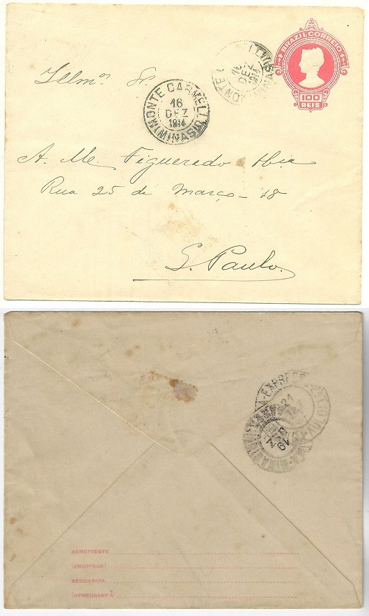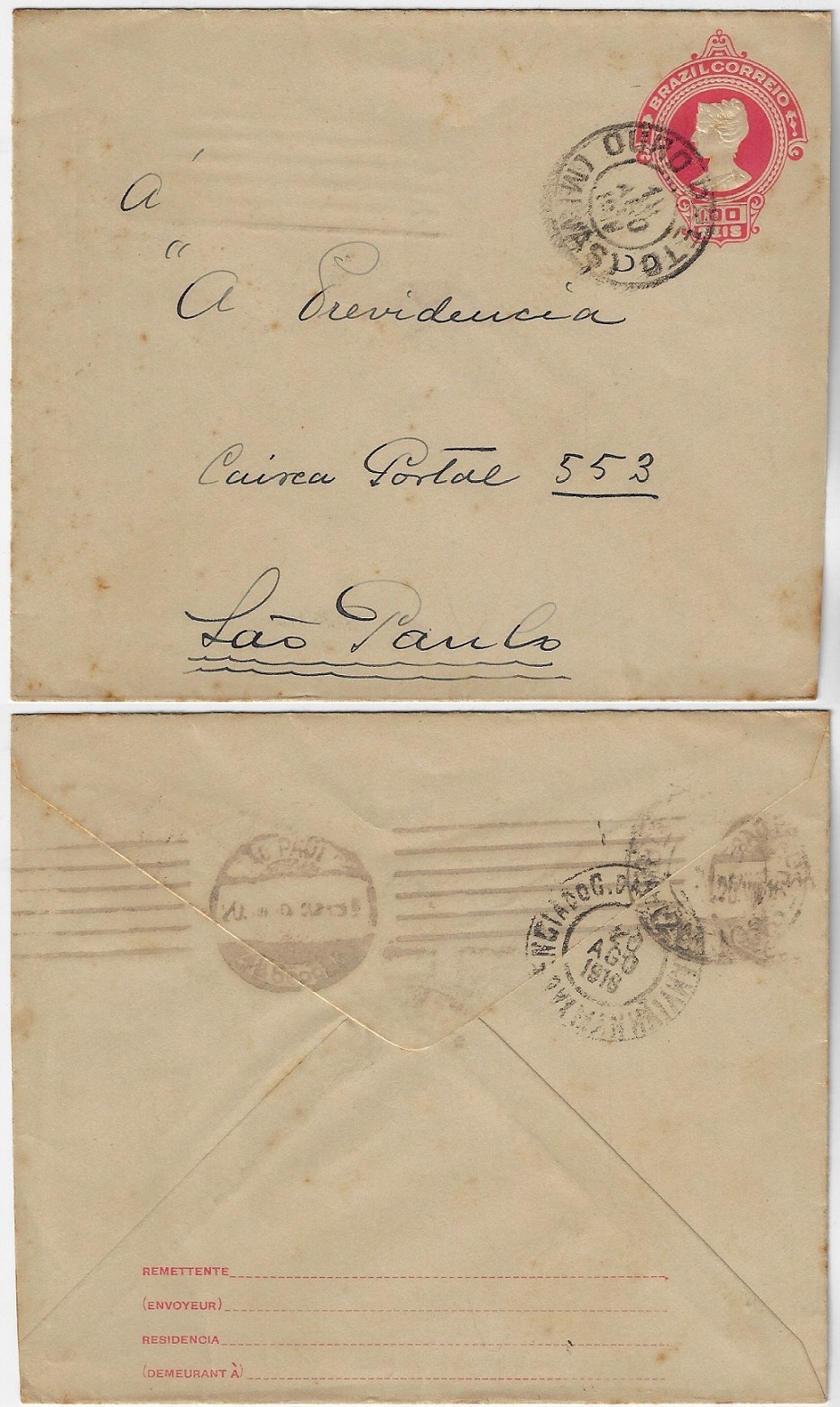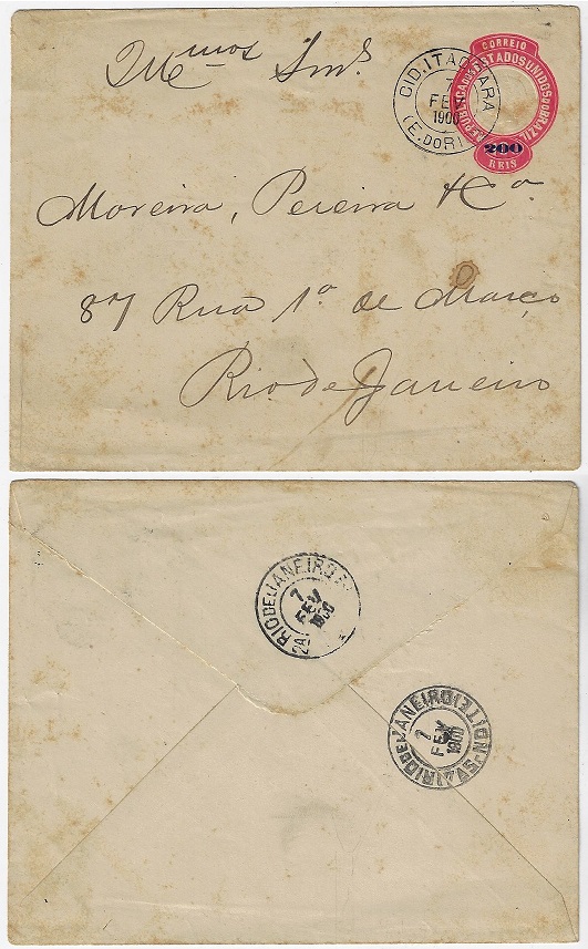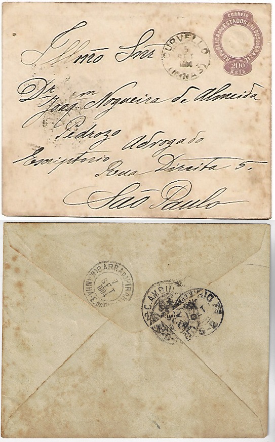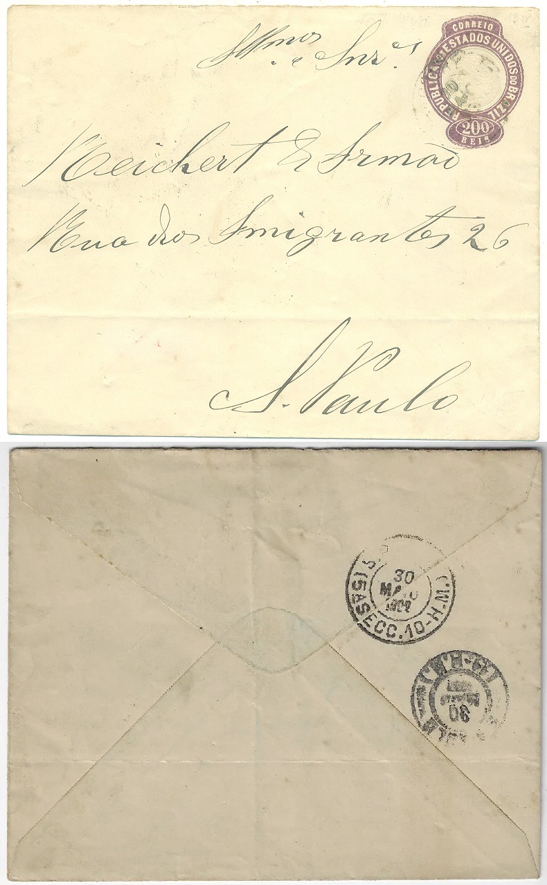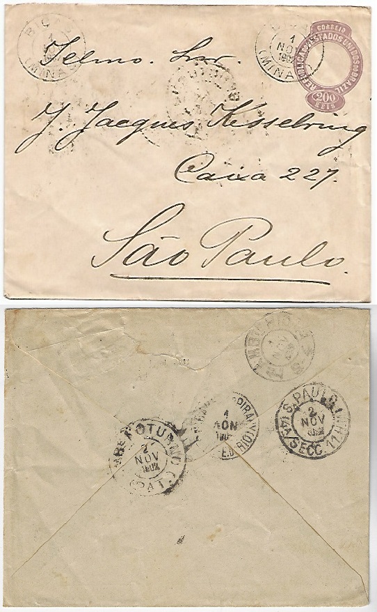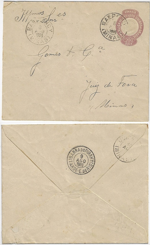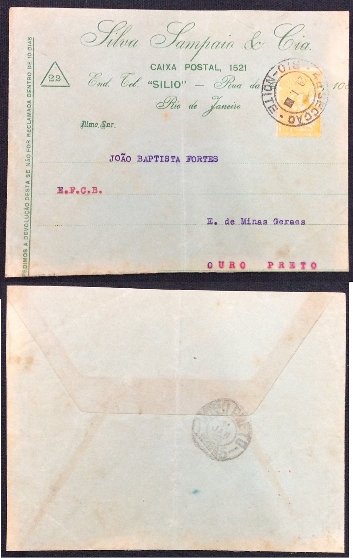 | 69599 | 1902, Inteiro postal EN-45 enviado de Bicas / MG (1/11) para São Paulo (2/11), carimbos Barra do Pirahy / RJ (1/11), "Ambe. Noturno" e "Ambte. Rio", oval aberta 1 mm, "Correio" com aproximadamente 10 mm, segundo "O" de "200" caído para esquerda (24 UF) | 33,00 | Foto |