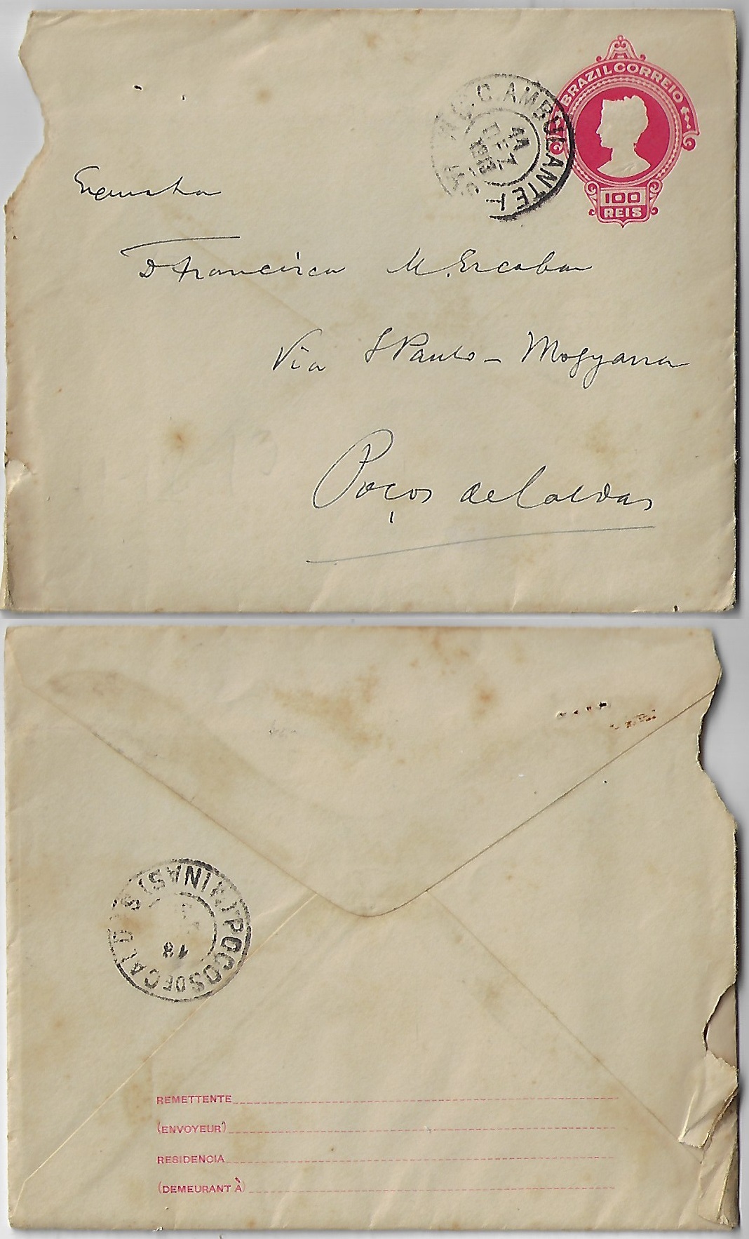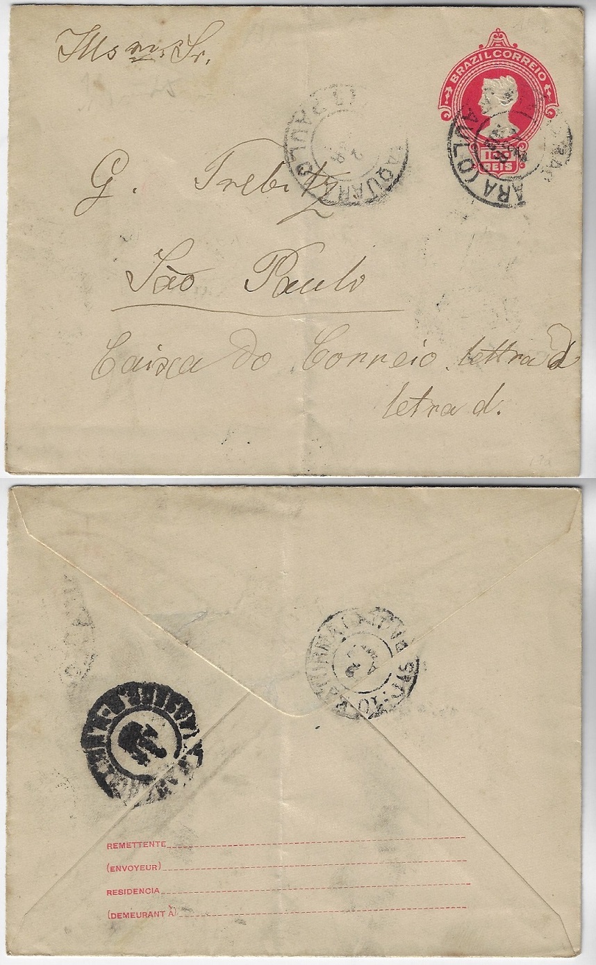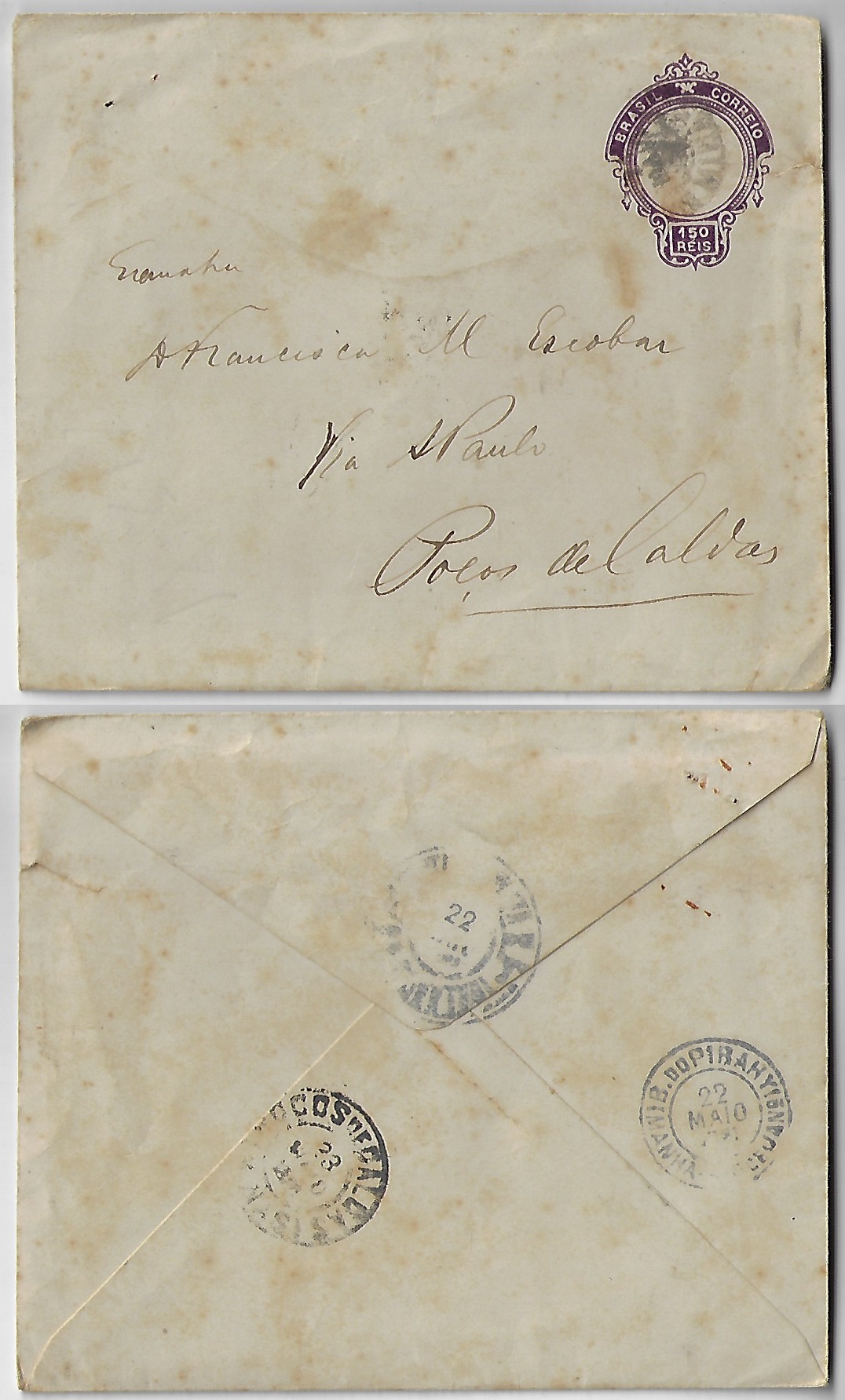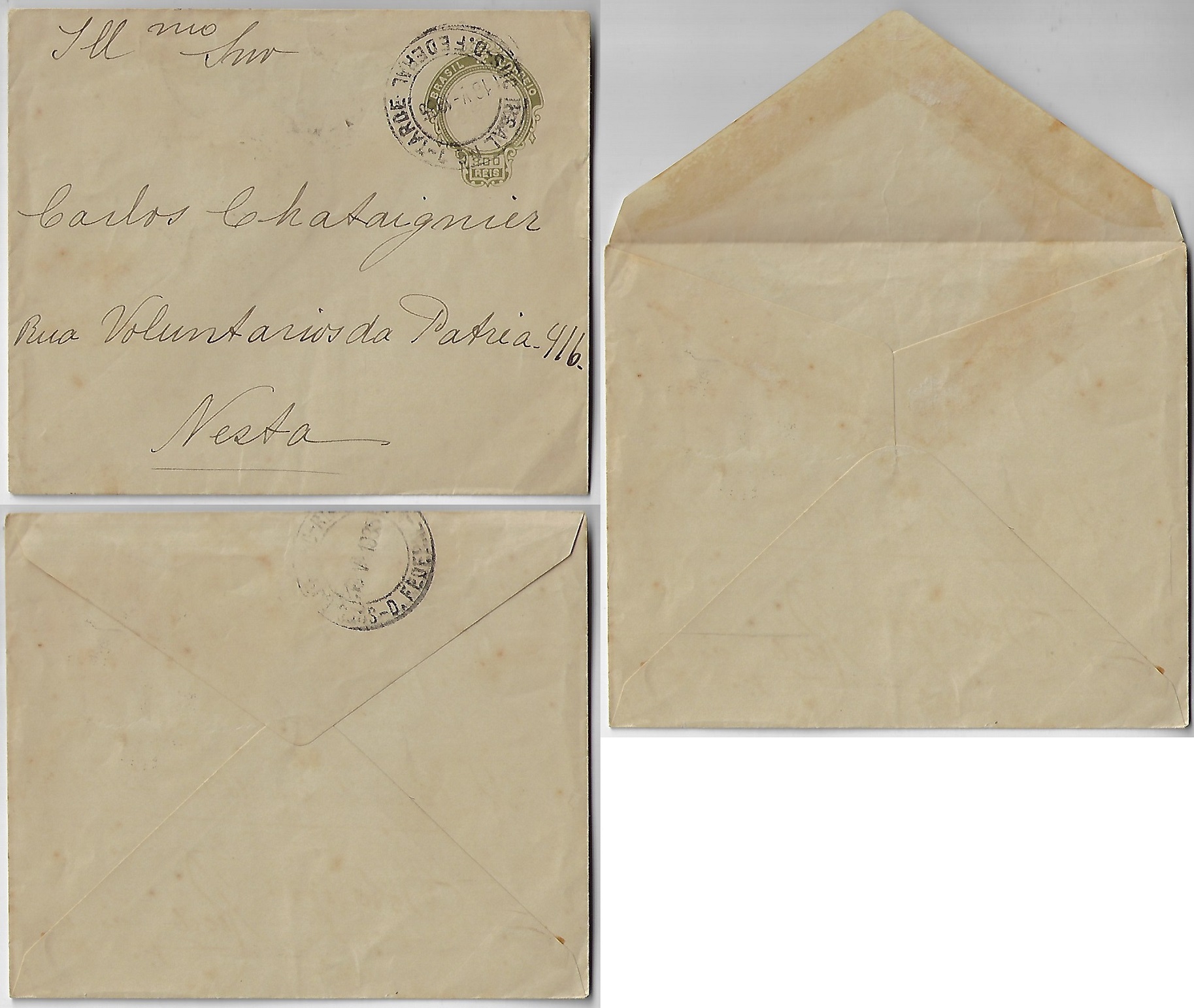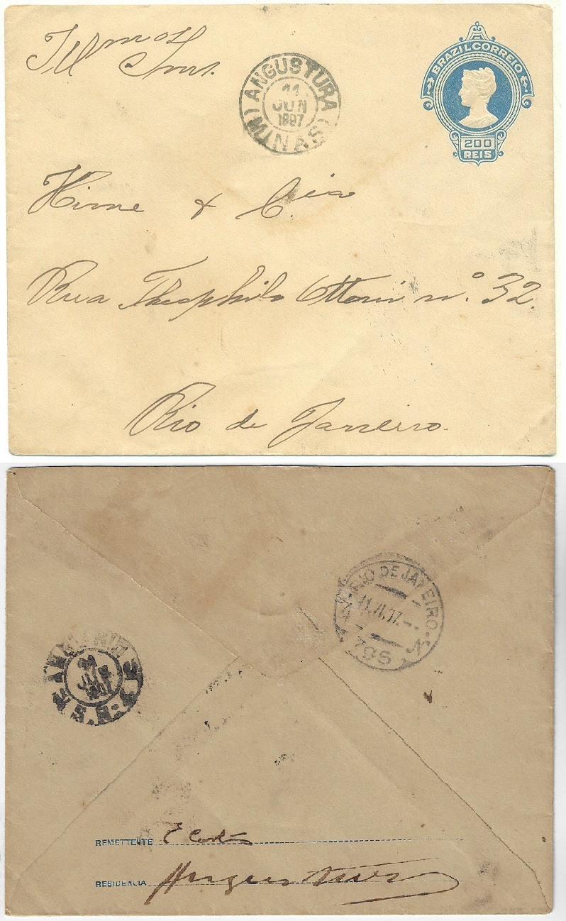 | 69599 | 1902, Inteiro postal EN-45 enviado de Bicas / MG (1/11) para São Paulo (2/11), carimbos Barra do Pirahy / RJ (1/11), "Ambe. Noturno" e "Ambte. Rio", oval aberta 1 mm, "Correio" com aproximadamente 10 mm, segundo "O" de "200" caído para esquerda (24 UF) | 33,00 | Foto |